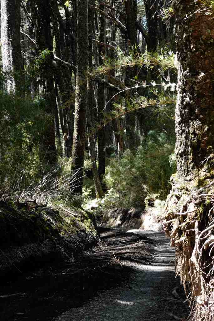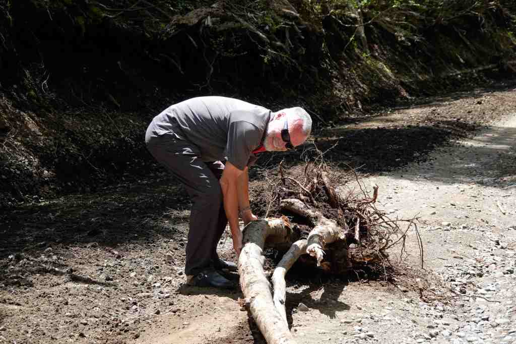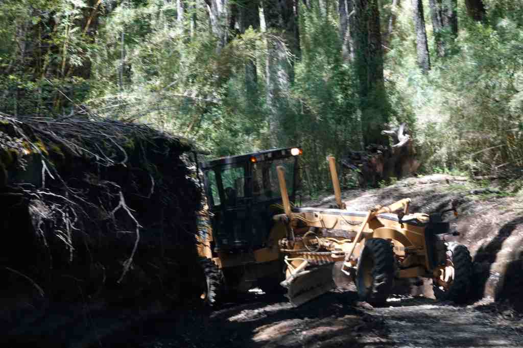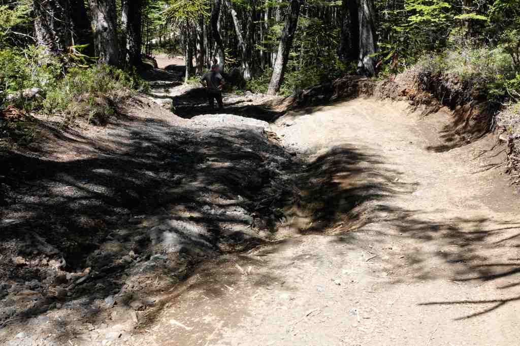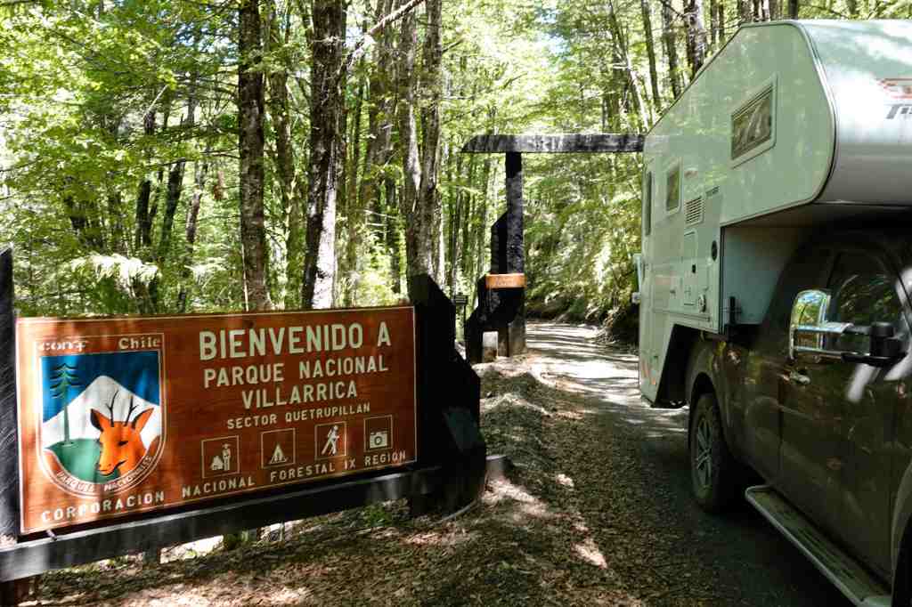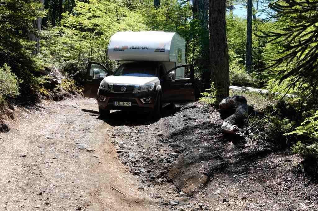 Wir hatten vor, noch ein Stück in den Nationalpark Villarica zu fahren.Eine ganz schlechte Piste führt uns hinein und am Nationalparkbeginn ist ein Schild angebracht, auf dem „cerrado“ (geschlossen) steht. Da keine Schranke uns den Weg versperrt, fahren wir mutig weiter. Die Piste wird immer schlechter und als wir einen Ranger am Wegesrand treffen, erkundigen wir uns doch mal vorsichtshalber, ob wir mit unserem Auto weiterfahren können. Si, claro, könnt ihr, der Weg bleibt so wie bisher… Leider war das nicht der Fall. Eigentlich dachten wir, es könne nicht noch schlimmer werden, aber es wurde schlimmer! Unglaublich tiefe Rillen mäandern von einer Seite zur anderen und engen die ohnehin schmale Fahrspur extrem ein. Ich bewundere Walters Coolness, das Auto manchmal nur auf drei Rädern im Schritttempo über die Abgründe zu lenken, ohne hineinzurutschen. Für 5 Kilometer brauchen wir eine gute Stunde, bis es überhaupt nicht mehr weiter geht. Auch nach intensiver Betrachtung kann Walter keine Möglichkeit mehr sehen, noch weiter zu kommen. Wir beschließen schweren Herzens, umzudrehen. Das heißt natürlich erst mal ein gutes Stück rückwärts, bis eine Möglichkeit zum Wenden besteht. Da wir die Strecke ja schon einmal gefahren sind, kennt Walter die Tücken und ich steige sogar einmal aus, um eine kritische Passage zu filmen. Ein schlechtes Omen! Kurz darauf droht das Auto in den Graben zu rutschen, Walter fährt so dicht wie möglich an die Seite, leider um 2 cm zuviel, wo ein Ast unsere Seite und das Fenster demoliert.