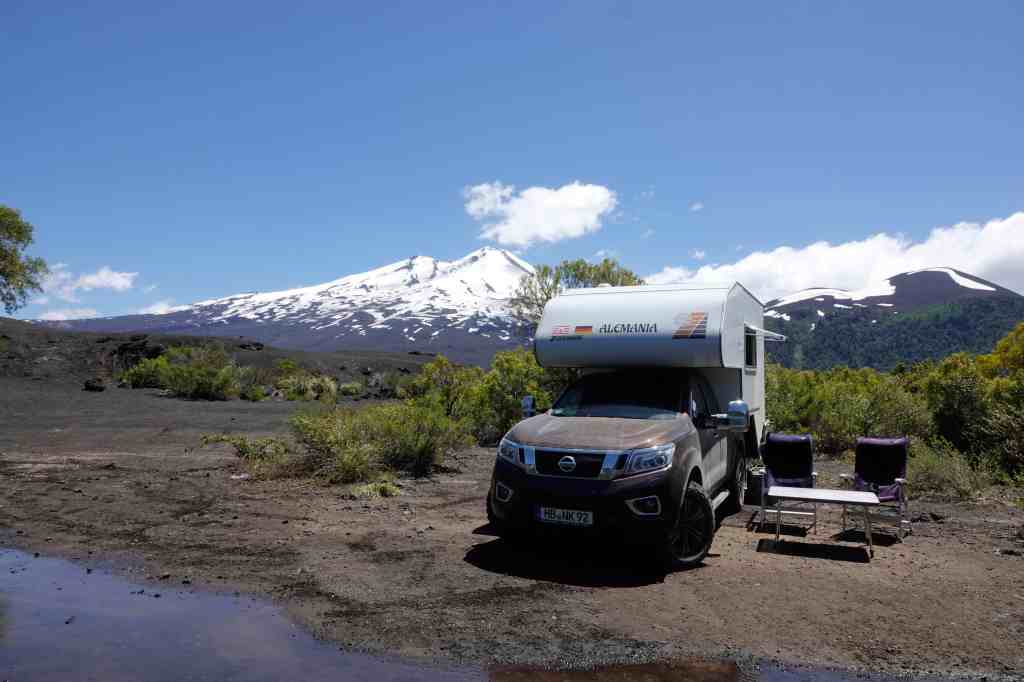 Hier finden wir wieder mehr Einsamkeit und Ruhe. Den ersten Advent erleben wir im Nationalpark bei strahlendem Sonnenschein und umgeben von tausenden voll erblühten Ginstersträuchern mit Blick auf den Vulcan Antuco.