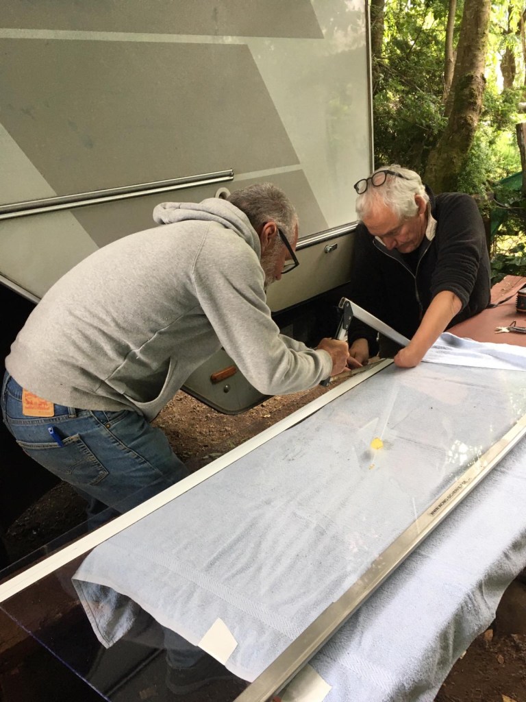 Es ist Wochenende und natürlich können wir erst mal nichts erreichen. Aber wir bekommen nette Gesellschaft von Renée und Jaques, die mit auf dem Schiff nach Montevideo waren und wir verbringen ein ruhiges Wochenende miteinander. In Puerto Montt finden wir gleich am Montag eine Firma, die uns Plexiglas zuschneidet und Walter setzt die Scheibe mit tatkräftiger Hilfe von Jaques ein. Das Fenster ist nun nicht mehr zu öffnen, aber irgendwas ist ja immer…Wir hoffen, dass dieses Provisorium den heftigen patagonischen Winden gewachsen ist und fahren voller Optimismus am nächsten Tag weiter.