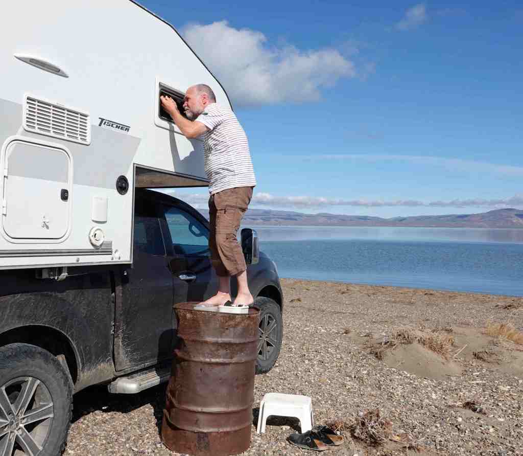 Am Lago Muster bei Sarmiento verbringen wir ein paar ruhige Strandtage mit Geeske und Stefen, die wir auf der Überfahrt kennen gelernt haben. Das zweite Fenster, welches unterwegs kaputt gegangen ist, wird repariert. Ein paar benötigte Dinge können im örtlichen Eisenwarenhandel besorgt werden: Ein tolles Geschäft, wo man noch jede Schraube einzeln kaufen kann.