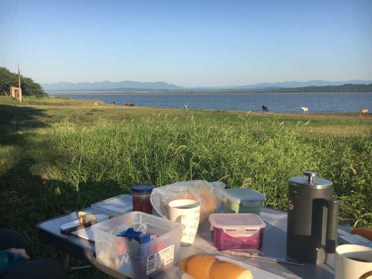Am Abend wird mal wieder Abschied gefeiert. Unsere kleine Gruppe ist um 3 Schweizer Pärchen erweitert worden und wir machen es uns an einer langen Tafel am Grill gemütlich.