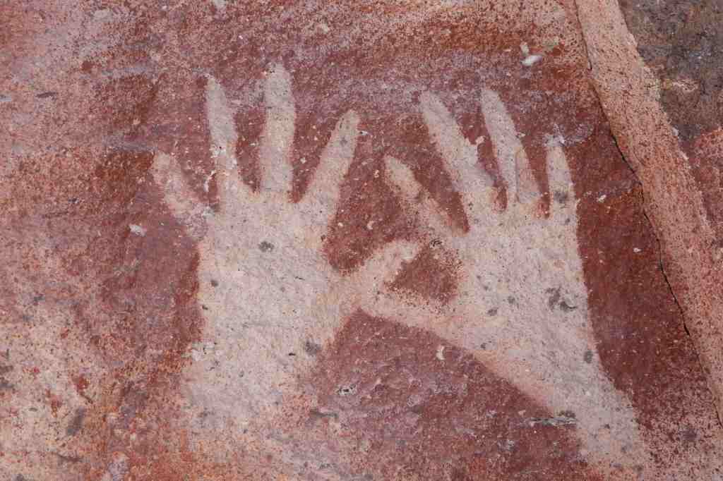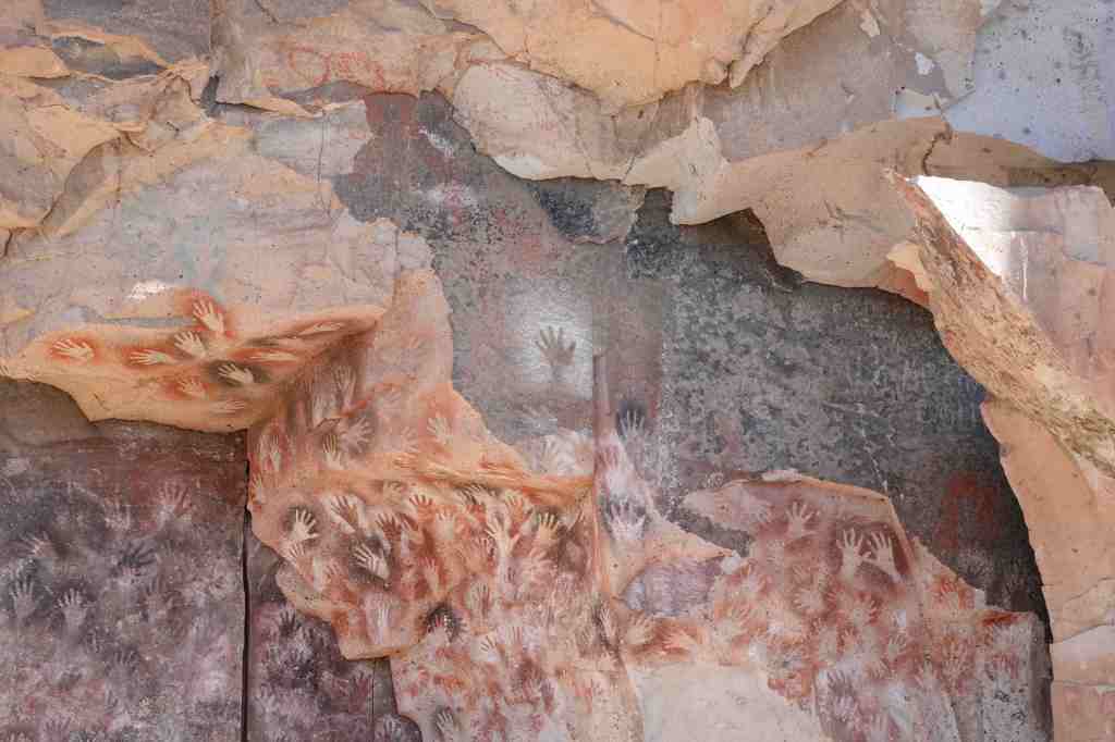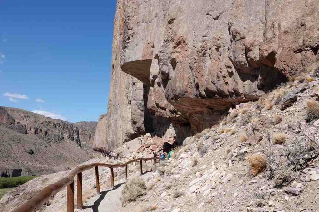 Eine recht steile Schotterpiste führt uns durch eine Schlucht bis zum „Parque Provincial Cueva de las Manos“. Ein sehr schöner Pfad verläuft am Rande des Cañons mit tollen Ausblicken auf die umgebenden Berge und den Fluss. Die bis zu 9000 Jahre alten Höhlenmalereien wurden zum Weltkulturerbe erklärt und Besichtigungen sind nur mit einer Führung gestattet. Wir haben Glück und mit uns ist eine deutsche Reisegruppe unterwegs, deren Begleiter die spanischen Erklärungen perfekt übersetzt. So erfahren wir, dass die Malereien zu den ältesten menschlichen Zeugnissen in Südamerika gehören.
