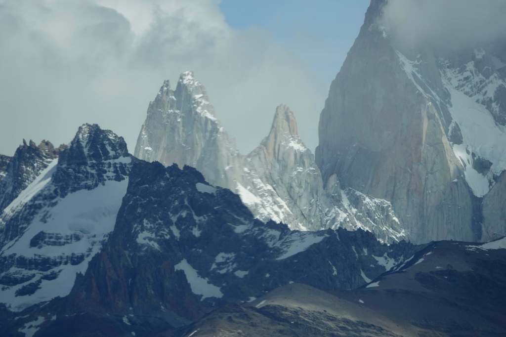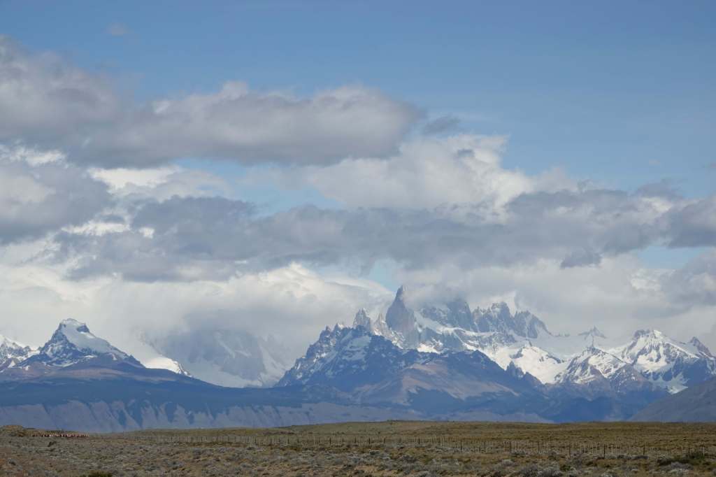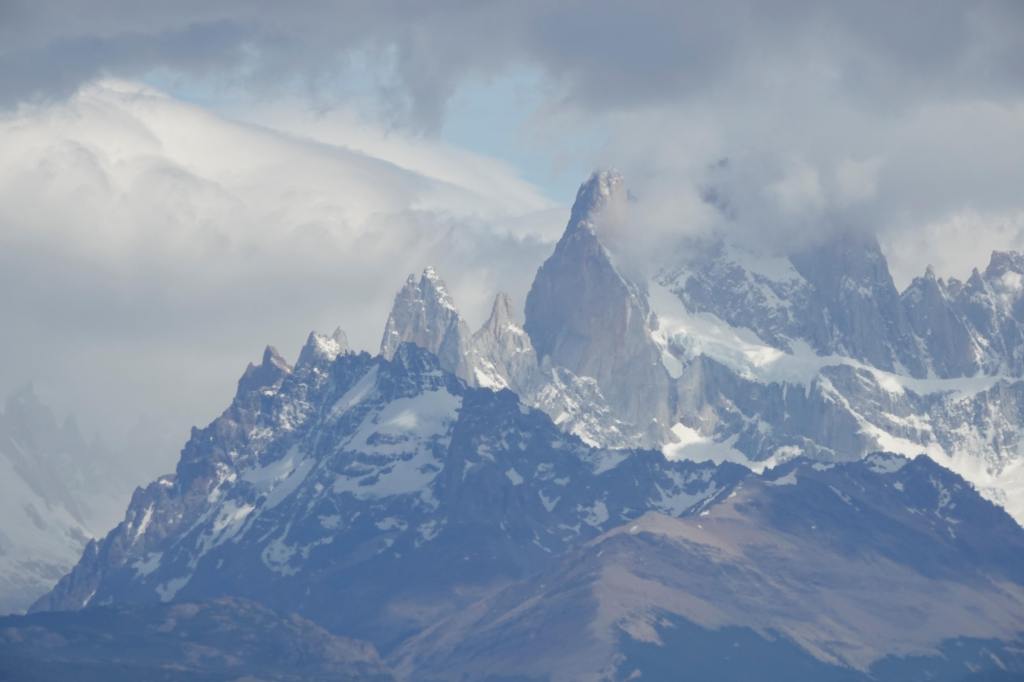 Nächster Stopp ist El Chaltén, ein El Dorado für Wanderer mit zahlreichen Wandertouren rund um das Fitz-Roy-Bergmassiv. Schon auf dem Weg dorthin, entlang des Lago Viedma, bieten sich fantastische Ausblicke. Wie fast immer ist es wolkenverhangen, aber wir können doch einen großen Teil der beeindruckenden spitzen Granitnadeln erkennen.