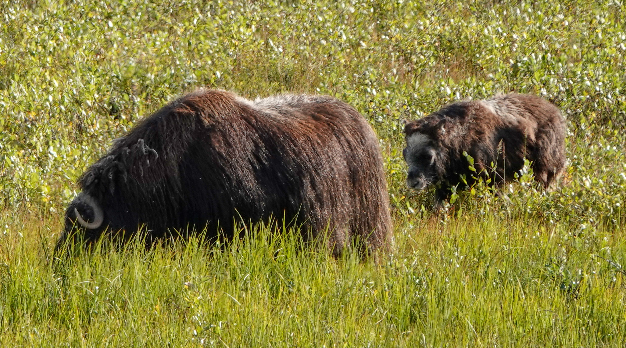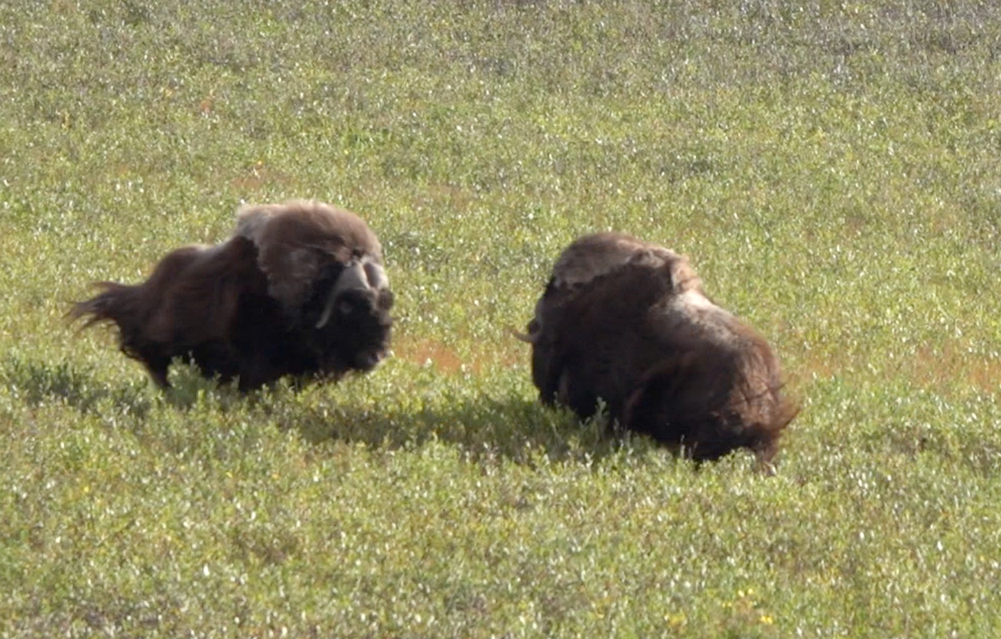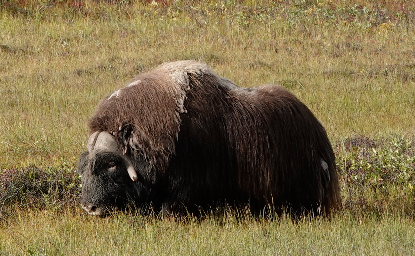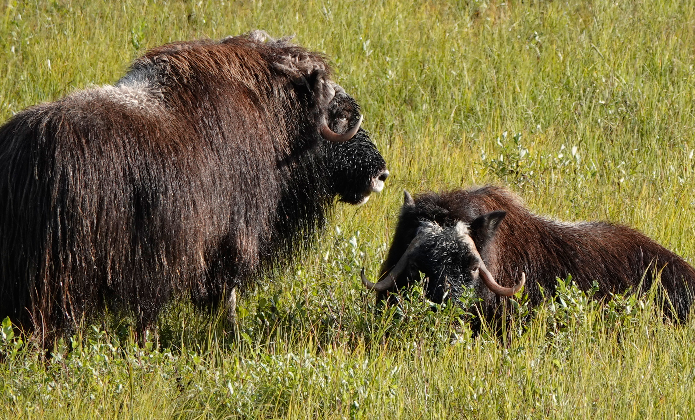 Unterwegs begegnen wir wieder der gleichen Herde von Moschusochsen, diesmal wird es direkt spannend. Ein einzelner Bulle nähert sich der Herde und wird prompt vom Chef angegriffen. Es kommt zum Showdown: Sie rasen aufeinander zu und mit einem riesigen Knall krachen die Köpfe aufeinander. Der Angreifer kneift beim 2. Versuch und eilt von dannen, lange noch verfolgt vom Sieger des Duells. Übrigens haben die Moschusochsen Männchen wegen der heftigen Kämpfe eine deutlich geringere Lebenserwartung als die Weibchen: 18 zu 12 Jahren.