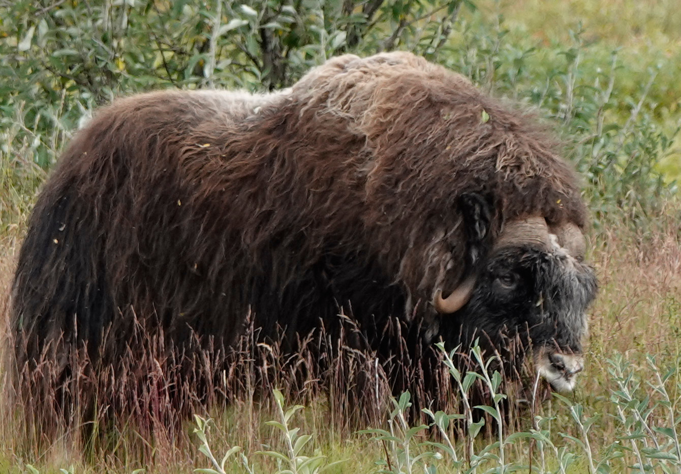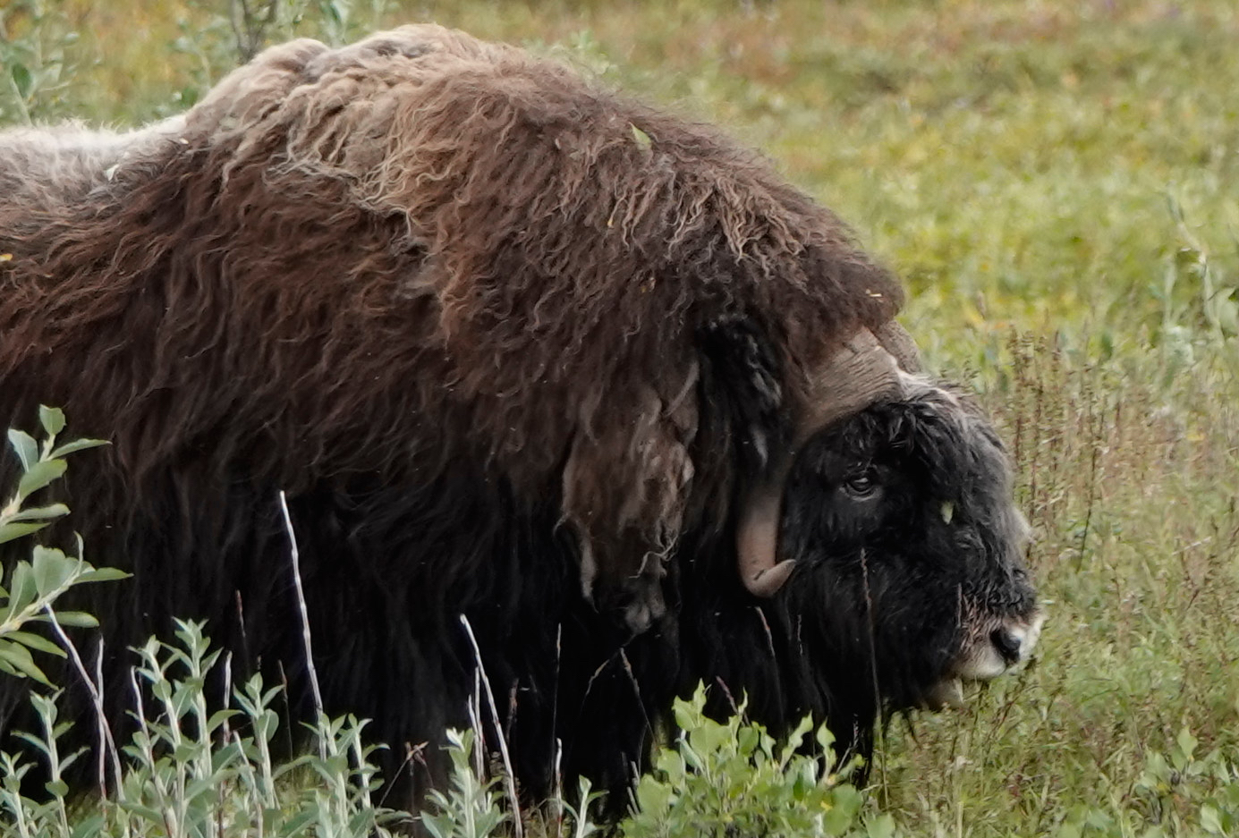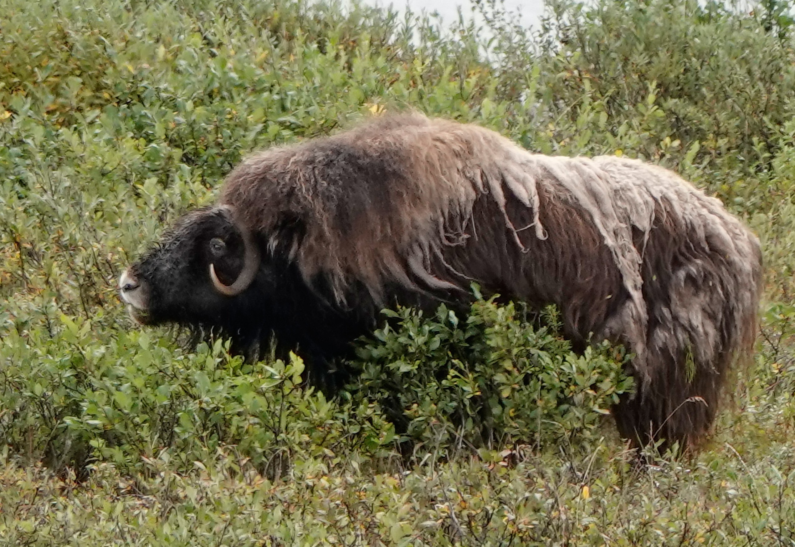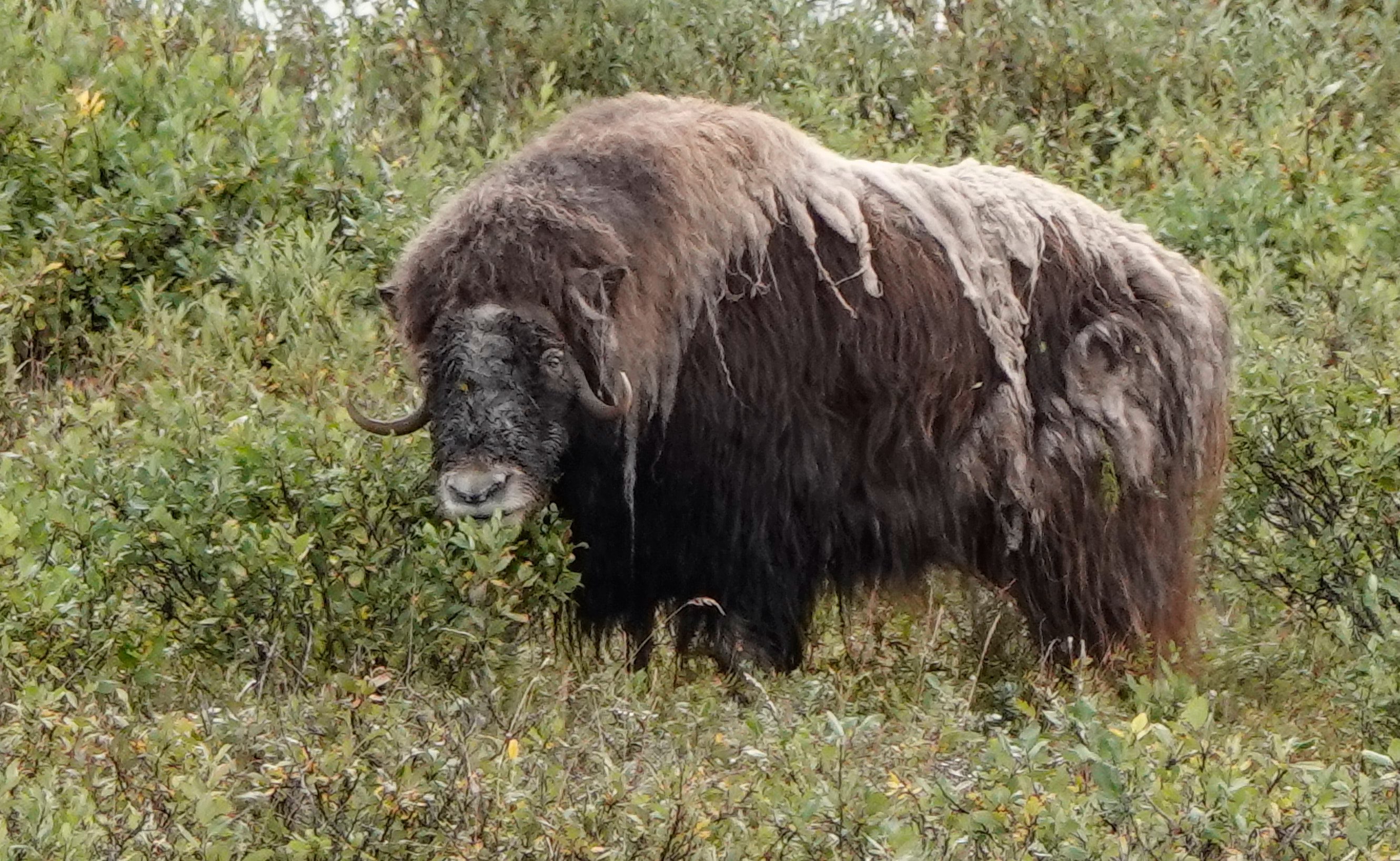 Unterwegs begegnen wir wieder der gleichen Herde von Moschusochsen, diesmal wird es direkt spannend. Ein einzelner Bulle nähert sich der Herde und wird prompt vom Chef angegriffen. Es kommt zum Showdown: Sie rasen aufeinander zu und mit einem riesigen Knall krachen die Köpfe aufeinander. Der Angreifer kneift beim 2. Versuch und eilt von dannen, lange noch verfolgt vom Sieger des Duells. Übrigens haben die Moschusochsen Männchen wegen der heftigen Kämpfe eine deutlich geringere Lebenserwartung als die Weibchen: 18 zu 12 Jahren.