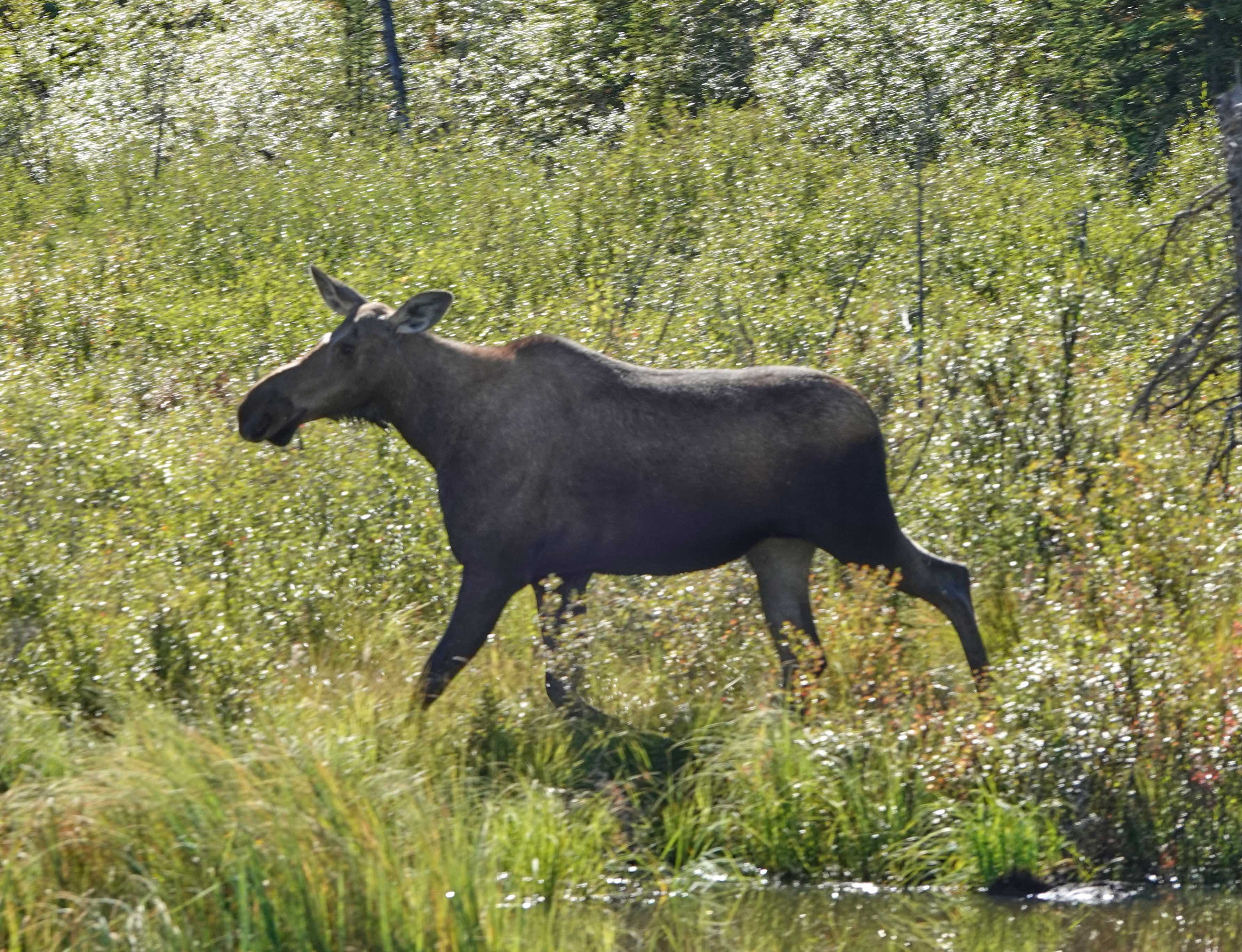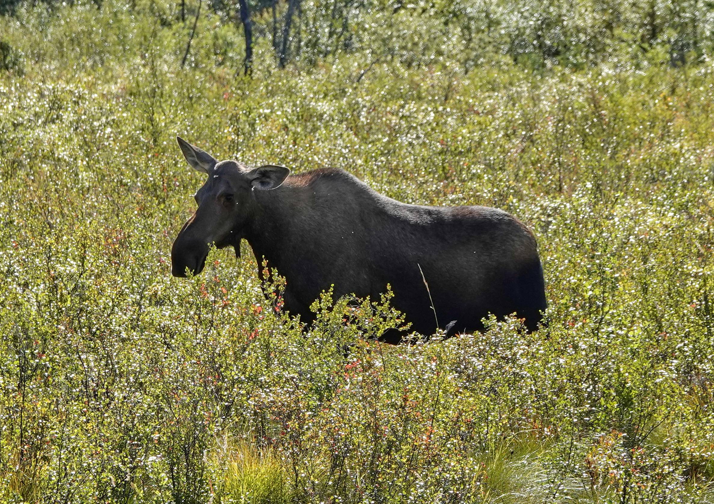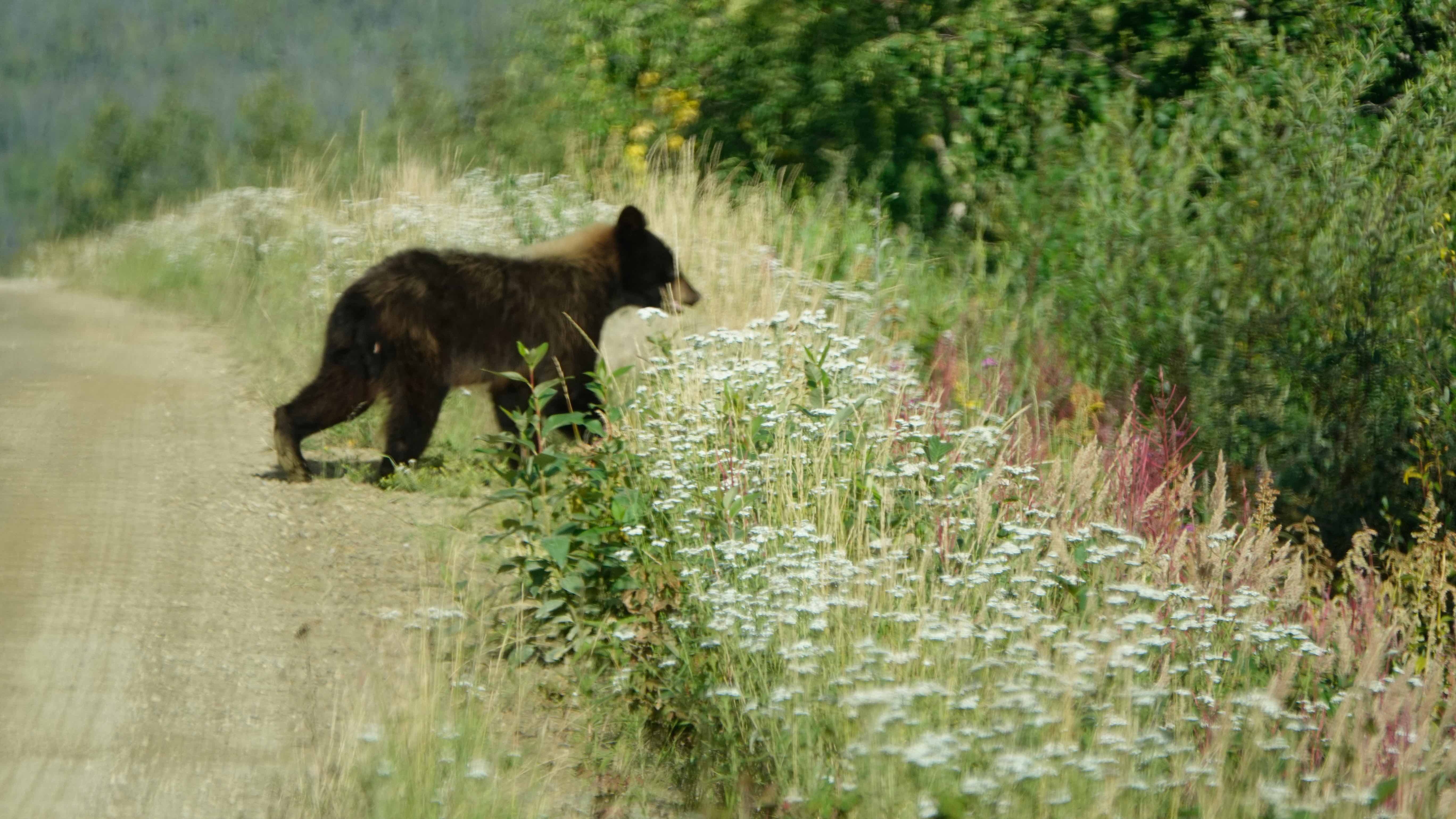 Unterwegs huscht mal wieder ein Bär über die Straße und ein Elch läuft durch die Wiese.