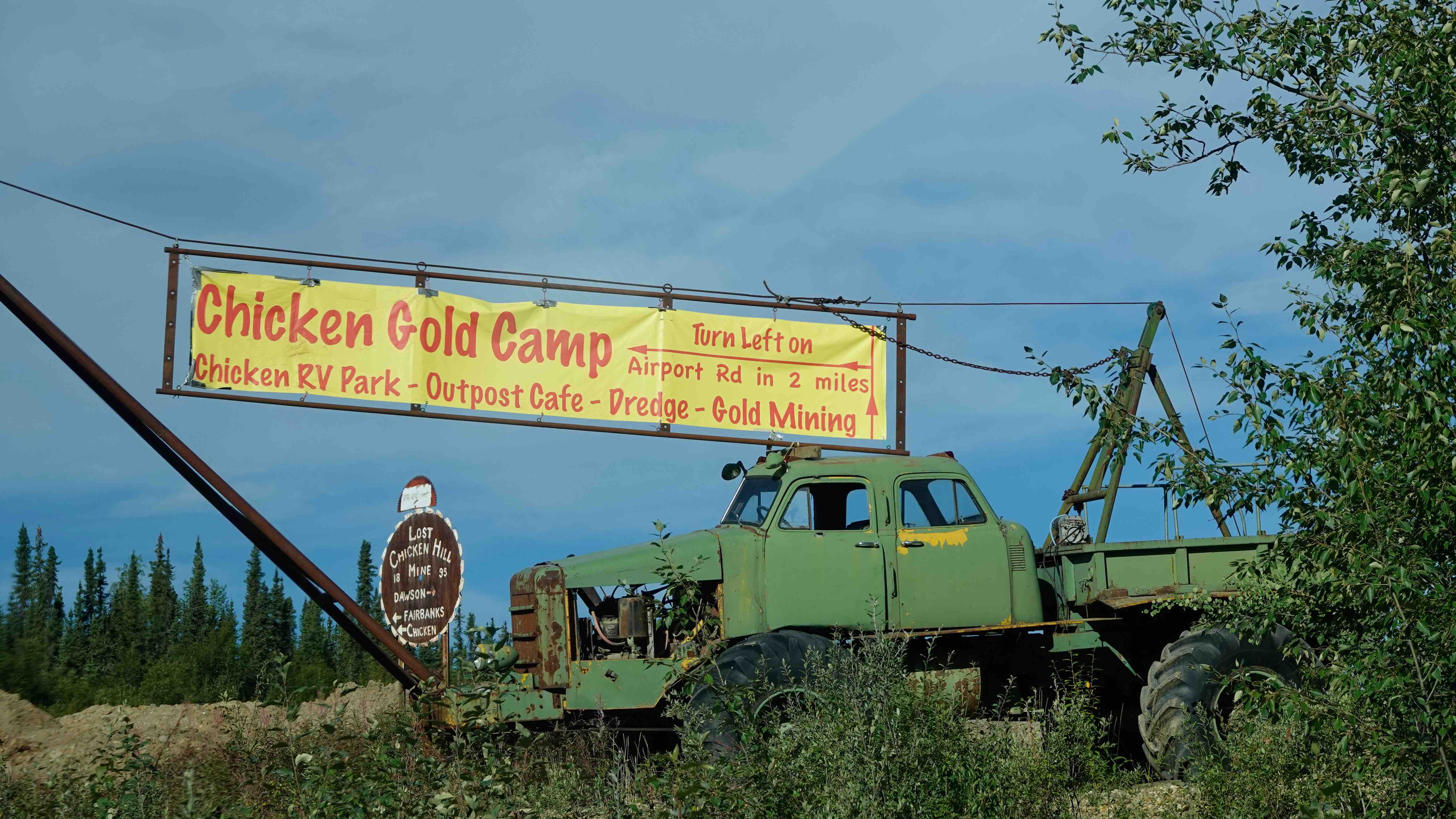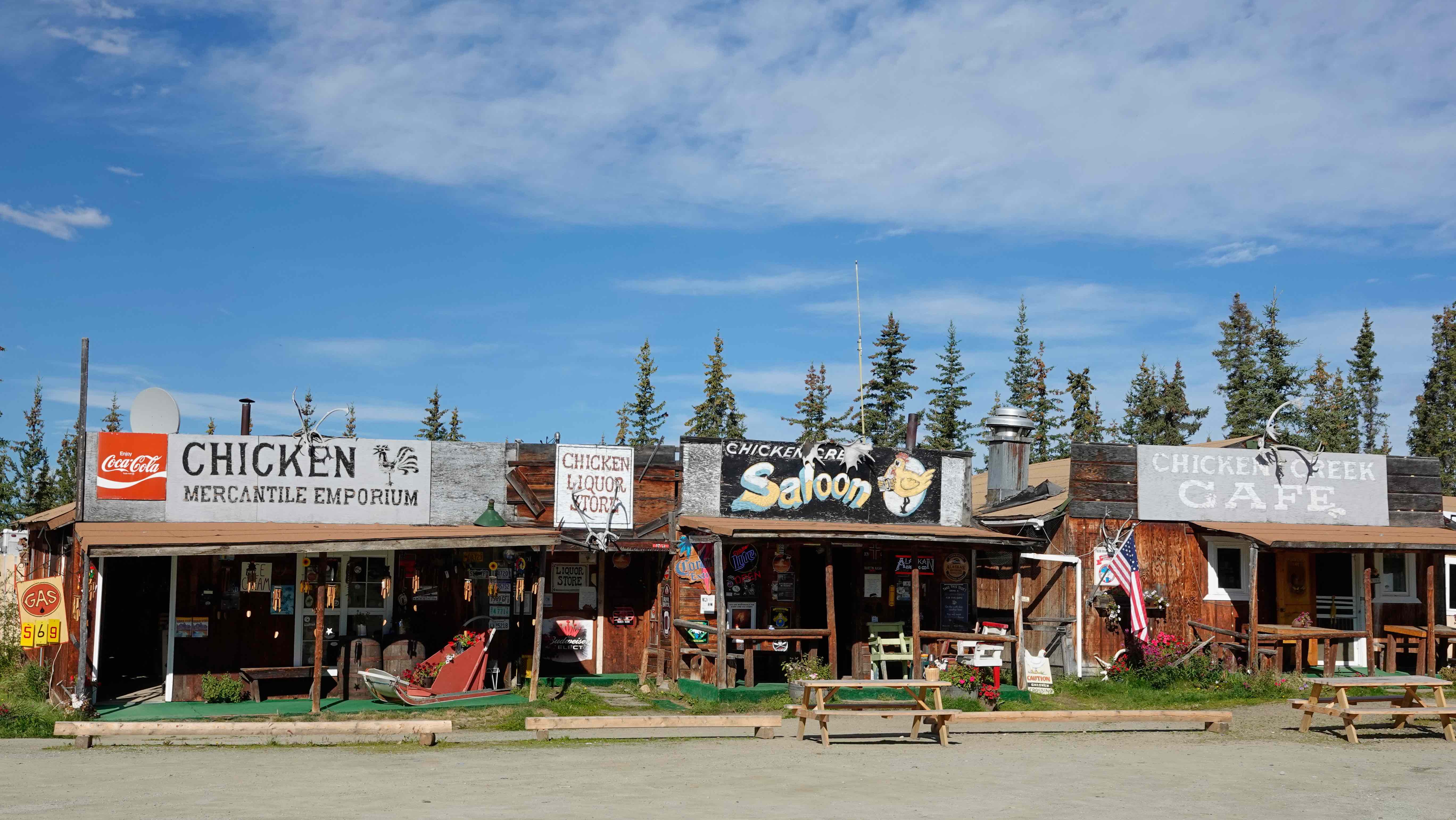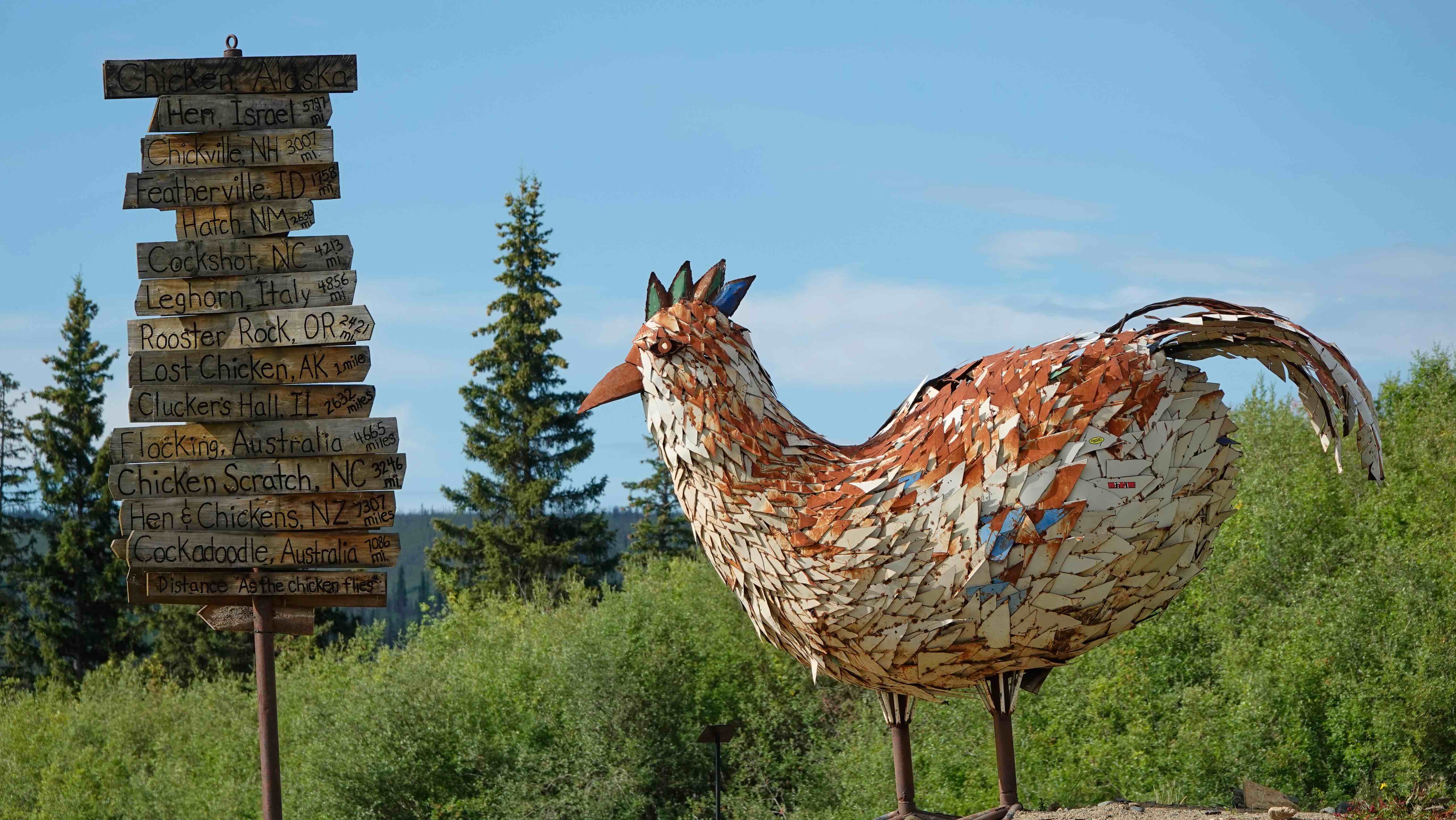 Der erste Ort nach der Grenze heißt Chicken. Die Stadt heißt so, weil die ursprünglichen Siedler, eigentlich Goldgräber, Ptarmigan nicht buchstabieren konnten. Sie wollten die Stadt so nennen, weil die zahlreichen einheimischen Vögel so manchen Topf in ihren Lagern füllten. Ptarmigan wurden auch „Chicken“ genannt und dabei blieb es dann. Der Name ist Programm und es dreht sich fast alles um das Huhn.