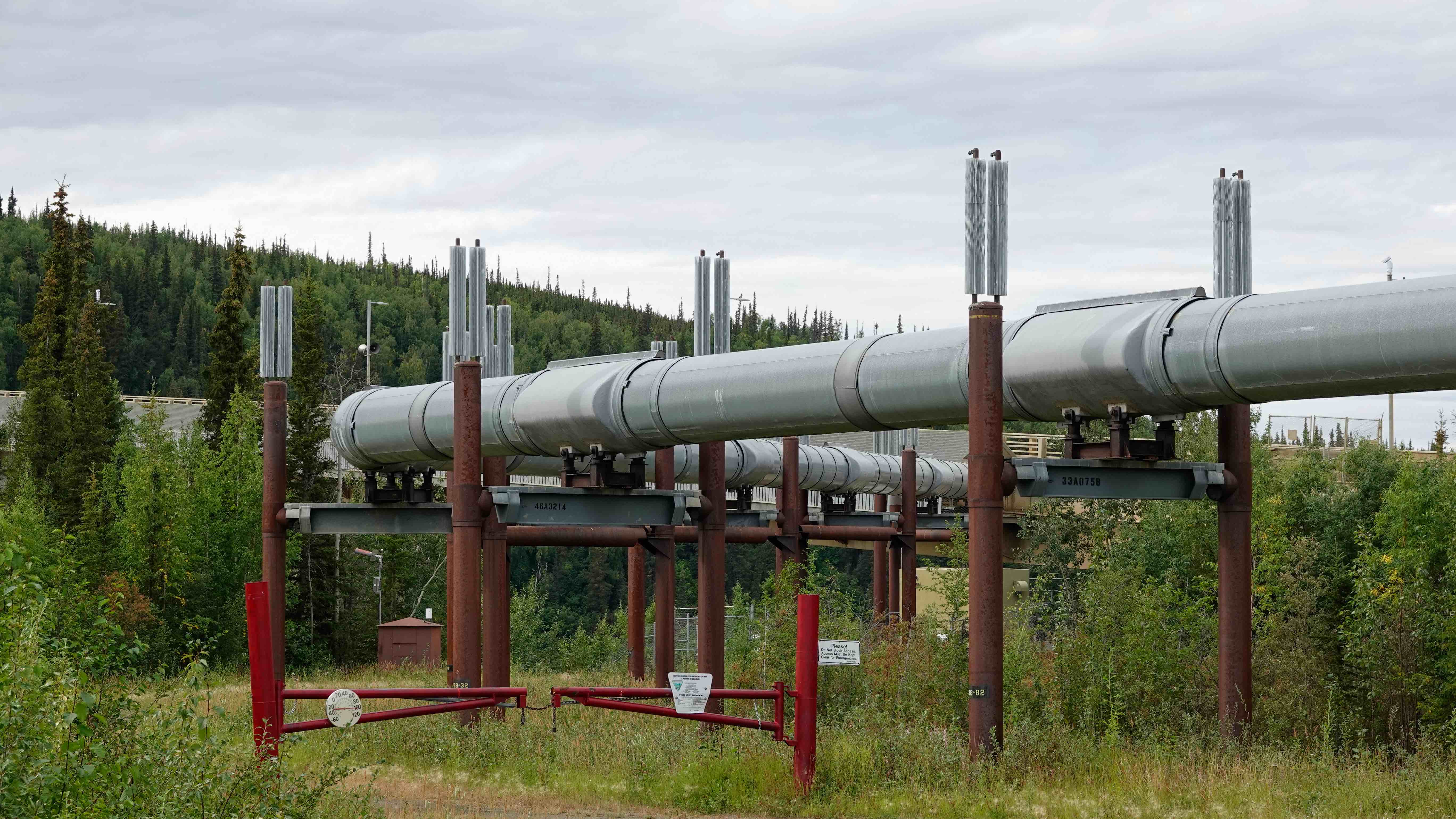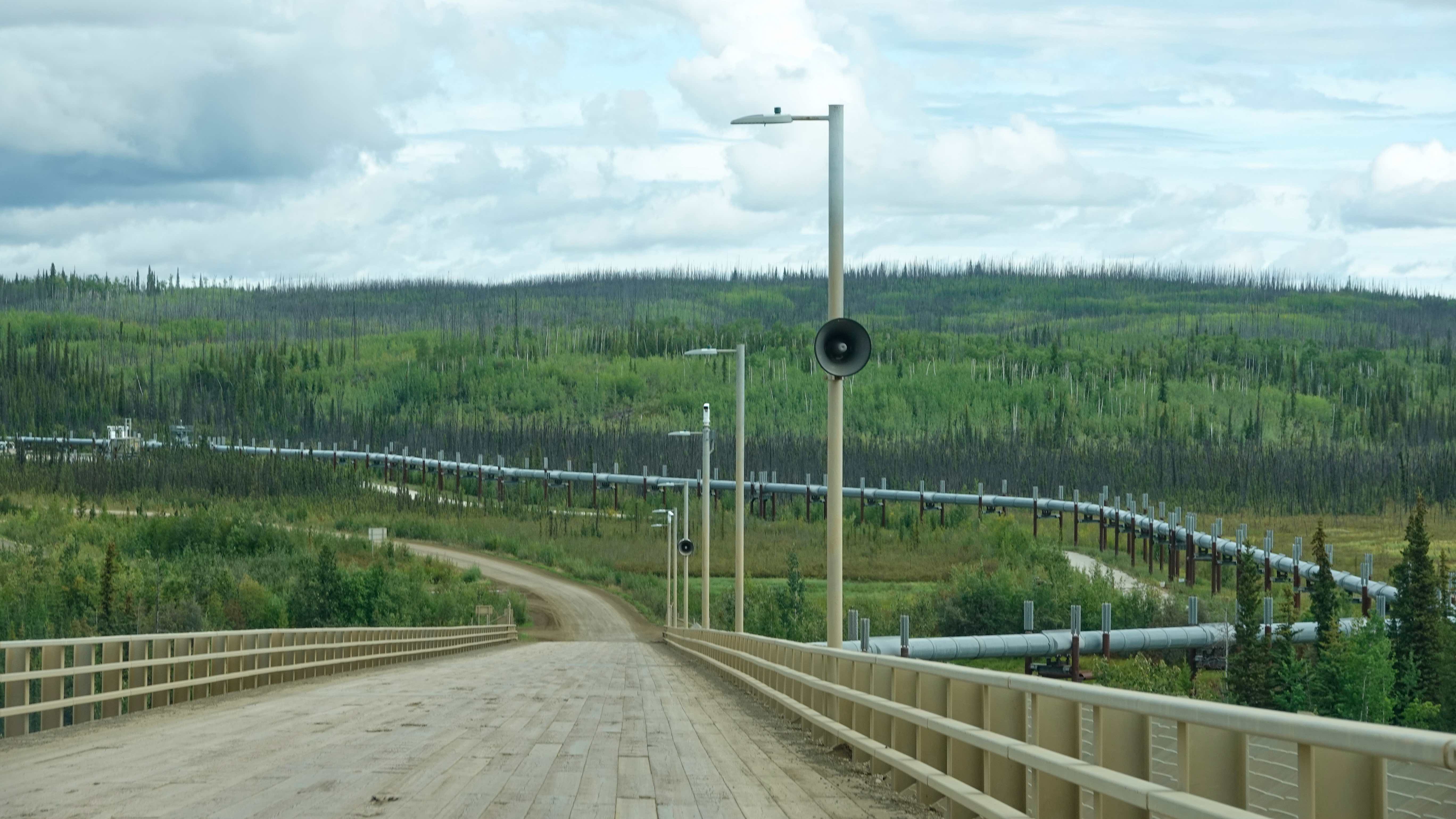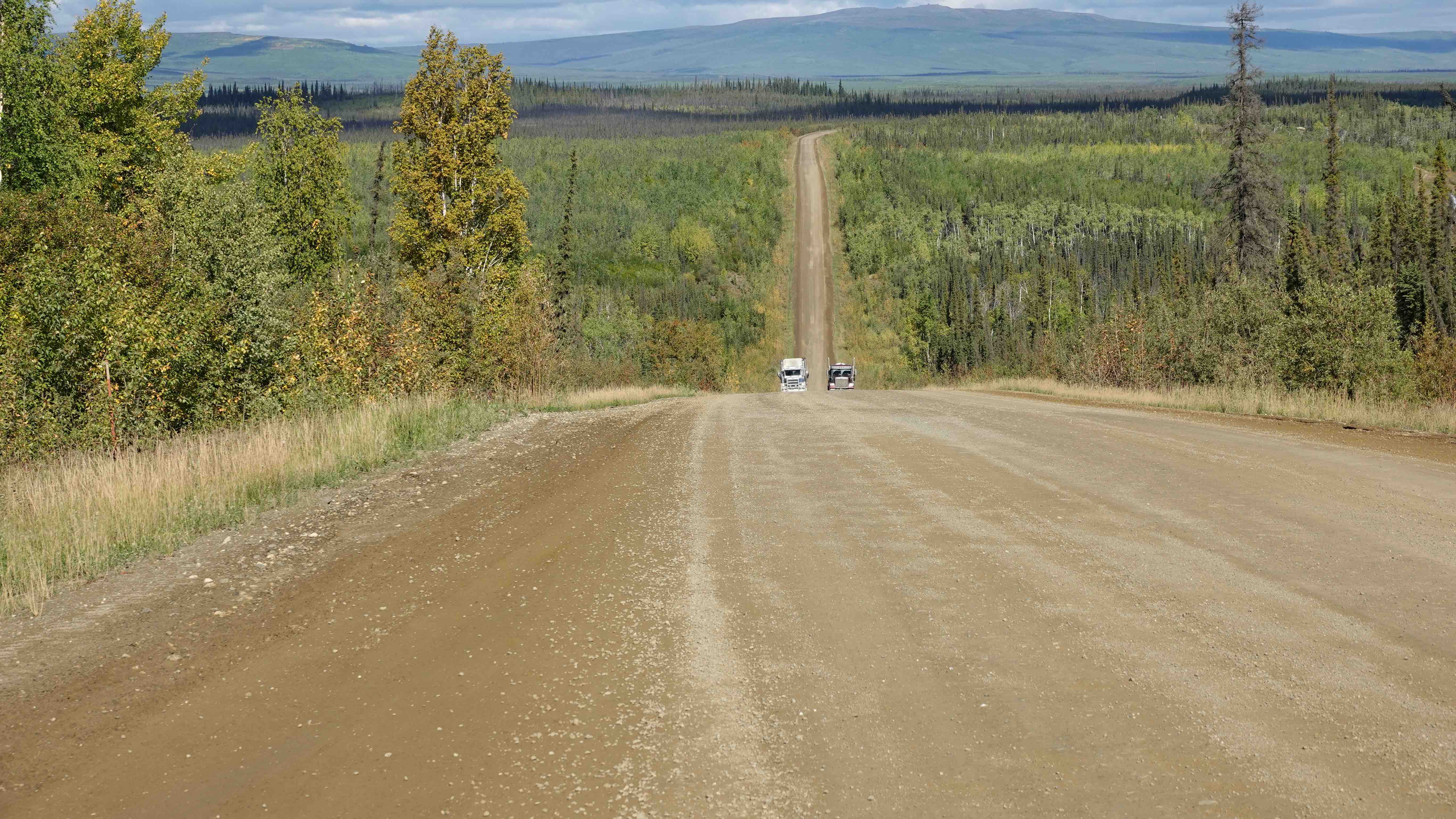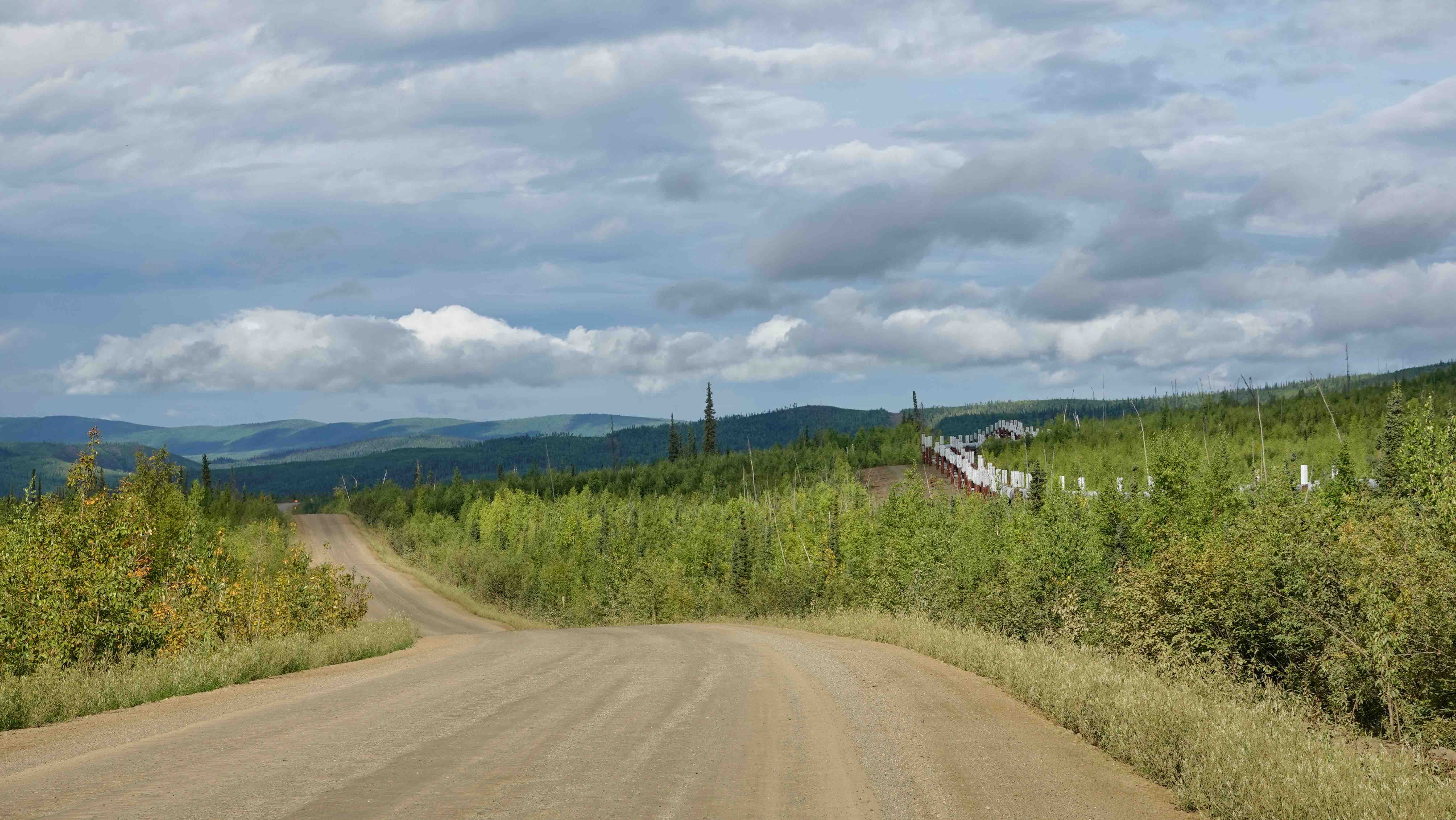 Wir überqueren den Yukon und fahren durch leicht bergiges Gelände. Die Pipeline ist gigantisch, verläuft teilweise direkt entlang der Straße, mal ist sie nur von Weitem zu sehen.