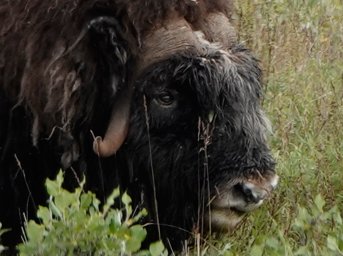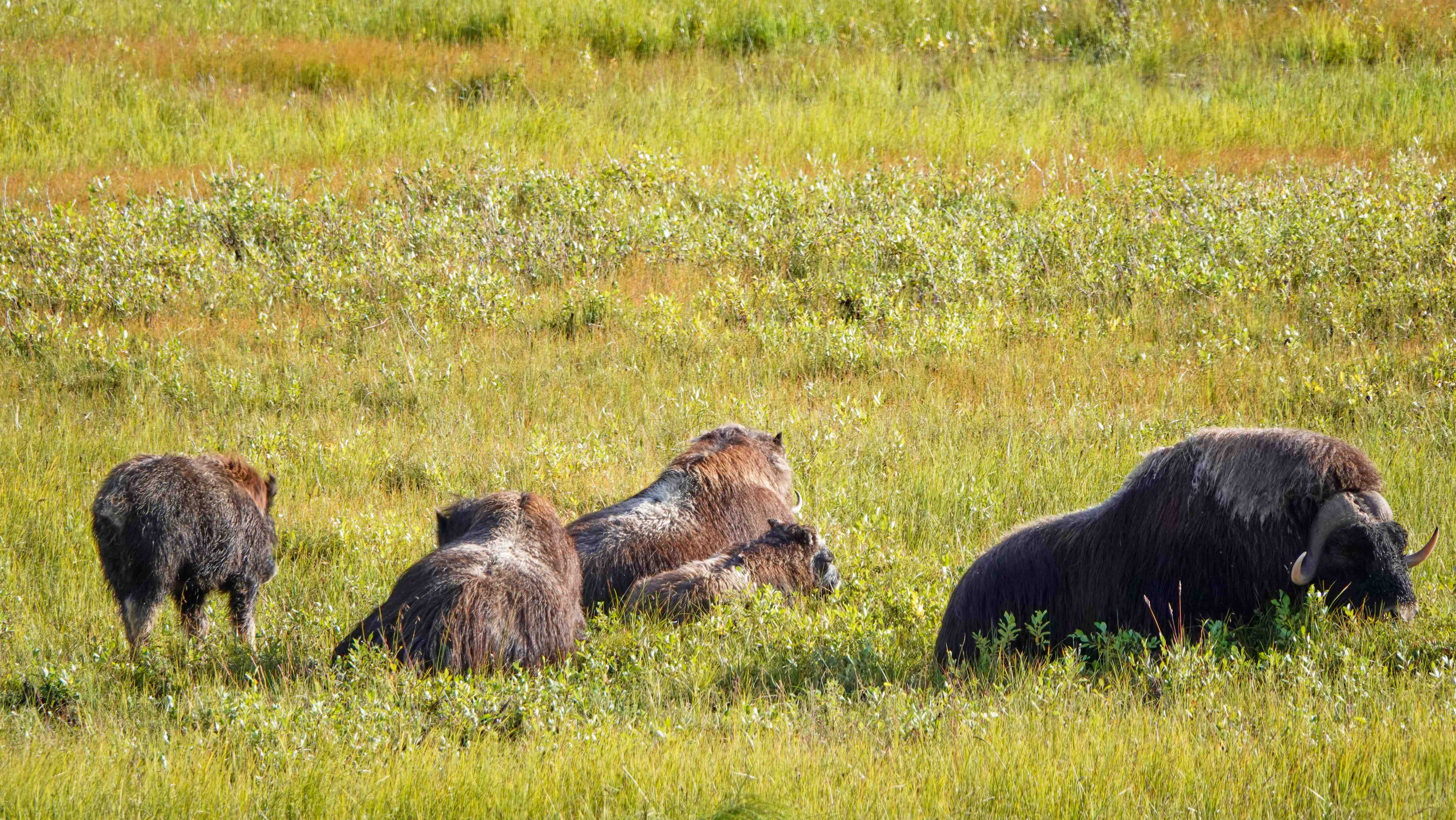 Die Straße verläuft jetzt entlang des Sagavanirktok River und tatsächlich entdeckt Walter mit seinen Adleraugen die ersten Moschusochsen, mehrere Weibchen mit ihren Jungen und natürlich auch Bullen. Behäbig ziehen sie am Fluss entlang fressen sich durchs Gebüsch. Sehr imposante Tiere, aber viel Action ist nicht…
