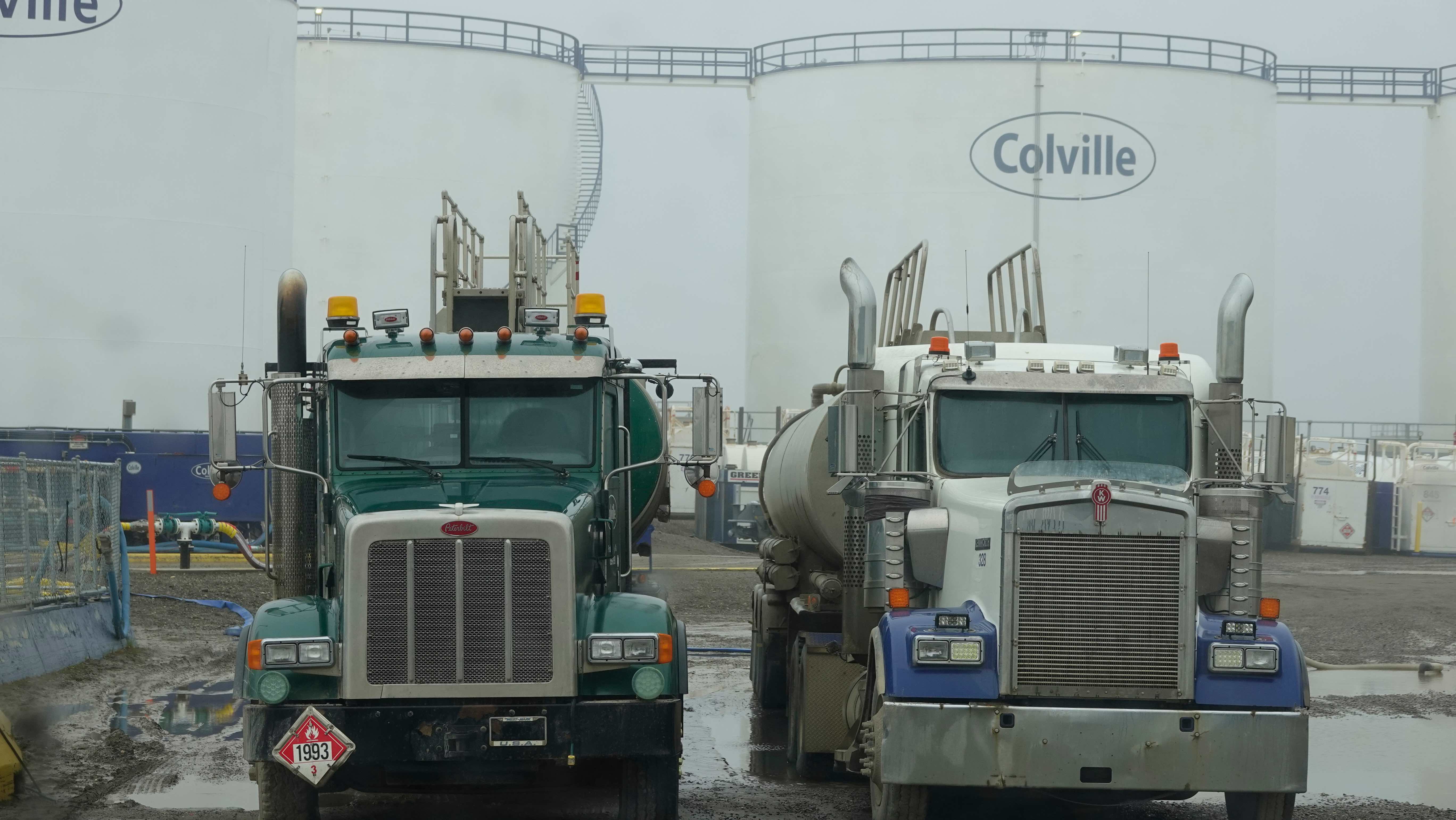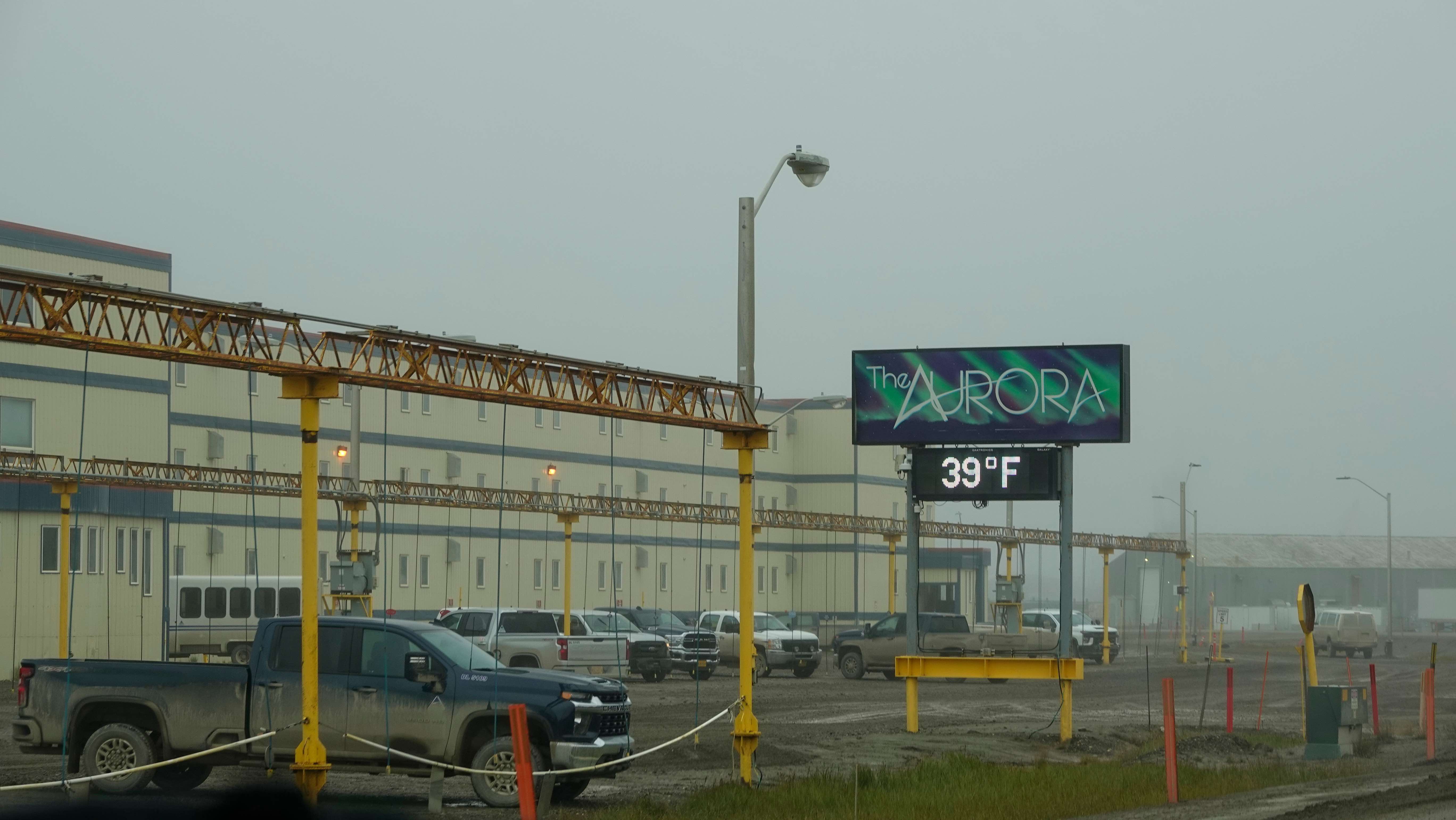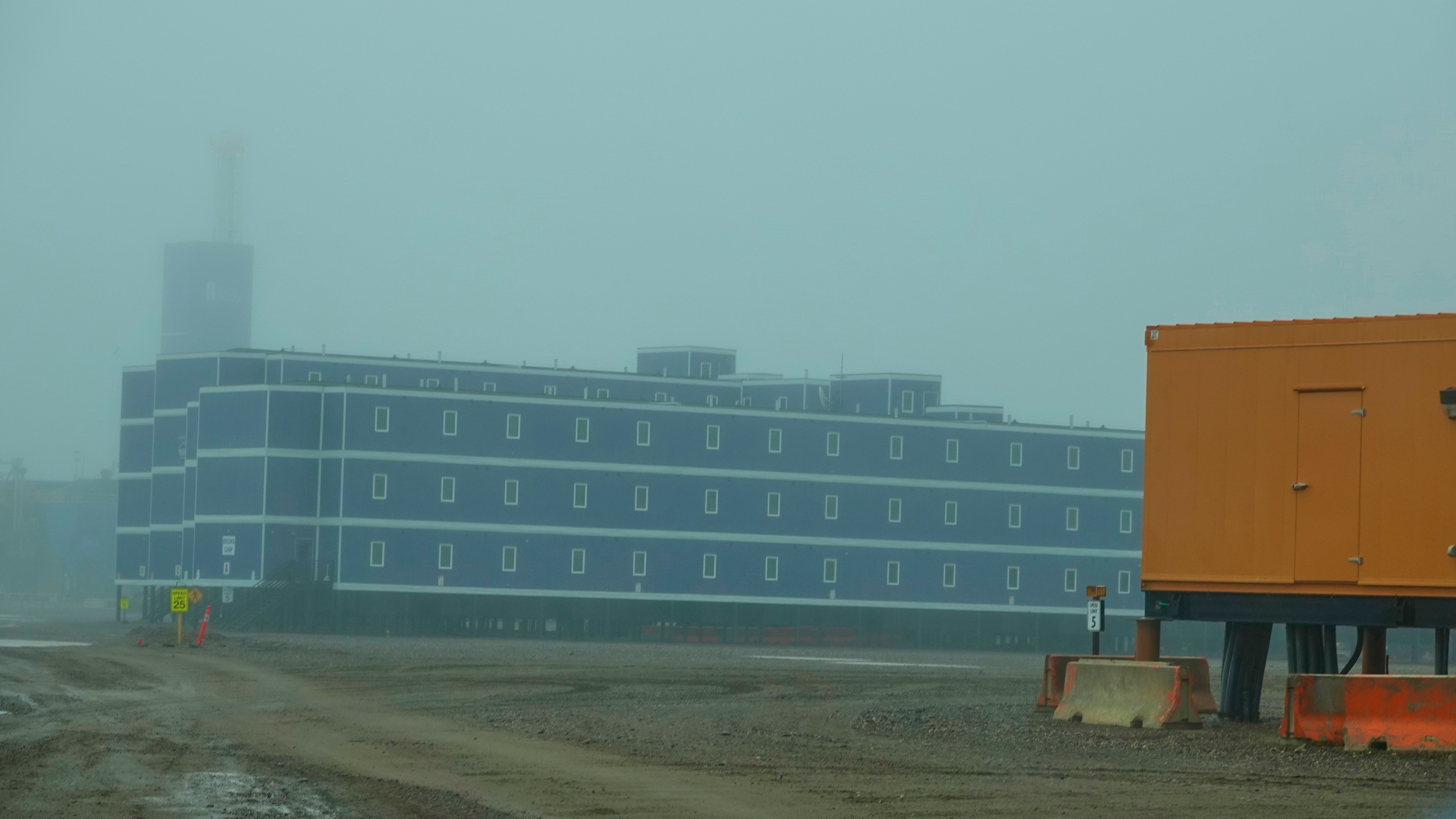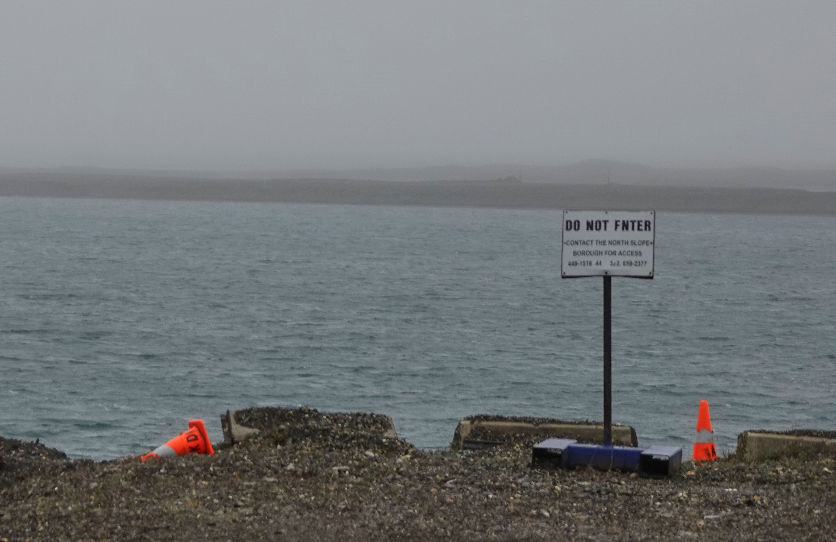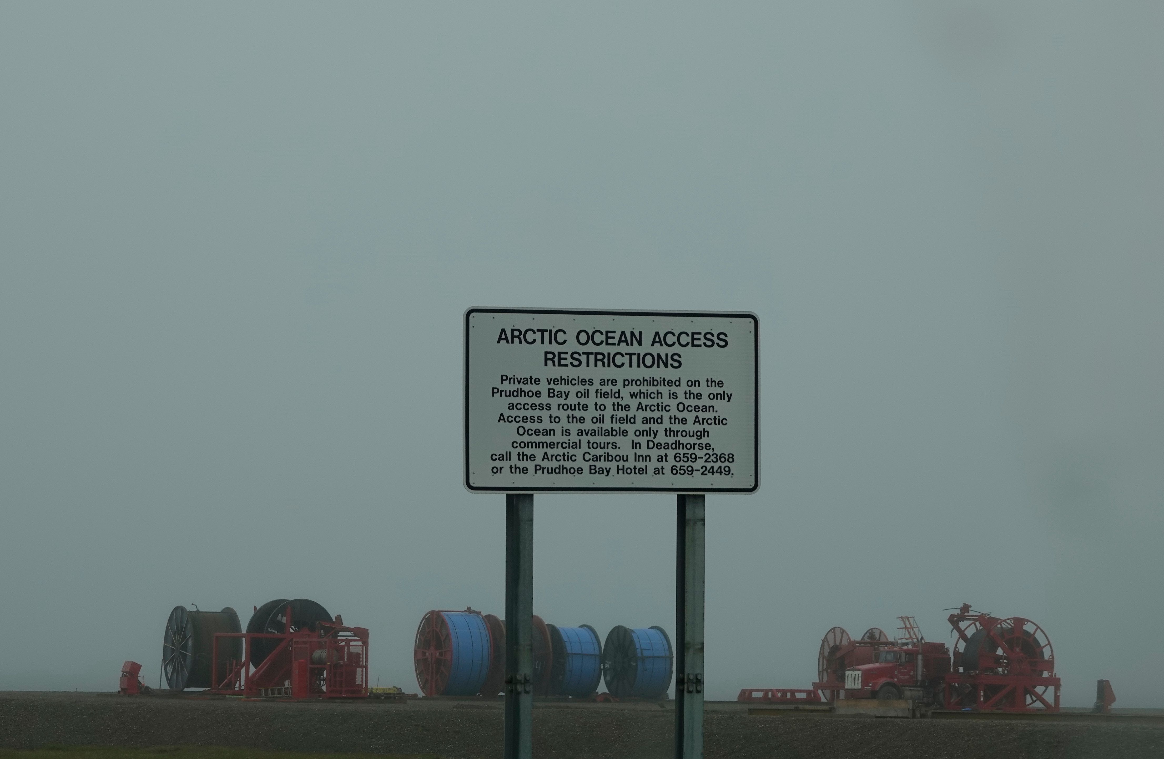 Deadhorse begrüßt uns schon von weitem mit riesigen Industrieanlagen, schwerem Gerät überall , Monstertrucks und zweckmäßigen Wohnanlagen. Die Stadt hat sich dezent in Nebel gehüllt, eine Schönheit ist sie wahrlich nicht. Allerdings hat dieses industrielle Outfit auch einen ganz eigenen Charme, direkt an der Mündung des Sag Rivers in die Prudhoe Bay.