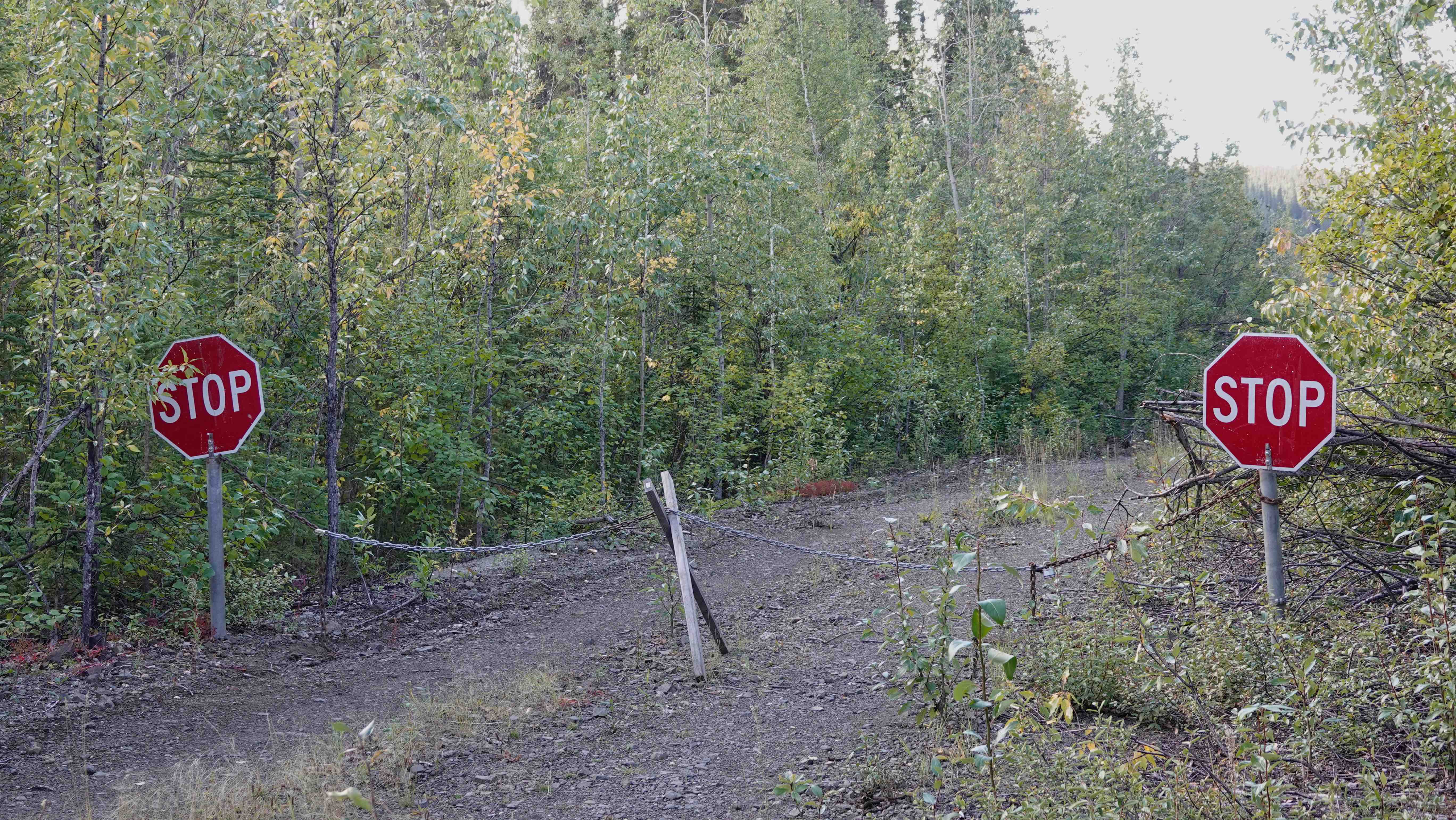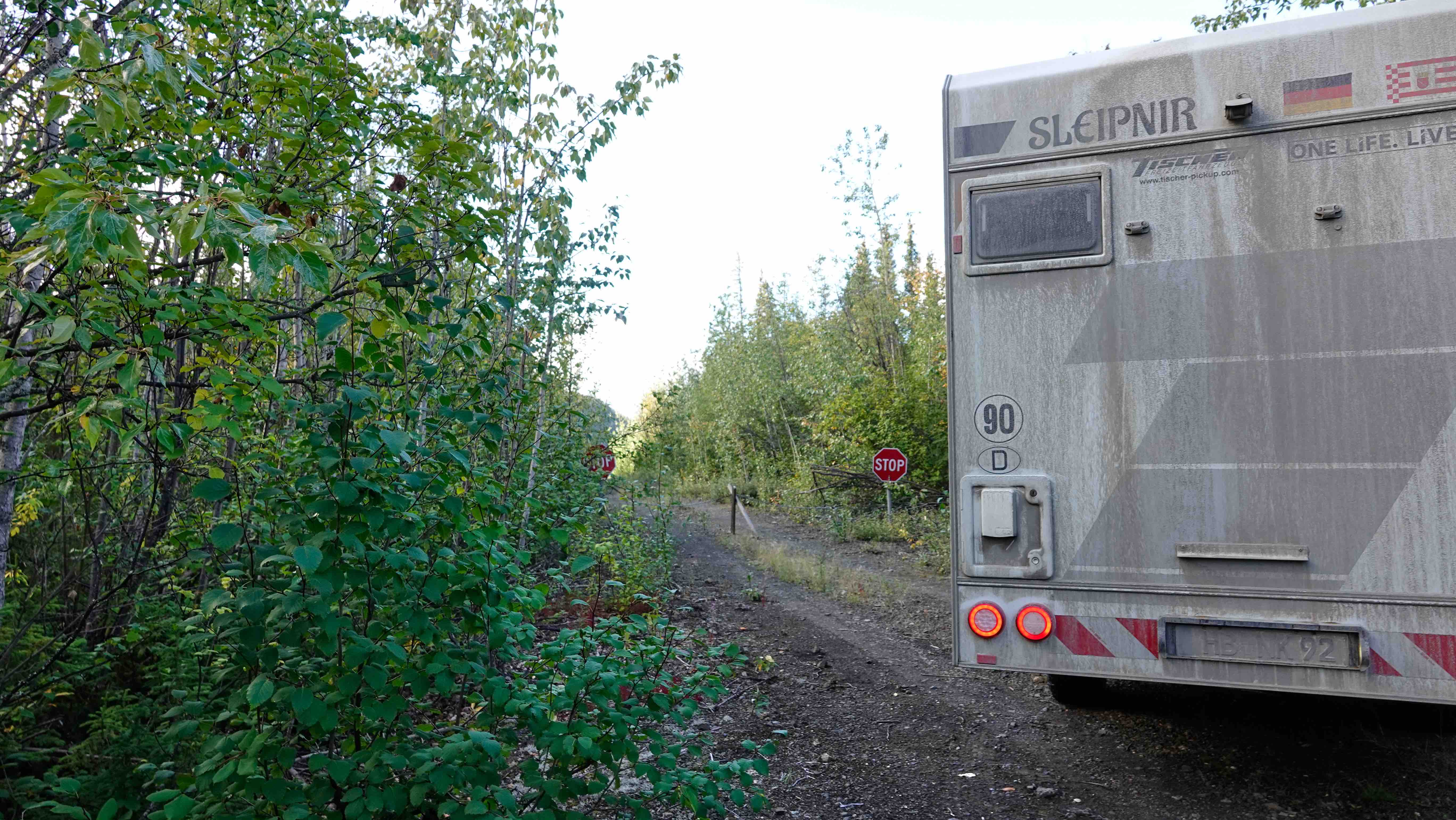 Nach ungefähr 7 km versperrt eine Kette den Weg und zwei große Stoppschilder deuten ebenfalls darauf hin, dass es hier für uns nicht weiter geht. Ein dezent an einem Baum befestigtes Schild weist darauf hin, dass das Land unter der Verwaltung der First Nation steht. Pech gehabt, wir hätten uns gewünscht, dass das Schild schon zu Beginn der Piste aufgestellt worden wäre. Egal, Spaß gemacht hat der kleine Ausflug auf jeden Fall!