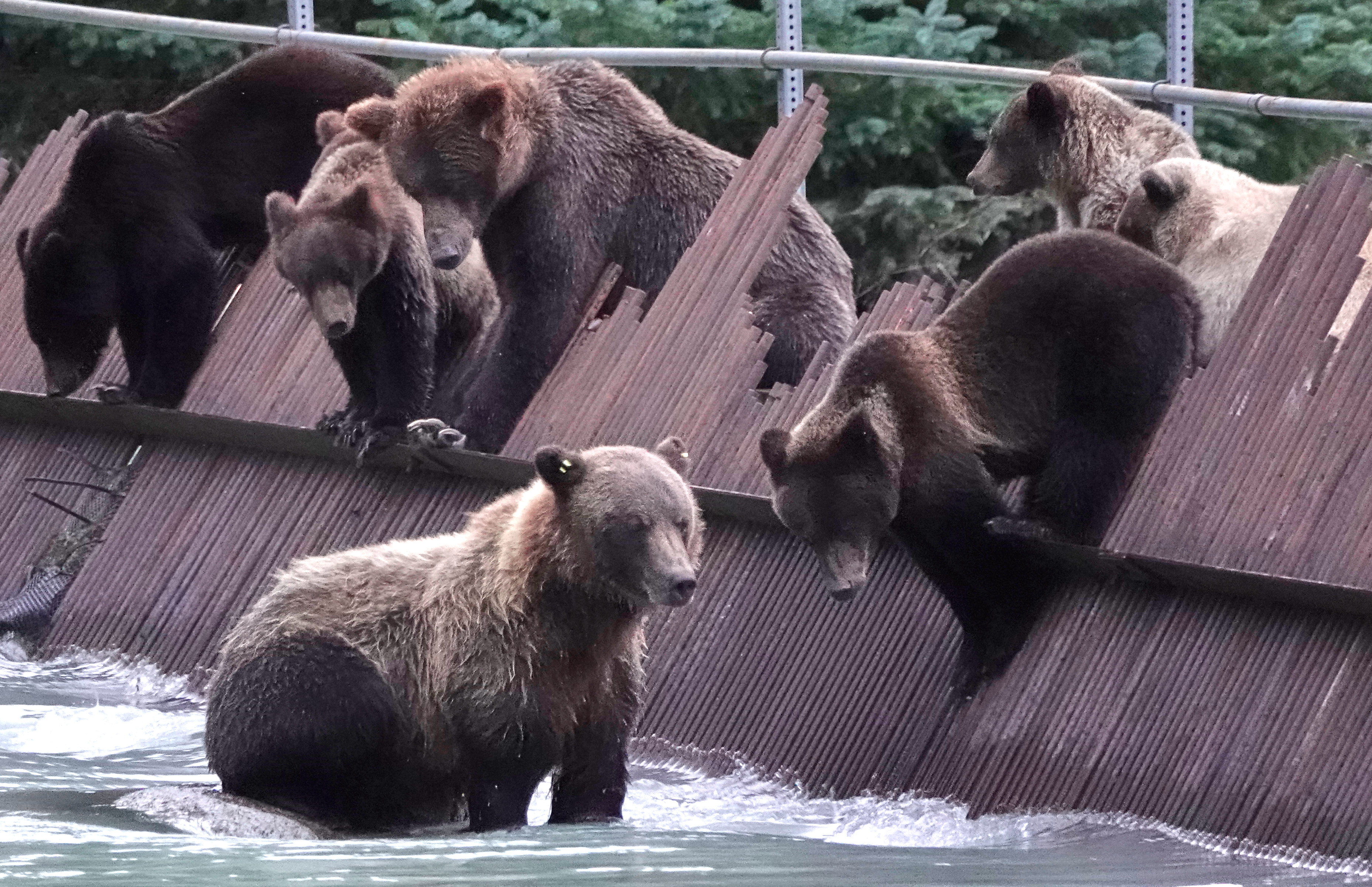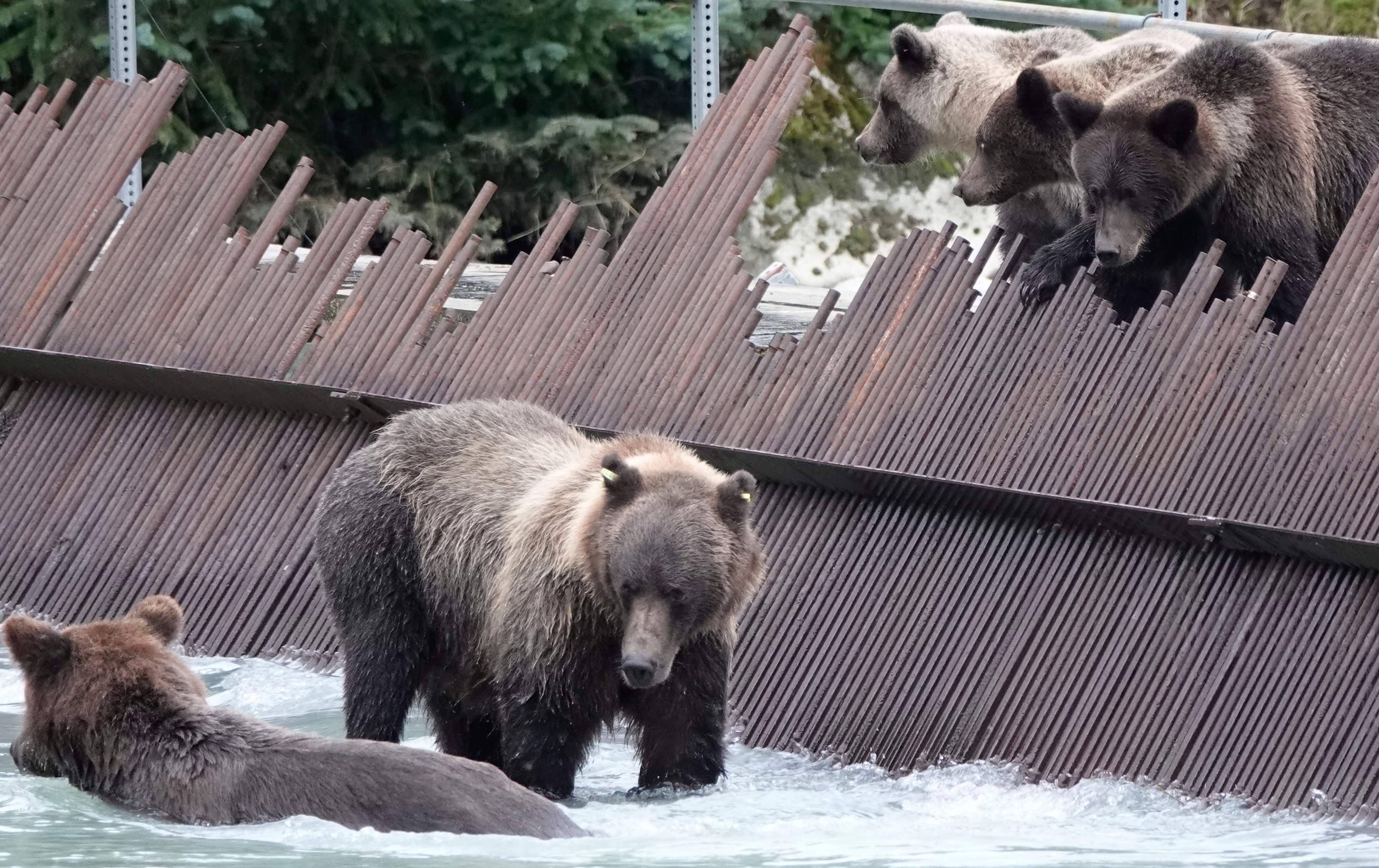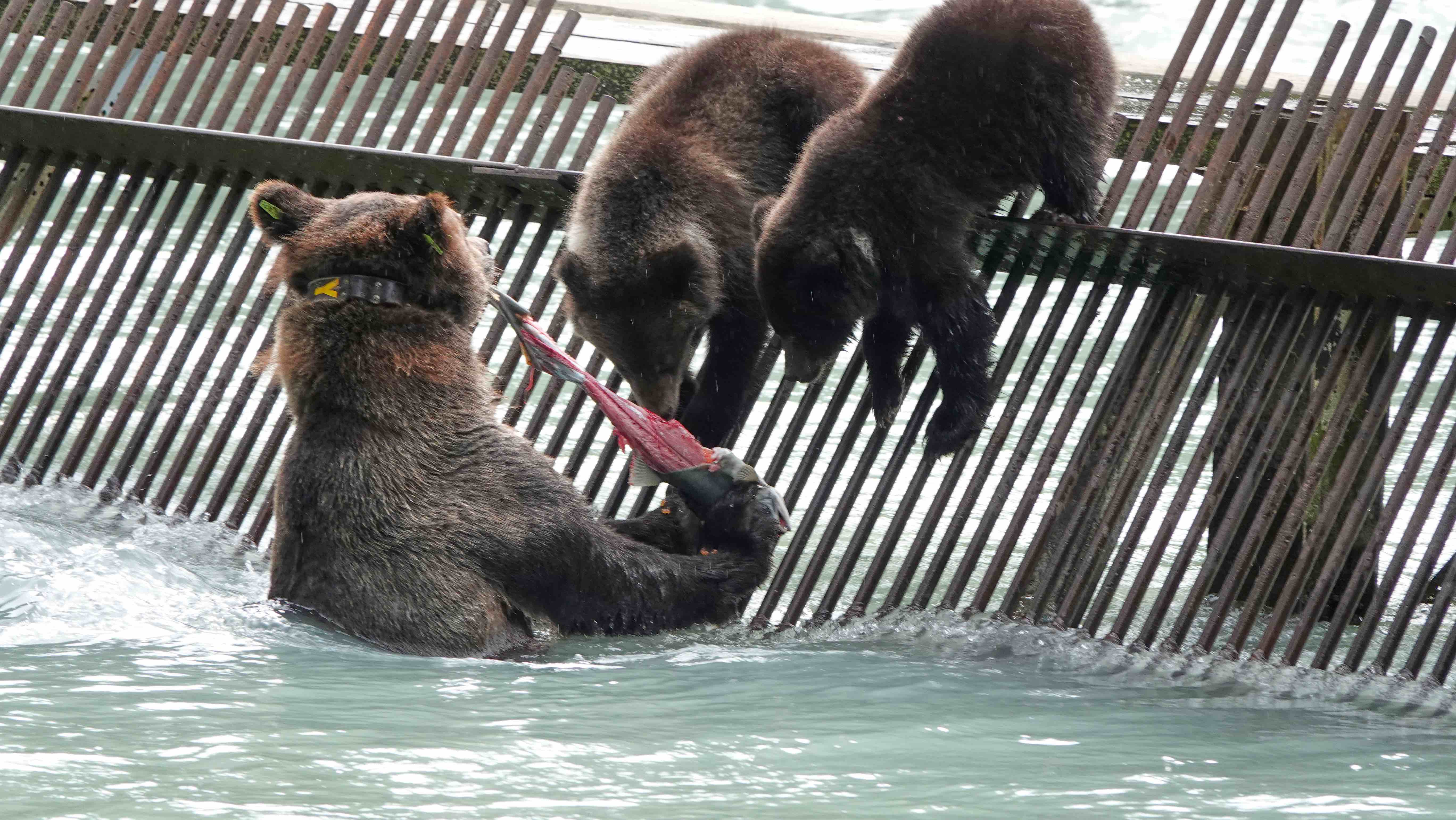 Zwei Grizzlybären mit jeweils drei Jungen sind unermüdlich mit Lachsfangen beschäftigt. Sehr geschickt wird der Lachs geschnappt und im Maul zu den Jungen gebracht, manchmal wird er direkt vor Ort verspeist, manchmal verlässt die gesamte Familie den Fluss und speist lieber im nahen Wald.