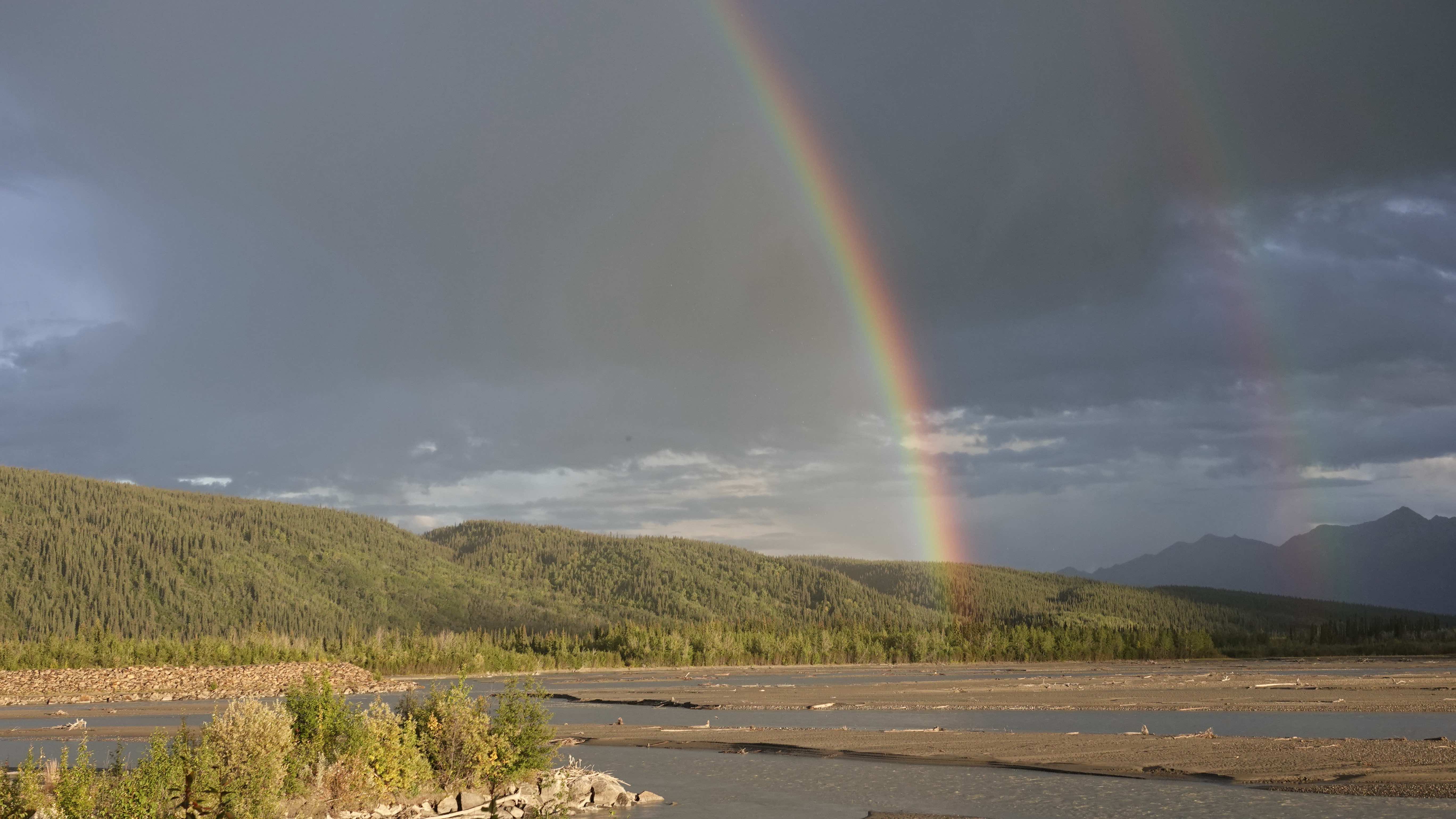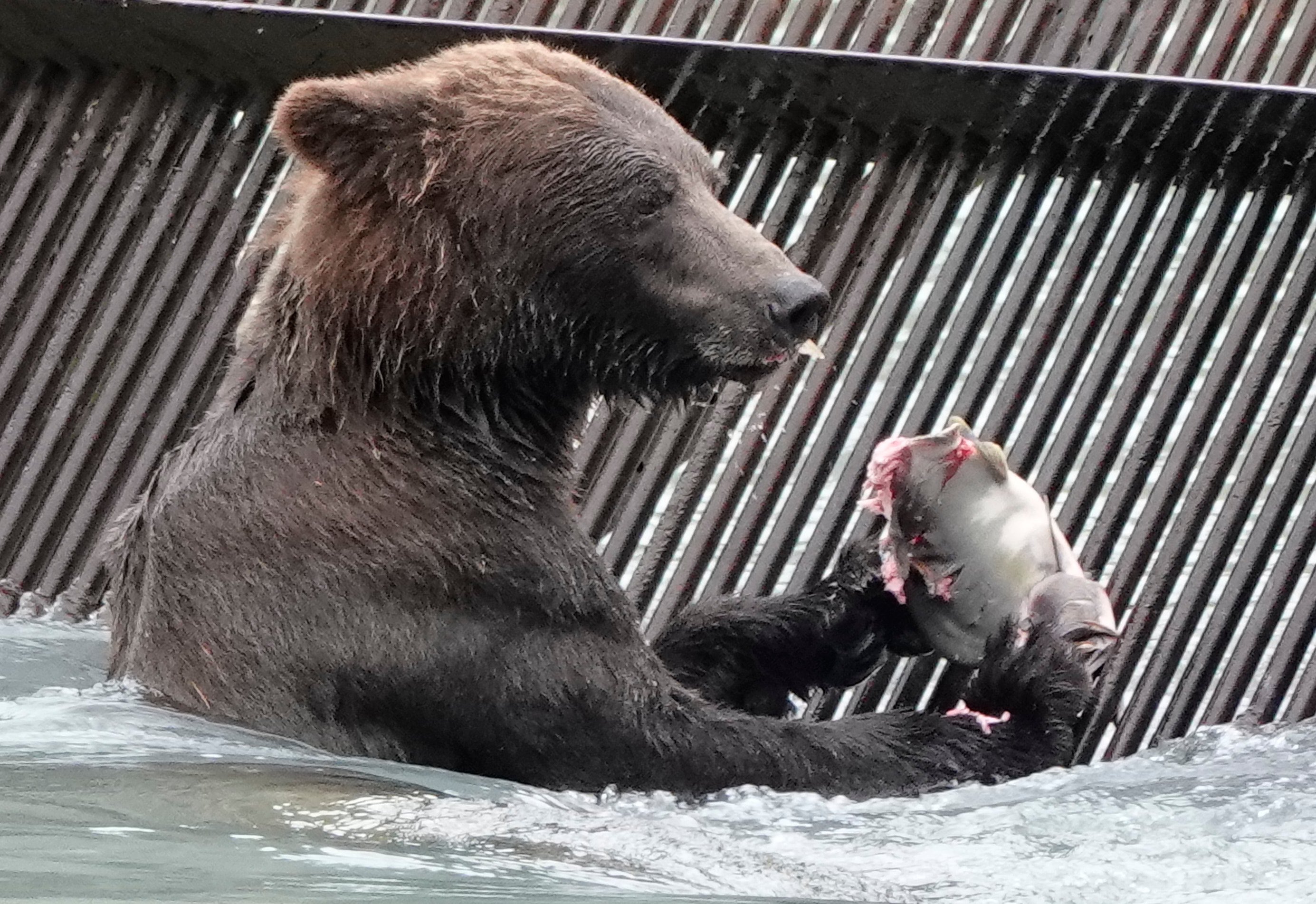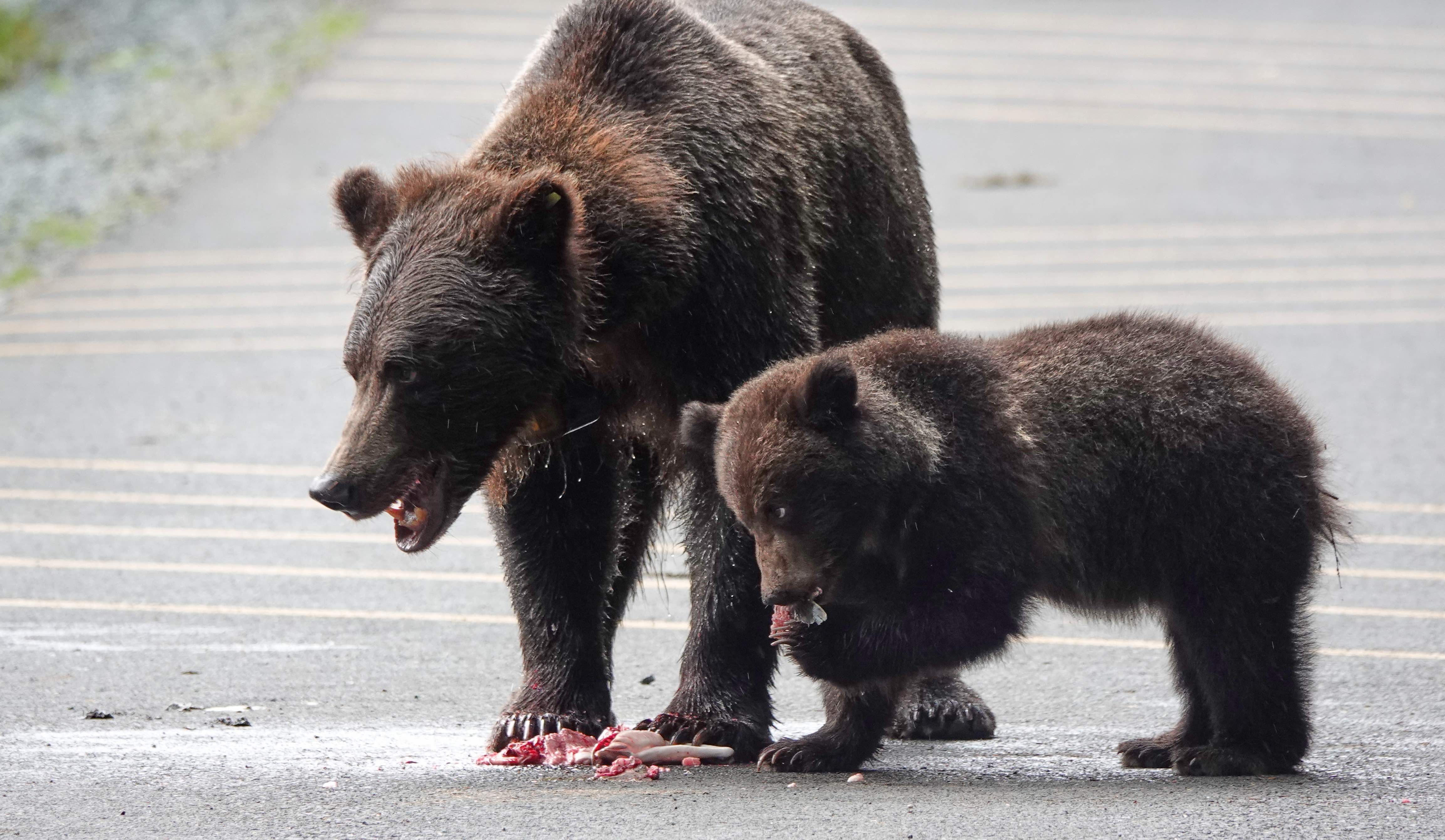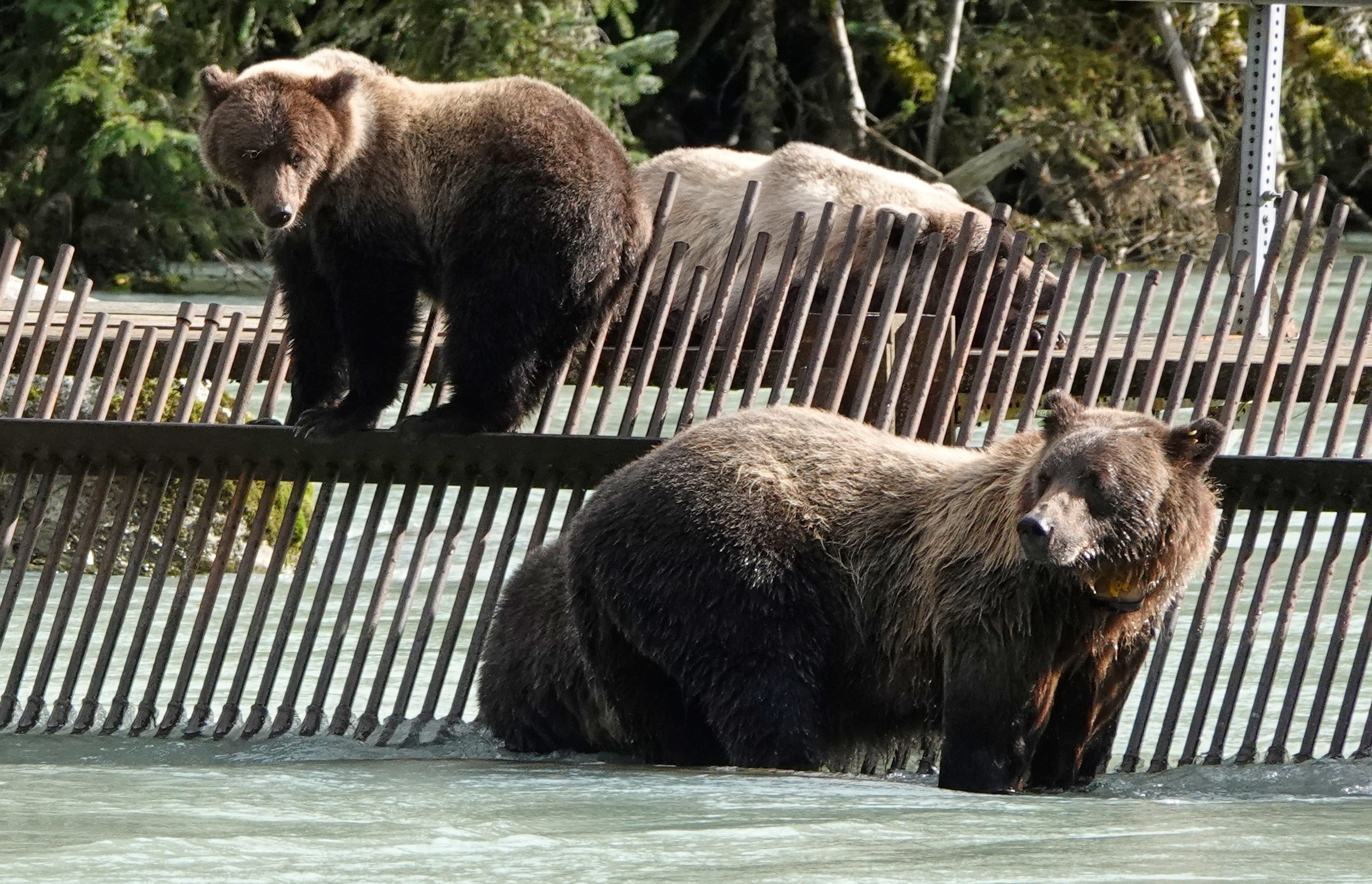Zwei Grizzlybären mit jeweils drei Jungen sind unermüdlich mit Lachsfangen beschäftigt. Sehr geschickt wird der Lachs geschnappt und im Maul zu den Jungen gebracht, manchmal wird er direkt vor Ort verspeist, manchmal verlässt die gesamte Familie den Fluss und speist lieber im nahen Wald.