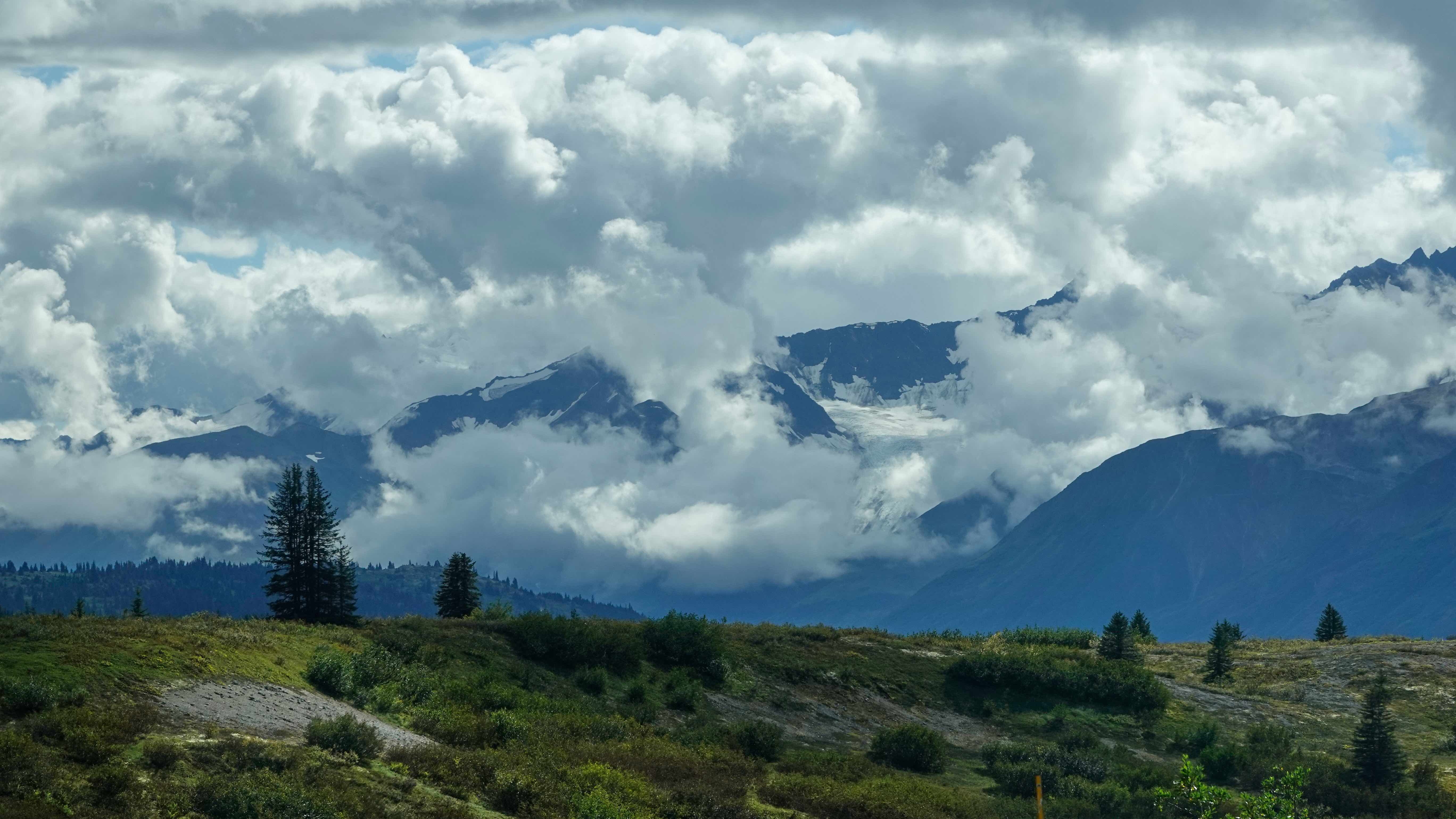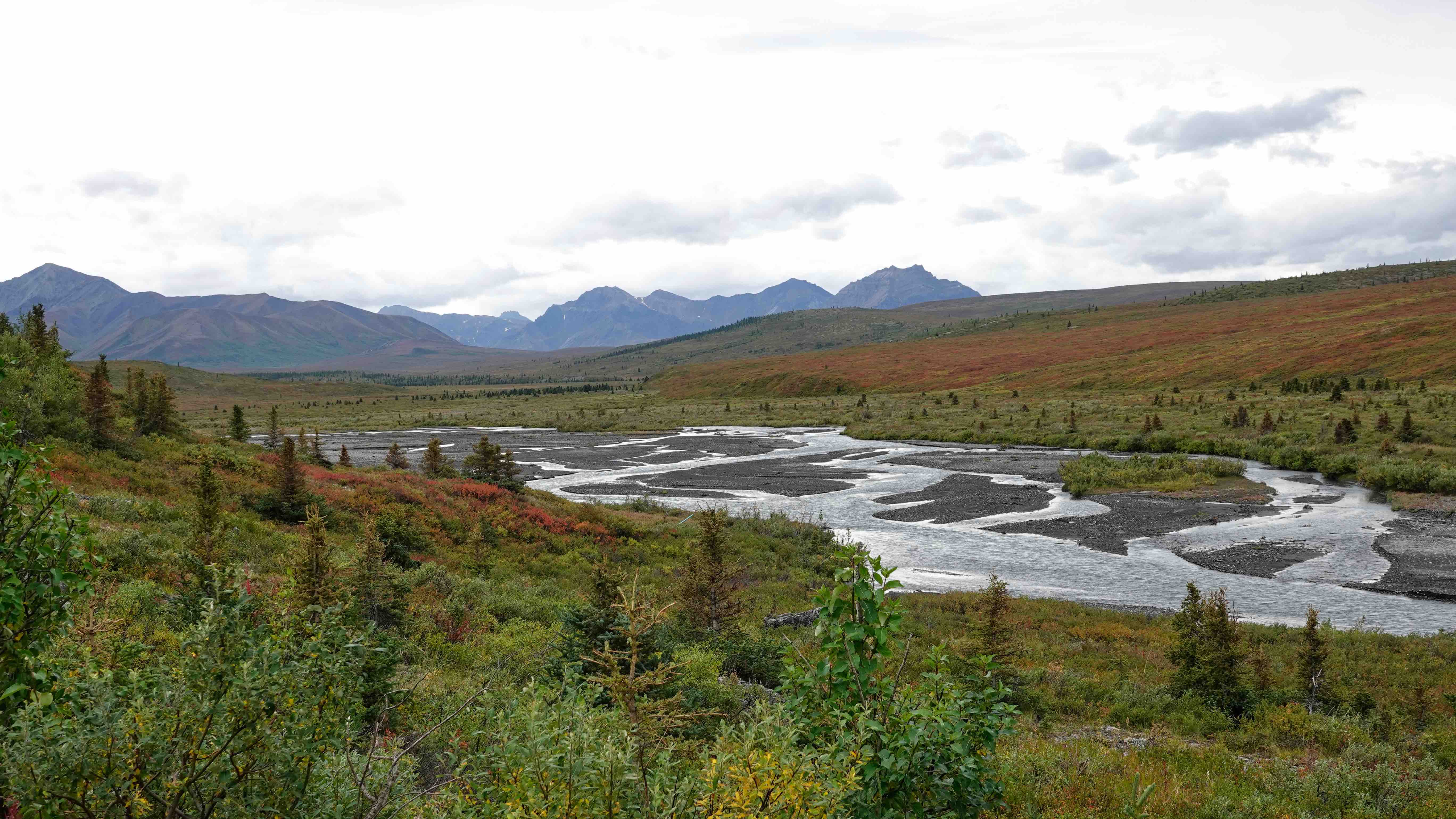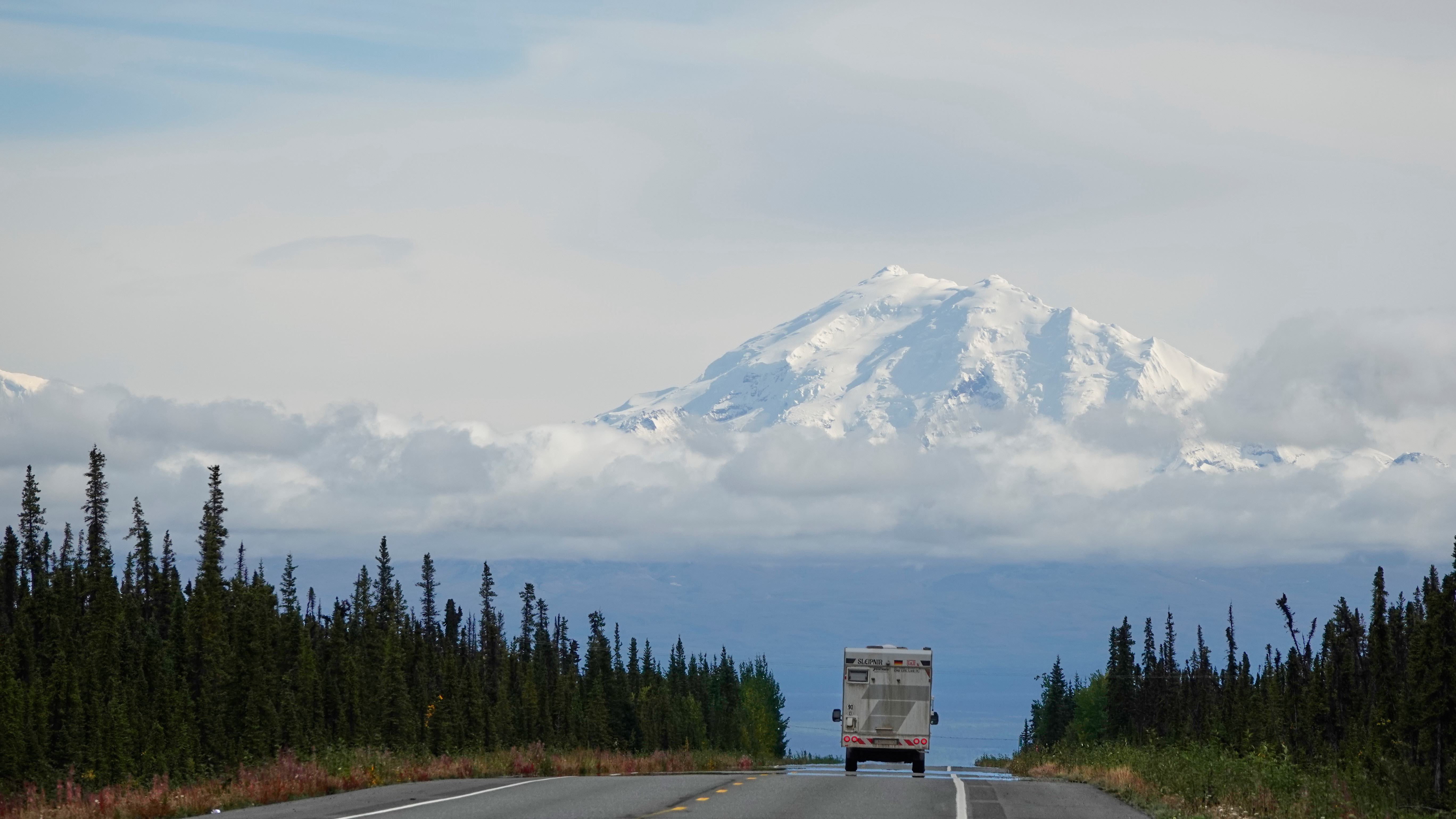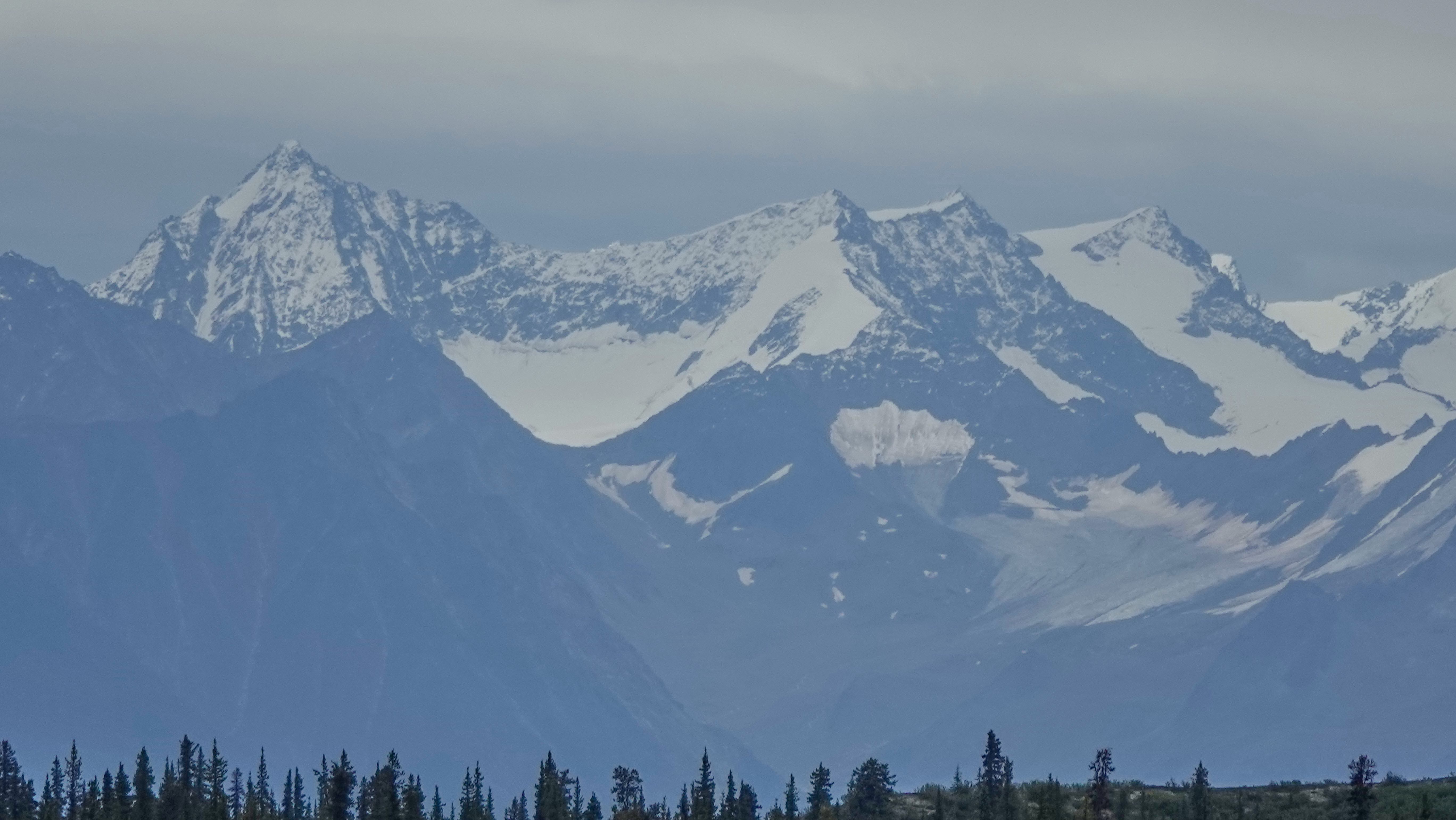 Auch auf unserer Fahrt weiter auf dem Denali Highway haben wir kein Glück mit einem Foto des Berges, dafür jede Menge Ausblicke auf andere schneebedeckte Berge der Alaska Range, bunte Berge, Gletscher und Vieles mehr…