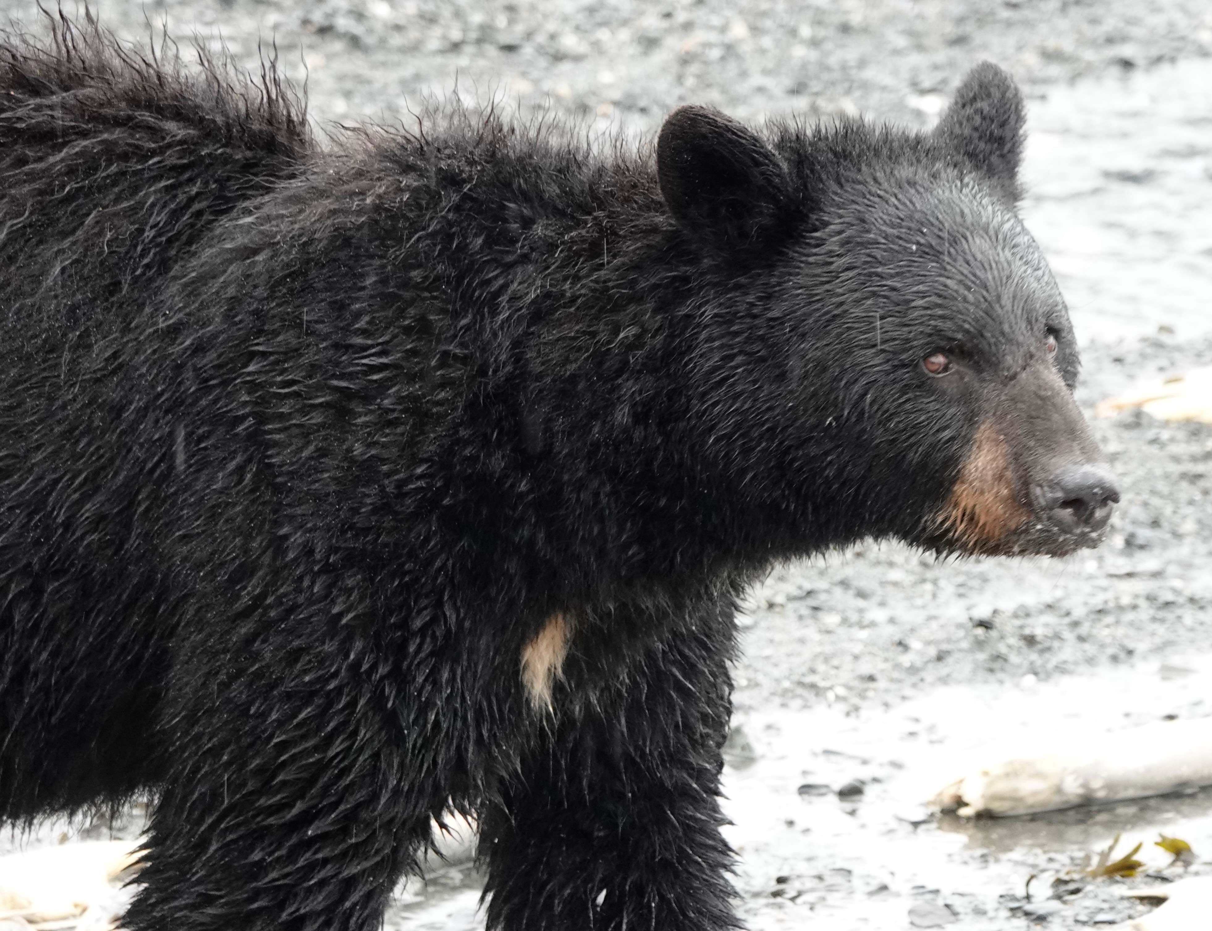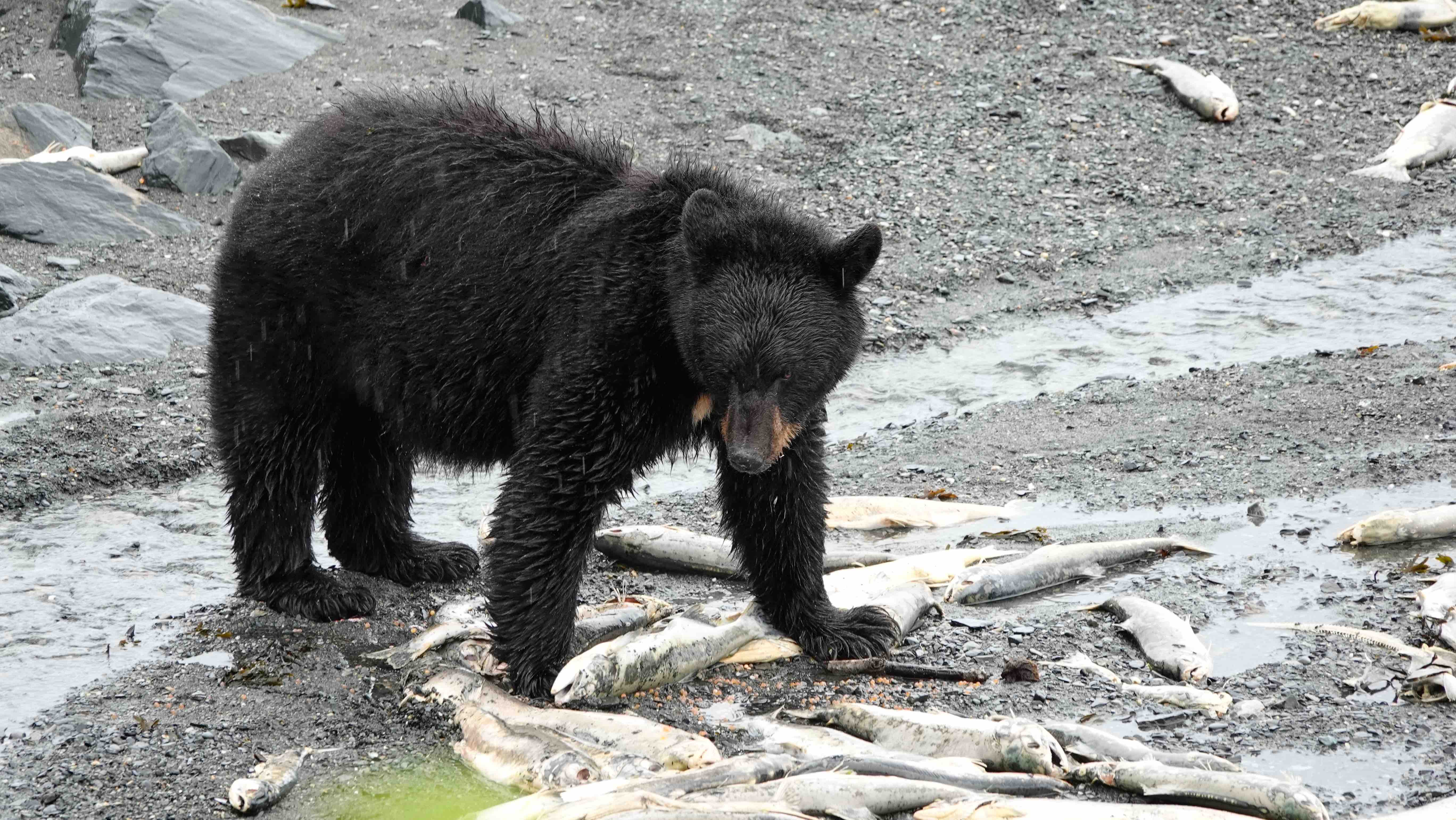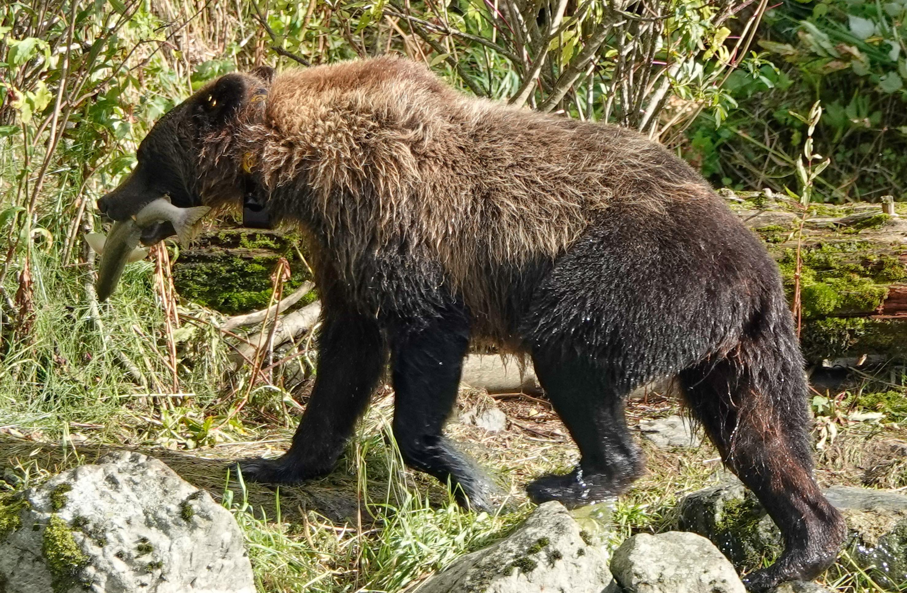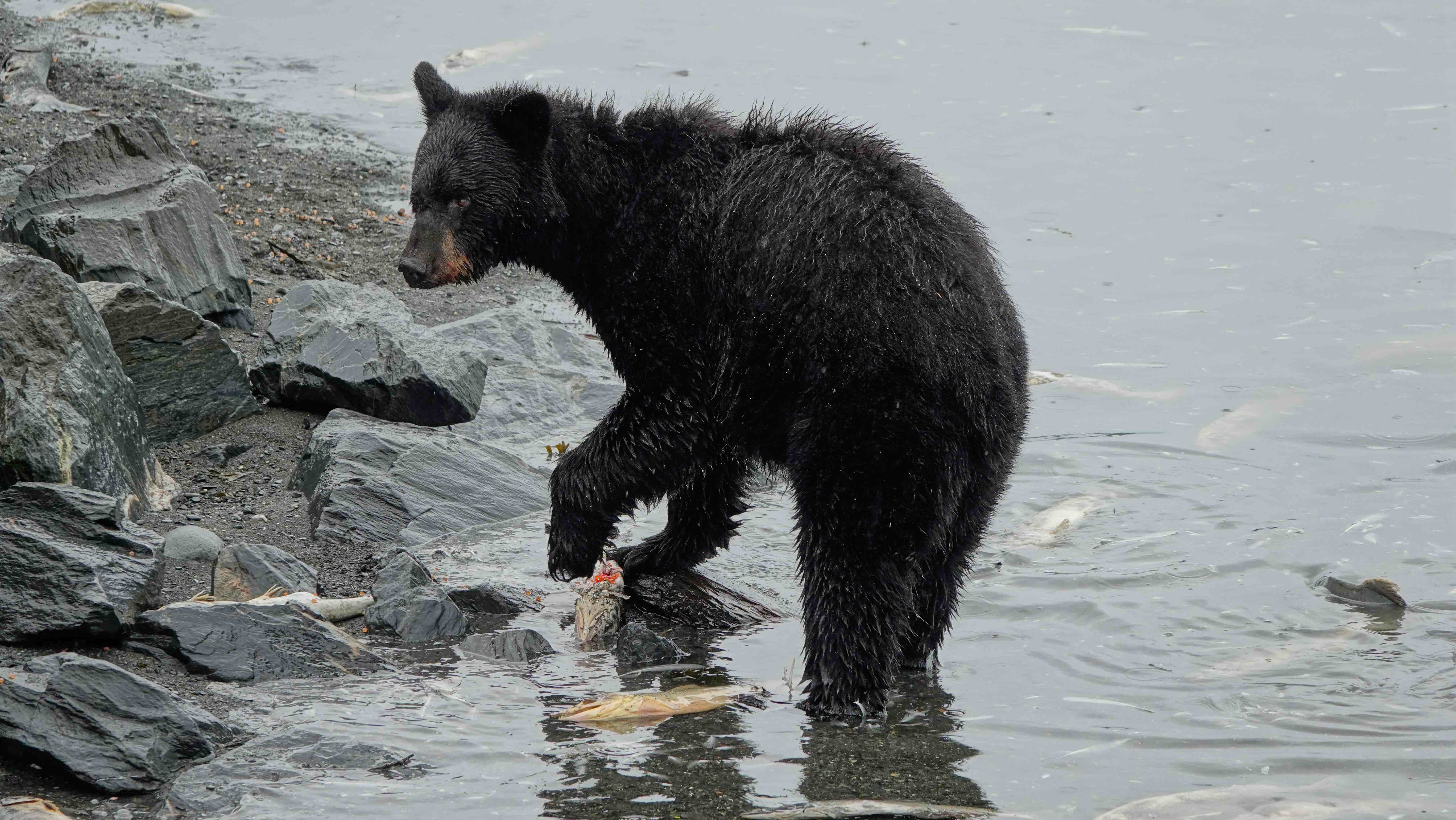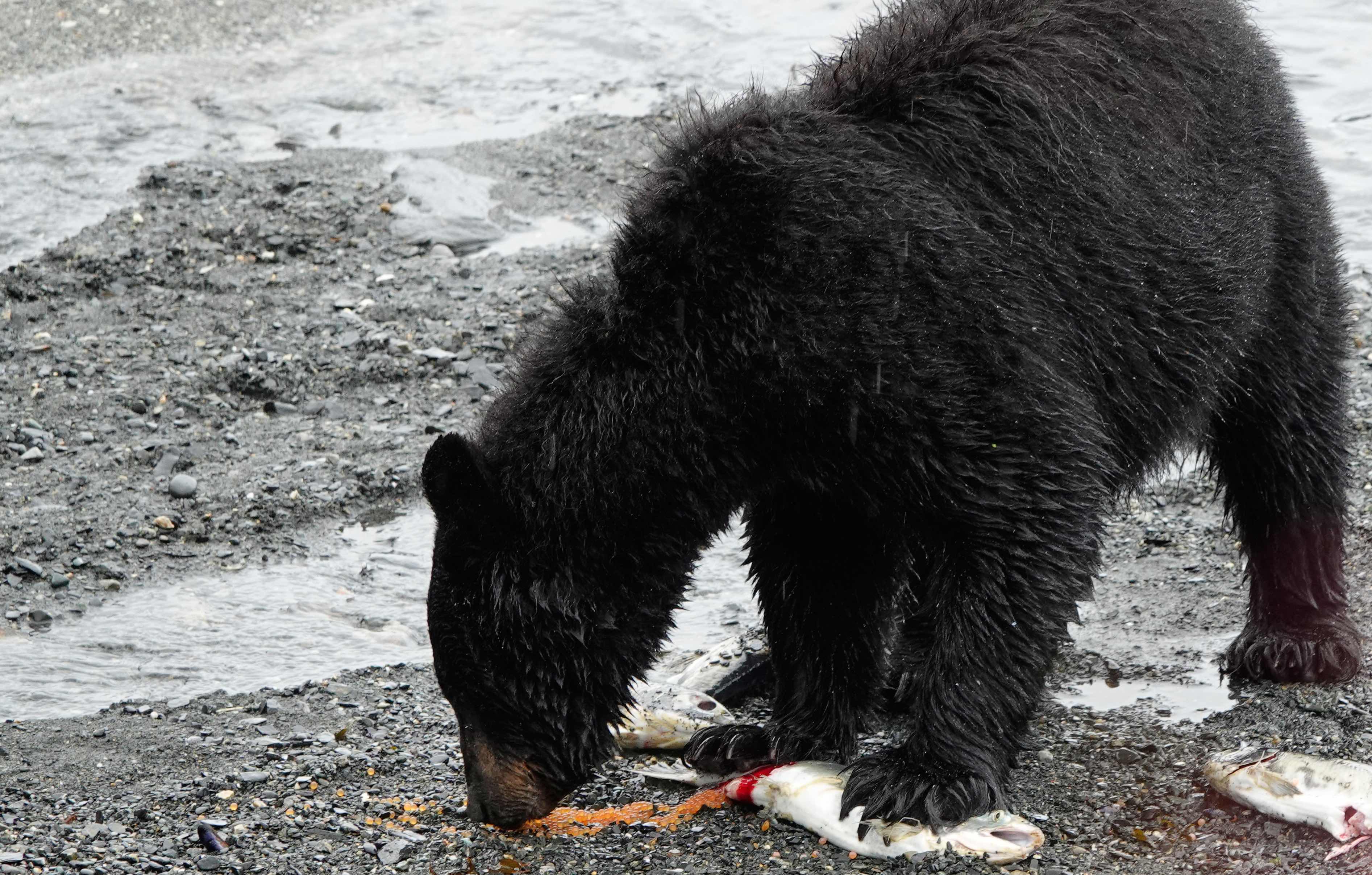 Endlich sehen wir auch noch einen Schwarzbär, der sich am Ufer über die Lachse hermacht. Ein wahrer Feinschmecker, er drückt nur jeweils den Rogen aus und schleckt die Eier genüsslich auf, Kaviar für Bären 🙂 .