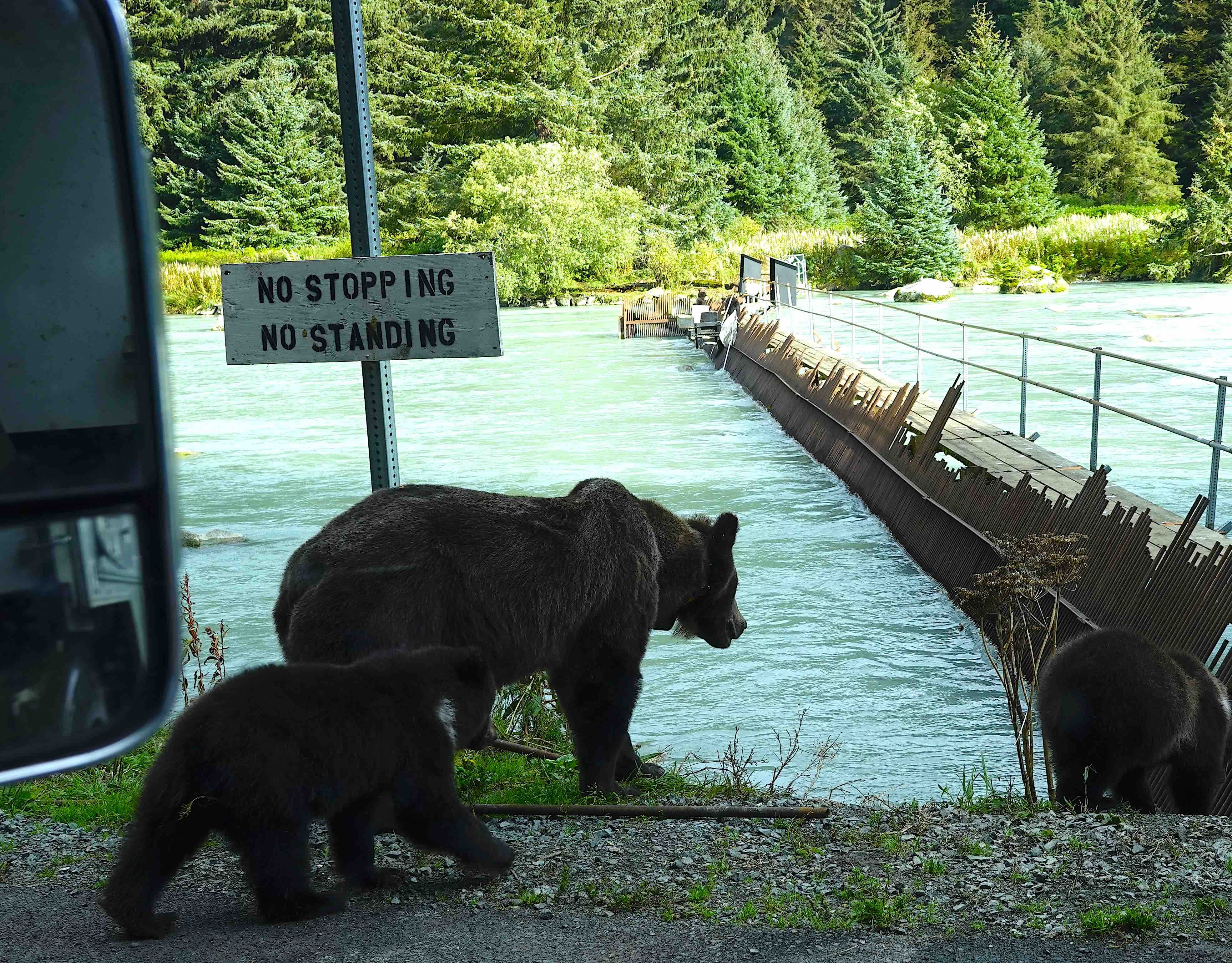 In Haider fahren wir direkt zu dem Bärenbeobachtungspunkt, der im Reiseführer beschrieben war. Ein Stück hinter dem Fährhafen, am Chilkoot River werden wir fündig. An einem kleinen Wehr staut sich das Flüsschen und etliche Bären sind zu sehen. Wir stehen am Straßenrand und haben eine tolle Sicht auf das Getümmel am Wehr. Auf unserer Seite ist ein Weg zu erkennen, den die Bären immer nutzen und man soll dort auf keinen Fall den Bären im Weg stehen.