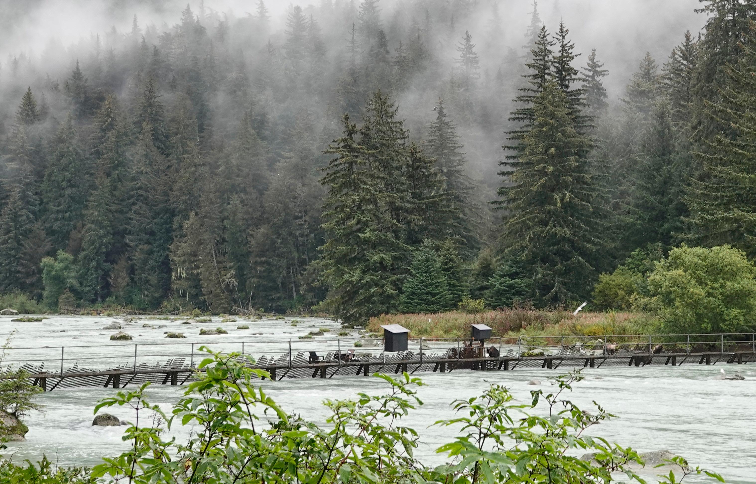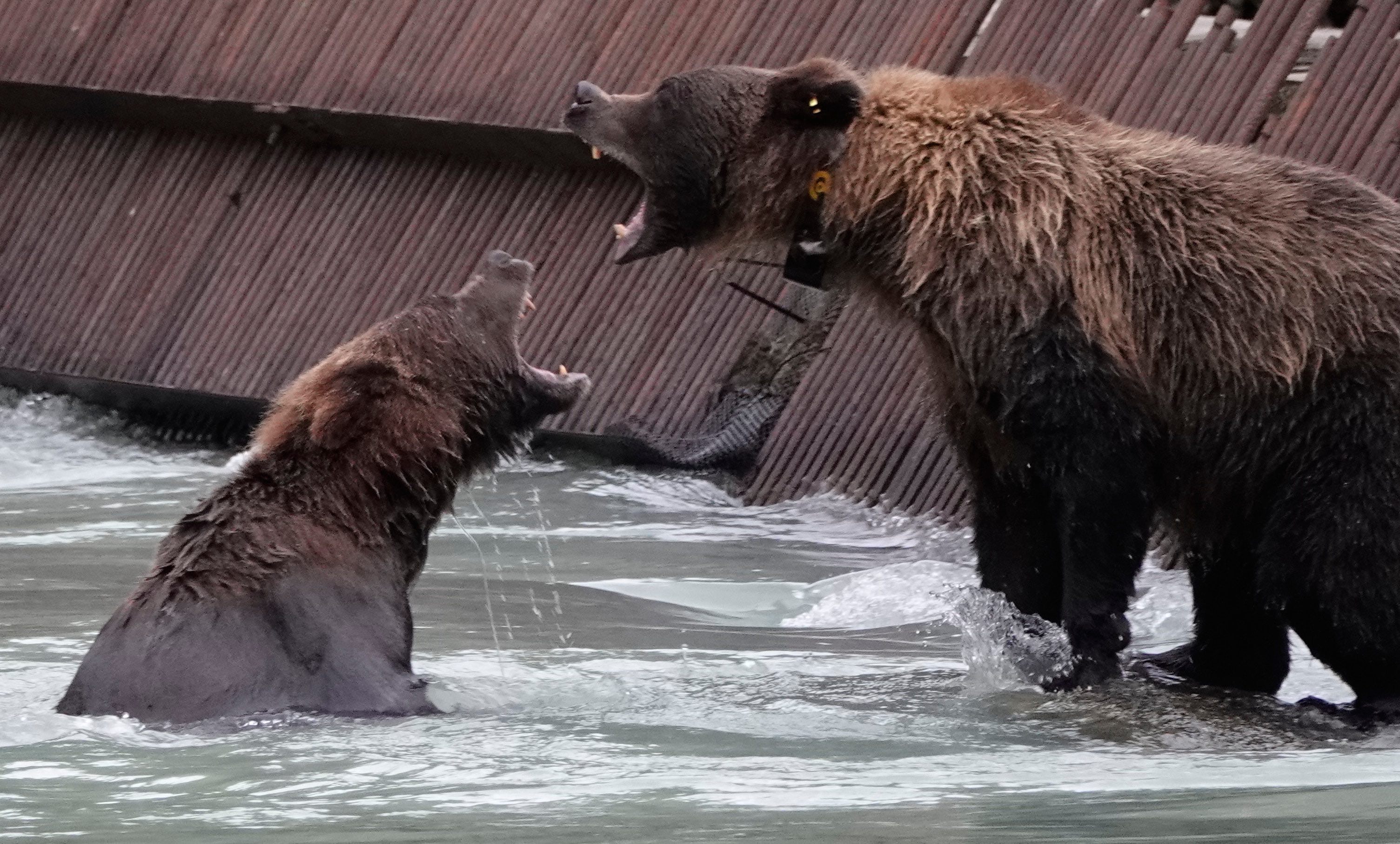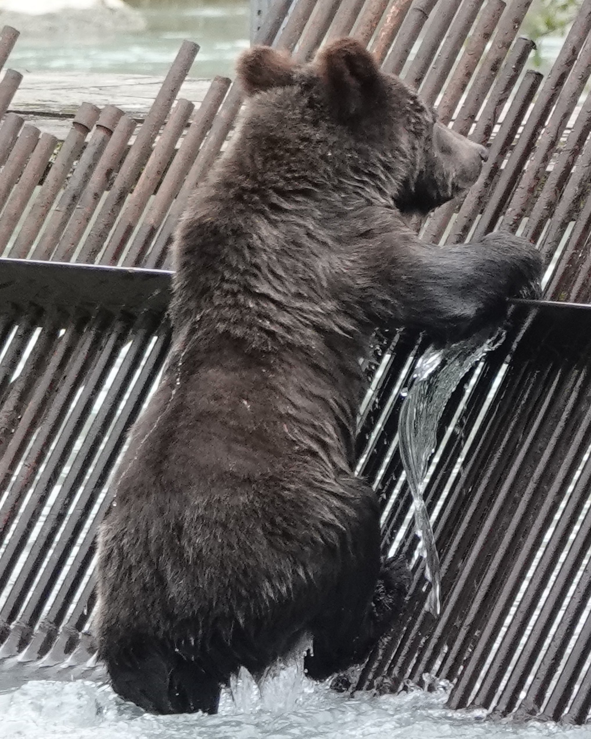 Auf dem Wehr sitzt gegen Abend ein junger Mann, der Sokey-Lachse zählt. Ein heikler Posten – von zwei Seiten kommt immer mal wieder eine Bärenmutter und will vorbei, aber der Zähler scheucht sie mit lauten Rufen, Armgefuchtel und auch mal mit der Hupe weg. Gut zu beobachten, wie die Taktik so ist. Allerdings hat er auch noch ein Gewehr dabei, sollte das alles nicht ausreichen.