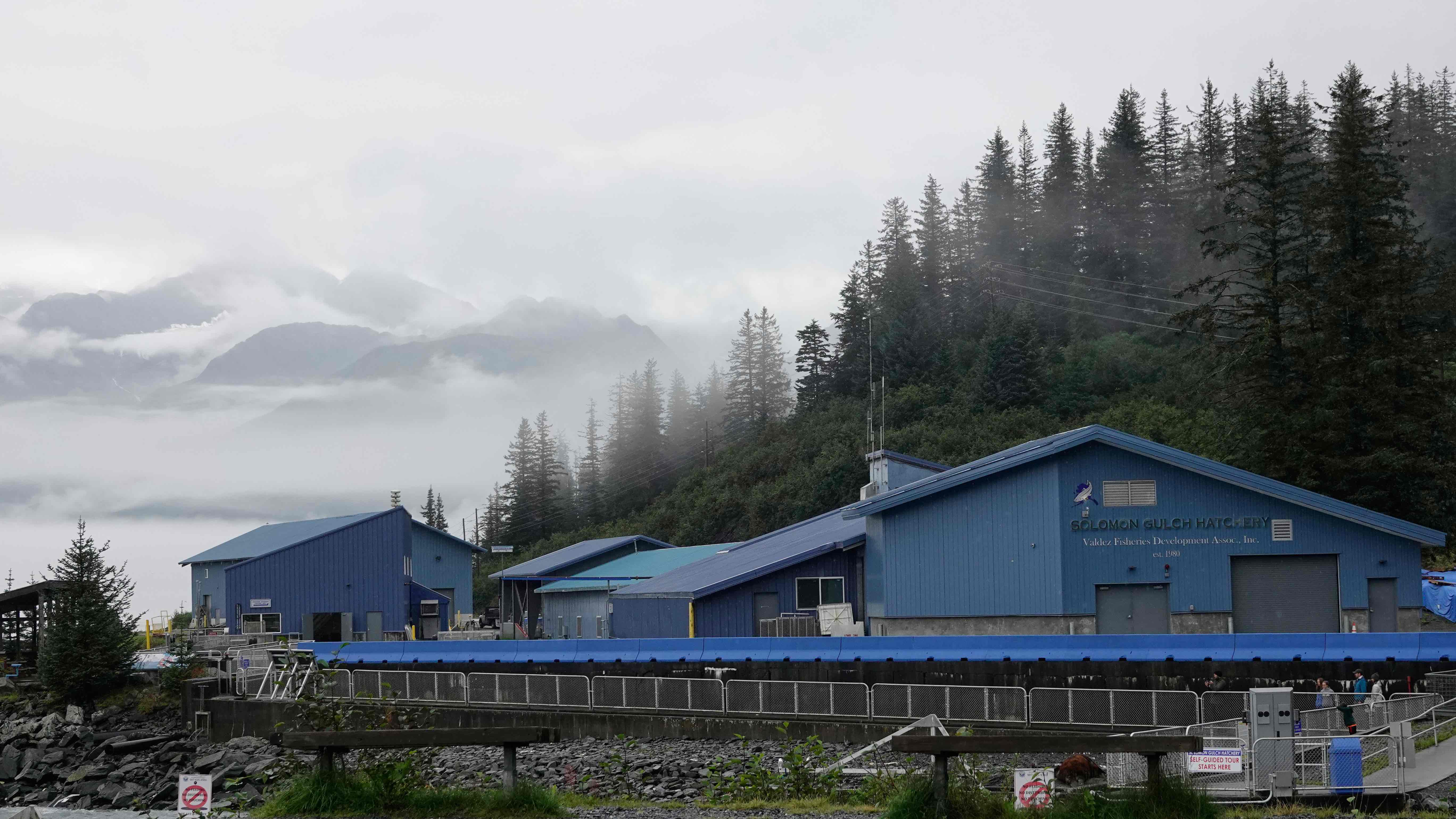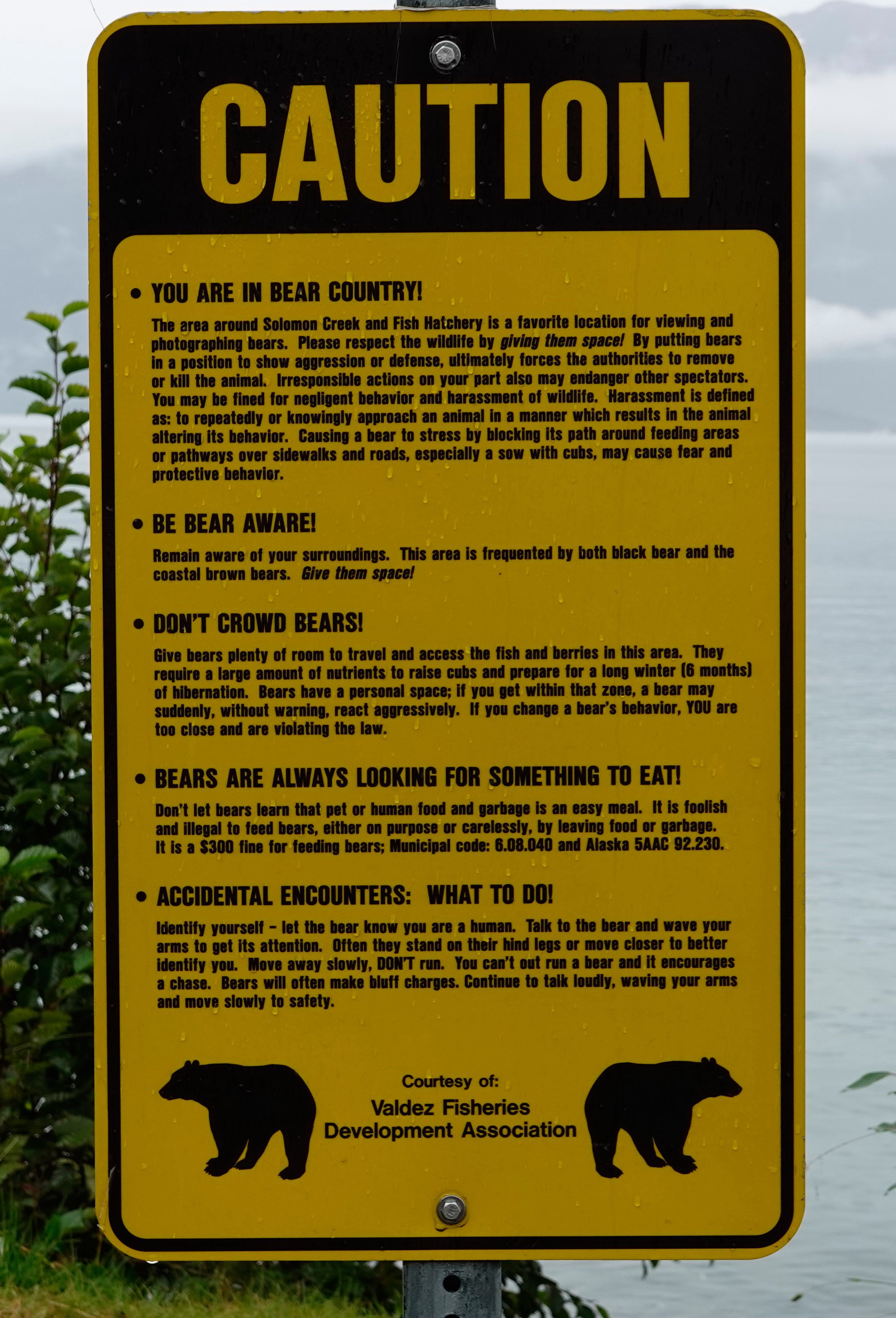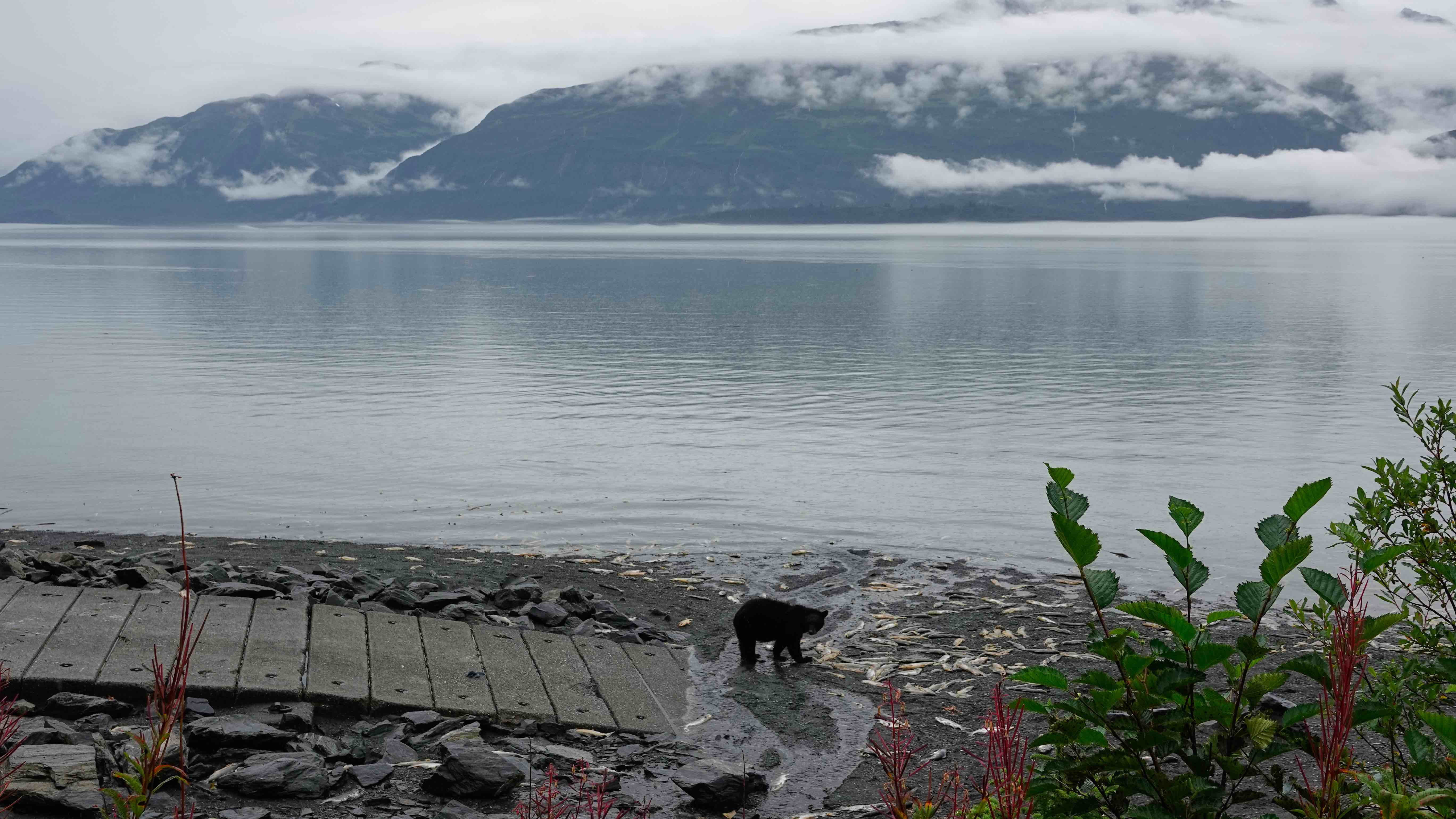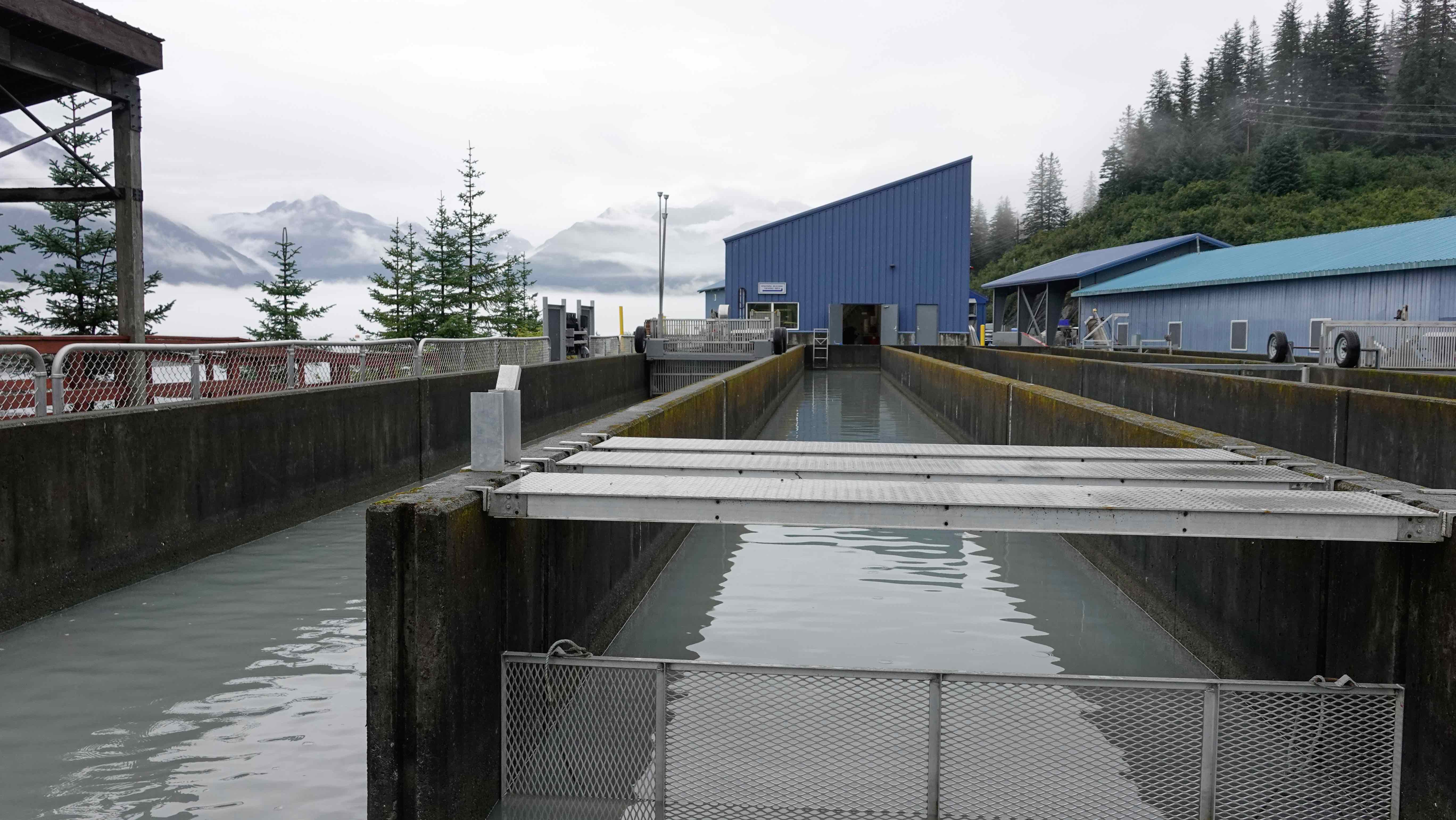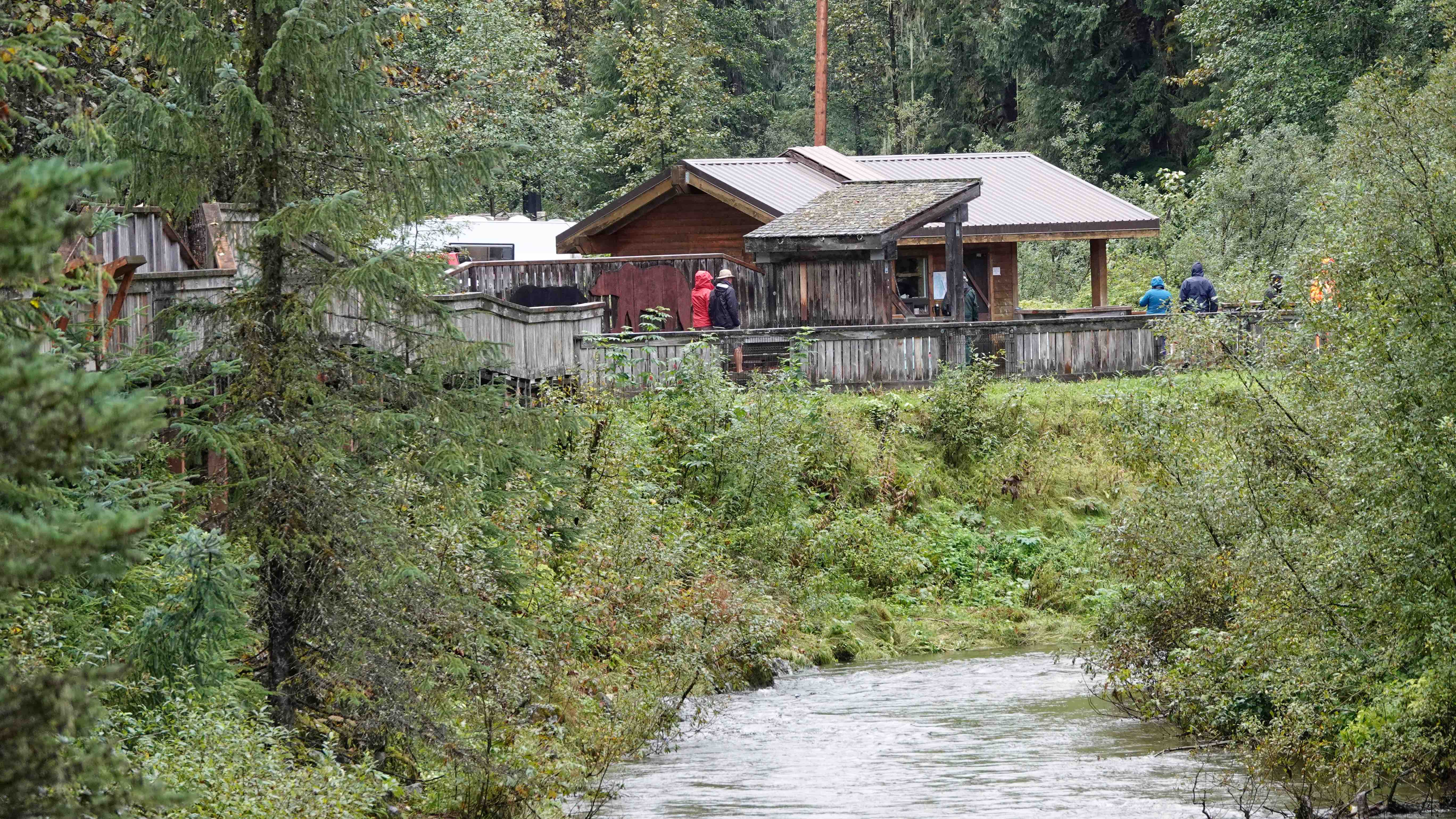 Wir bekommen den Tipp, die Dayville Road auf der anderen Seite des Fjords entlangzufahren, da wären die Aussichten besser. Wir drehen eine Runde bis zum Ende der Straße, an dem sich ein Campingplatz befindet. Er ist voll belegt, hauptsächlich von Anglern, die sich ihre Jahresration Lachs sichern. Wir parken an der Solomon Gulch Hatchery, einer Fischverarbeitungs- und Aufzuchtfabrik. Mit einem ausgeklügeltem System von Lachstreppen mit Gegenstromanlage werden die Lachse direkt in die Fabrik geleitet und verarbeitet. Der befruchtete Laich kommt in Aufzuchtbecken und die jungen Lachse werden dort 3 Jahre lang gefüttert, bis sie in Becken im Fjord umziehen. Ob ein Teil auch frei gelassen wird, habe ich nicht richtig verstanden.