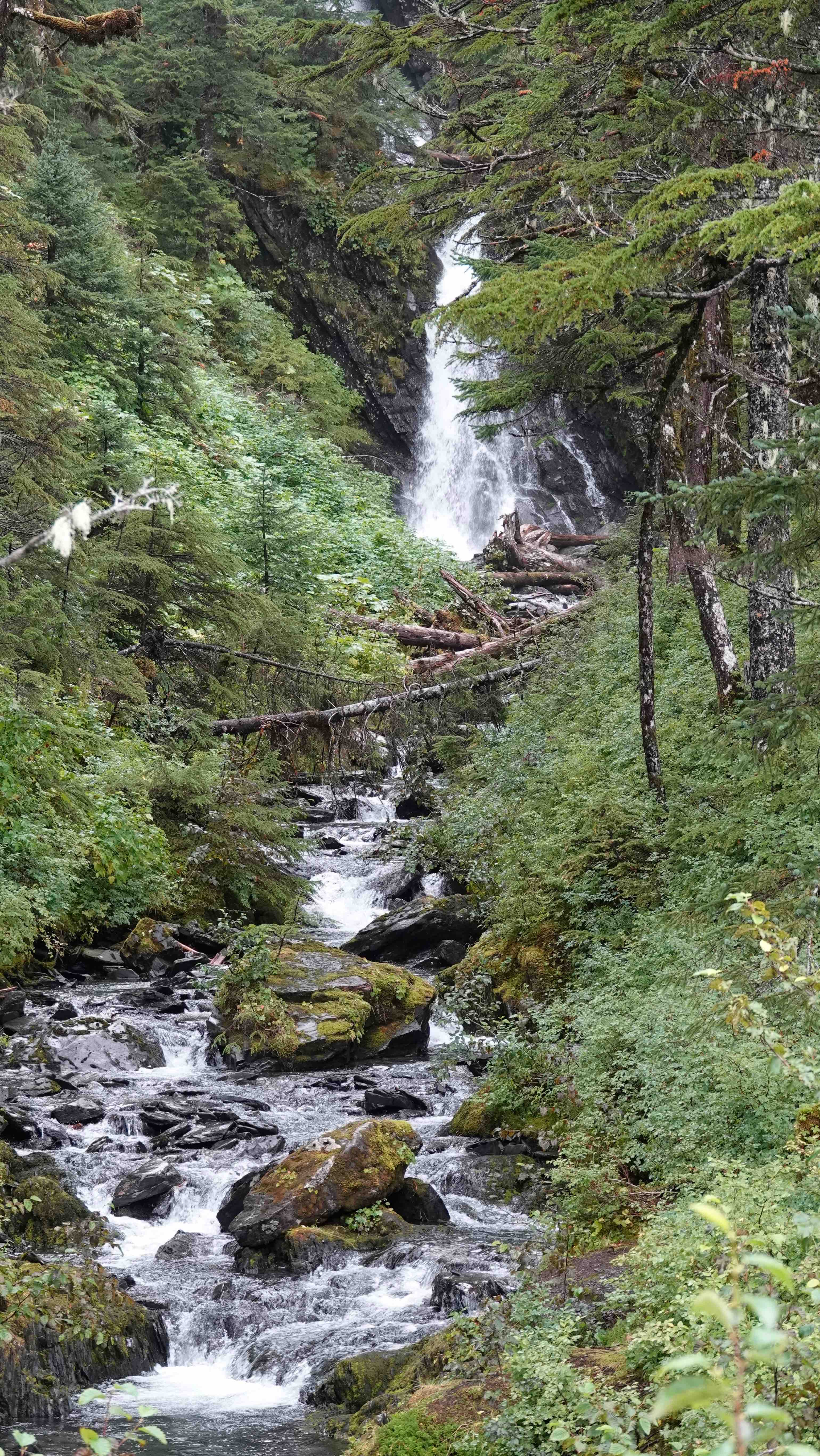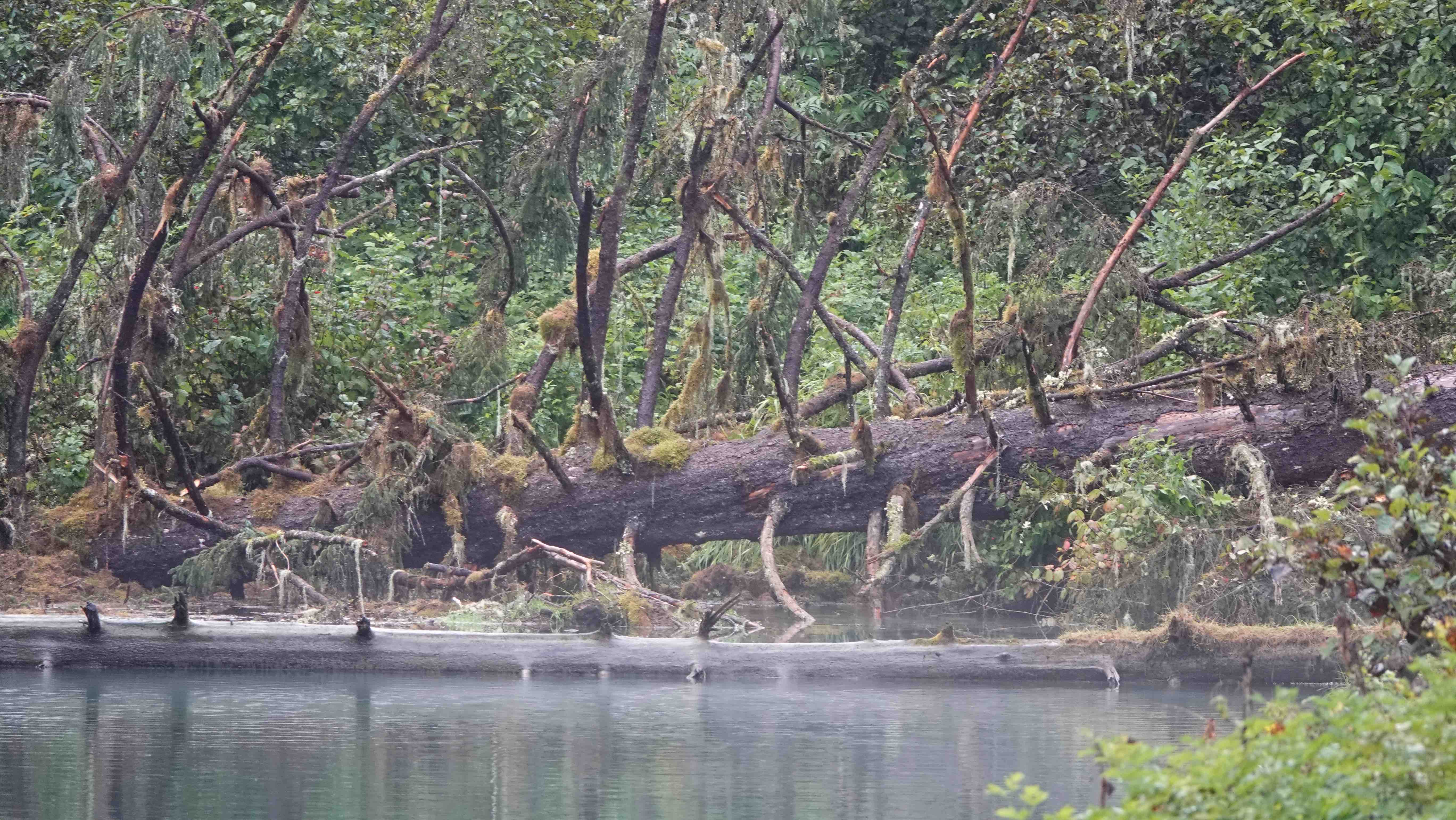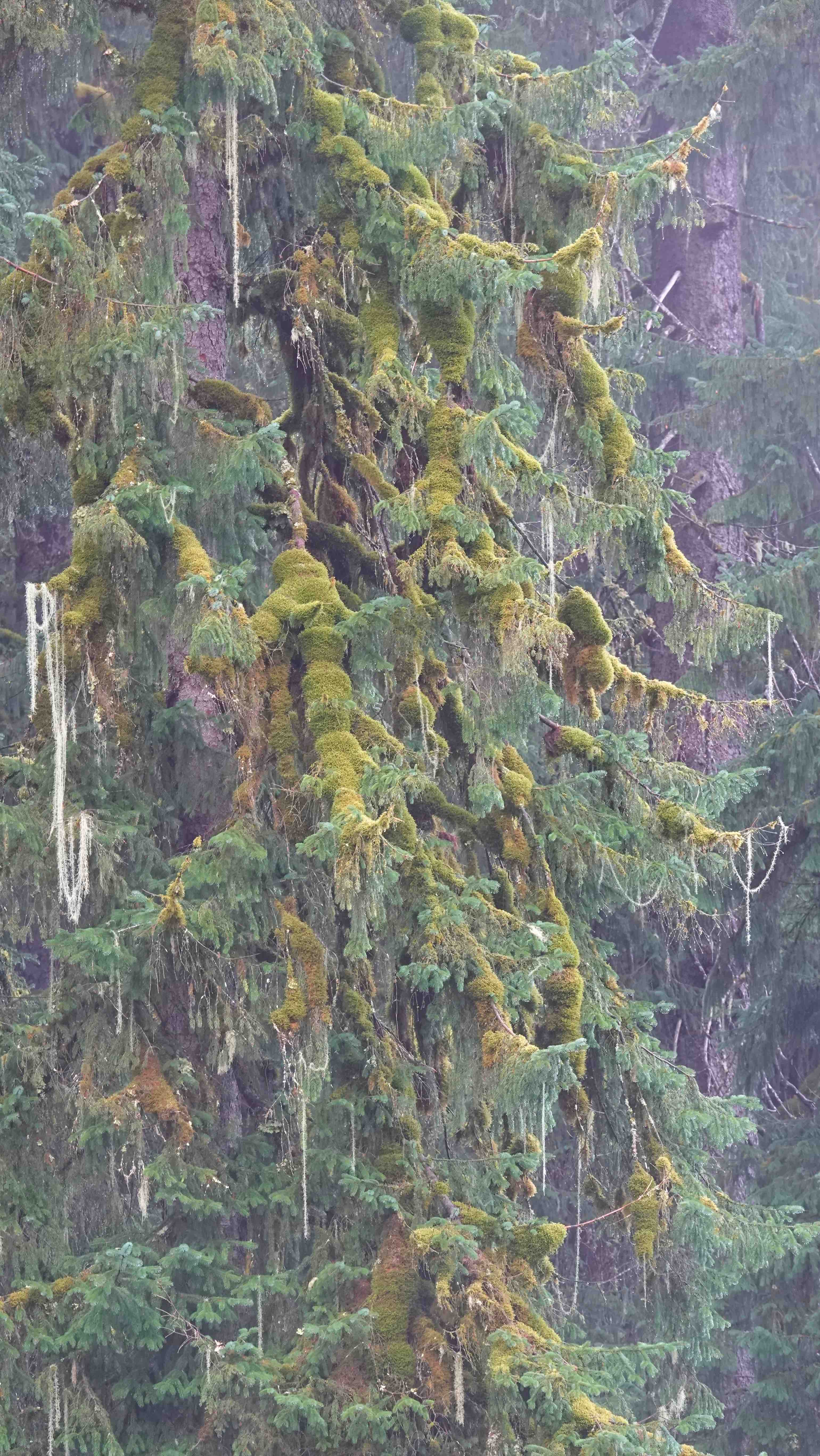 Aber wir sind hier, um noch einmal Bären zu beobachten. Für die Besucher wurde eigens ein stabiler Boardwalk errichtet, damit sie gefahrlos den Bären beim Lachsfischen zusehen können. Wir sehen zwar sehr viele Lachse und Möwen, aber leider keine Bären. Der kalte Regenwald, in dem wir uns befinden, hat seinen eigenen Charme: Flechten hängen wie Lametta von den Bäumen und dicke Moosschichten bedecken die Äste.