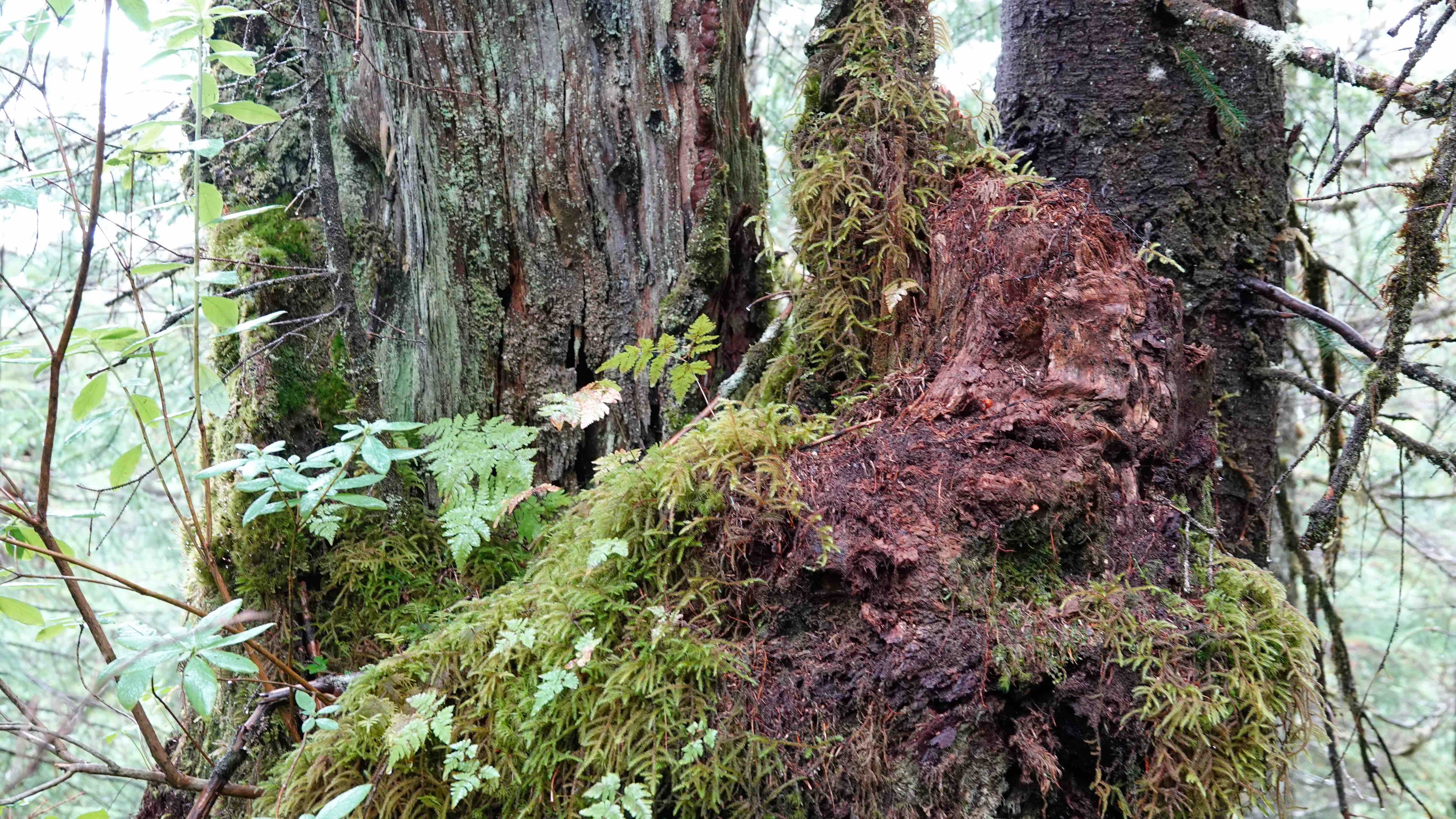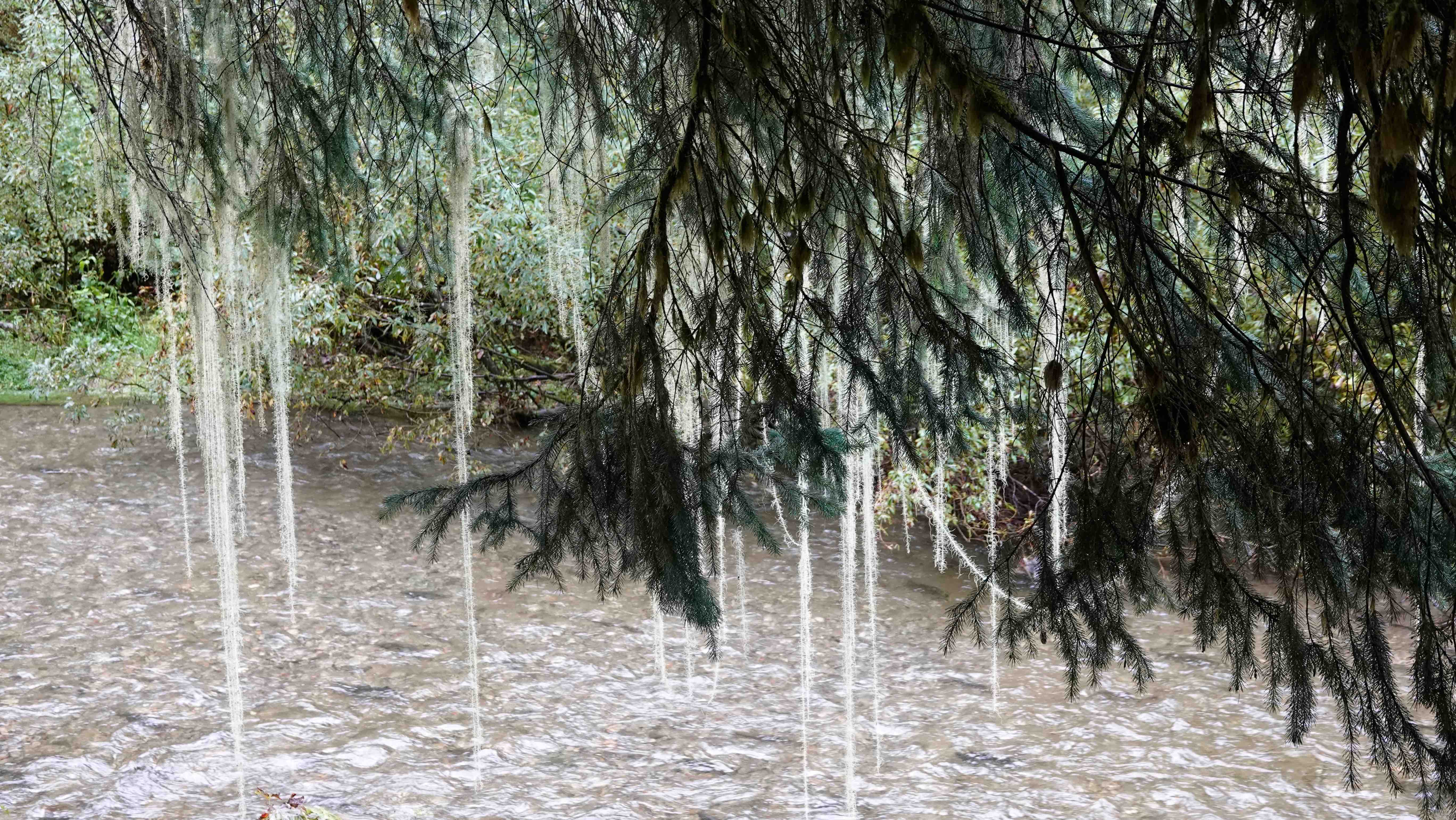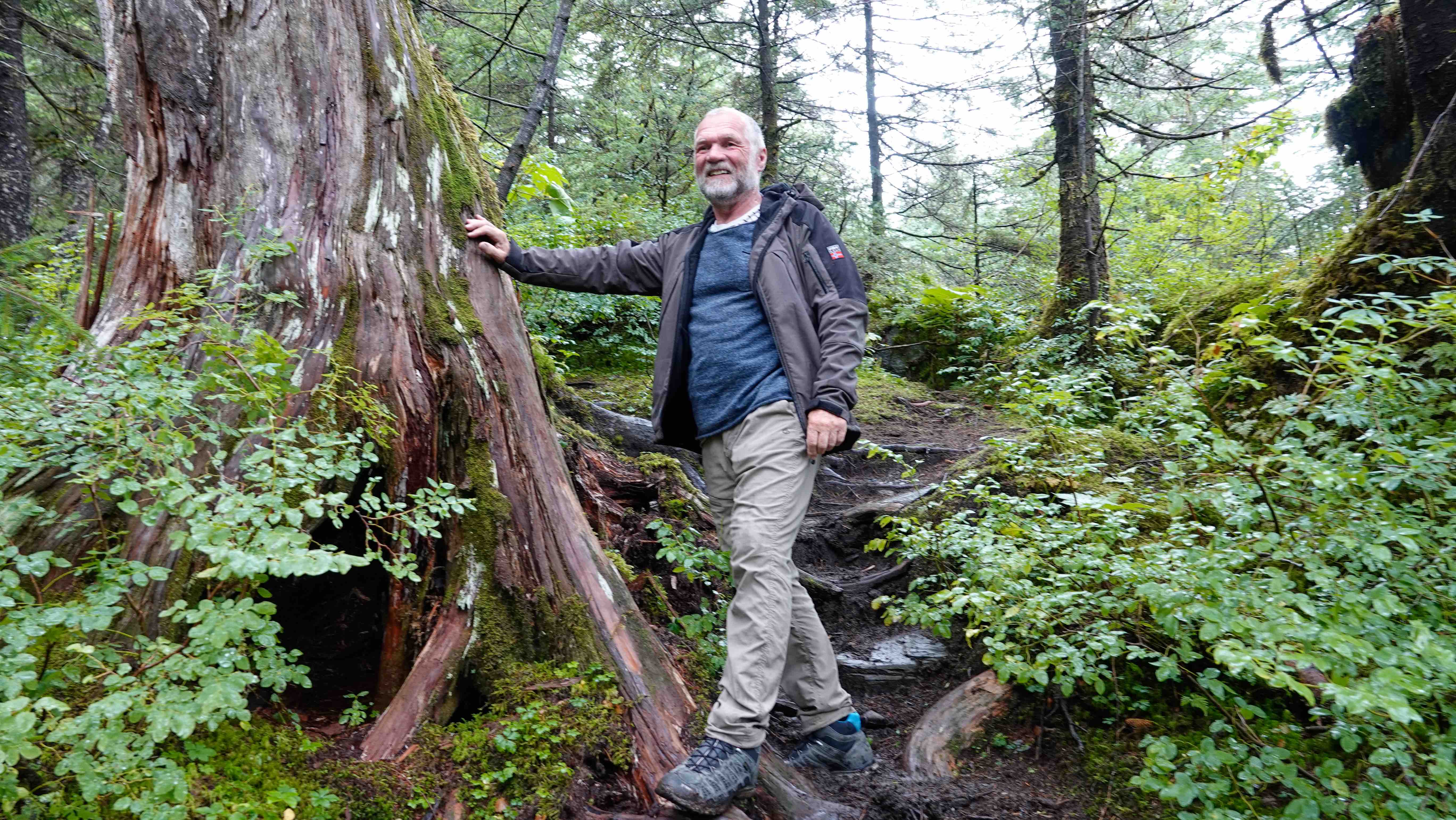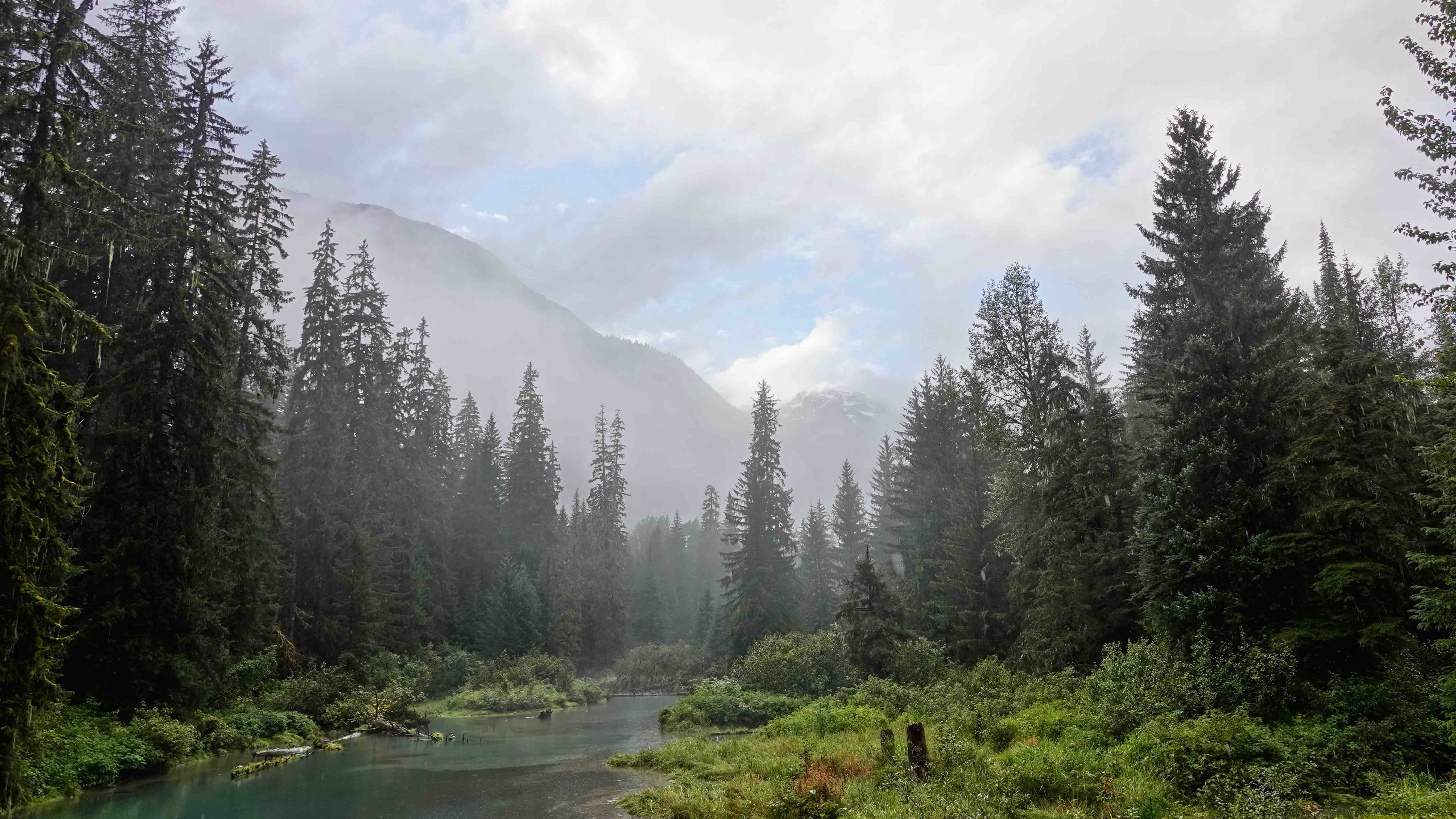 Aber wir sind hier, um noch einmal Bären zu beobachten. Für die Besucher wurde eigens ein stabiler Boardwalk errichtet, damit sie gefahrlos den Bären beim Lachsfischen zusehen können. Wir sehen zwar sehr viele Lachse und Möwen, aber leider keine Bären. Der kalte Regenwald, in dem wir uns befinden, hat seinen eigenen Charme: Flechten hängen wie Lametta von den Bäumen und dicke Moosschichten bedecken die Äste.