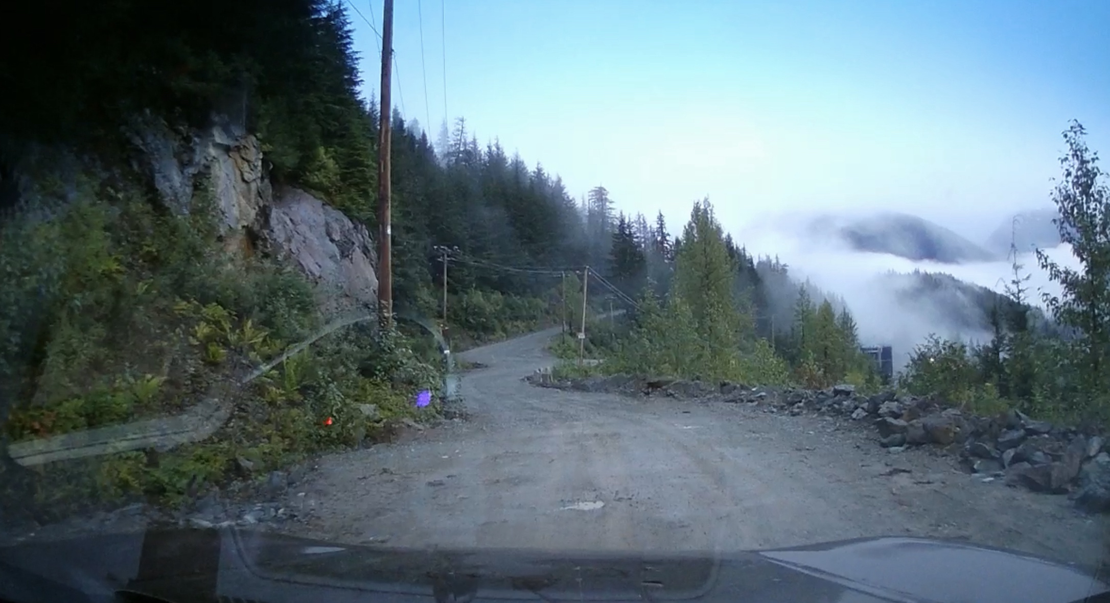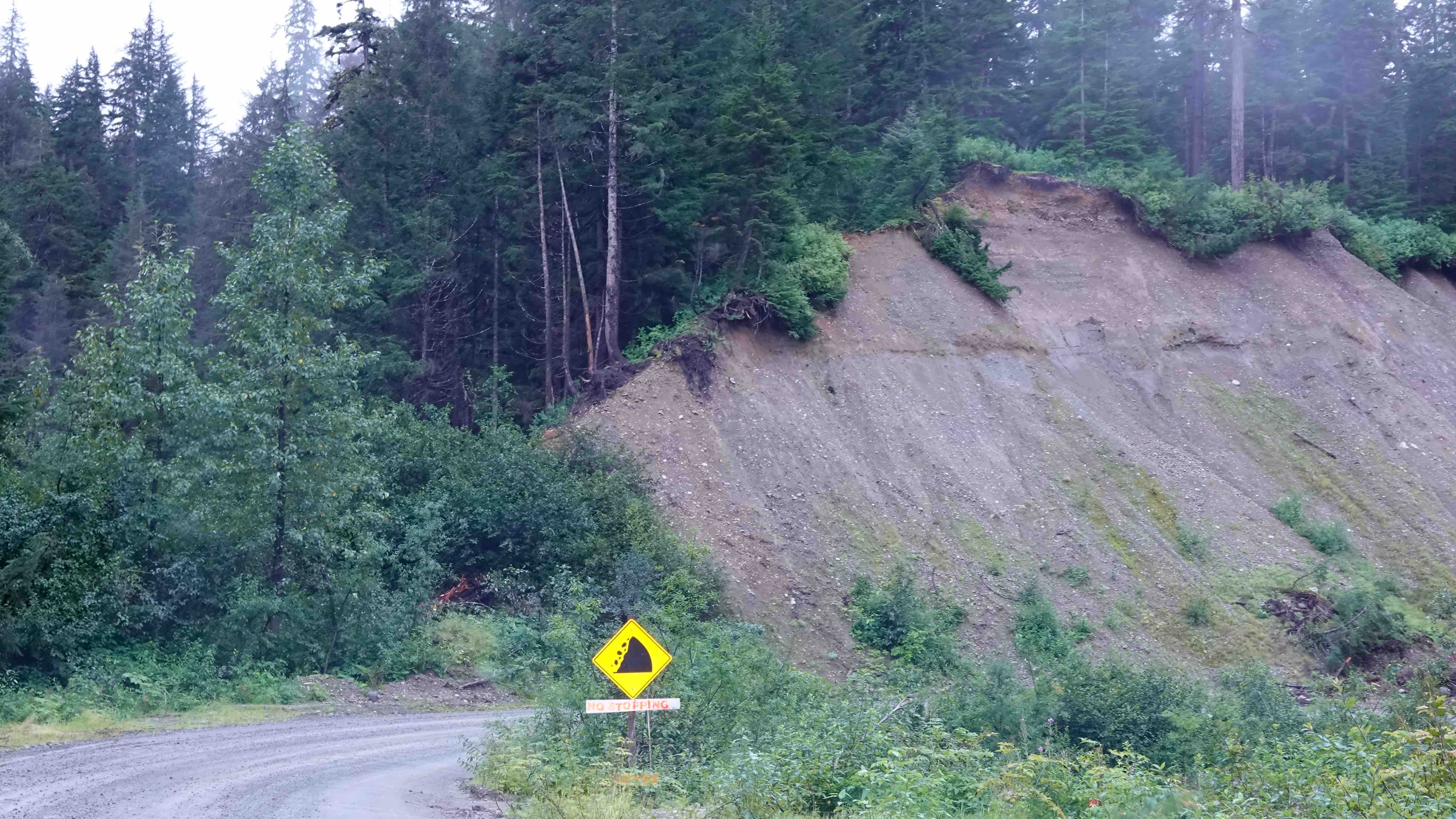 Abends fahren wir noch ein Stück die unbefestigte Straße zum Salmon-Gletscher hinauf, kehren aber auf halber Stecke um, da nach langem Regen ein Erdrutsch die Straße demoliert hat. Die Piste ist nur notdürftig freigeräumt und es ist mir nicht ganz geheuer, zumal uns vorm Abgrund auf matschigem Untergrund nur ein kleines zur Seite geräumtes Erdhäuflein trennt.