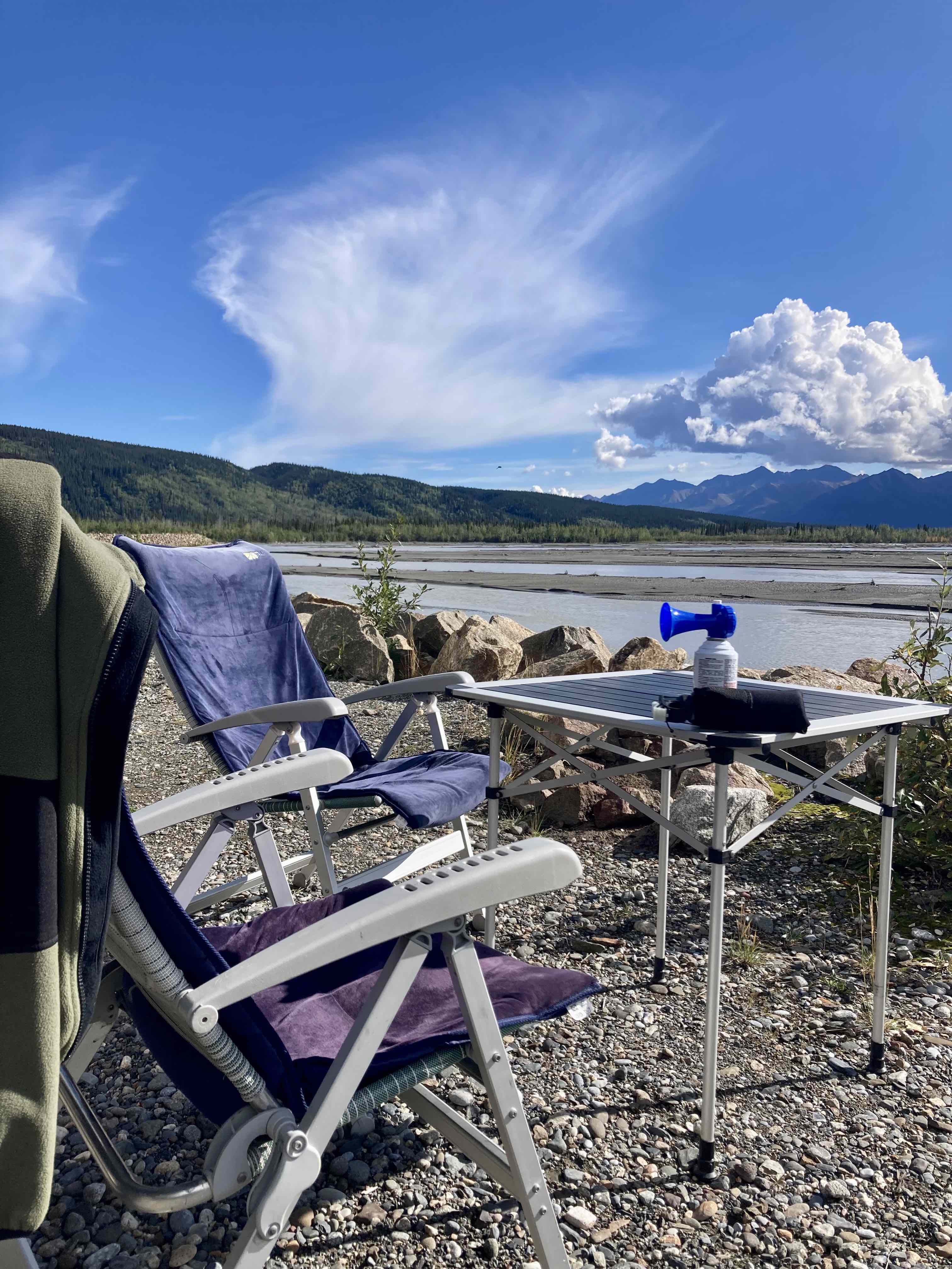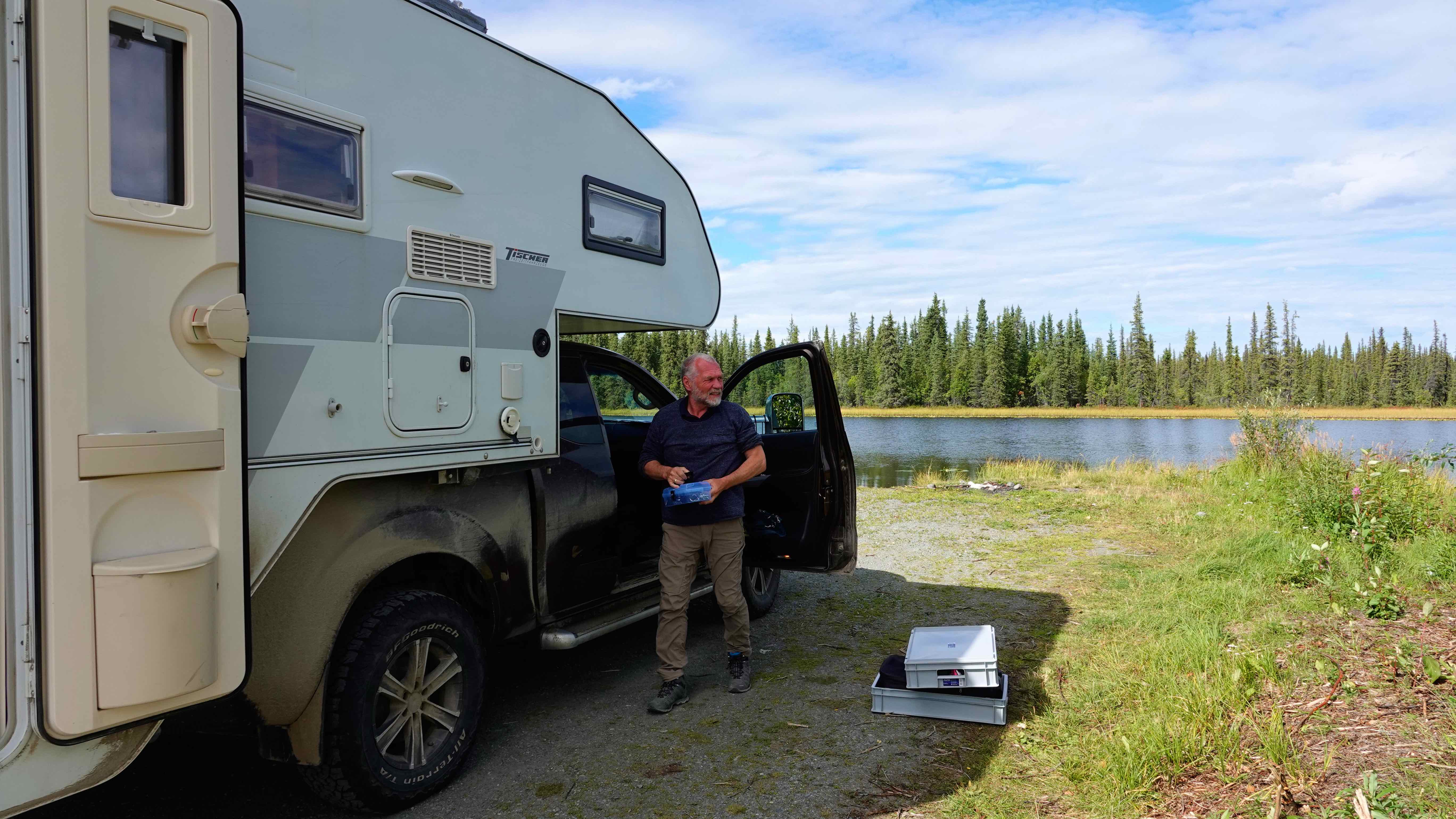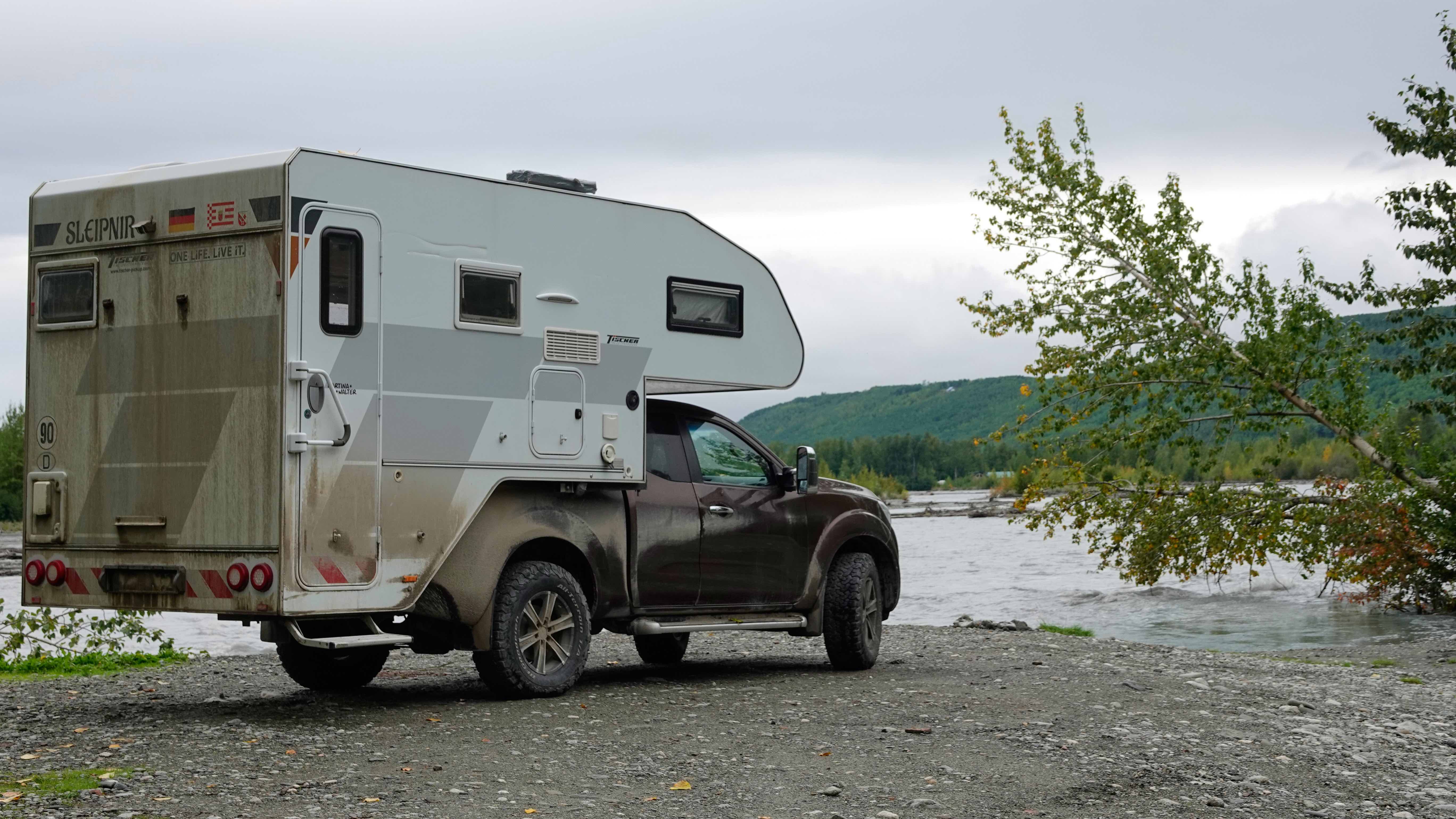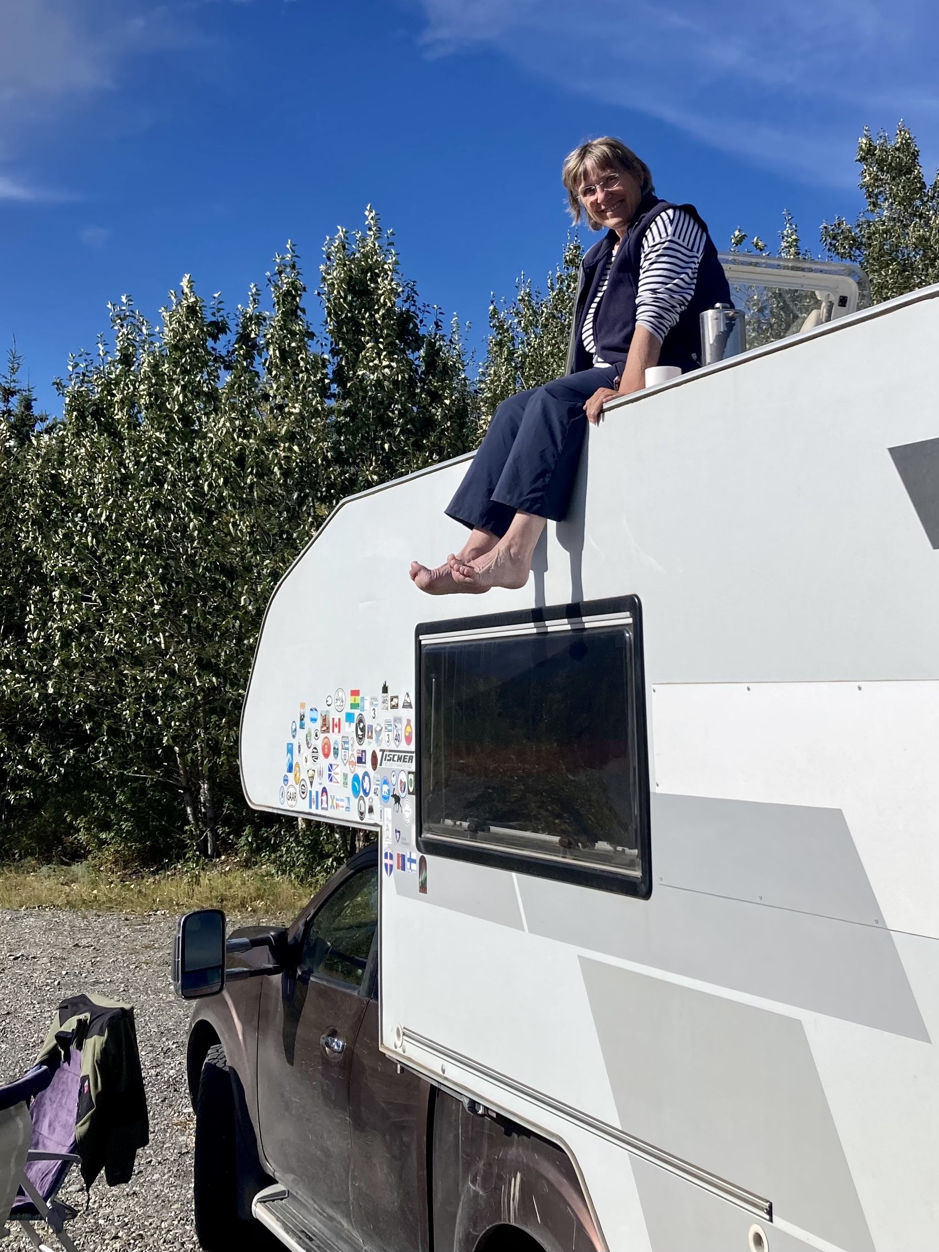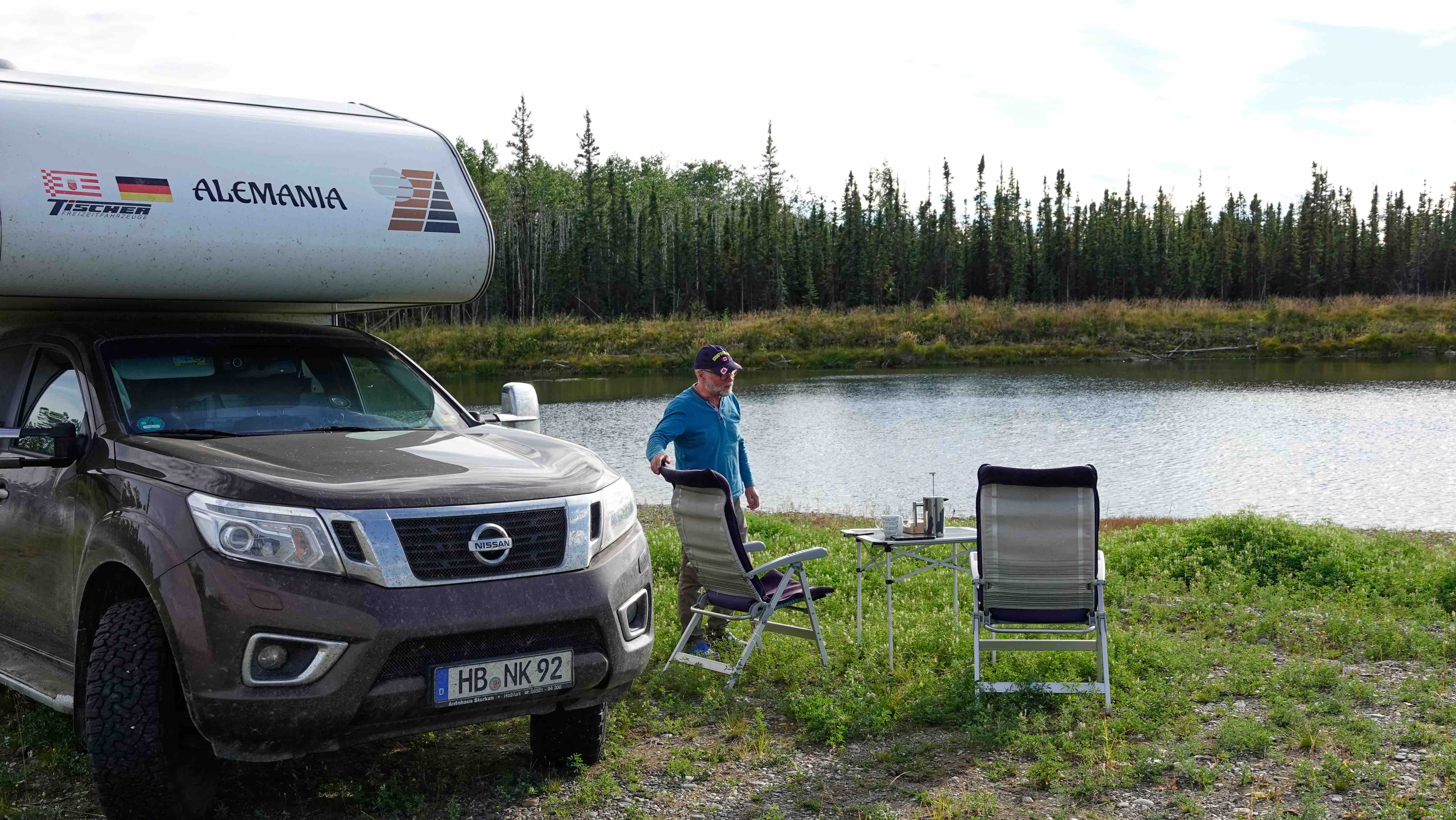 Am Donjek River ist unser heutiges Tourziel und wir bereiten gerade alles für ein gemütliches Kaffeetrinken vor, da bemerkt Walter mit seinen Adleraugen einen Grizzlybären den Fluss entlang wandert. Er ist noch ziemlich weit entfern, aber ich kann schon ein paar Fotos machen. Als er immer näher kommt, freue ich mich über die Aussicht auf bessere Aufnahmen, aber nur kurz. Der Grizzly ist ziemlich flott die Uferböschung hinauf geklettert und steuert nun zielstrebig auf uns zu. Wir verschwinden zügig in der Kabine und können ihn gerade noch so durchs Küchenfenster direkt am Auto vorbeilaufen sehen. Er läuft den Weg hoch und verschwindet um die Ecke – Beobachtung durchs Badezimmerfenster 🙂 .Ein bisschen mulmig ist uns nun doch und wir nehmen unseren Kaffee lieber auf unserer Dachterrasse ein.