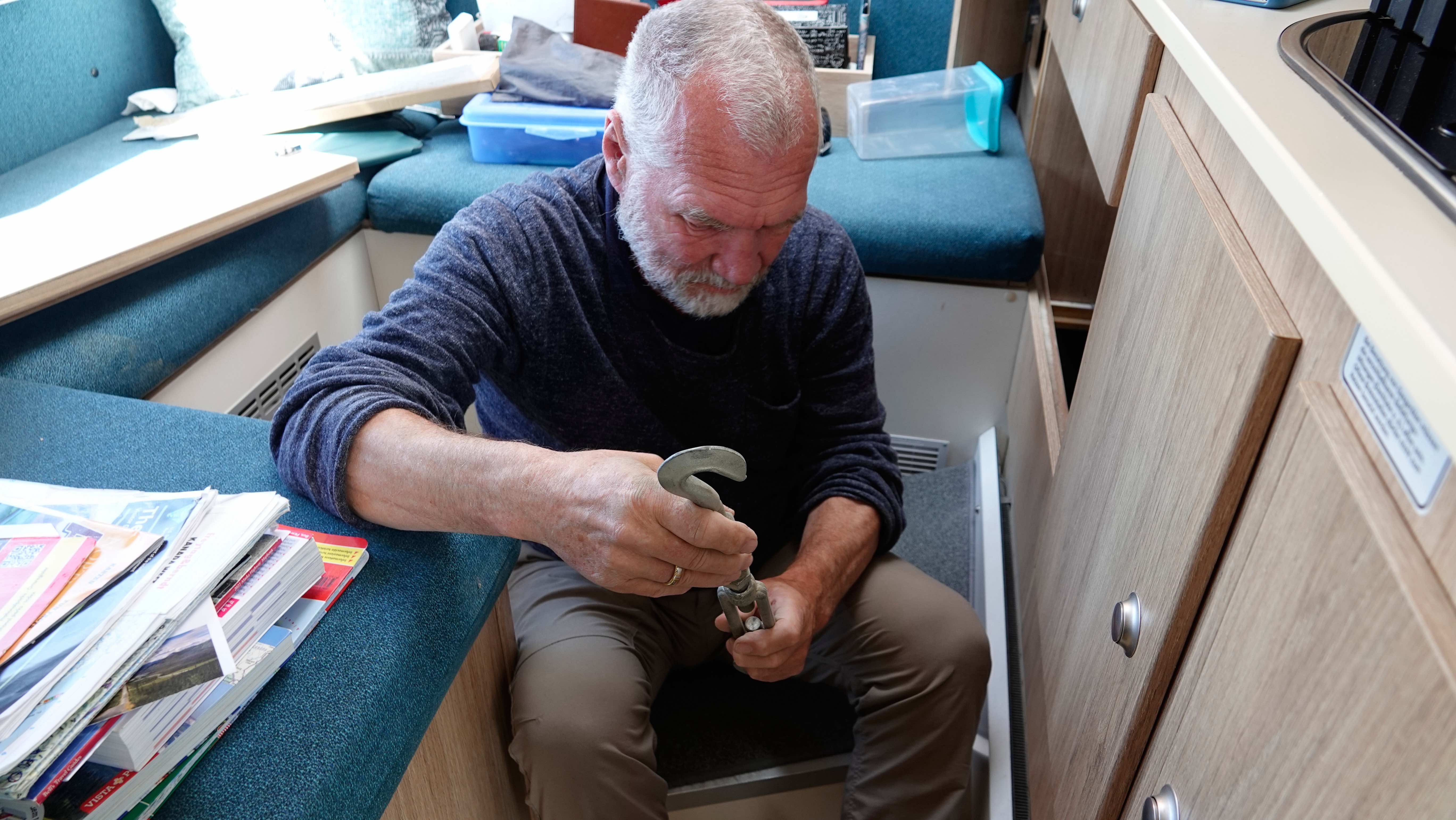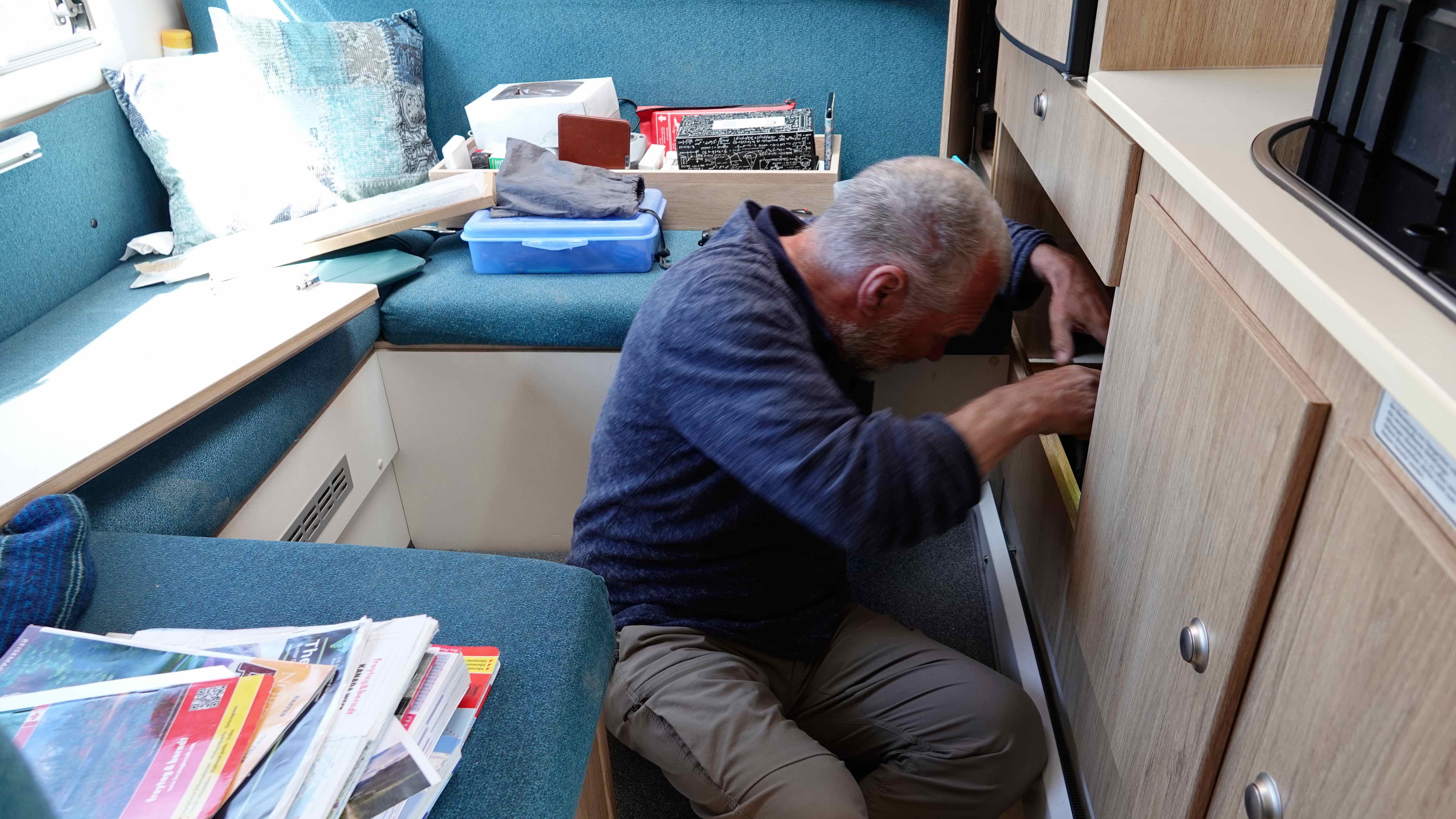 Unterwegs fällt Walter auf, das die Kabine mal wieder nicht richtig sitzt? Und beim Überprüfen stellt er fest, dass sich eine Befestigung ganz gelöst hat und ein Teil schon fehlt. Aber so „well prepared“ wie Walter nun mal ist, zaubert er aus einer der vielen Kisten das passende Ersatzteil hervor und alles ist wieder in Ordnung, Respekt! Ich werde nie wieder dumme Bemerkungen über den Inhalt der vielen Kisten machen, in denen Walter sein Equipment verstaut hat, versprochen!