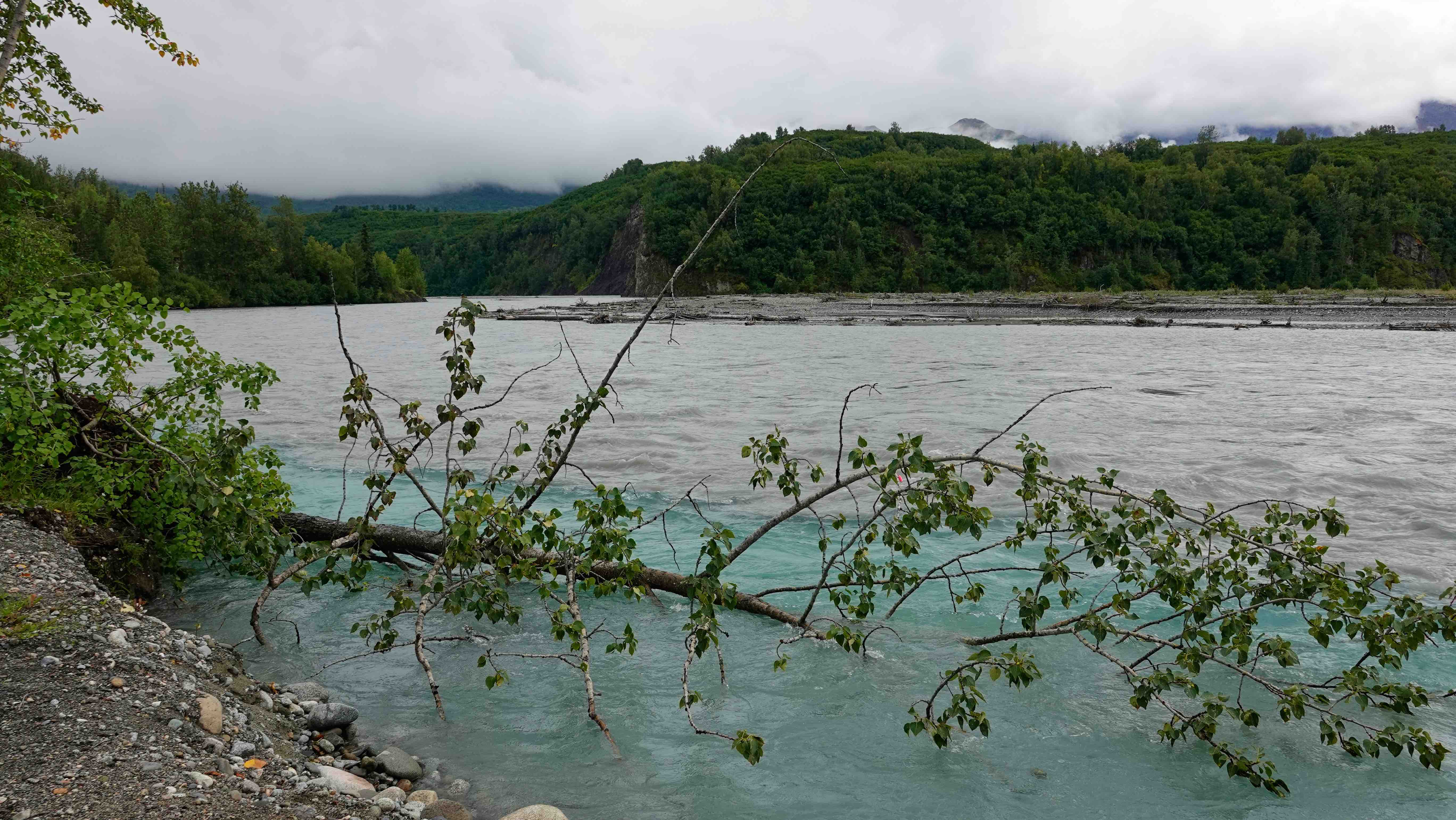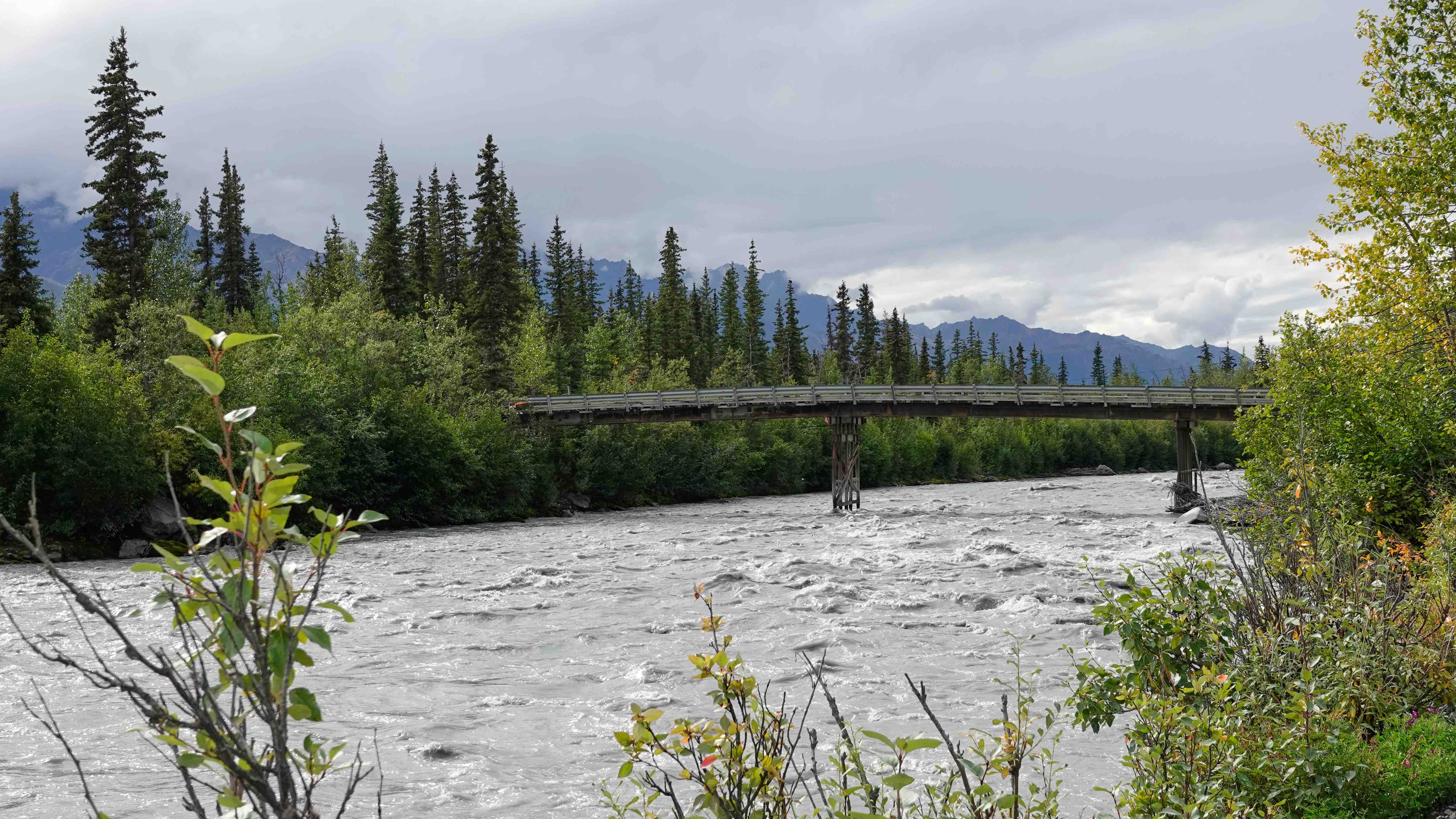 Wir haben einen kurzen Abstecher zum Matanuska Gletscher geplant, fahren eine steile Piste zum Infocenter hinunter, überqueren eine nicht sehr vertrauenswürdig aussehende Brücke, um festzustellen, dass auch hier die Weiterfahrt nur mit Guide möglich ist. Da wir keine Wanderung auf den Gletscher machen wollen, – eine Fahrt zur Gletscherzunge hätte uns vollends genügt, drehen wir unverrichteter Dinge wieder um.