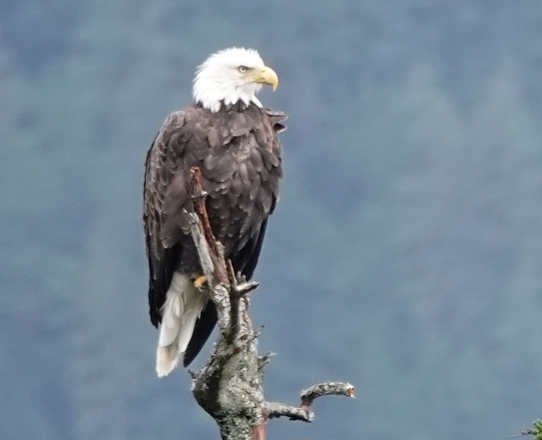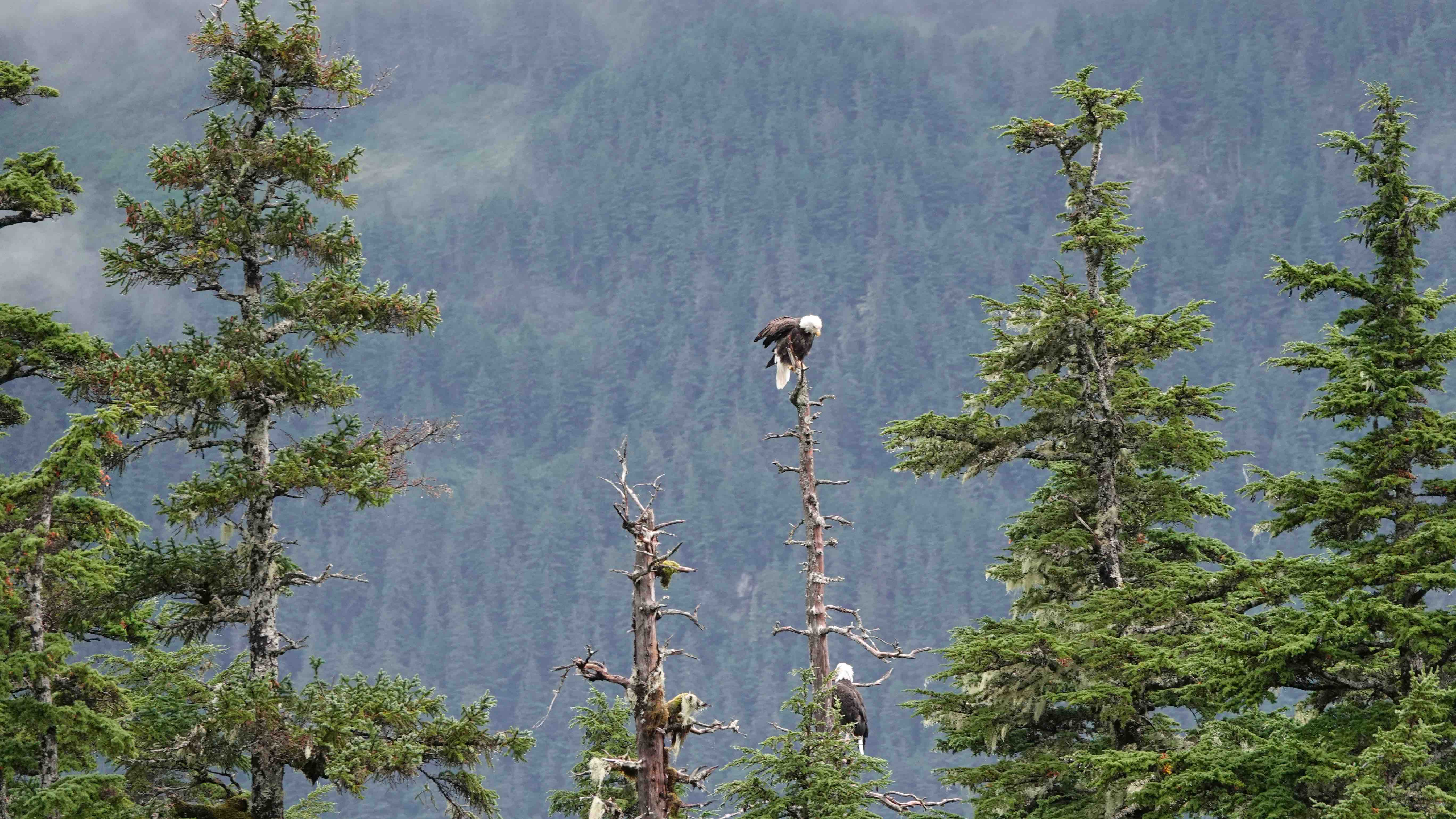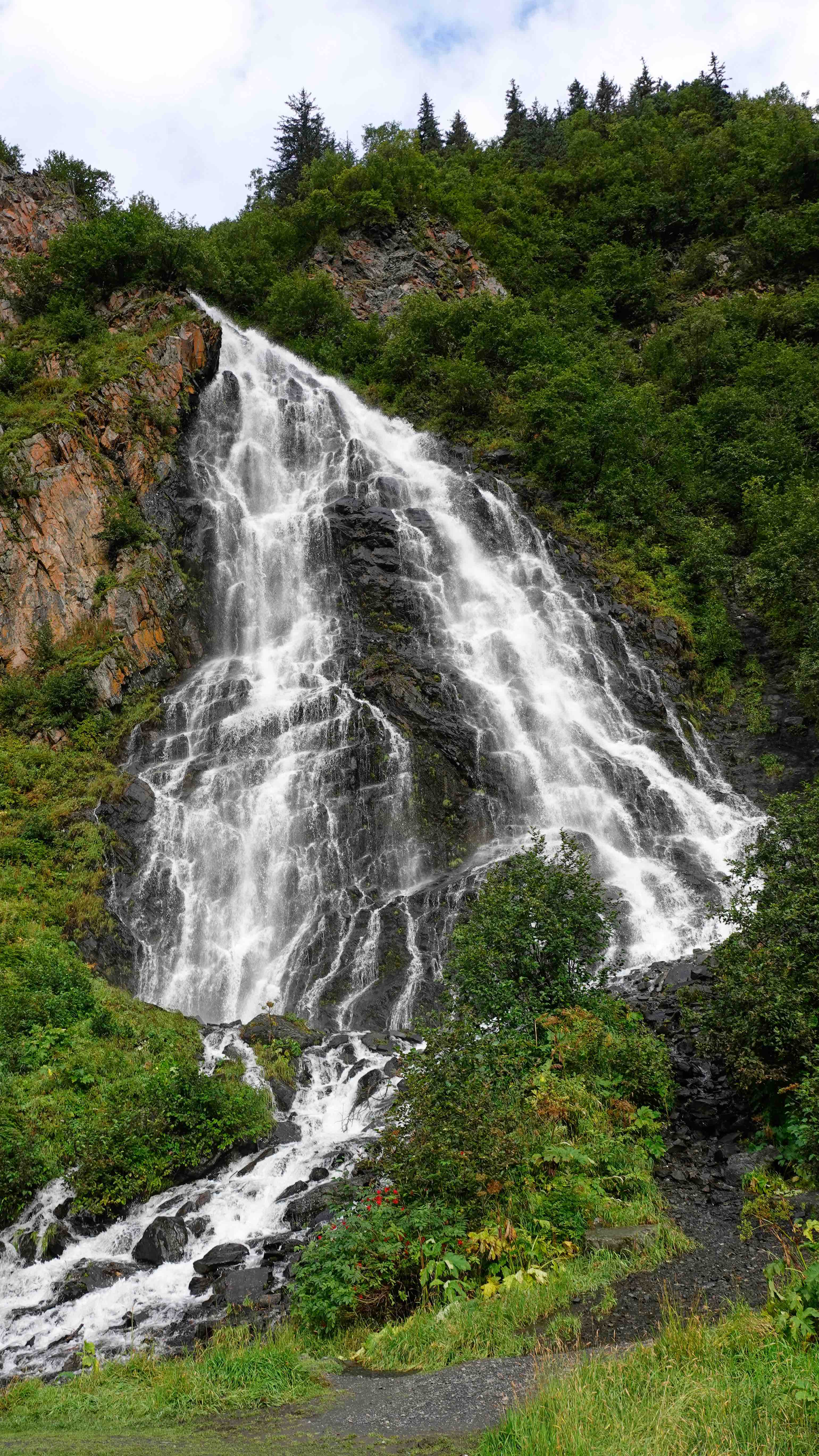 In Whittier buchen wir für den nächsten Tag die Fähre nach Valdez, allerdings nur auf „Stand By“. Heute fährt sie leider nur nach Cordova, von wo aus man nur wieder mit der Fähre zurückkommen kann. Schade, dann hätten wir uns nicht so sehr beeilen müssen. Egal, wir fahren ein Stück nach außerhalb und unternehmen noch eine kurze abenteuerliche Wanderung zu einem Wasserfall. Der Weg ist ziemlich matschig und rutschig, teilweise müssen wir über dicke Wurzeln klettern. Der Wald durch den wir uns hochkämpfen ist ein Urwald mit umgestürzten, moosbewachsenen Bäumen, die an verzauberte Tiergestalten erinnern. Der Wasserfall selbst ist nicht so spektakulär wie der Weg dorthin, aber schon mehr als einen Blick wert. Mit tatkräftiger Unterstützung von Walter schaffe ich den Auf- und Abstieg ohne größere Blessuren, nur die Schuhe sehen etwas mitgenommen aus. Zurück am Auto wartet, fotogen im Baum posierend, direkt vor uns ein Adlerpärchen.
