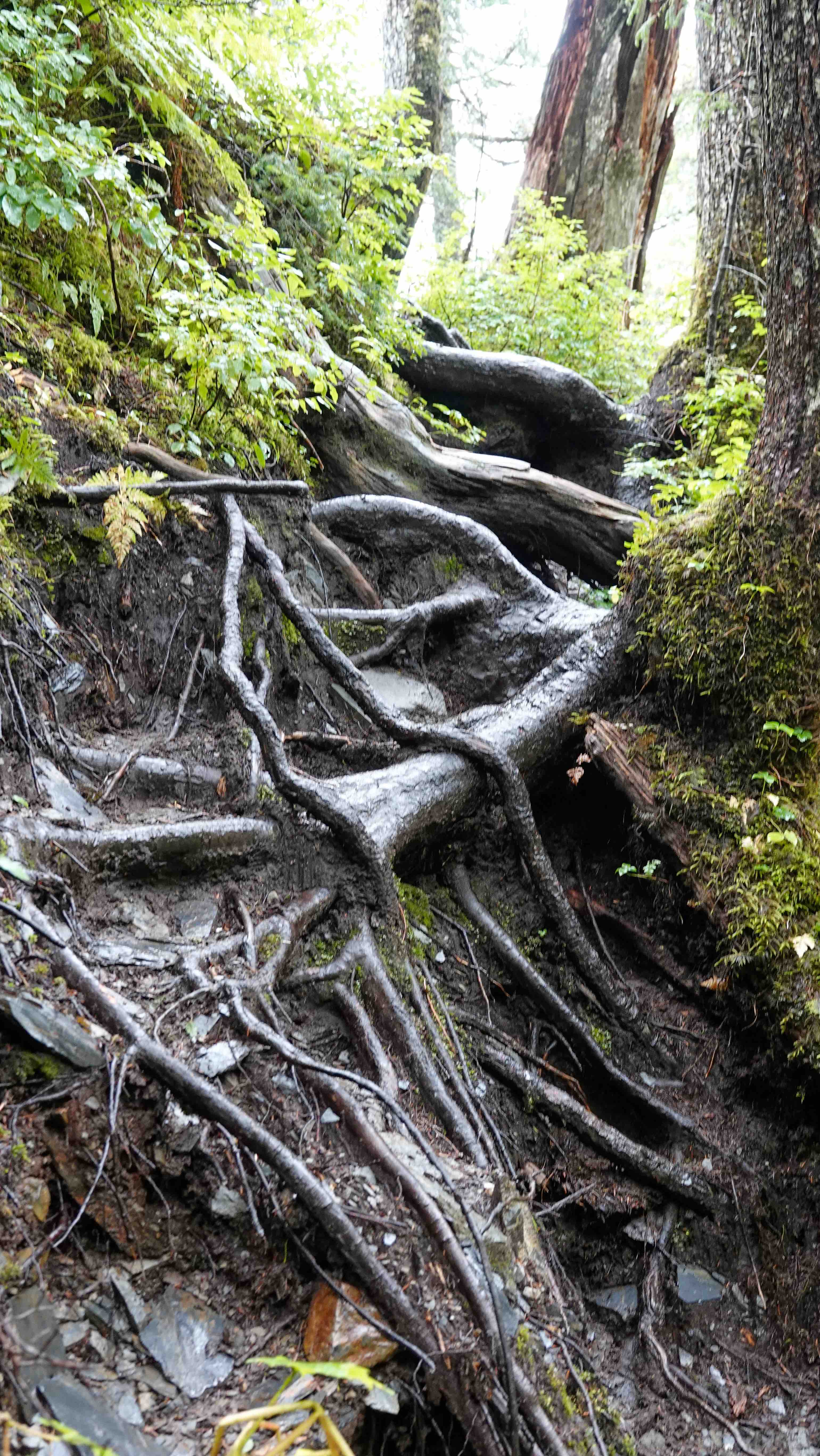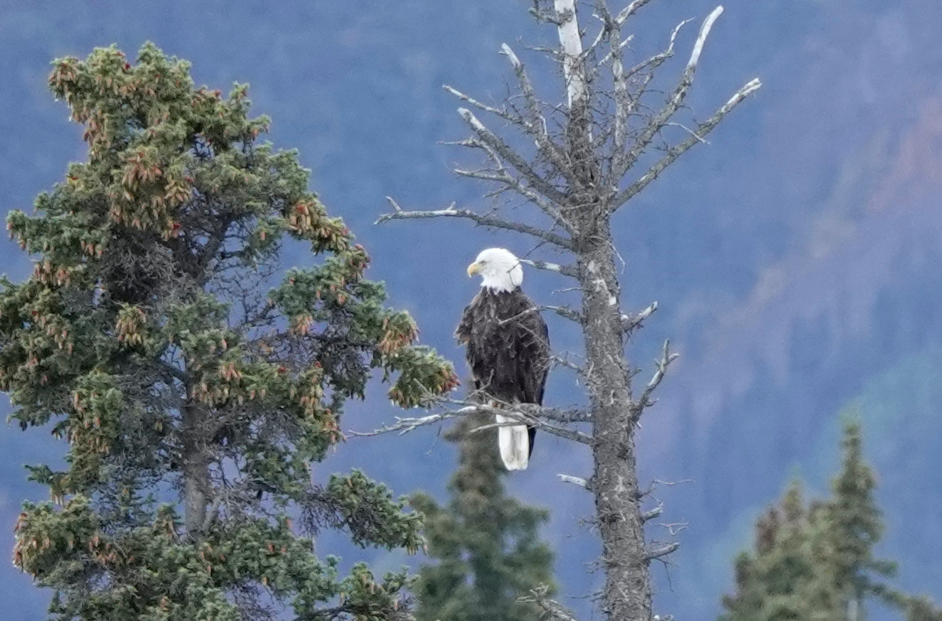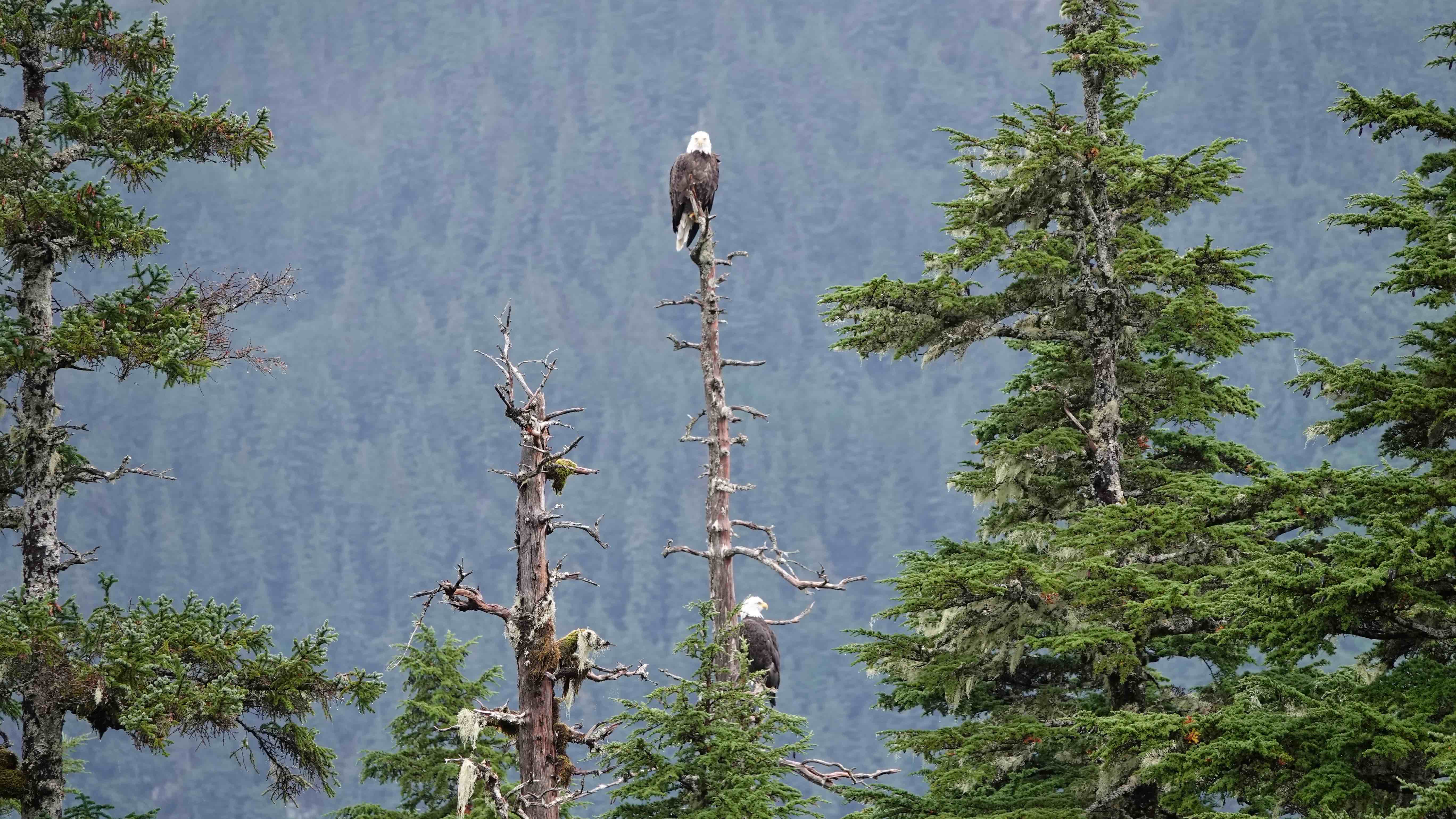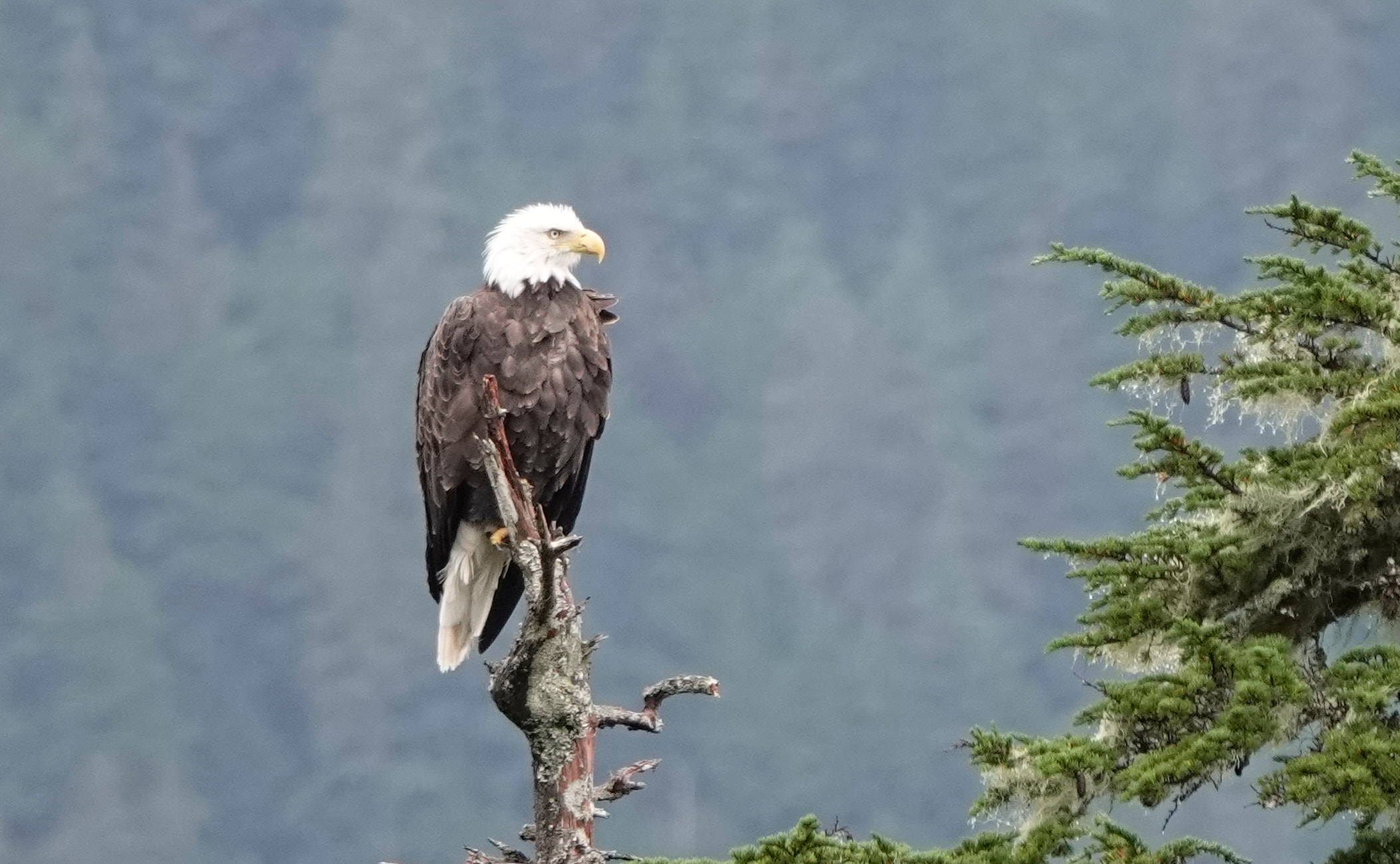 In Whittier buchen wir für den nächsten Tag die Fähre nach Valdez, allerdings nur auf „Stand By“. Heute fährt sie leider nur nach Cordova, von wo aus man nur wieder mit der Fähre zurückkommen kann. Schade, dann hätten wir uns nicht so sehr beeilen müssen. Egal, wir fahren ein Stück nach außerhalb und unternehmen noch eine kurze abenteuerliche Wanderung zu einem Wasserfall. Der Weg ist ziemlich matschig und rutschig, teilweise müssen wir über dicke Wurzeln klettern. Der Wald durch den wir uns hochkämpfen ist ein Urwald mit umgestürzten, moosbewachsenen Bäumen, die an verzauberte Tiergestalten erinnern. Der Wasserfall selbst ist nicht so spektakulär wie der Weg dorthin, aber schon mehr als einen Blick wert. Mit tatkräftiger Unterstützung von Walter schaffe ich den Auf- und Abstieg ohne größere Blessuren, nur die Schuhe sehen etwas mitgenommen aus. Zurück am Auto wartet, fotogen im Baum posierend, direkt vor uns ein Adlerpärchen.