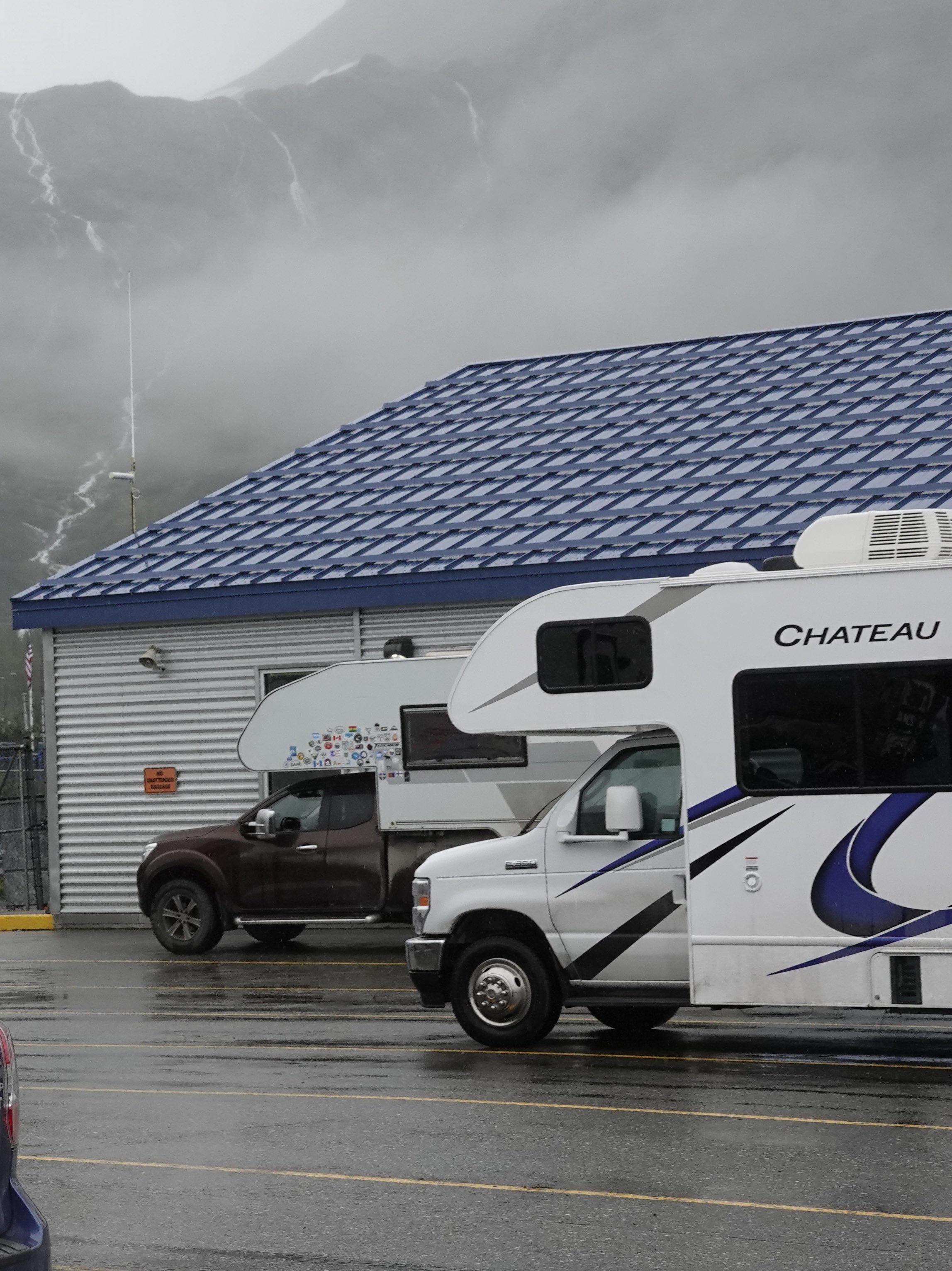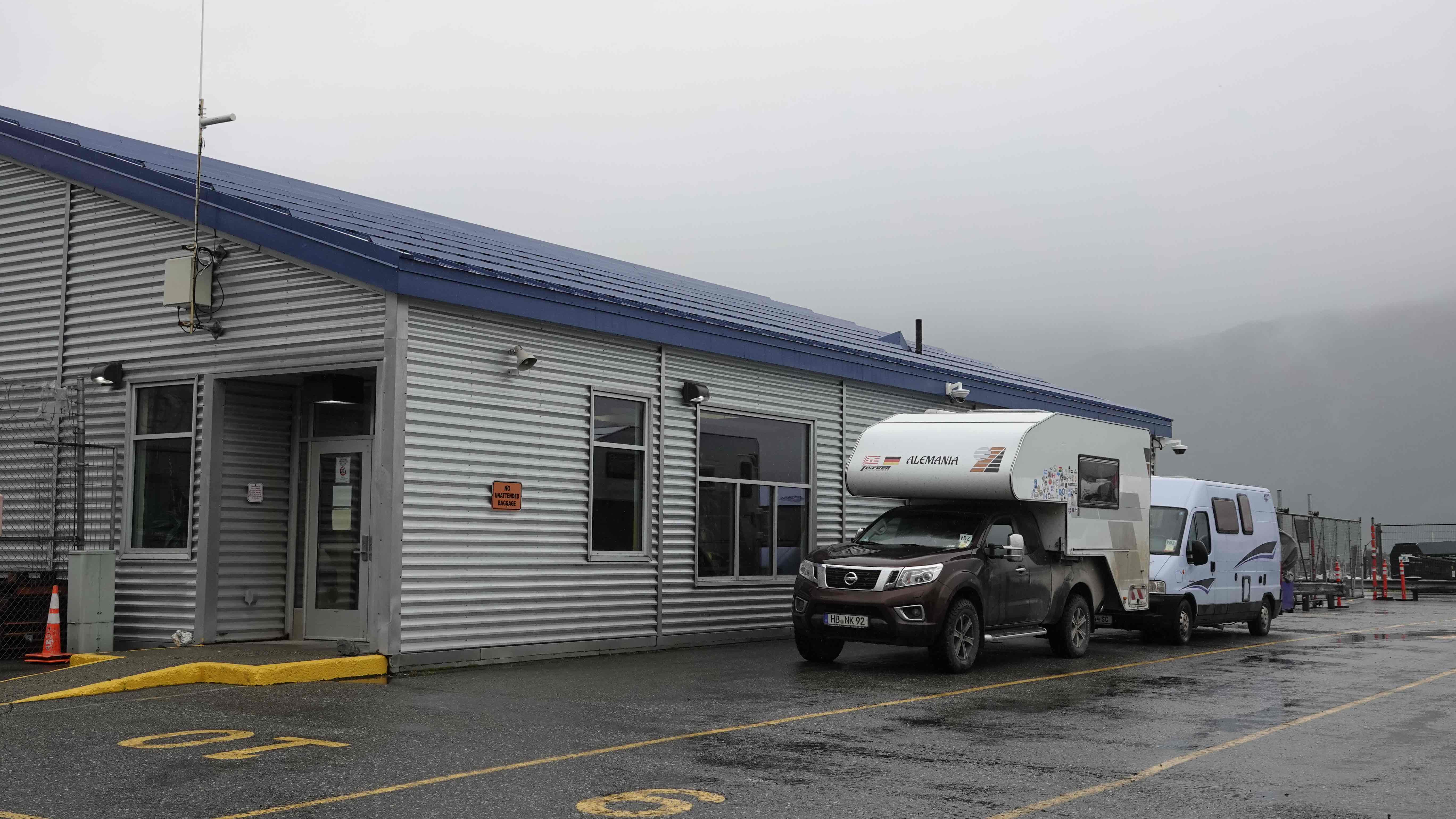 Tatsächlich laufen wir mit 5 Stunden Verspätung aus. Leider ist es neblig und später stockdunkel, sodass wir von der Fahrt durch den Prince William Sound wenig bis keine optischen Eindrücke mitnehmen können. Es ist 2:00 am Morgen und wir fahren nur noch ein Stück nach Valdez hinein und stellen uns auf den Safeway Parkplatz. Wir haben Gesellschaft von einem netten Paar aus Brandenburg, die das gleiche Schicksal erlitten haben.