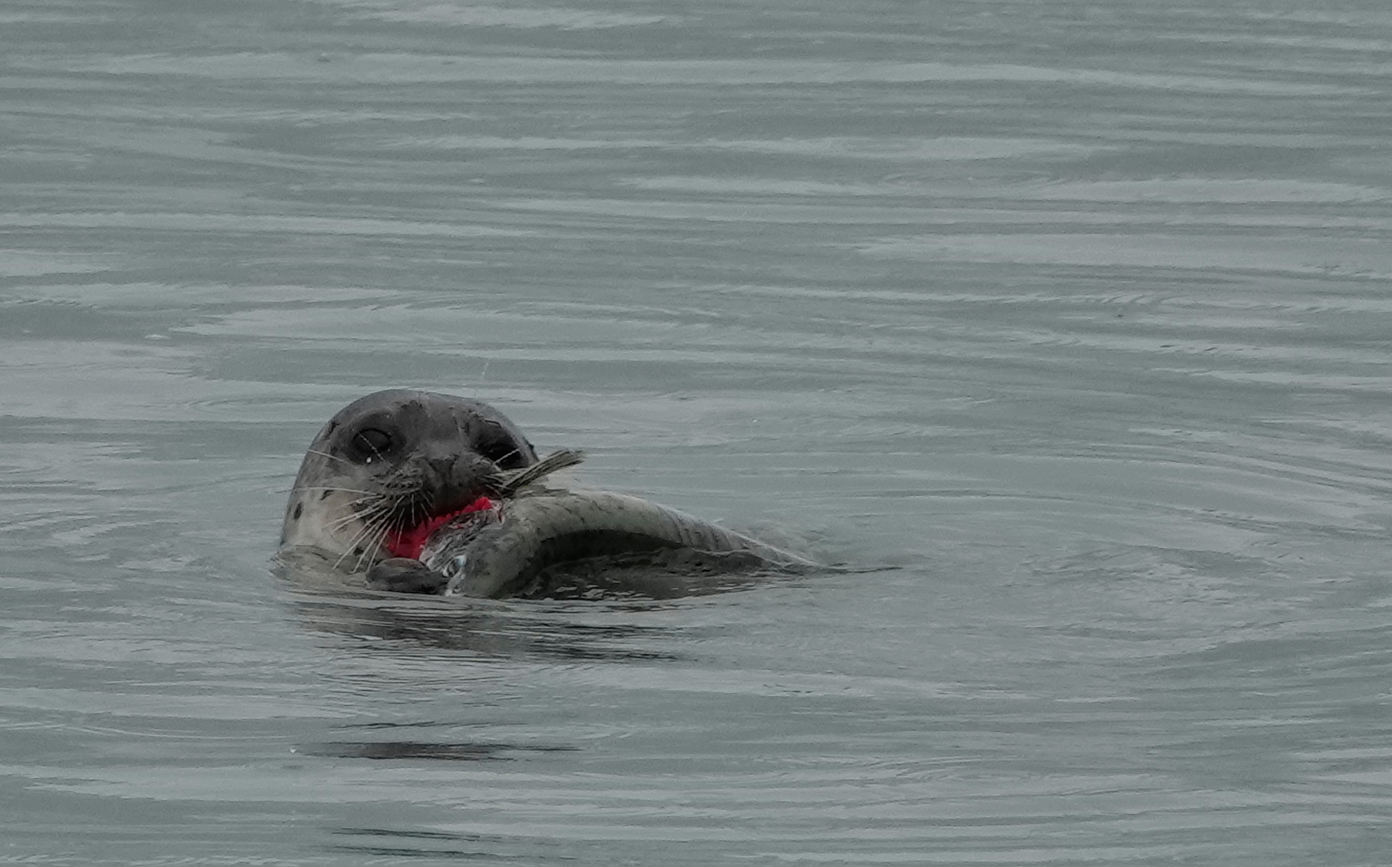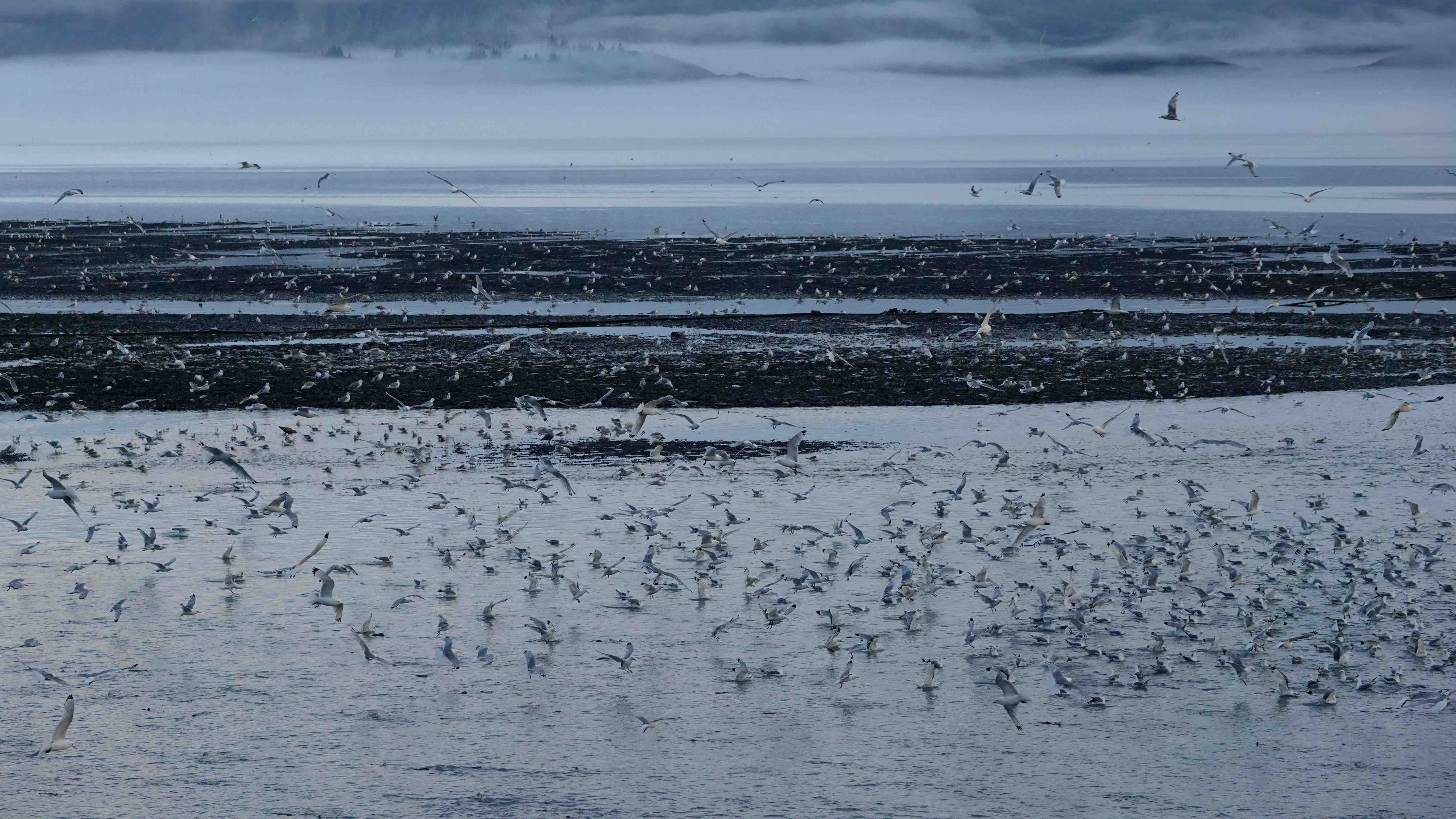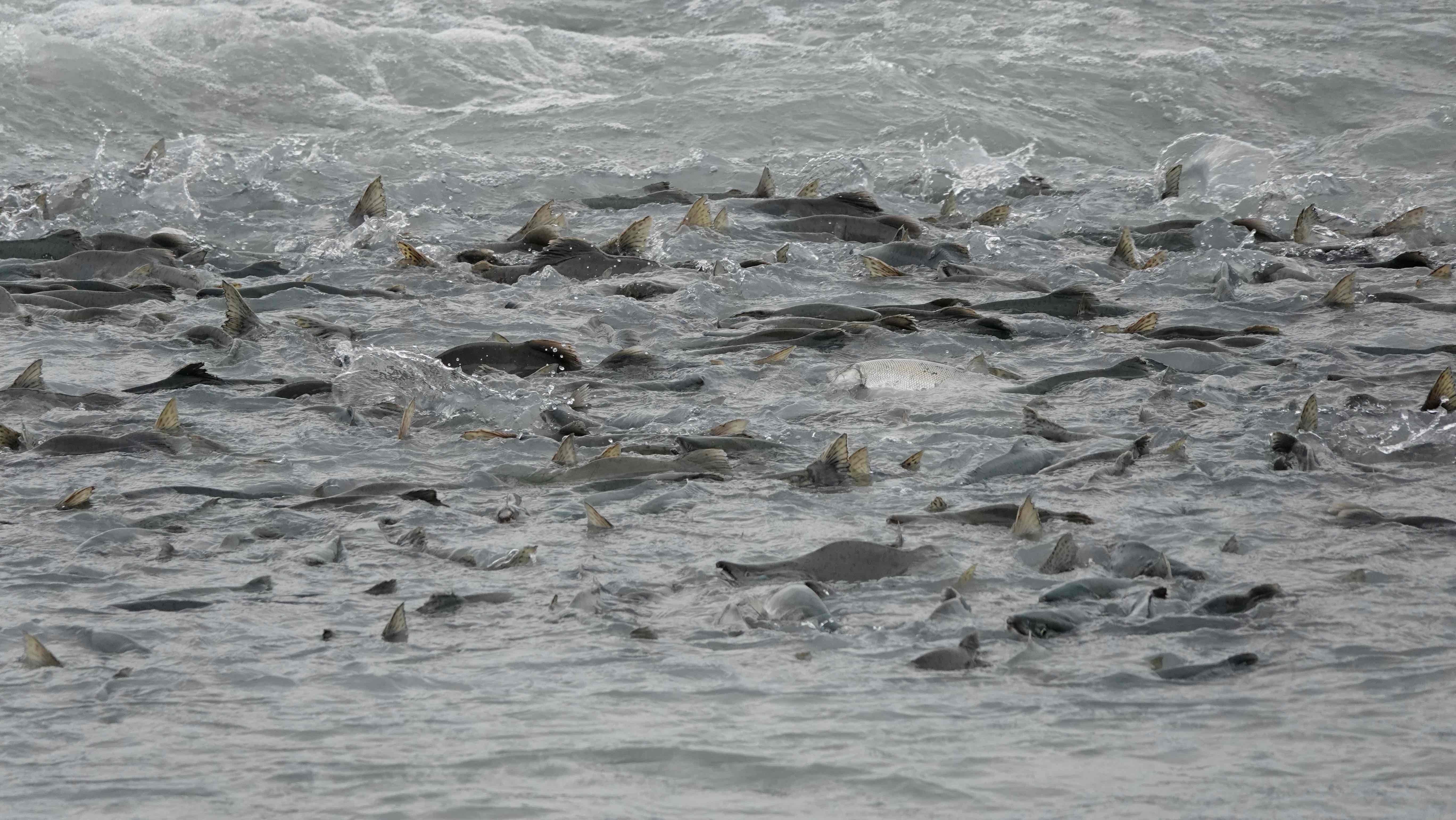 Direkt vor der Fabrik tummelt sich eine kleine Herde Seelöwen, die sich die Lachse schmecken lassen oder nach einer guten Mahlzeit ein Mittagsschläfchen machen. Seehunde und Unmengen von Möwen haben sich ebenfalls zum Festmahl eingefunden. Es ist gigantisch, welche Massen von Lachsen im Meer herumschwimmen, es ist ein unglaubliches Gewimmel und das Ufer ist mit toten Fischen übersät. Ob sie alle aus Erschöpfung hier ein Ende gefunden haben, oder wie schon 2019 ein zu heißer Sommer, mit mangelndem Sauerstoffgehalt im Wasser sie zusätzlich geschwächt hat, können wir nicht herausfinden.