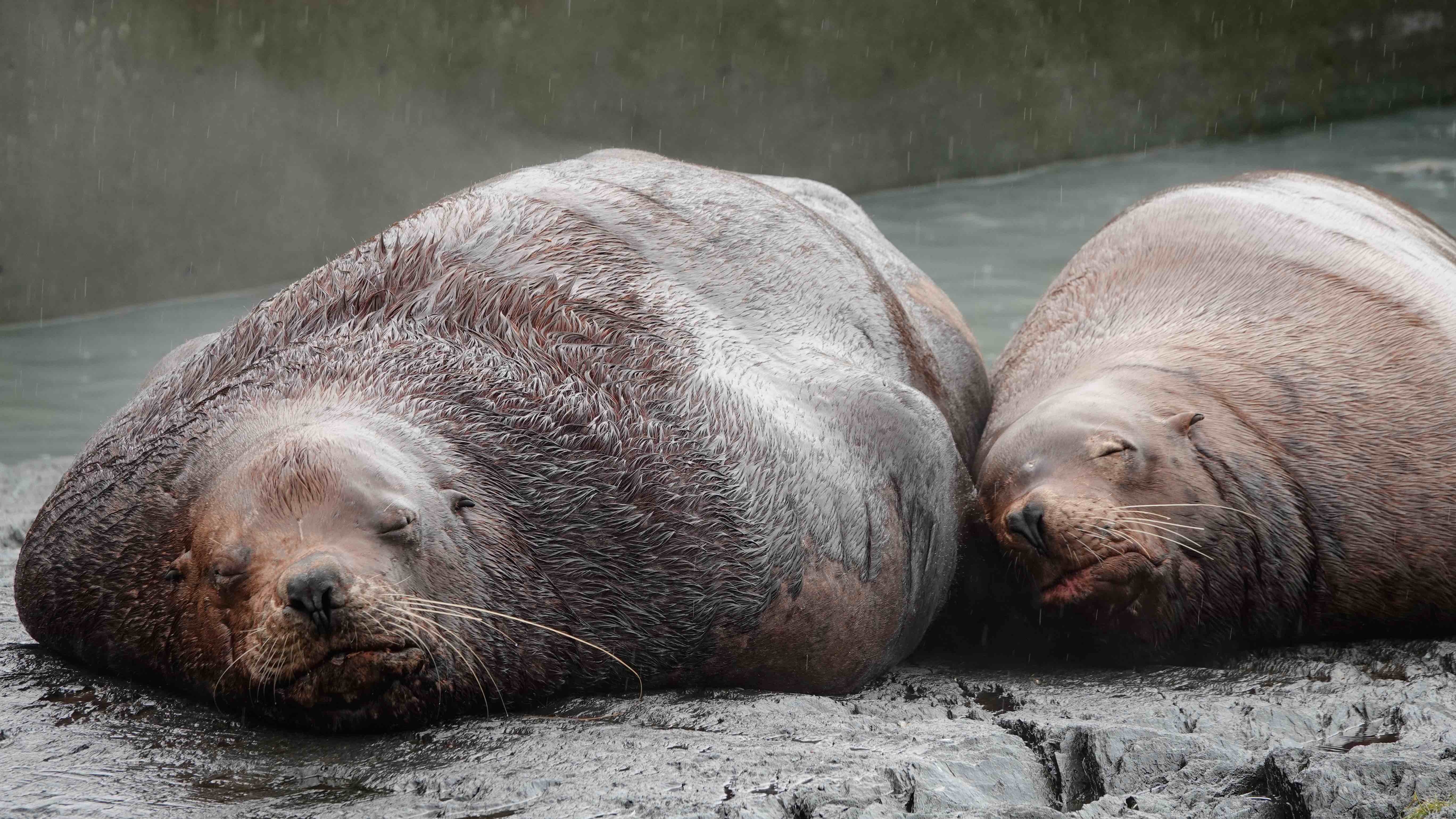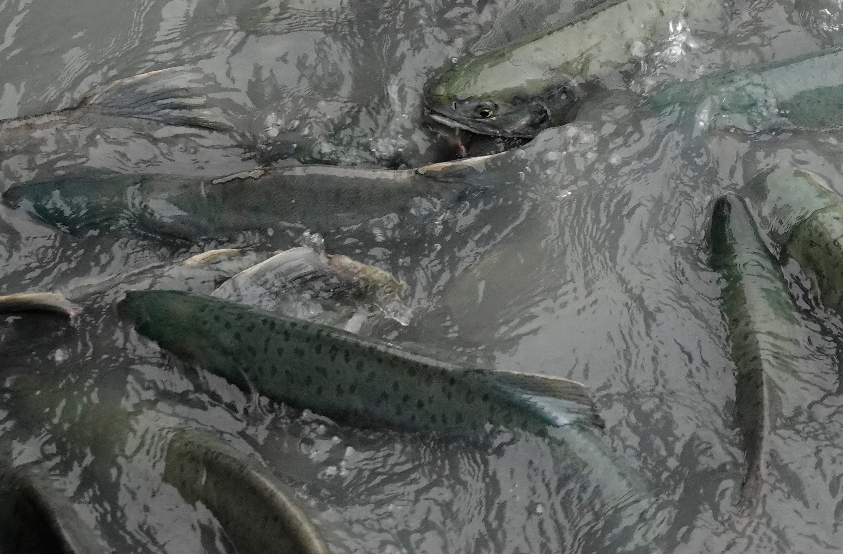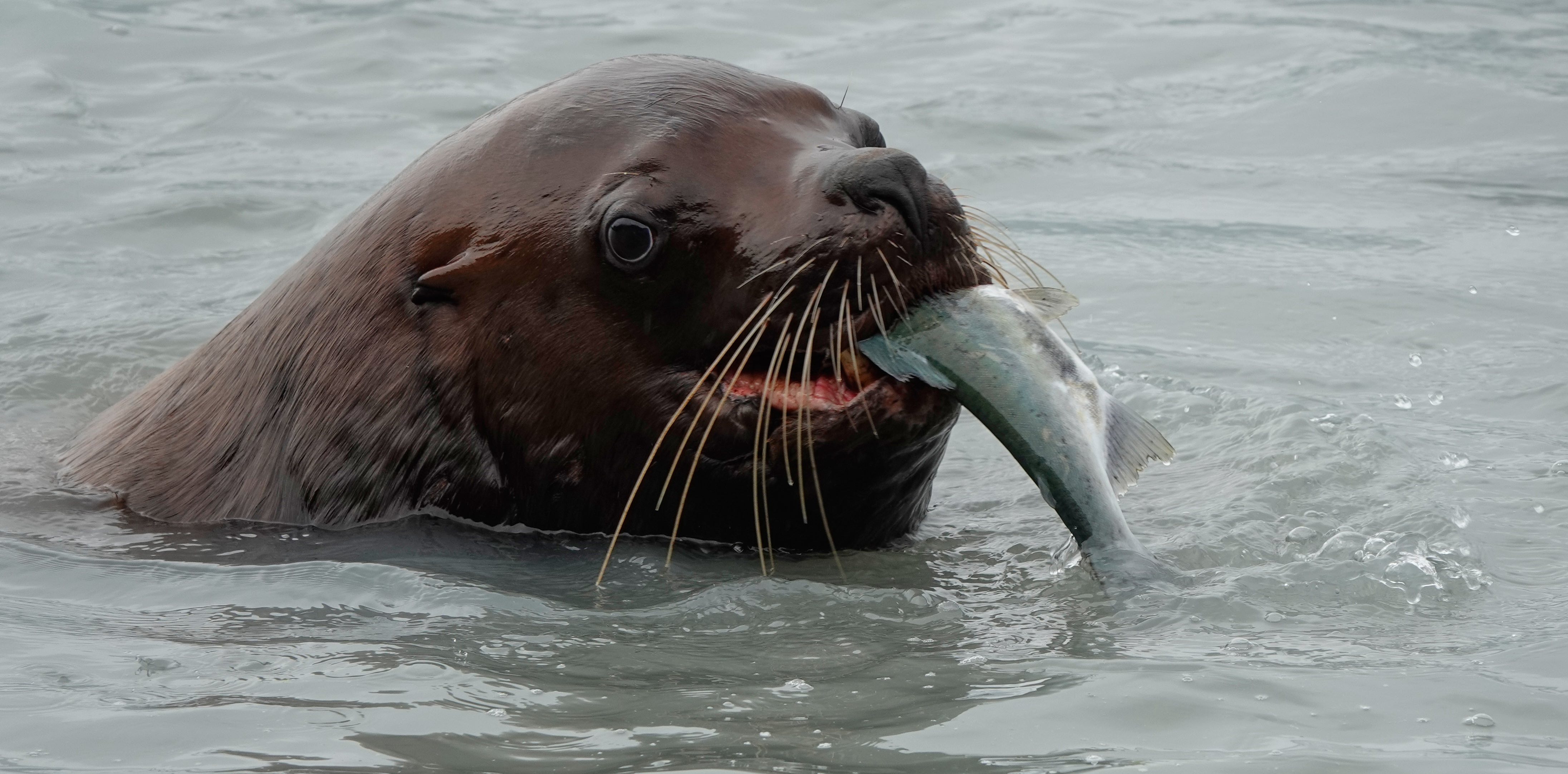 Direkt vor der Fabrik tummelt sich eine kleine Herde Seelöwen, die sich die Lachse schmecken lassen oder nach einer guten Mahlzeit ein Mittagsschläfchen machen. Seehunde und Unmengen von Möwen haben sich ebenfalls zum Festmahl eingefunden. Es ist gigantisch, welche Massen von Lachsen im Meer herumschwimmen, es ist ein unglaubliches Gewimmel und das Ufer ist mit toten Fischen übersät. Ob sie alle aus Erschöpfung hier ein Ende gefunden haben, oder wie schon 2019 ein zu heißer Sommer, mit mangelndem Sauerstoffgehalt im Wasser sie zusätzlich geschwächt hat, können wir nicht herausfinden.