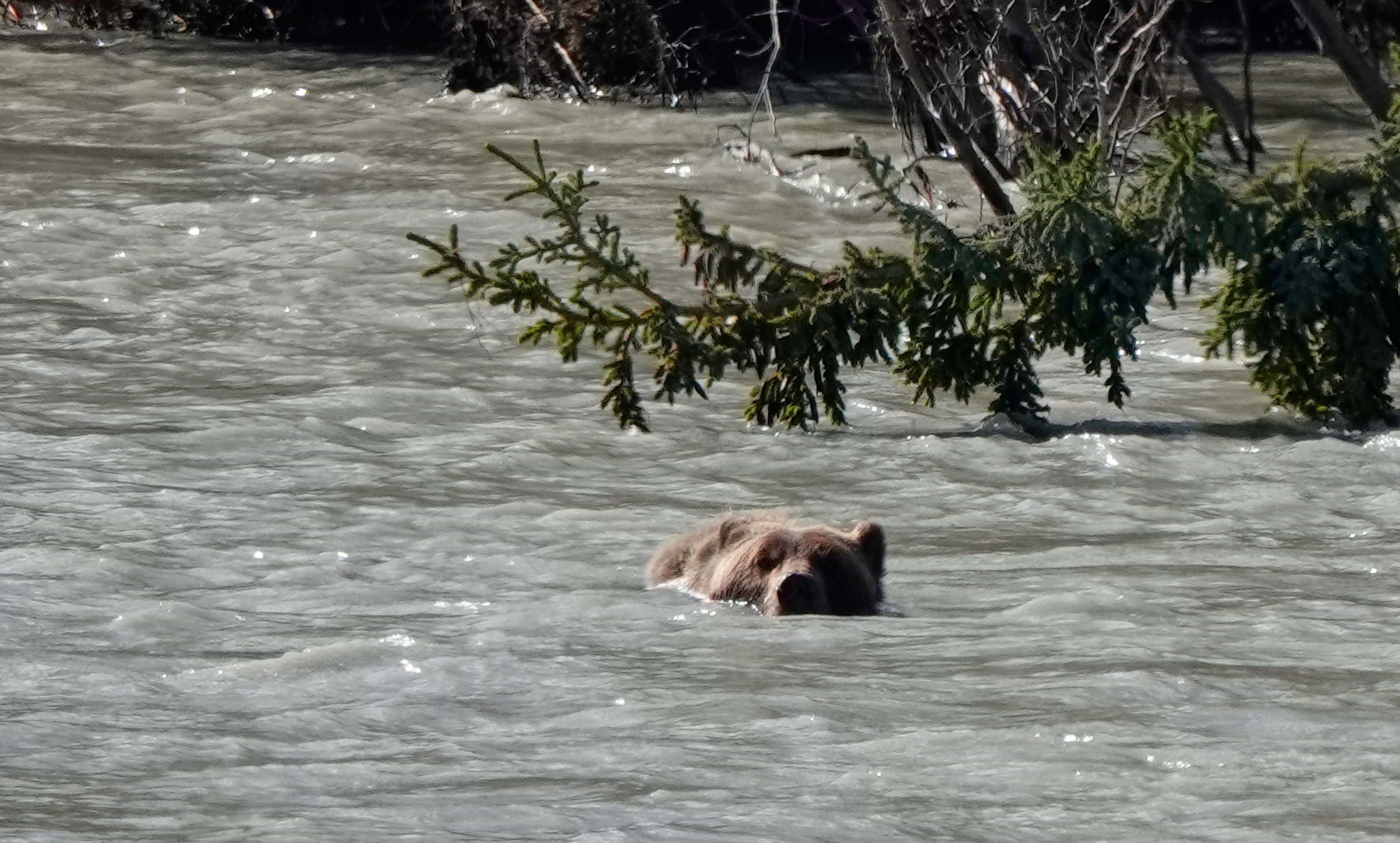 Durch stürmische Winde werden wir sehr früh am nächsten Morgen geweckt und nutzen die Gelegenheit, nochmal zum Wehr zu fahren. Außer uns ist kein Mensch zu sehen und wir können direkt im Auto sitzend den Grizzlybären beim Fischen zusehen.