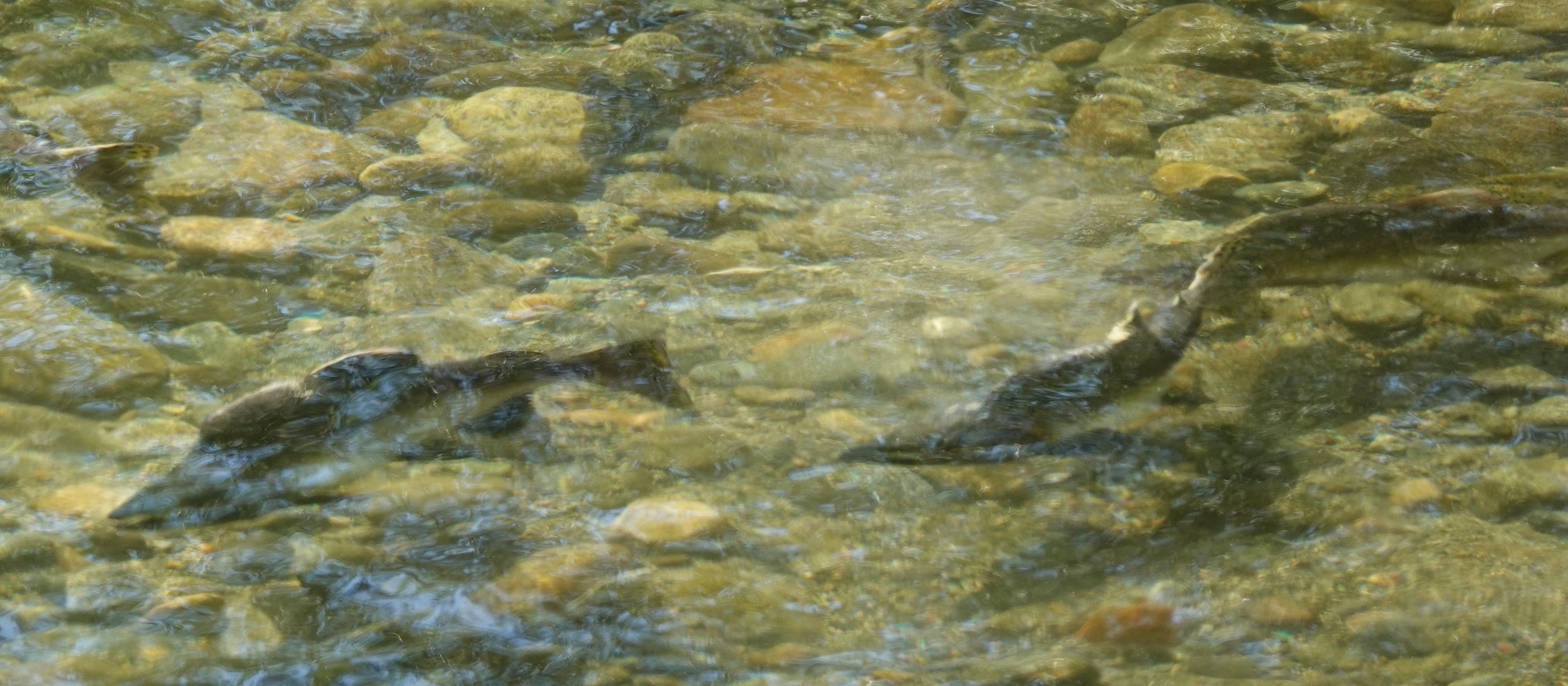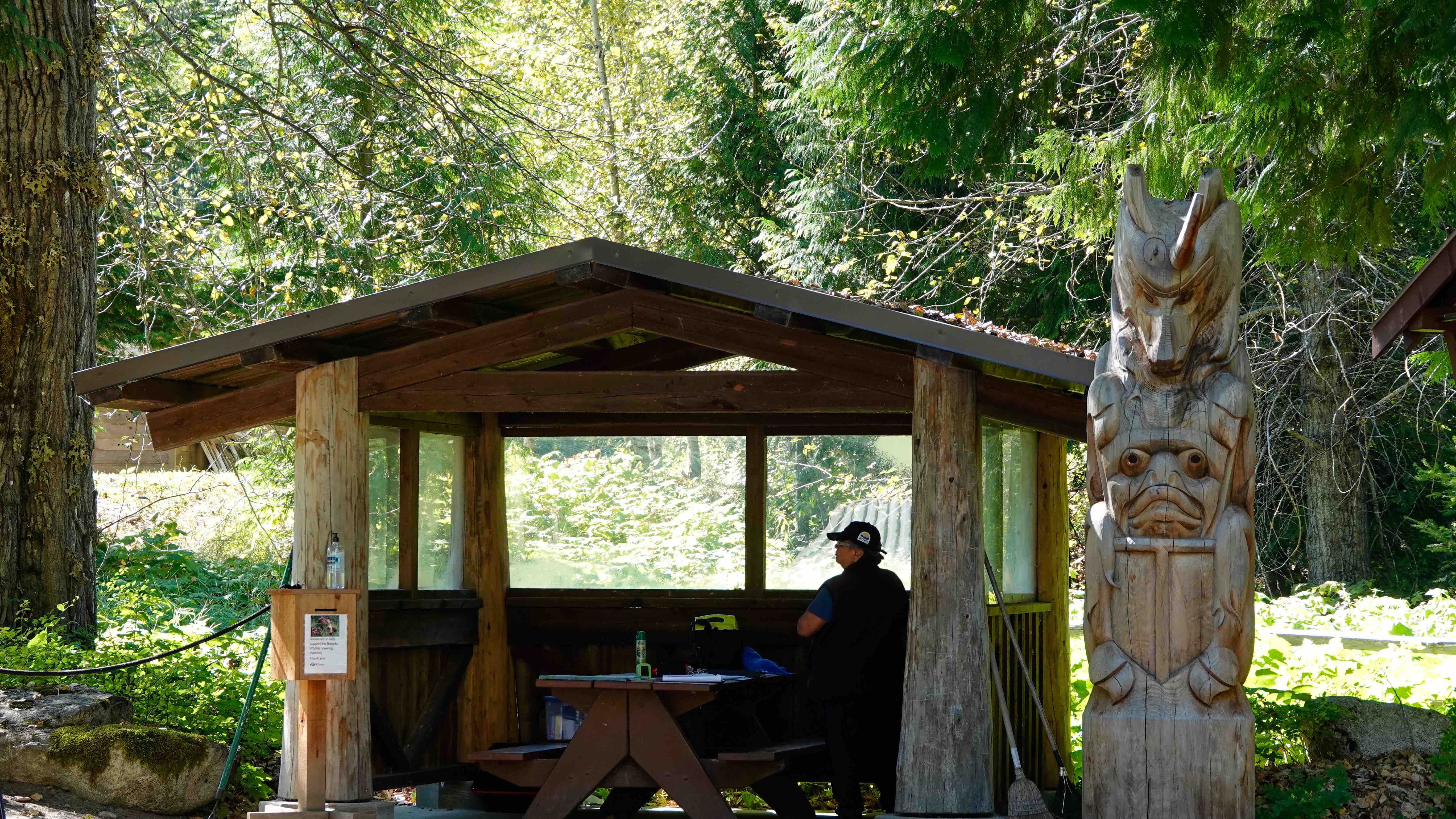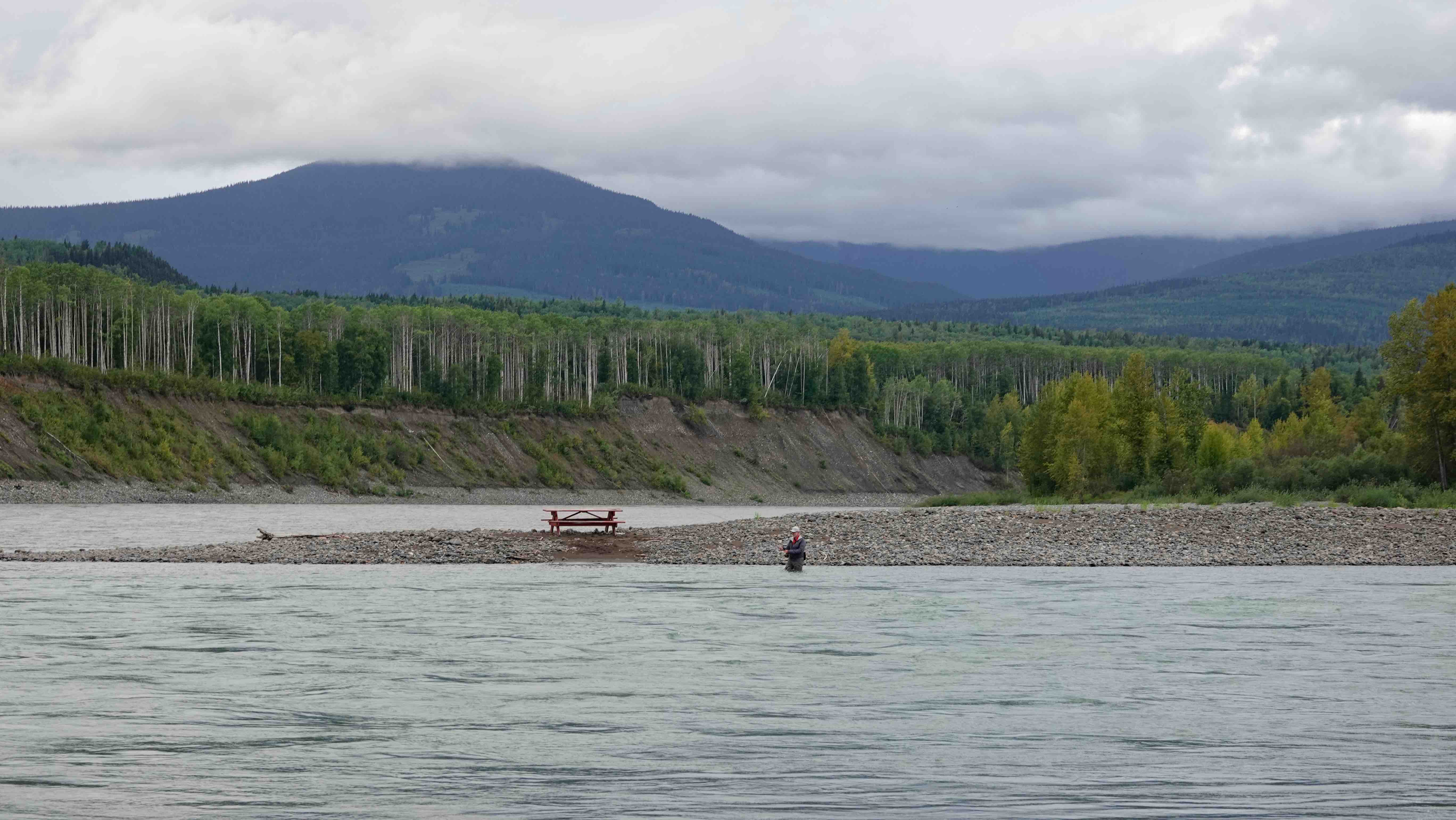An der Brücke über den Fluss ist eine Gruppe Tsilhqotìn dabei, auf traditionelle Weise Lachse zu fangen: Mit einem Seil festgebunden, steht die Fischer*in auf den Felsen knapp über dem Fluss und zieht einen Kescher, der einen langen Stiel hat, durch das Wasser. Die Lachse, die flussaufwärts unterwegs sind, schwimmen so in ihr Verhängnis hinein. Eine sehr effektive Methode – innerhalb einer halben Stunde haben sie bestimmt 15 Lachse gefangen. Es sind sogar 2 Sokeye Lachse dabei, die edelste Version.