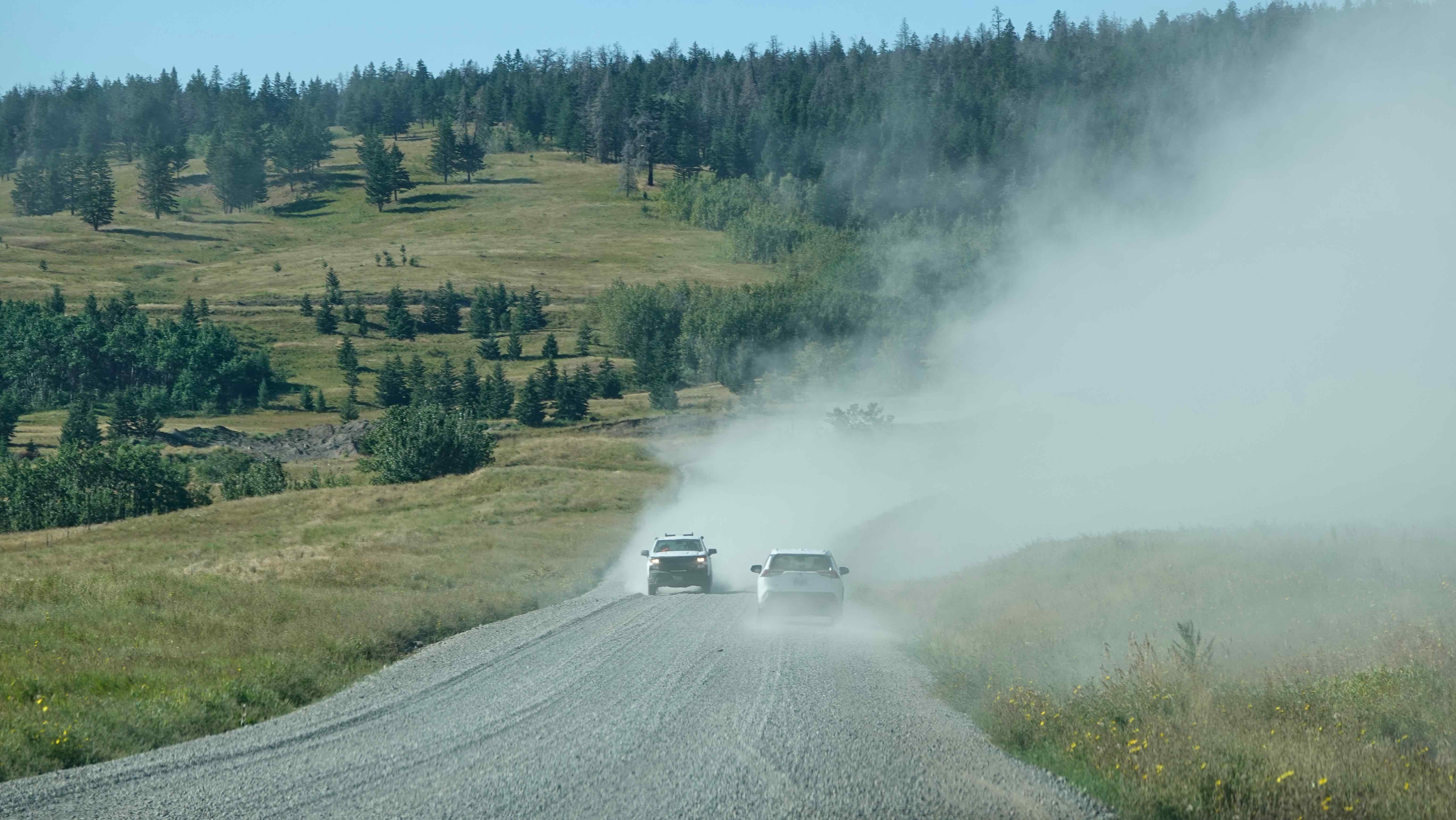 Walter freut sich über die Schotterstraße, auch wenn uns die vielen Lastwagen mit Holzladungen oft in Staubwolken einhüllen.