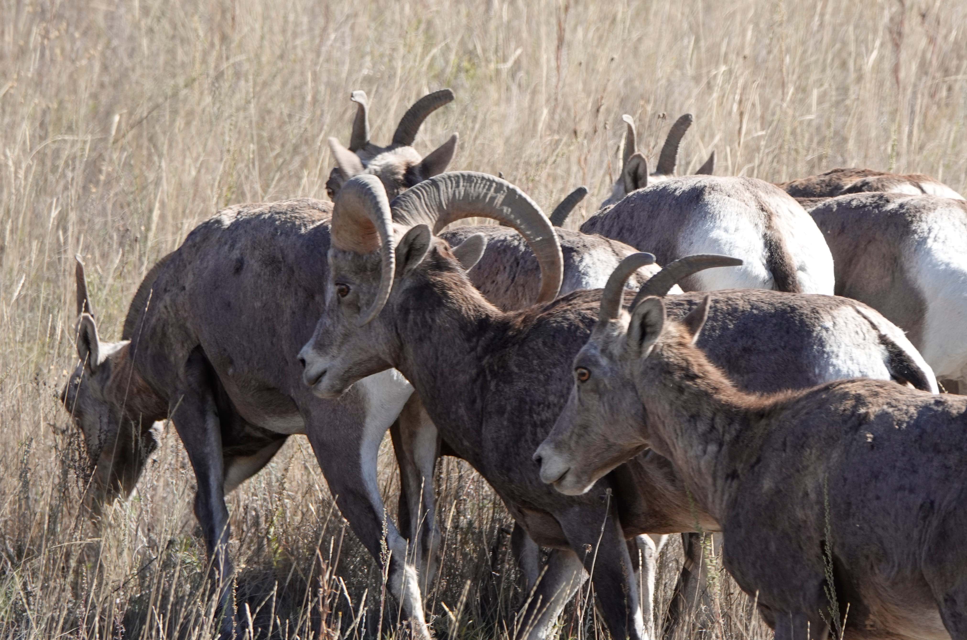 Die Piste windet sich kurvenreich durch die Berghänge der Grass Lands, ein seit den 90-er Jahren unter Naturschutz stehendes renaturiertes Gebiet. Wir beobachten eine Gruppe Dickhornschafe, die am Wegesrand grast.