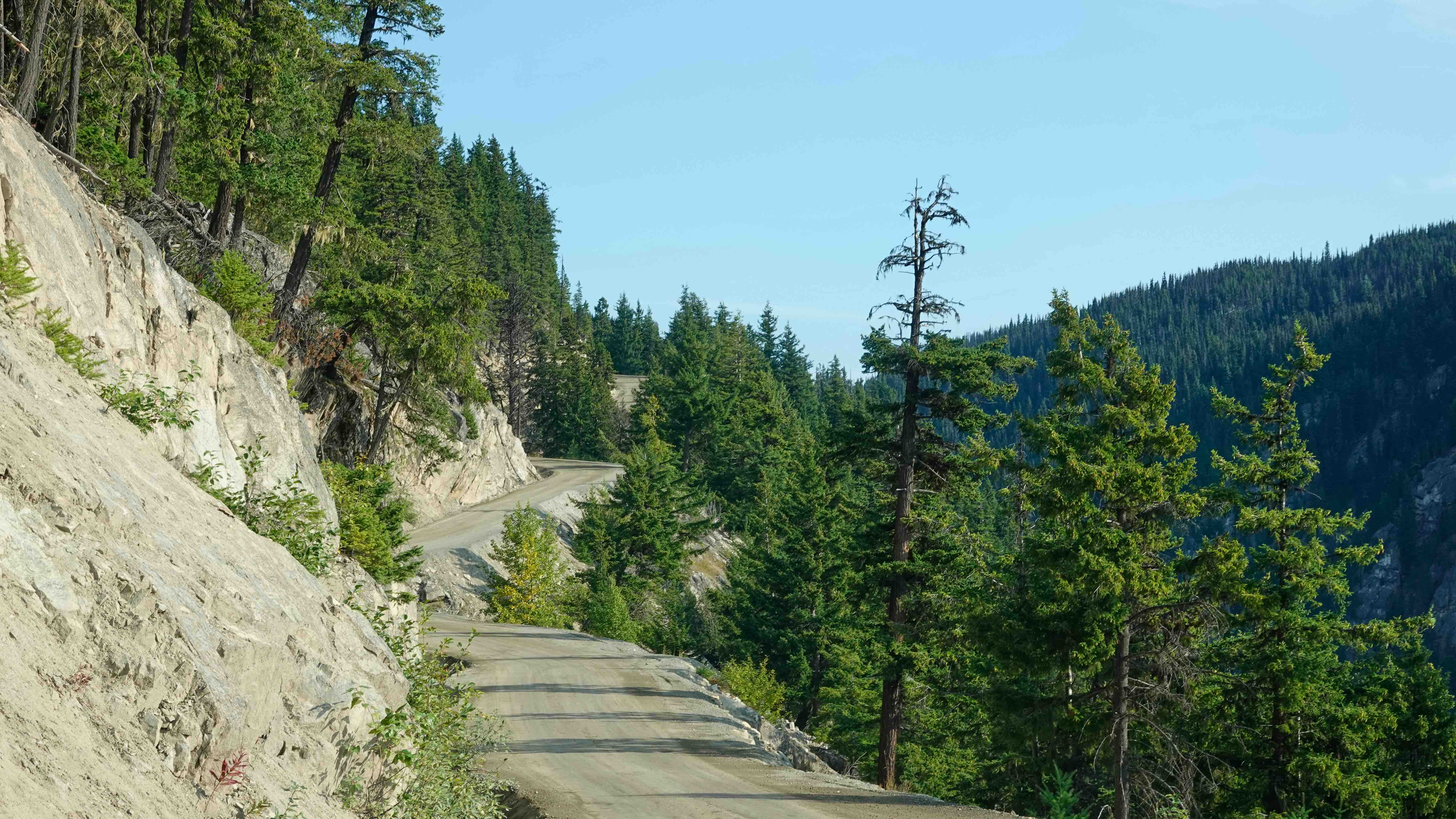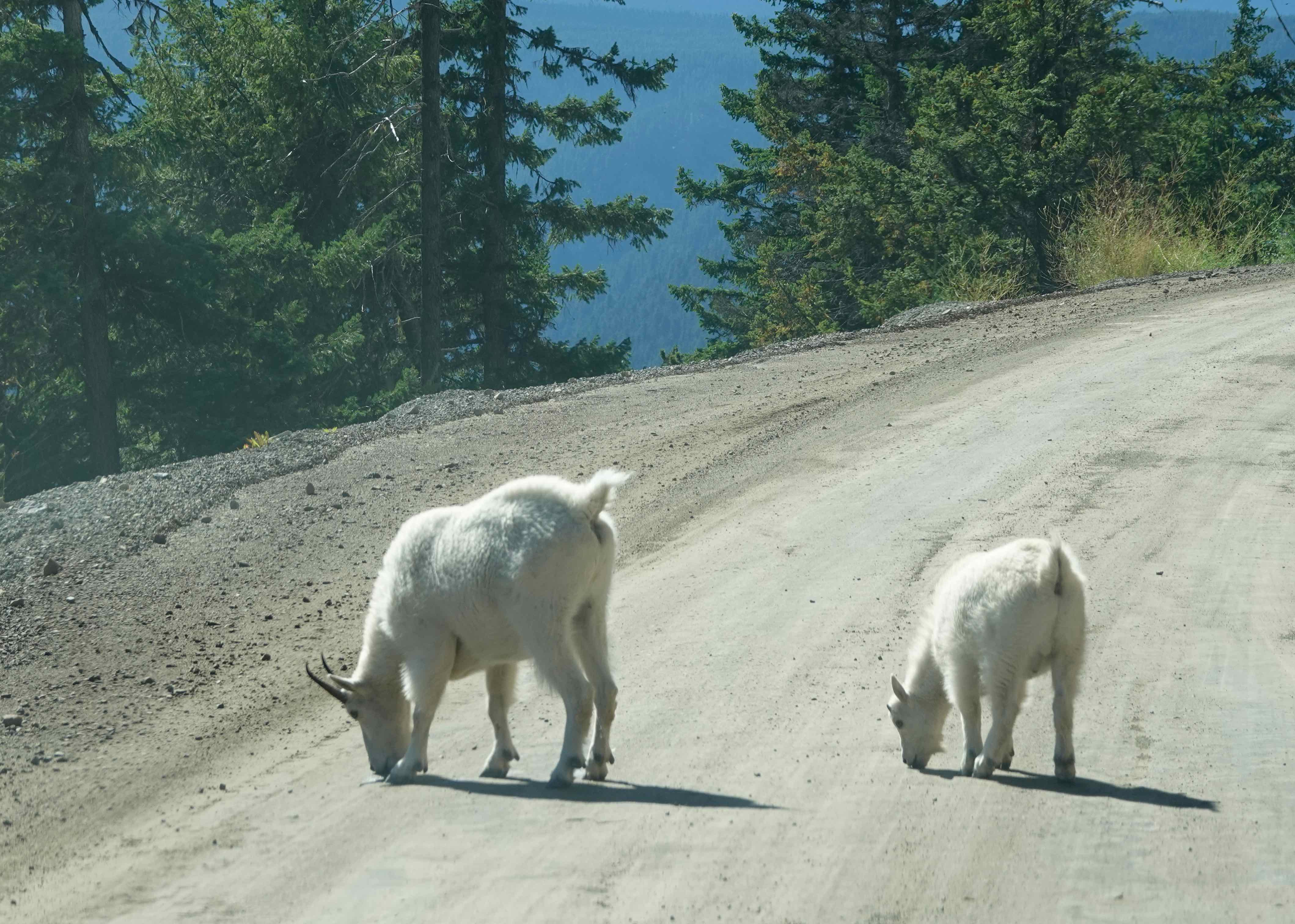 Wir überqueren einen Pass in 1.525 m Höhe. Von dort aus windet sich die leitplankenlose Piste in steilen Kehren mit bis zu 18% Gefälle ins Tal hinunter. Der Ausblick ist atemberaubend und ich kann auch nur ab und zu einen Blick riskieren. Fotostopps sind auf der einspurigen Piste nicht möglich, ich kann nur ein paar durch die Windschutzscheibe machen. Nur einmal müssen wir kurz anhalten, um eine Mountain Goat mit ihrem Jungen vorbei zu lassen.