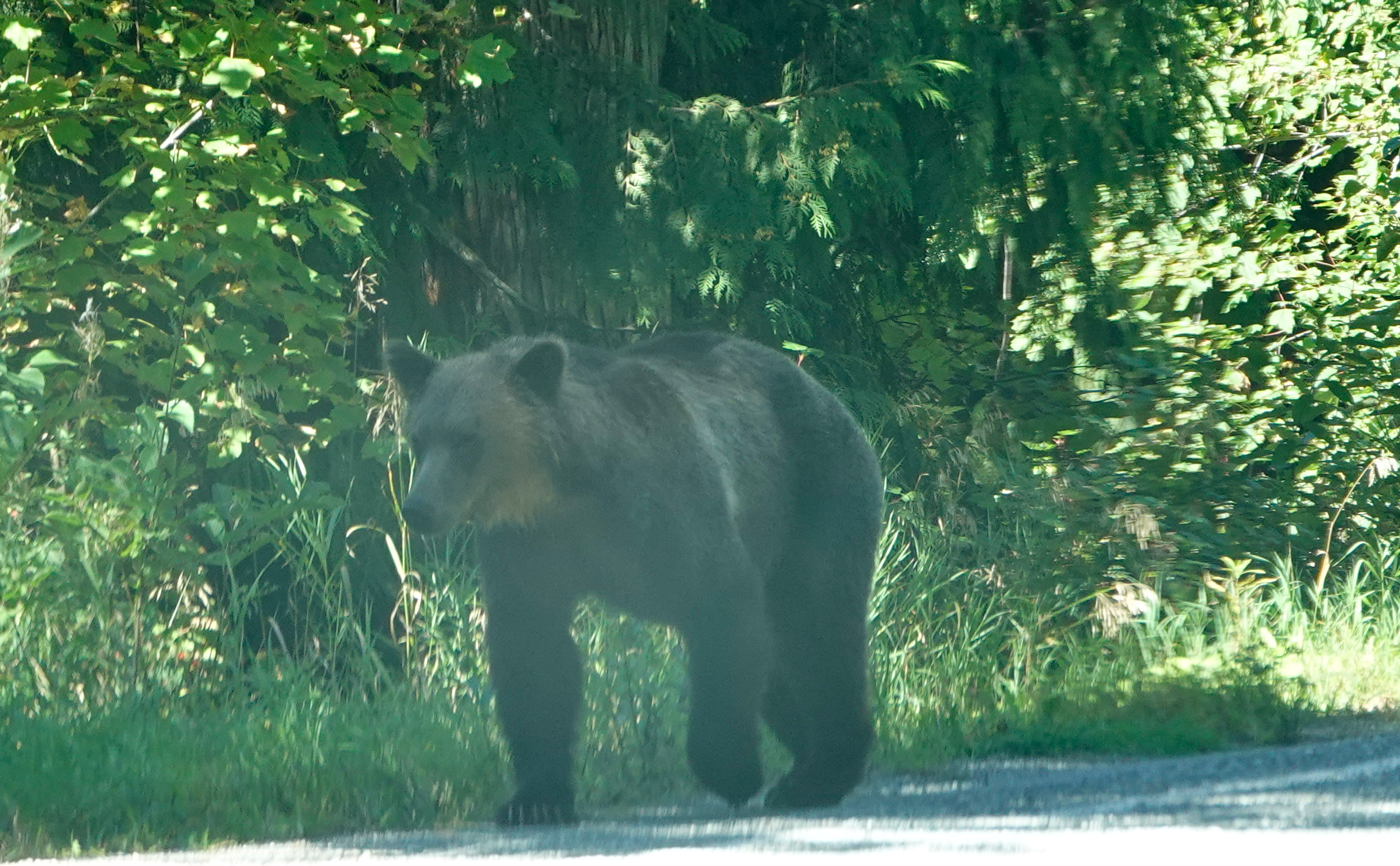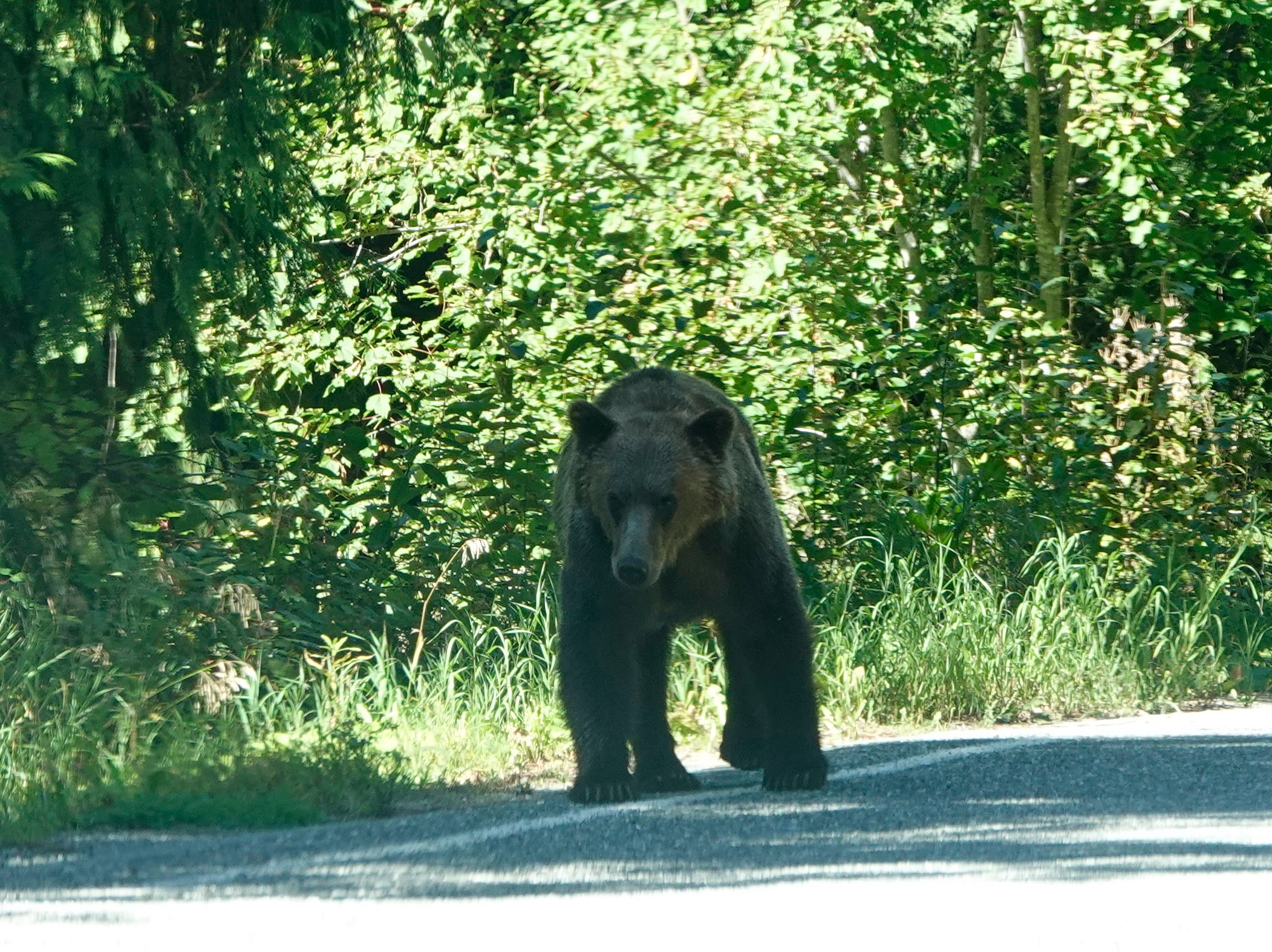 Unten angekommen geht es straks zur „Belarko Wildlife Viewing Platform“. Kurz vor der Zufahrt kommt uns direkt ein Grizzly auf der Straße auf dem Weg zum Fluss entgegen.