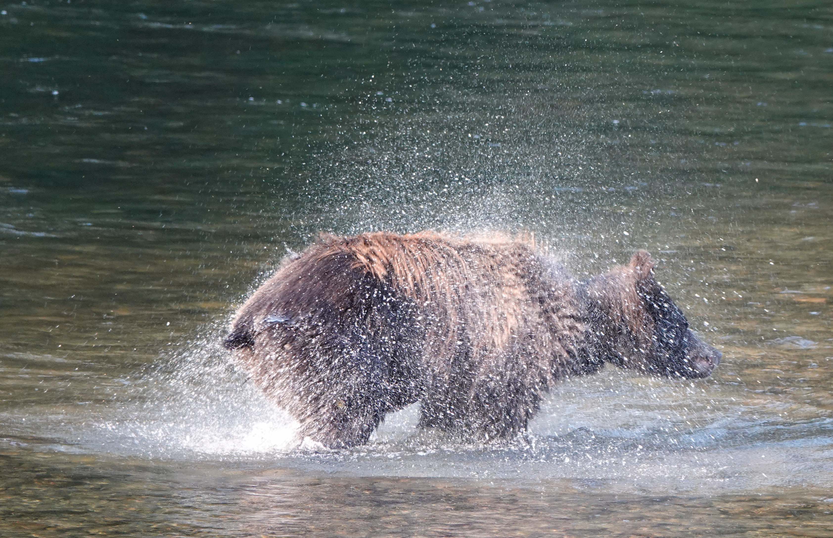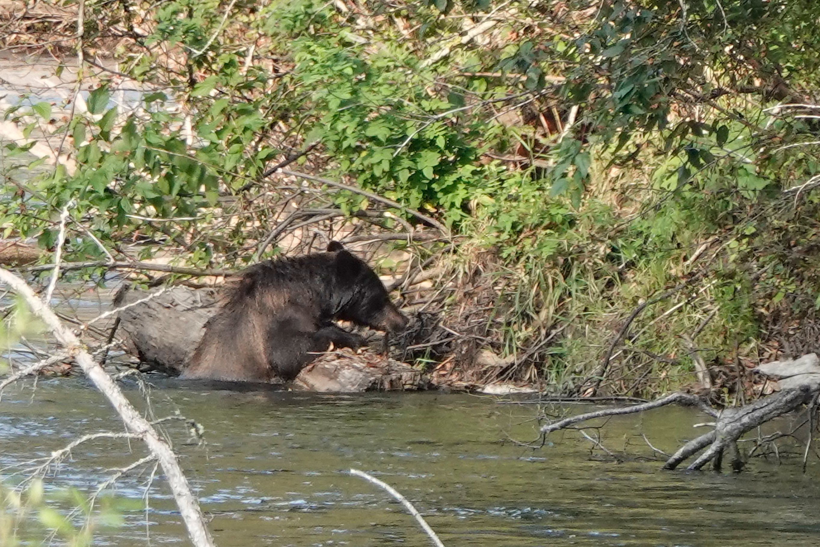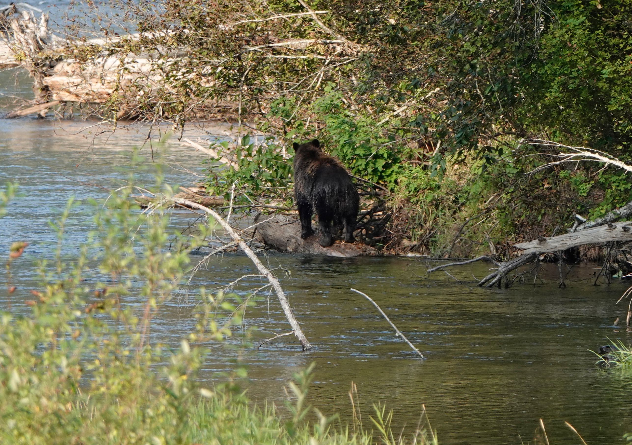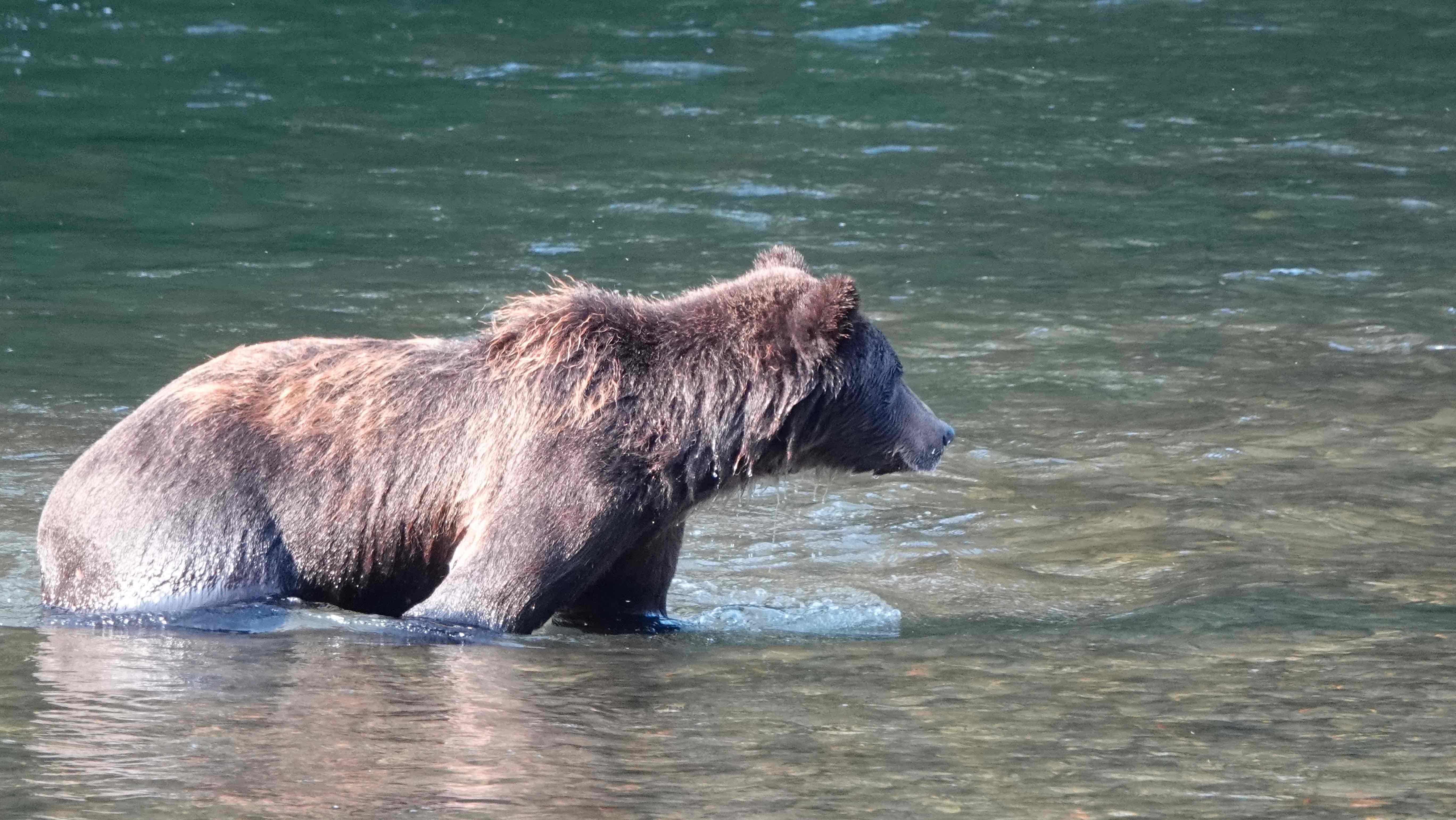 Aber für eine Nacht bleiben wir hier und fahren abends noch mal zum Wildlife Viewing. Um 19:00 Uhr wird die Plattform geschlossen und wir heben kein Glück gehabt. Dafür am nächsten Morgen umso mehr: Pünktlich zu unserer Ankunft schwimmt ein Grizzly den Fluss hinauf, fängt sich am Ufer einen Lachs, verspeist ihn genüsslich am Ufer und verschwindet dann gemächlich im Wald.