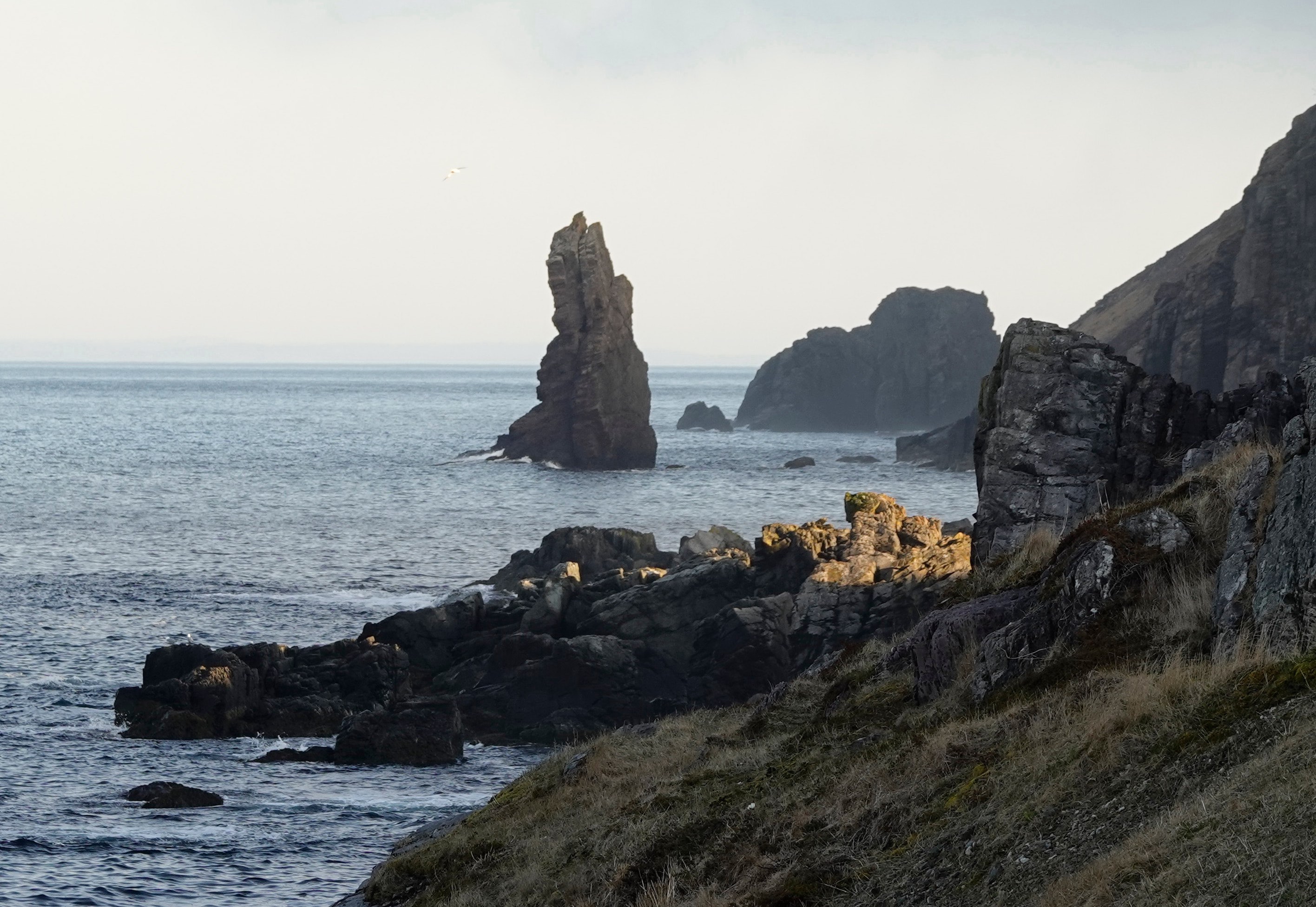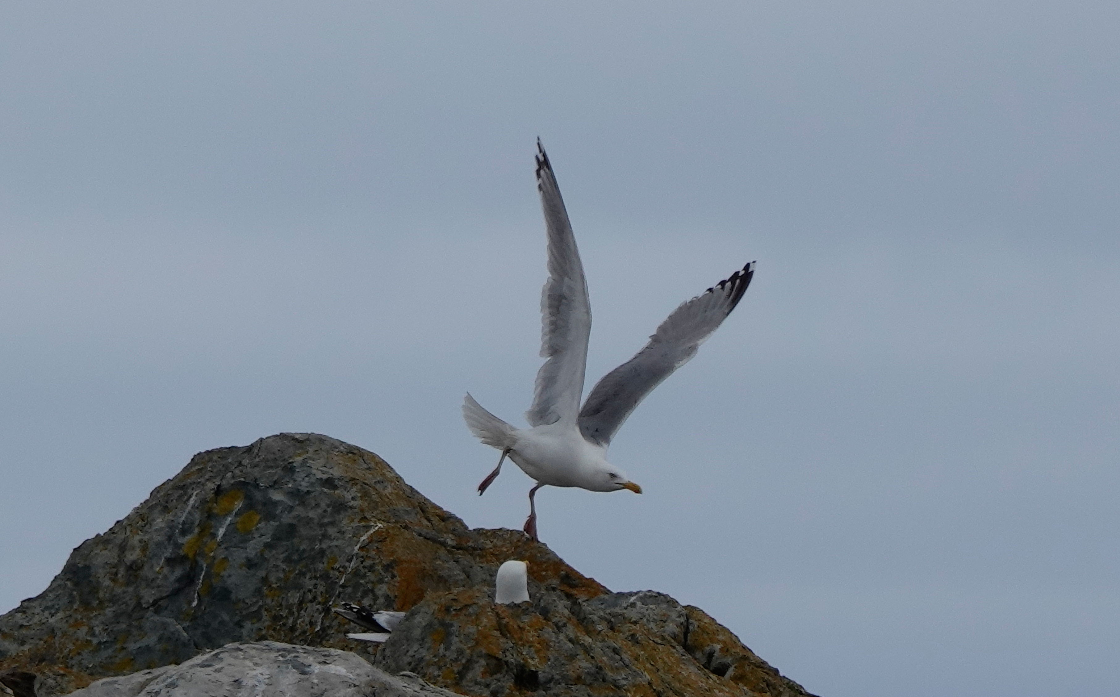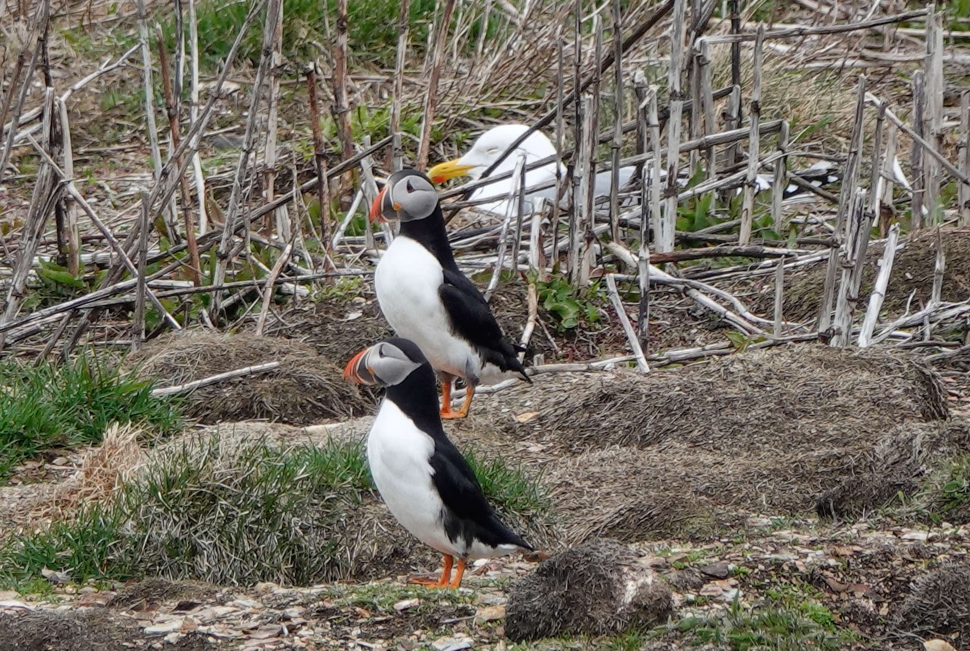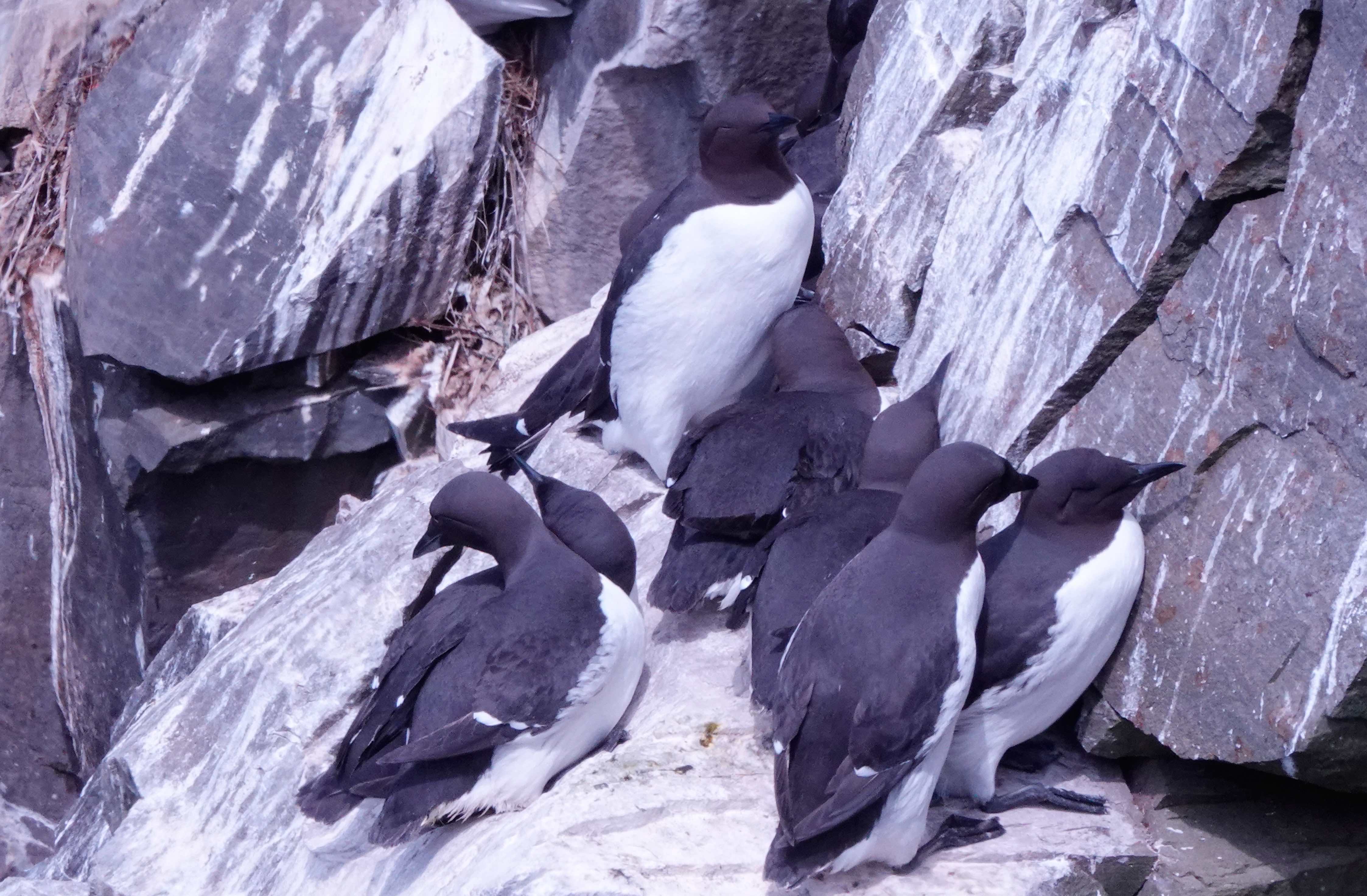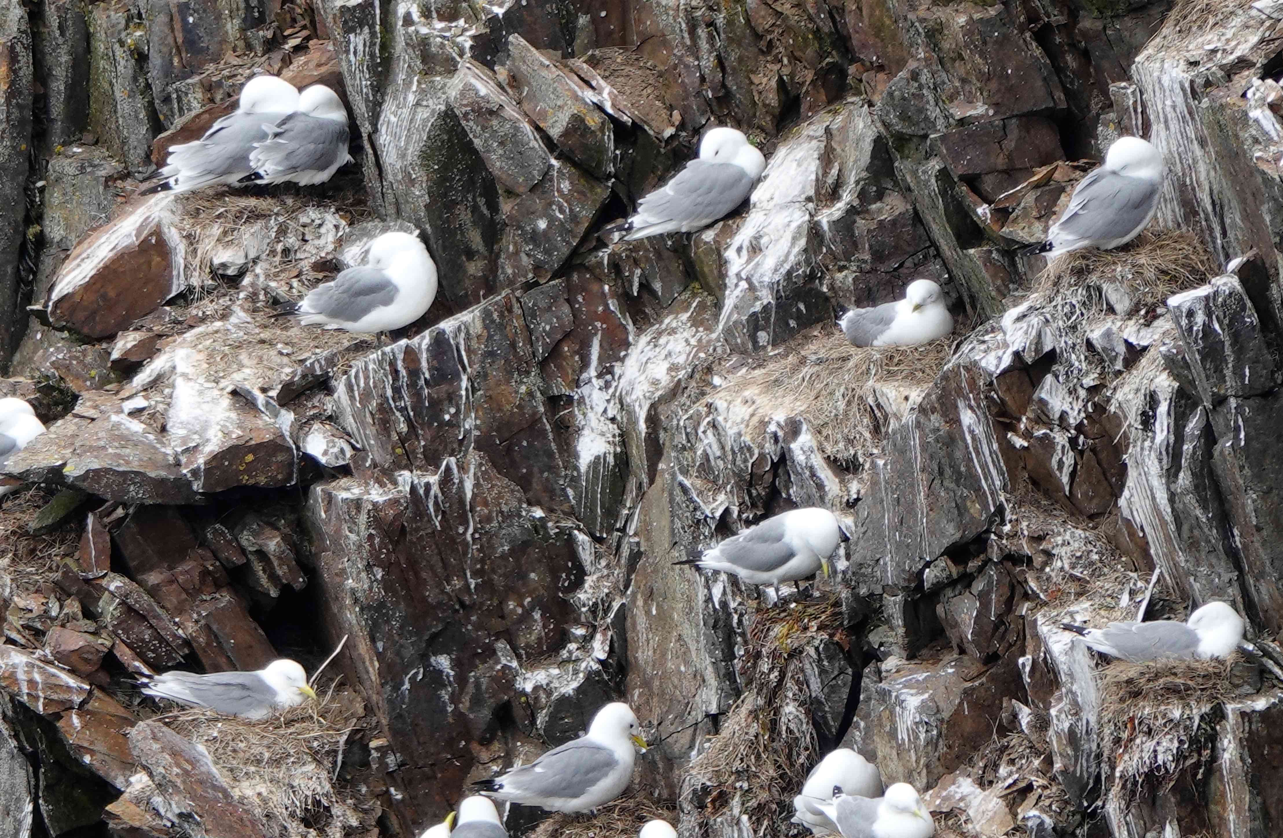Ein kurzer Weg führt über steil abfallende Klippen ziemlich nah an den Felsen heran. Wir sehen viele Möwen, die Papageientaucher sind wohl noch unterwegs auf dem Wasser. Nur ein Pärchen kommt kurz aus seiner Höhle und präsentiert sich für ein Foto, Glück gehabt!
