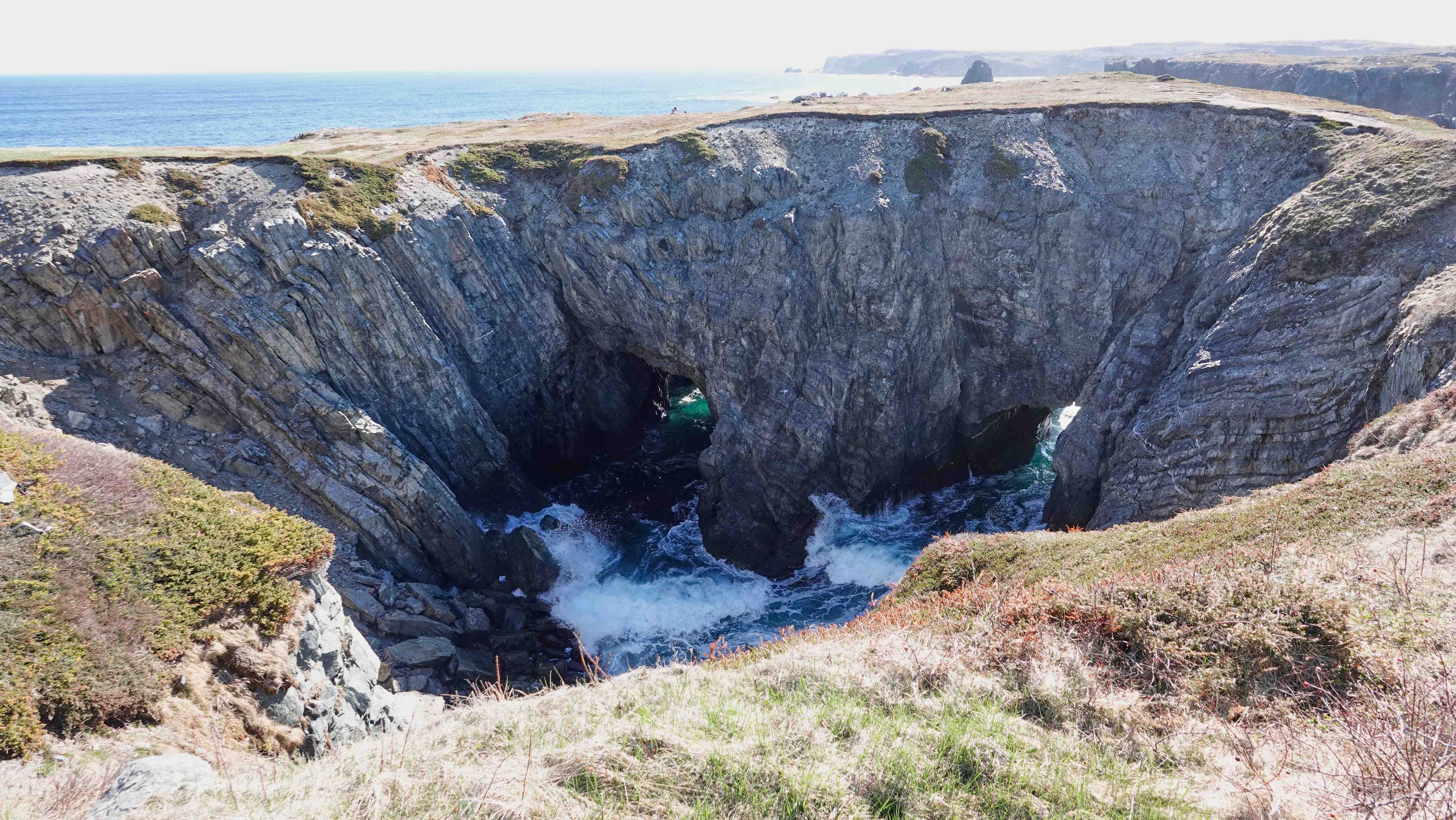 Ein Stück weiter fahren wir noch an der „Dungeon“ vorbei, eine 90 m tiefe Schlucht am Meer, die durch den Zusammenbruch zweier Höhlen entstanden ist. Durch 2 riesige Löcher donnert die Brandung an den Strand.