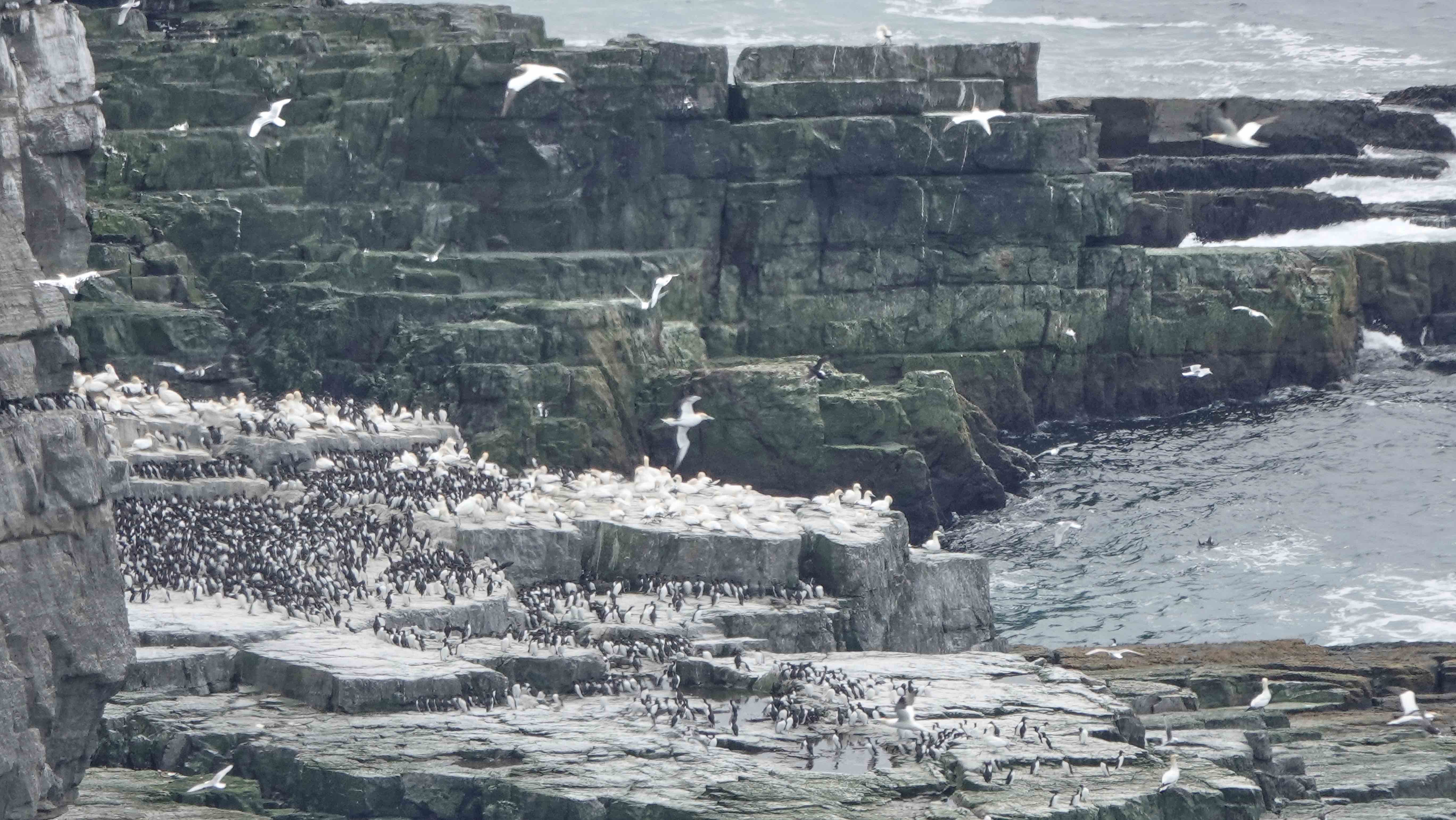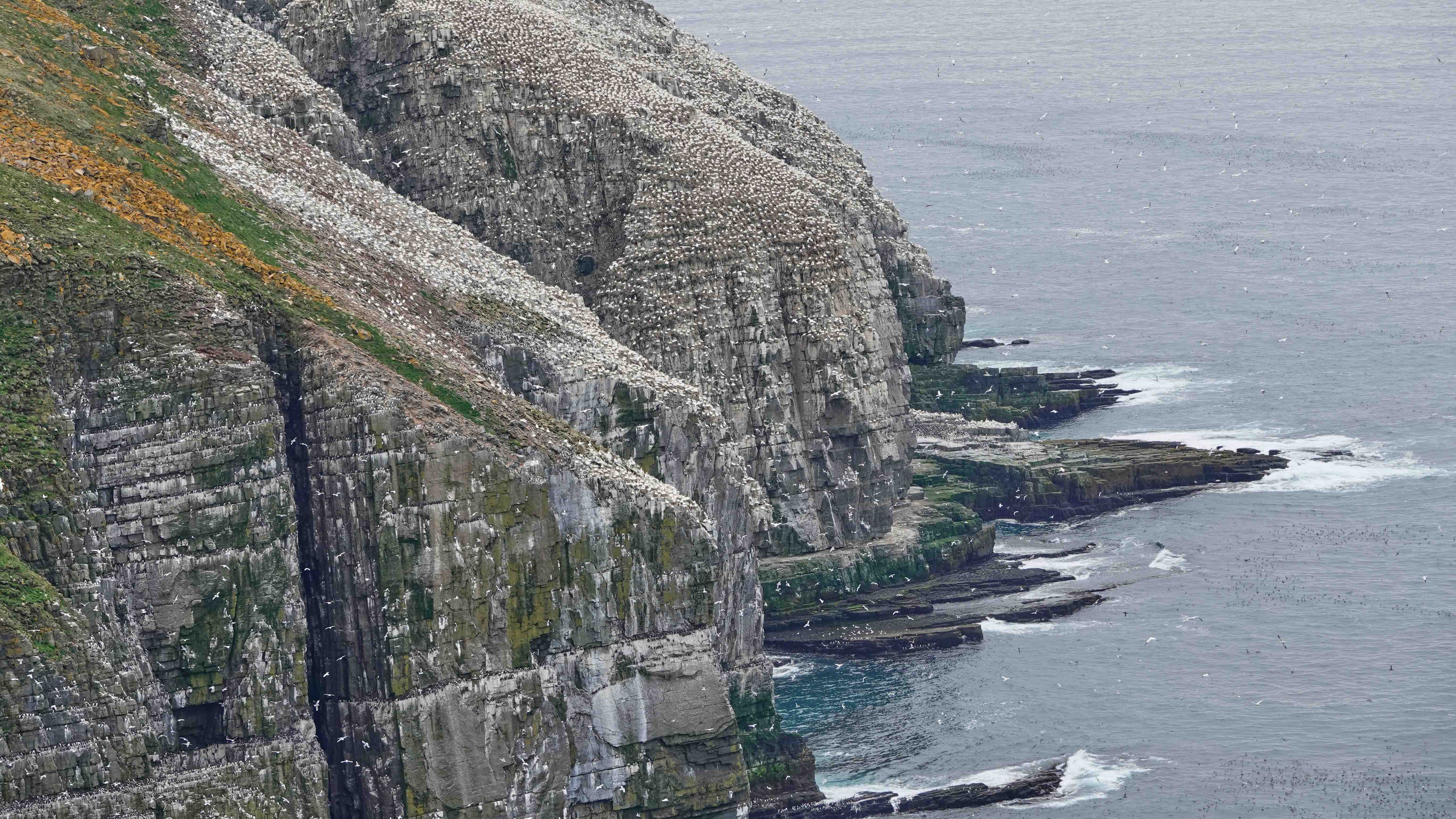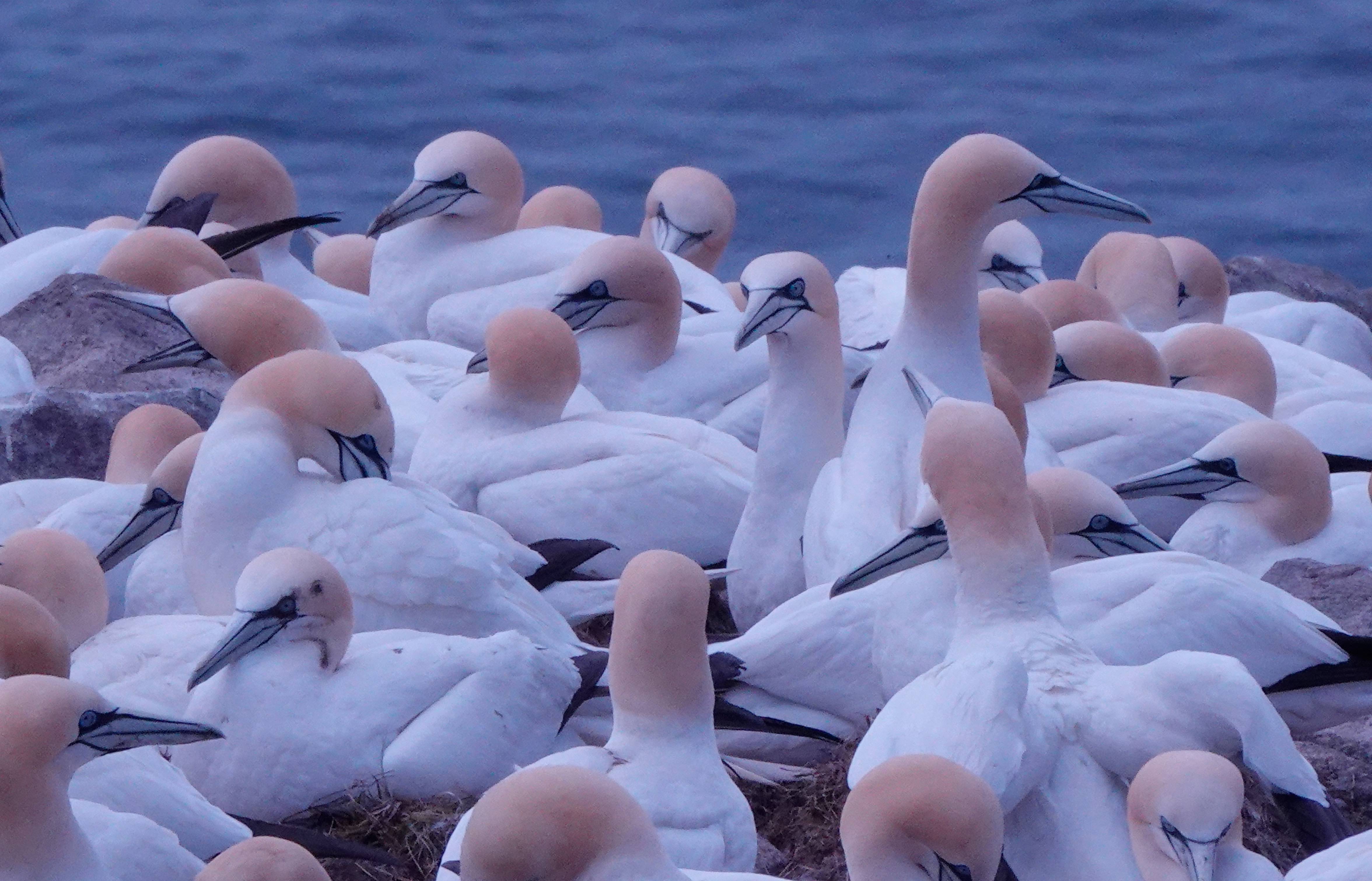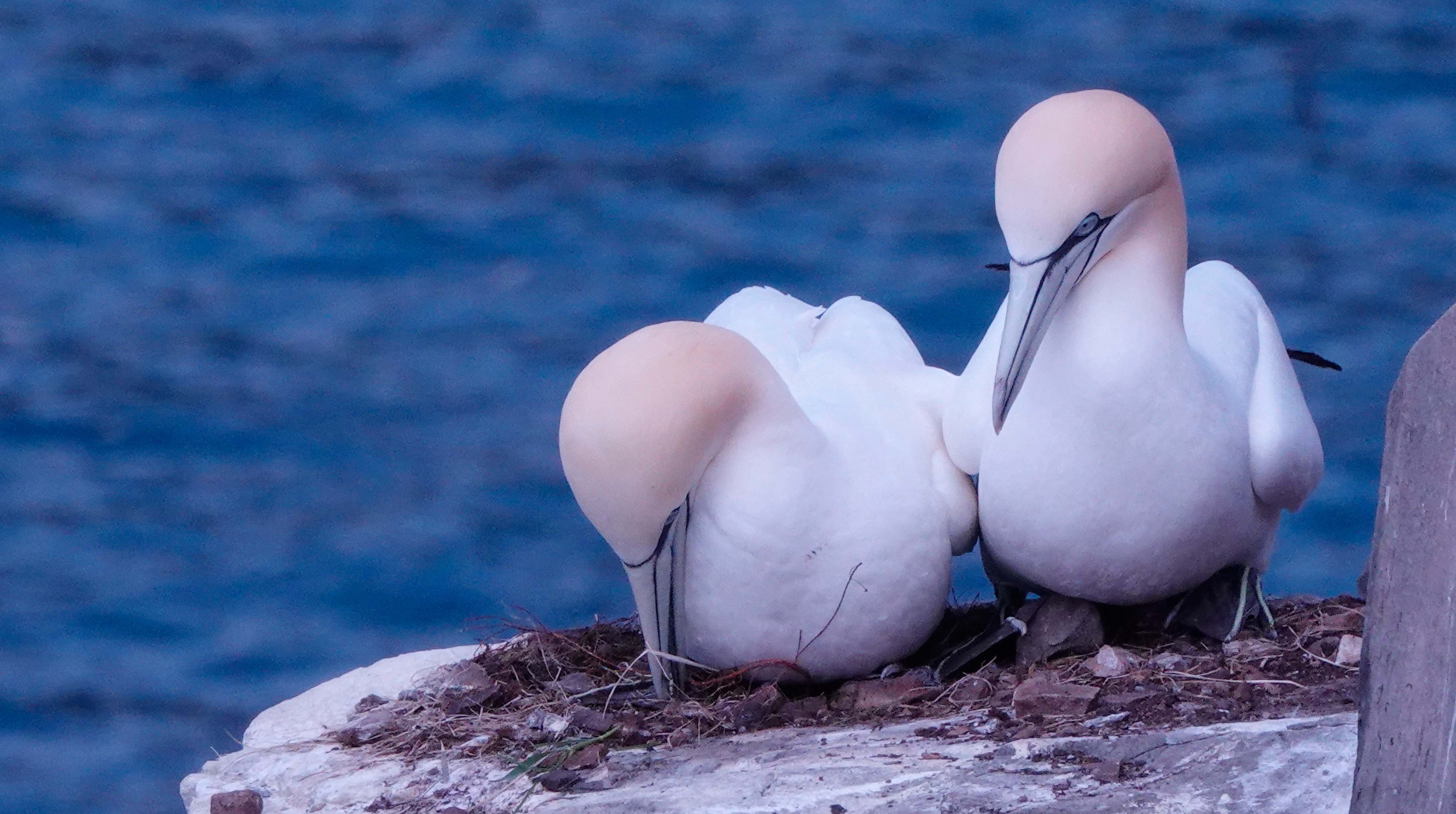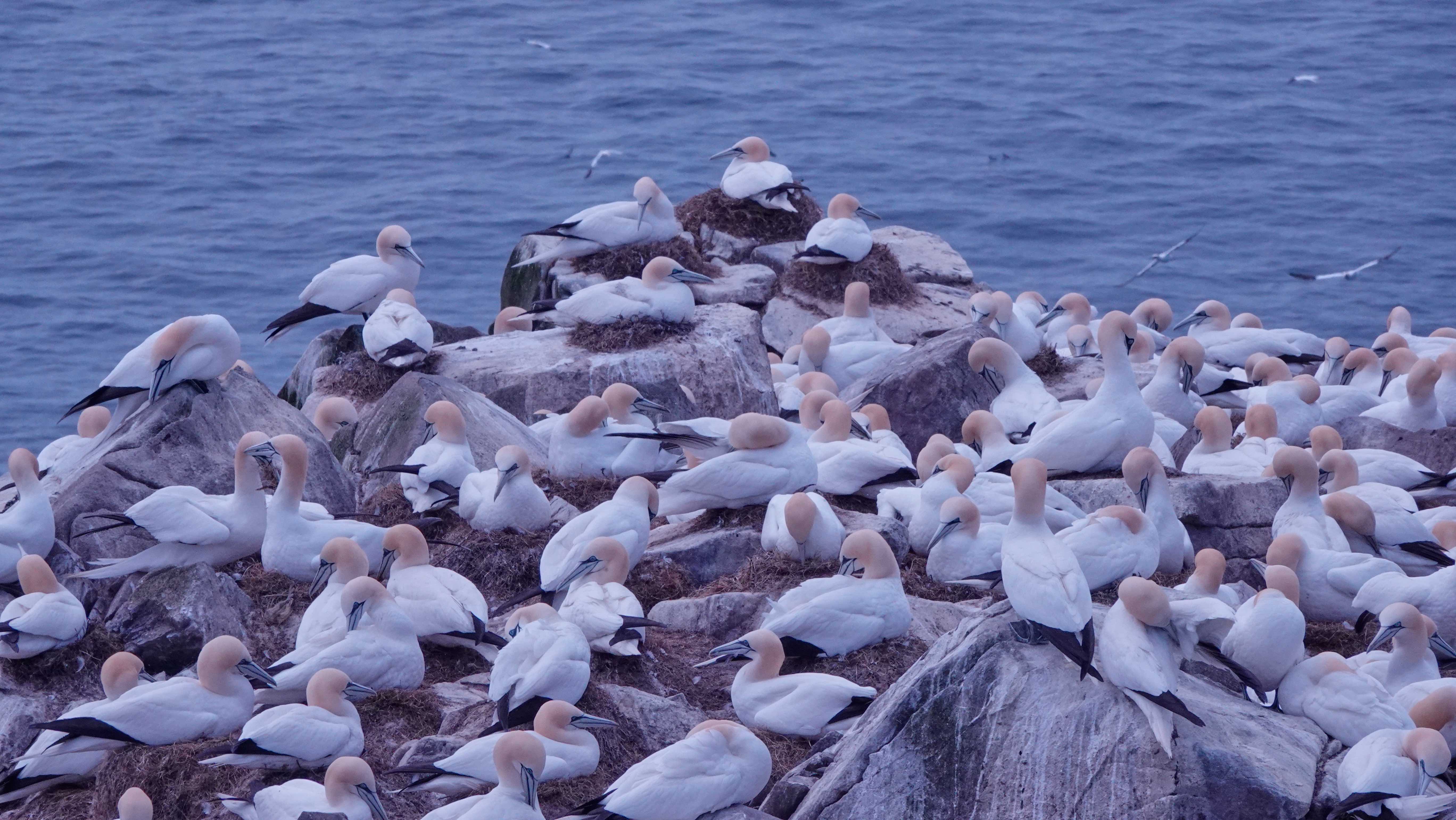 Am Ende des Weges stehen wir unmittelbar vor einem Felsen, auf dem sich dicht an dicht die Basstölpel drängen. Wir sind nur etwa 15 Meter von den brütenden Vögeln entfernt, aber sie lassen sich in keiner Weise von uns stören. Nebenan auf der Klippe sind noch jede Menge Dreizehenmöwen und ab und an Trottellummen und Kormorane zu sehen. Wir können nicht genug kriegen von dem Spektakel und bleiben eine ganze Weile und beobachten die Vögel.