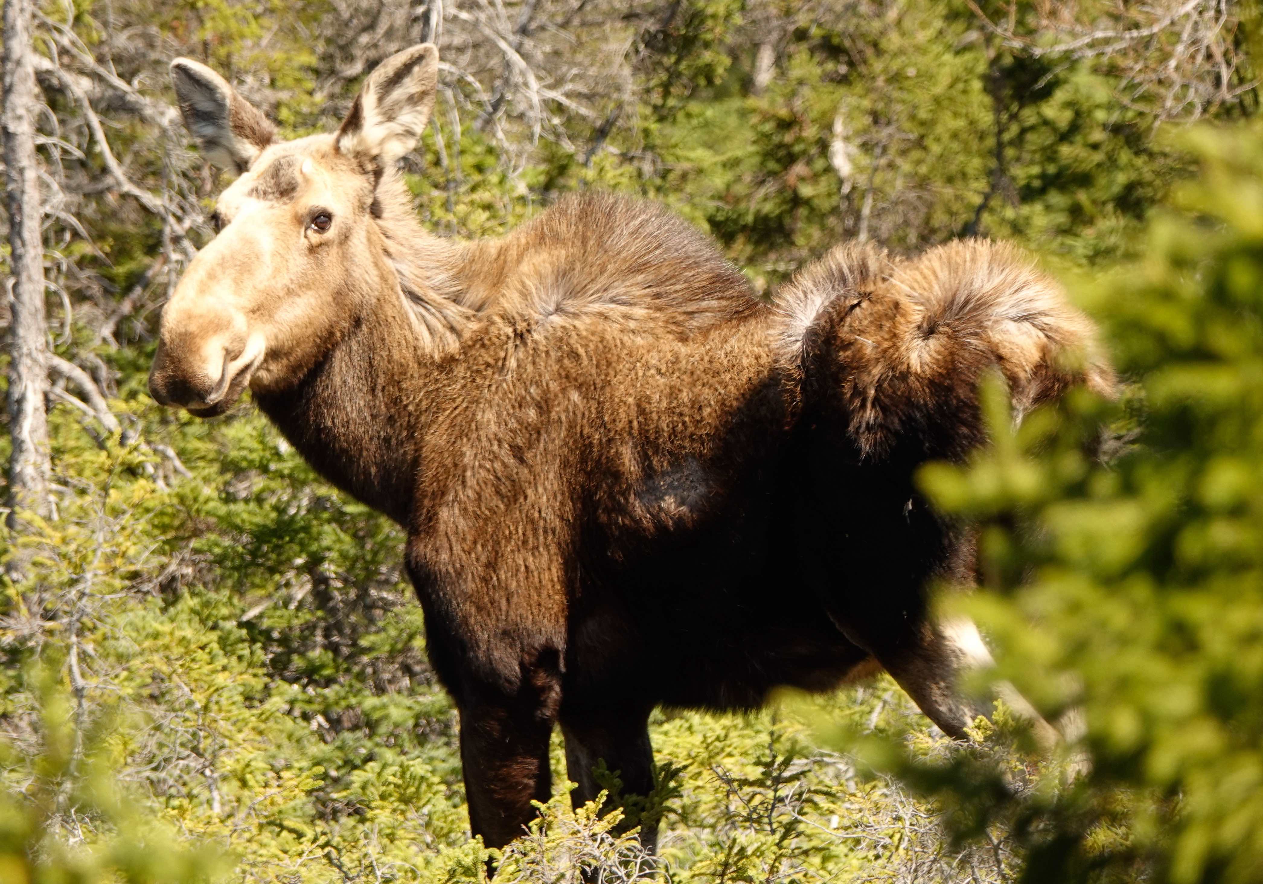 Bei einem Fotostopp hält ein Ranger an und klärt uns über die Gefahren von plötzlich über die Straße laufenden Karibus und Elchen auf. Karibus hatten wir schon gesehen, und kurz darauf begegnen wir tatsächlich 2 Elchen, die am Waldrand grasen. Sie sind nicht total schreckhaft und es gelingen mir ein paar schöne Fotos.