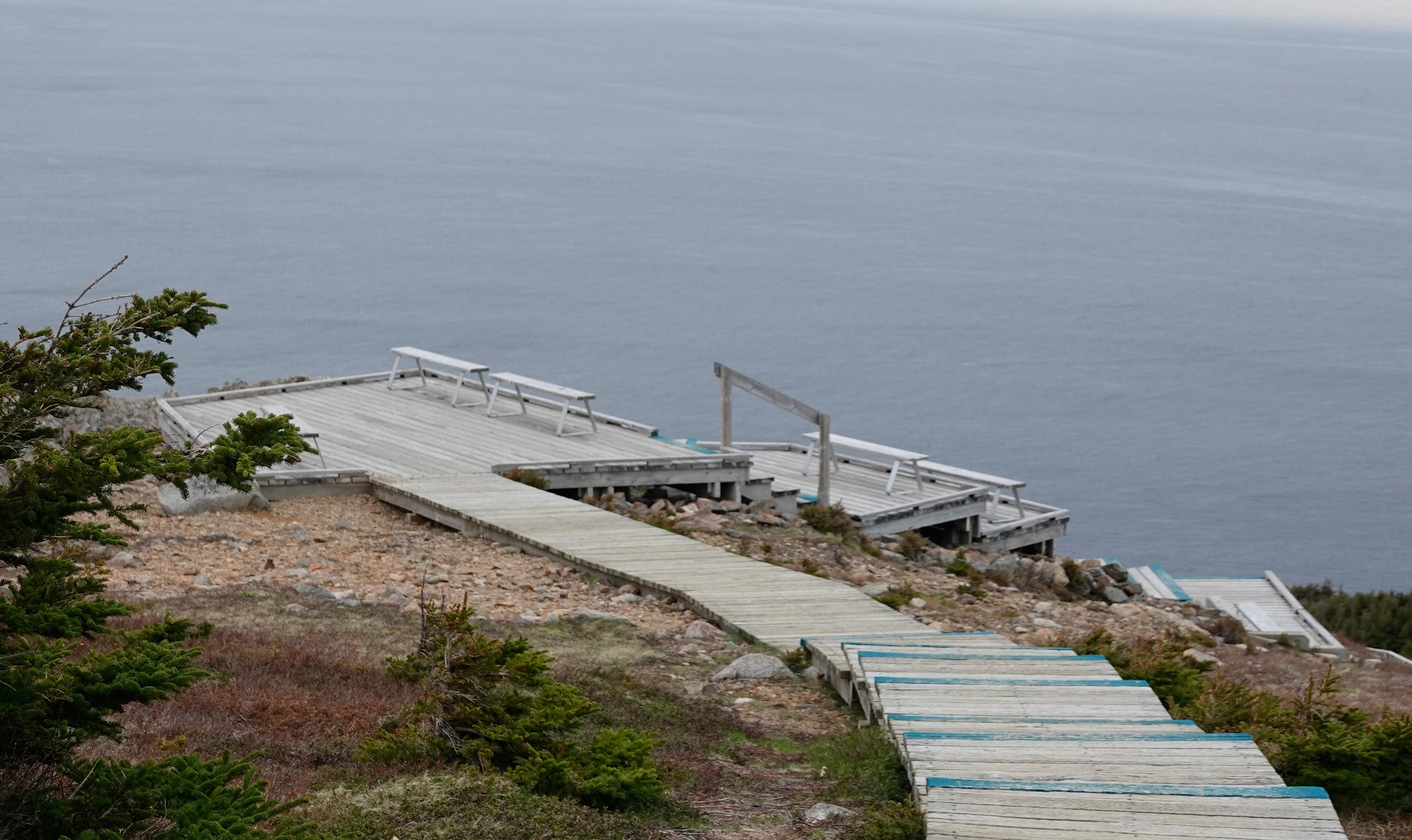 Wir unternehmen eine Wanderung auf dem Skyline Trail (9 km). Wie bislang überall sind die Wanderwege in einem sehr guten Zustand und immer mal wieder geben Schautafeln interessante Informationen zu dem jeweiligen Wanderweg. Dieser bietet eine besondere Attraktion: auf einem Holzsteg kann man die Steilküste ein Stück weit hinunterlaufen. Ich gebe auf halber Strecke auf, ich bin leider nicht schwindelfrei. Den Ausblick kann ich trotzdem genießen und der Rest des Weges bietet genügend atemberaubende Panoramen. Bären haben wir keine gesehen, wir waren wohl laut genug.