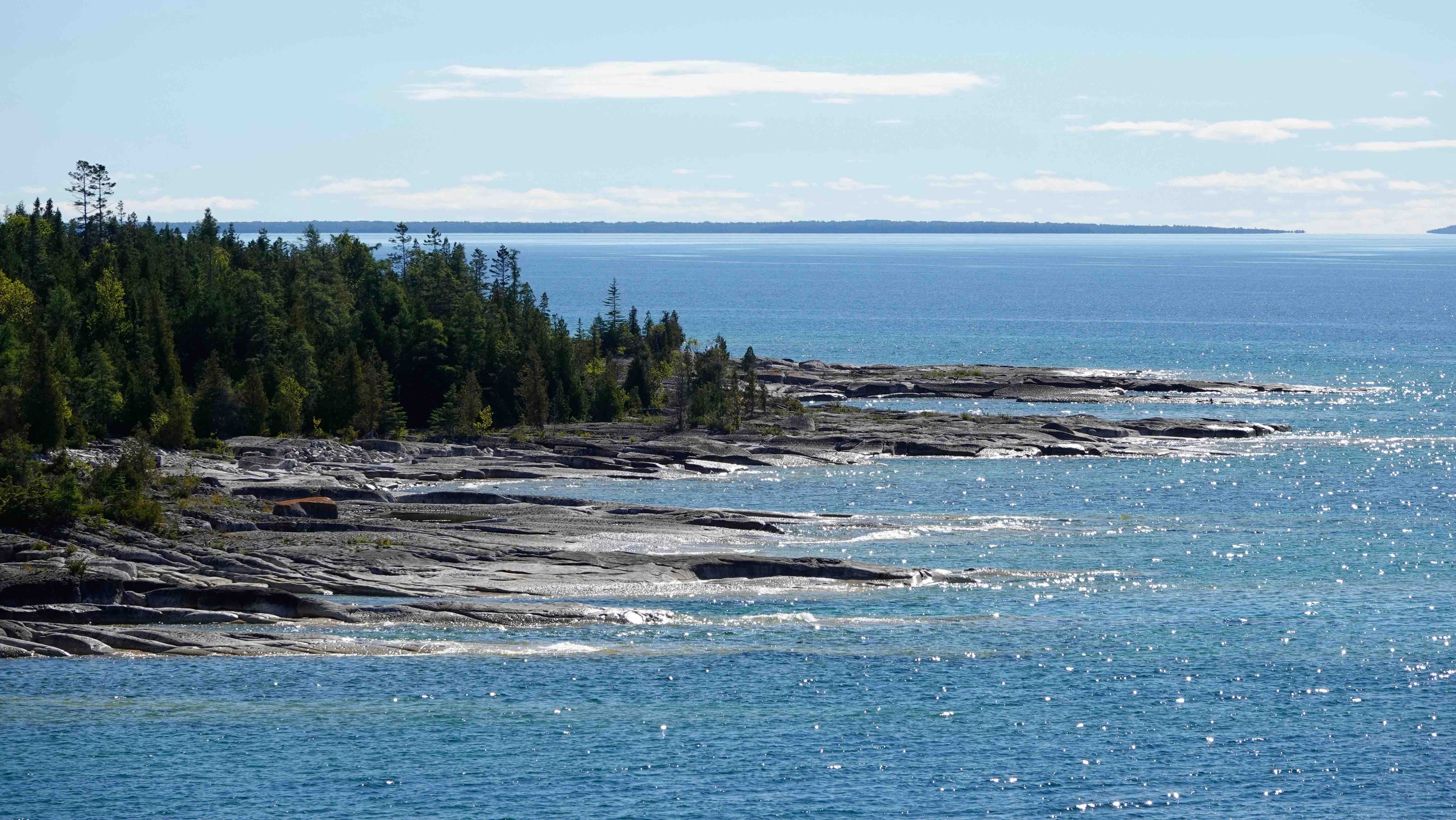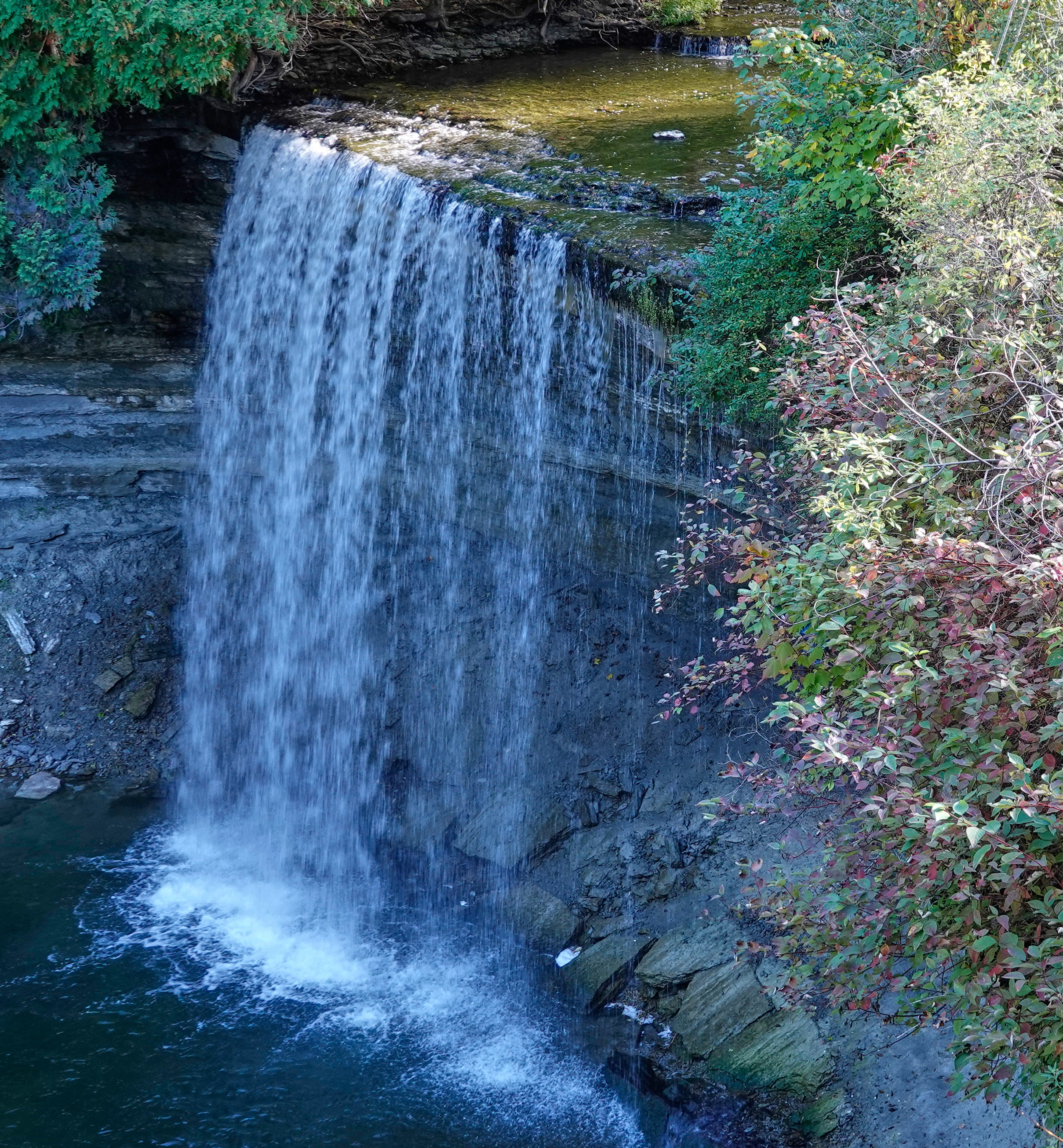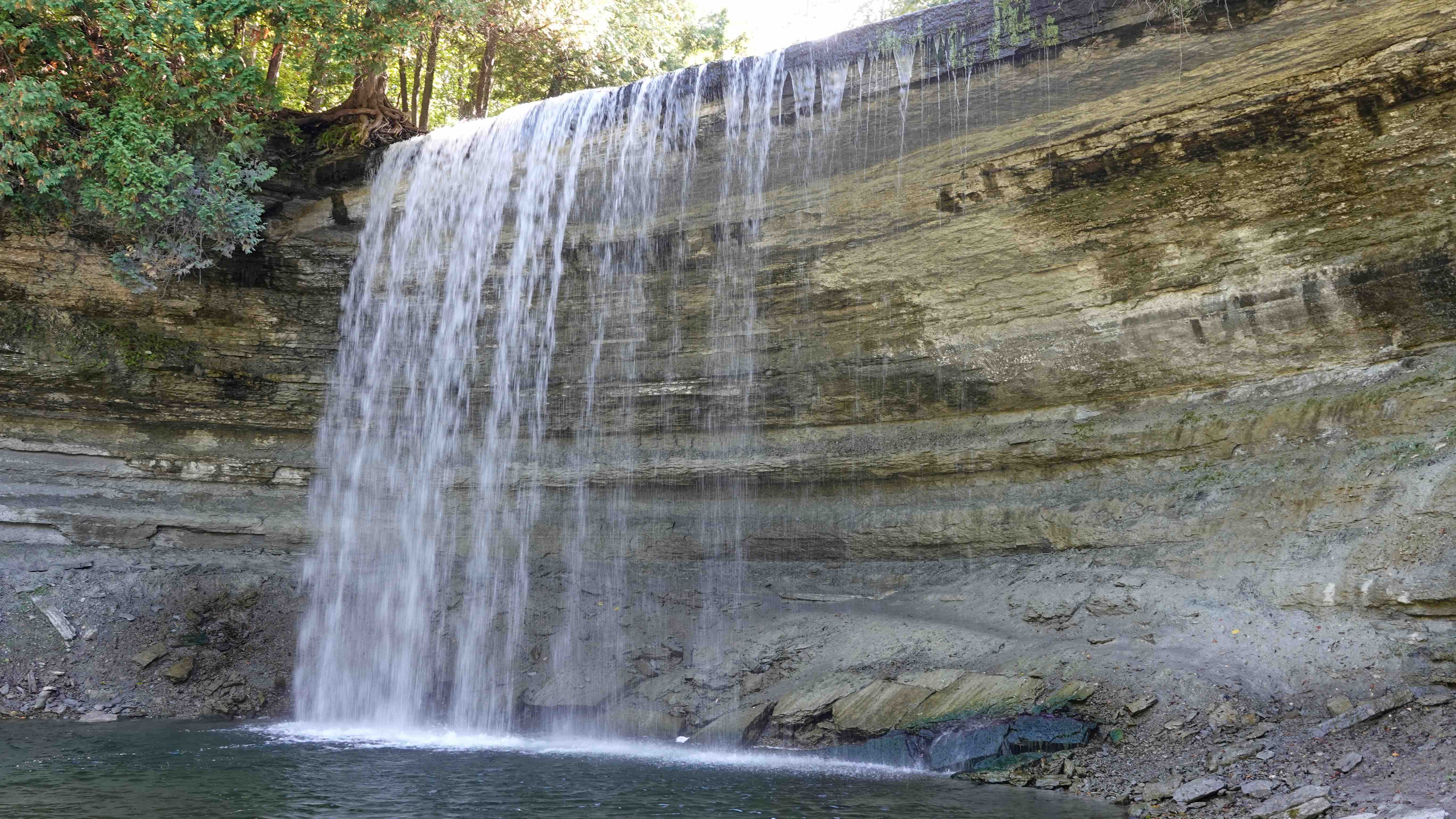 Nach Salt Sainte Marie fahren wir ein Stück am Ufer des Lake Huron entlang und biegen dann nach Manitoulin Island ab. In Kagawong besuchen wir die Bridal Veil Falls. Das Wasser fällt in feinem, zartem Schwung über eine Klippe, tatsächlich wie ein Schleier. Man könnte sogar hinter dem Wasserfall entlang laufen, was wir mangels passendem Equipment lieber sein lassen.