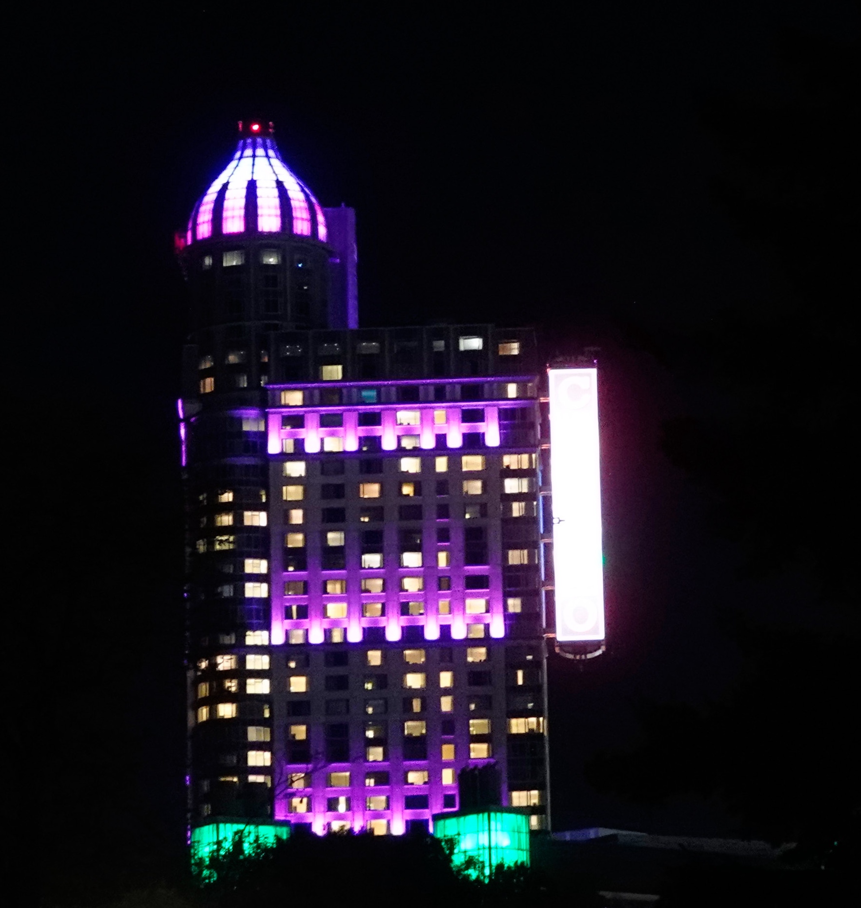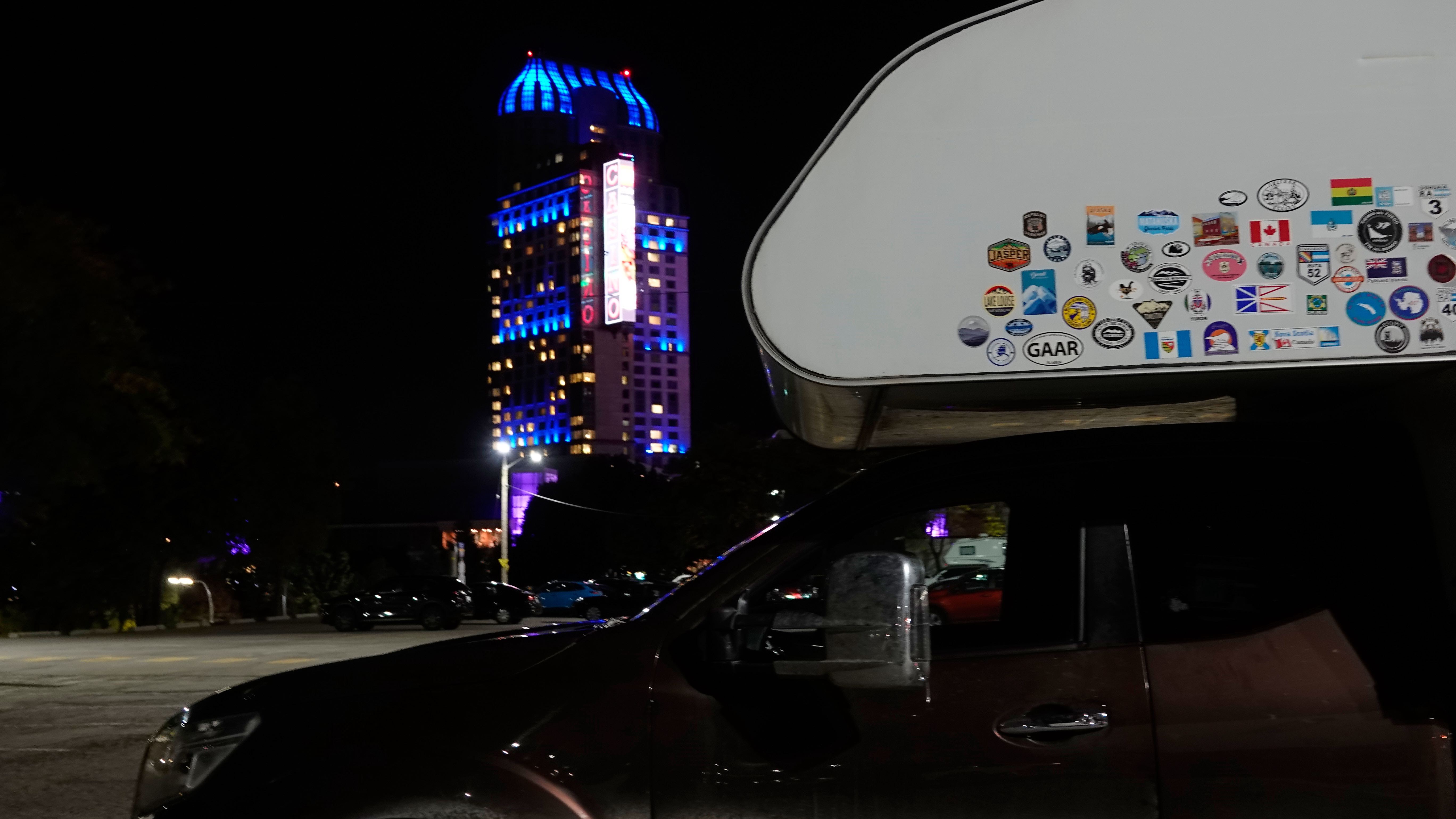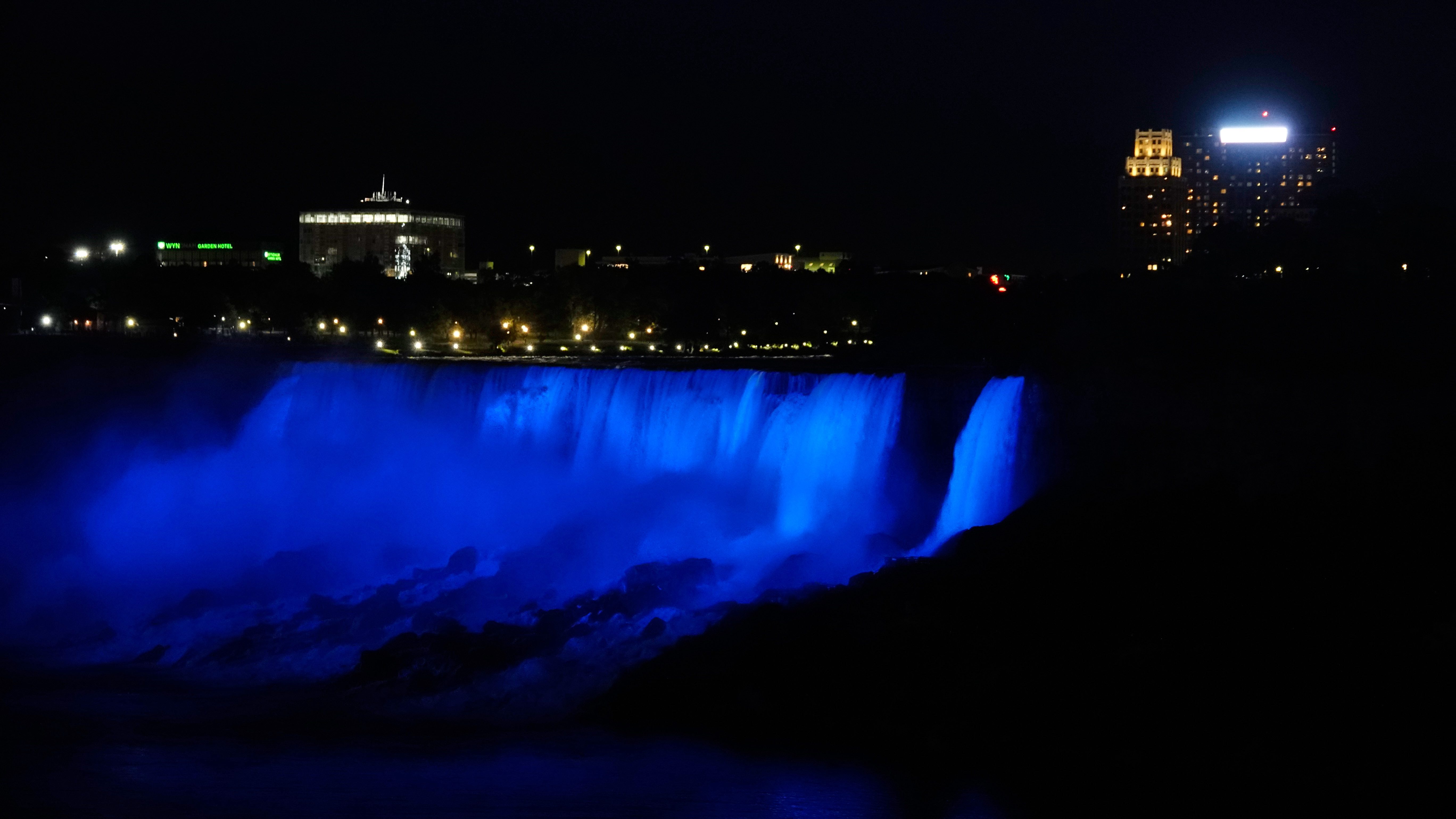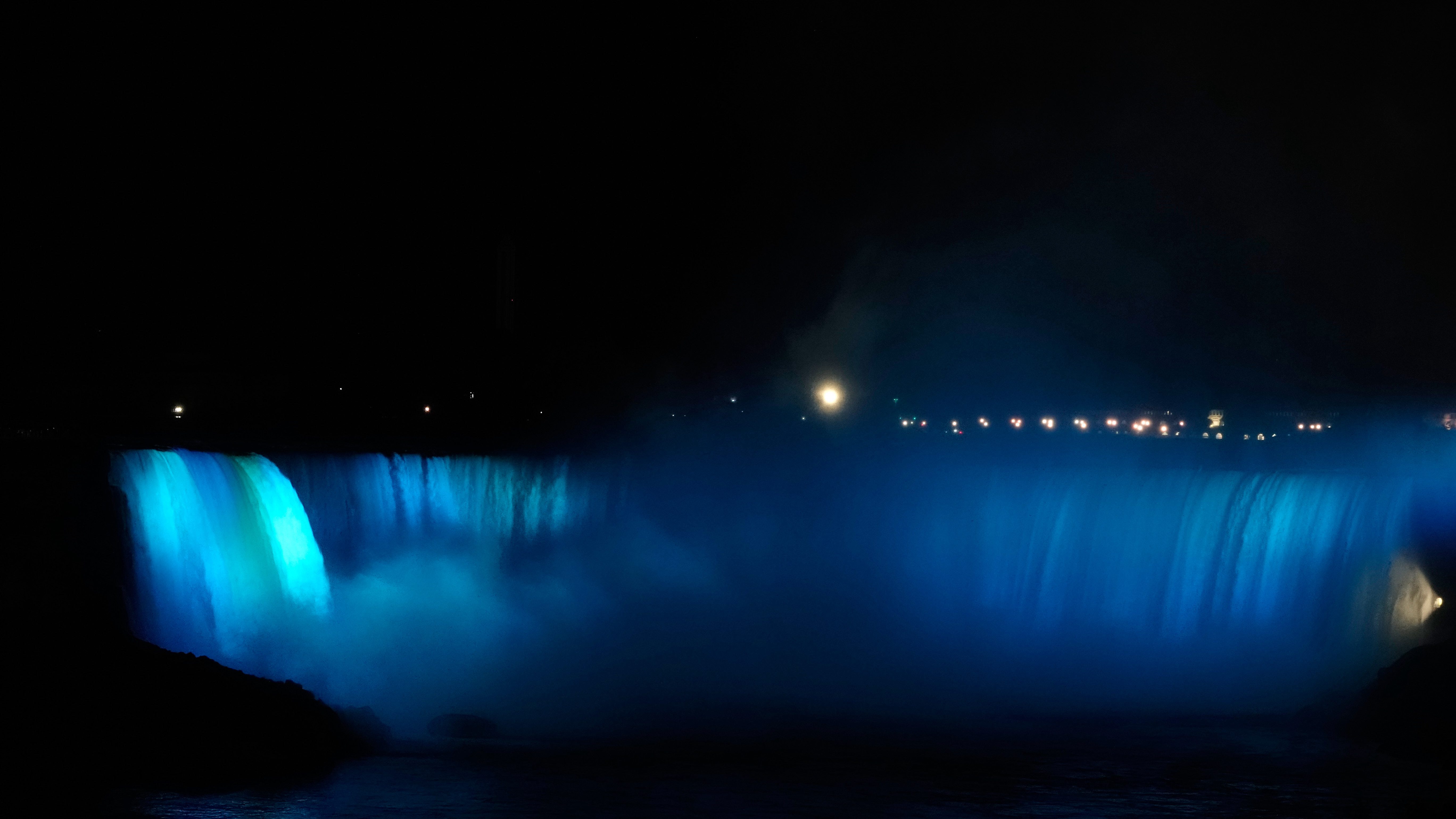 Nicht nur die Wasserfälle werden angestrahlt, auch viele Gebäude leuchten bunt in der Dunkelheit. Wir spazieren entlang der Promenade, immer mit Blick auf die Horseshoe Falls.