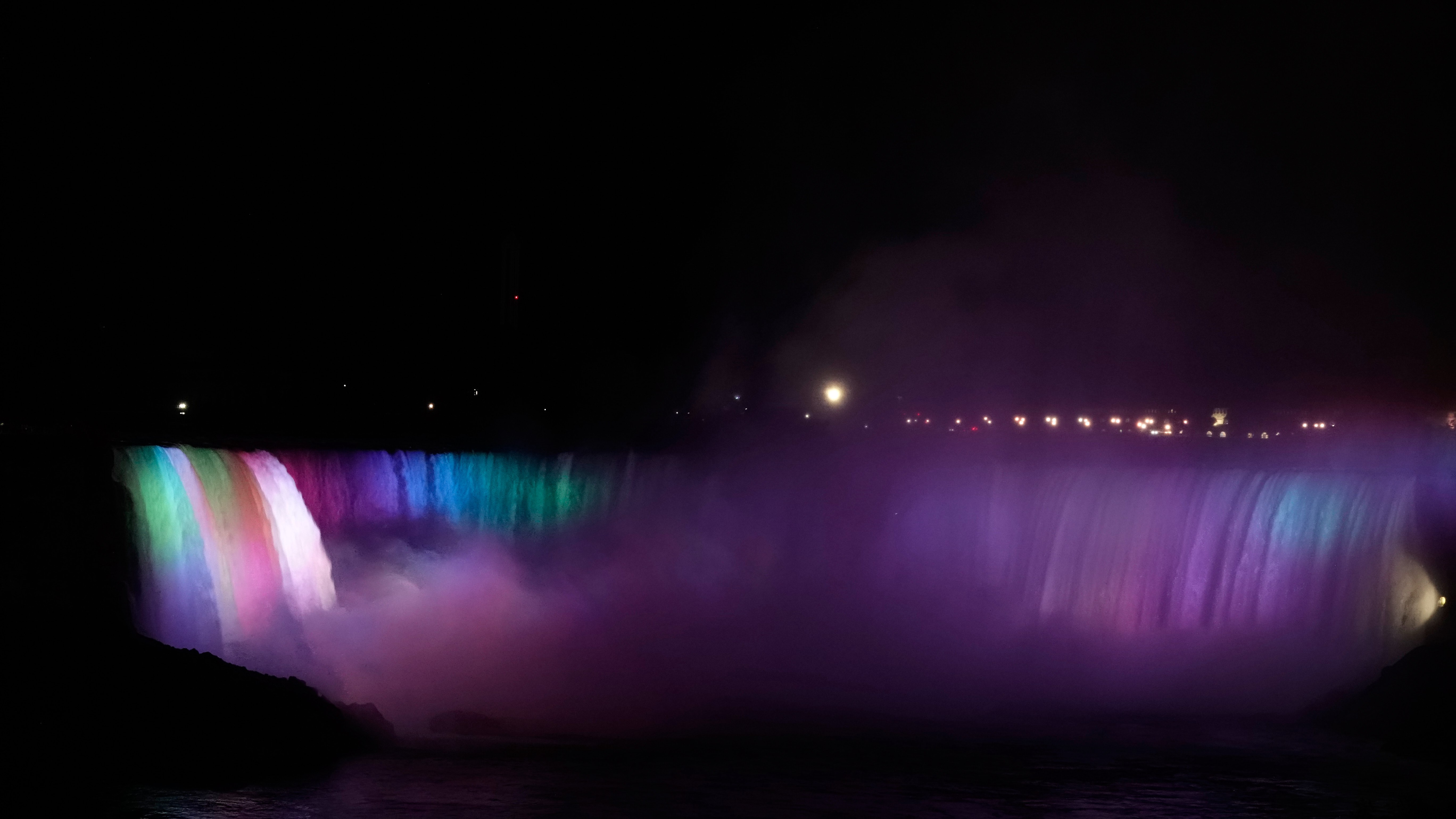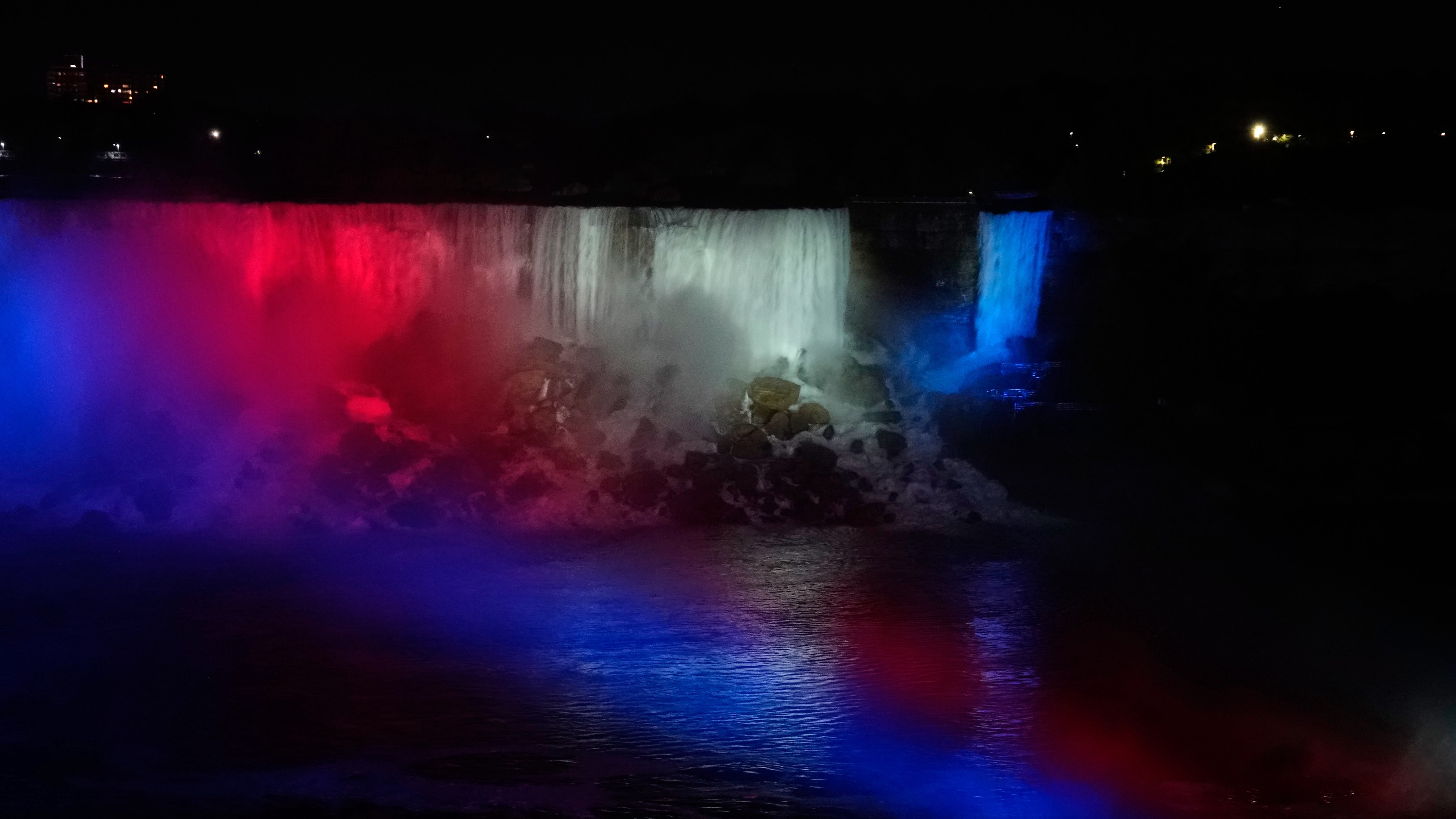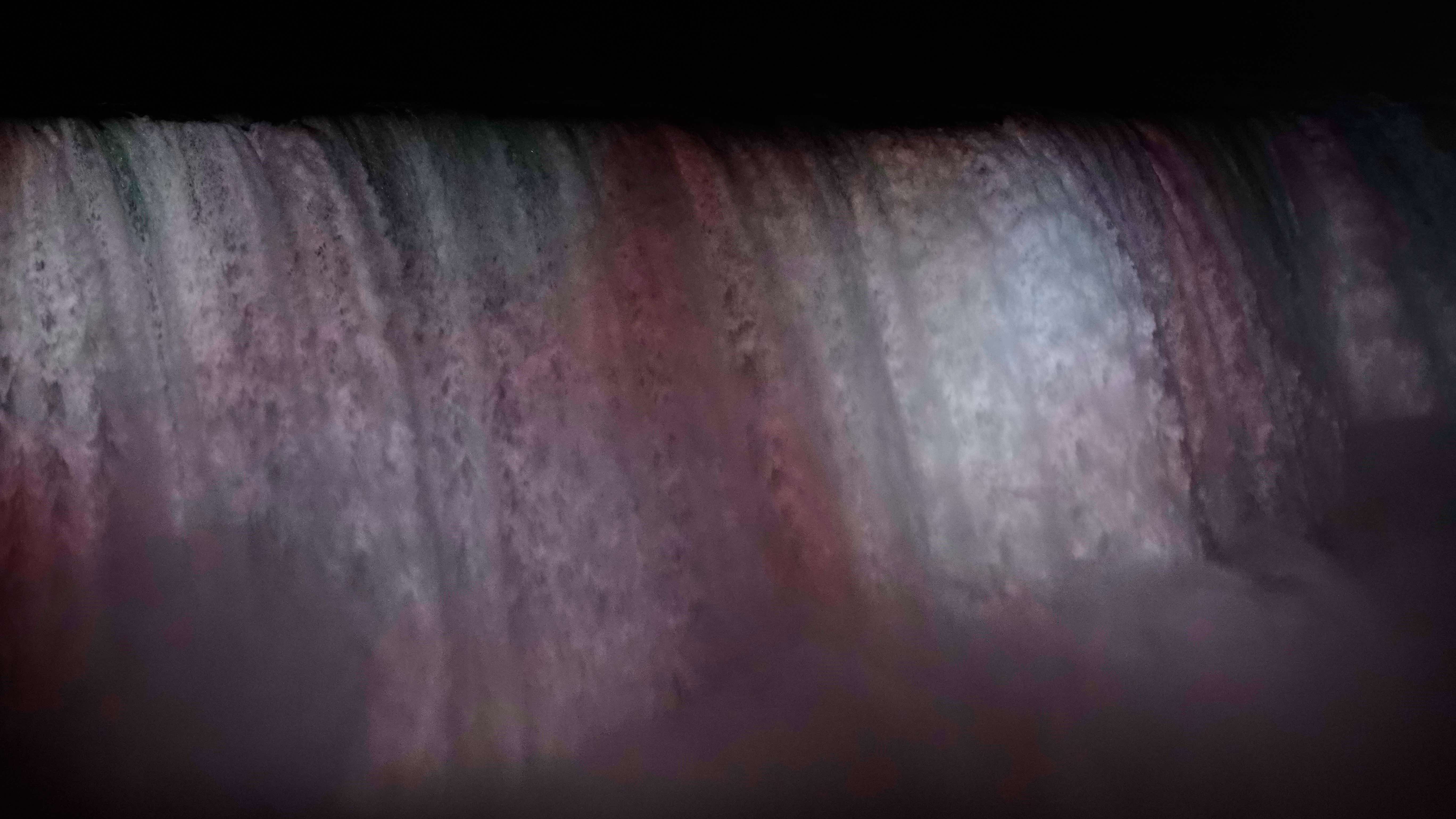 Es ist schon dunkel und ein ganz besonderes Erlebnis, die mit bunten Lichtern angestrahlten Wassermassen zu sehen. Auf der gegenüberliegenden, amerikanischen Seite stürzt der Bridal Veil Fall in den Niagara River, auch schon sehr imposant!
