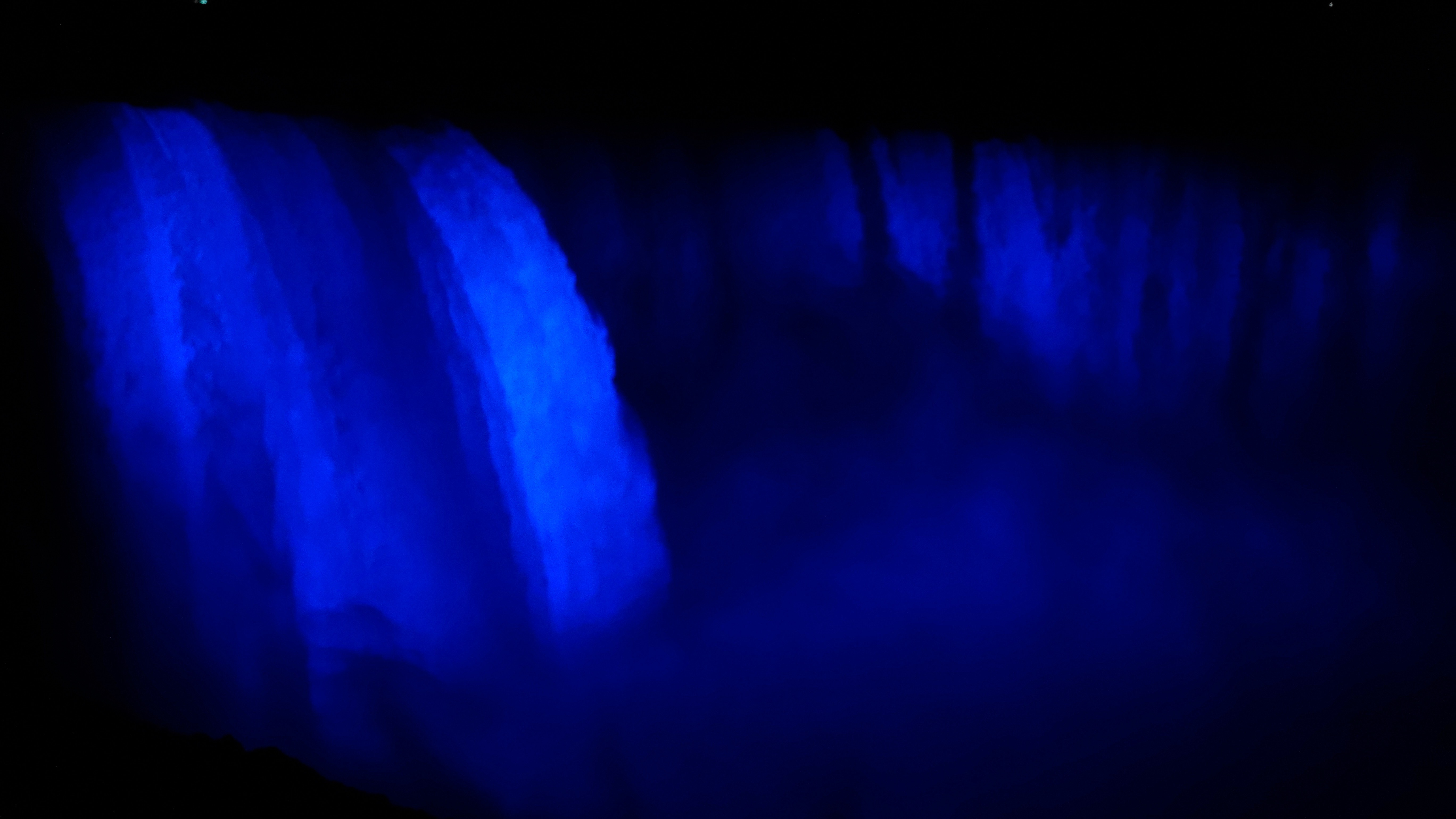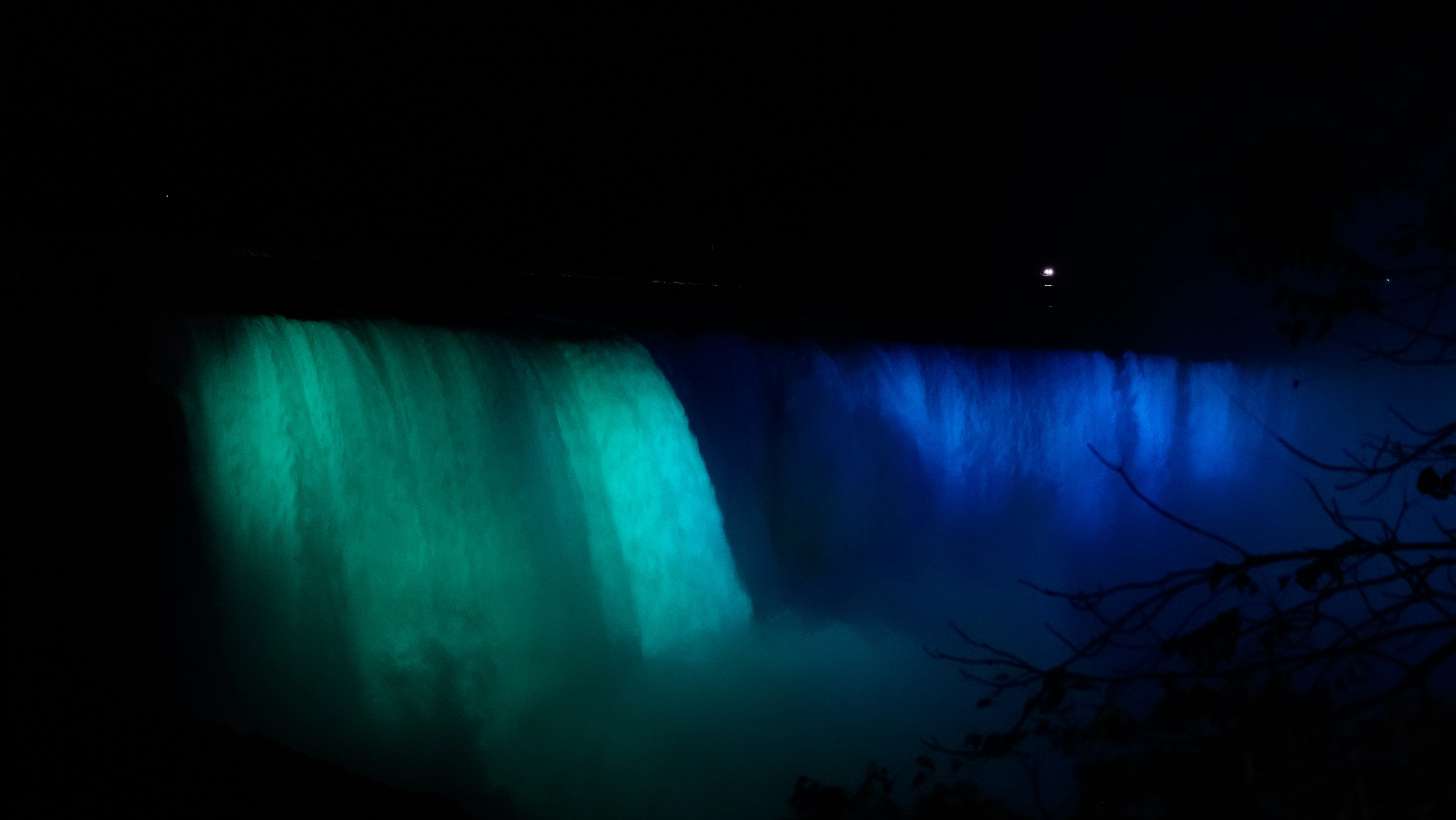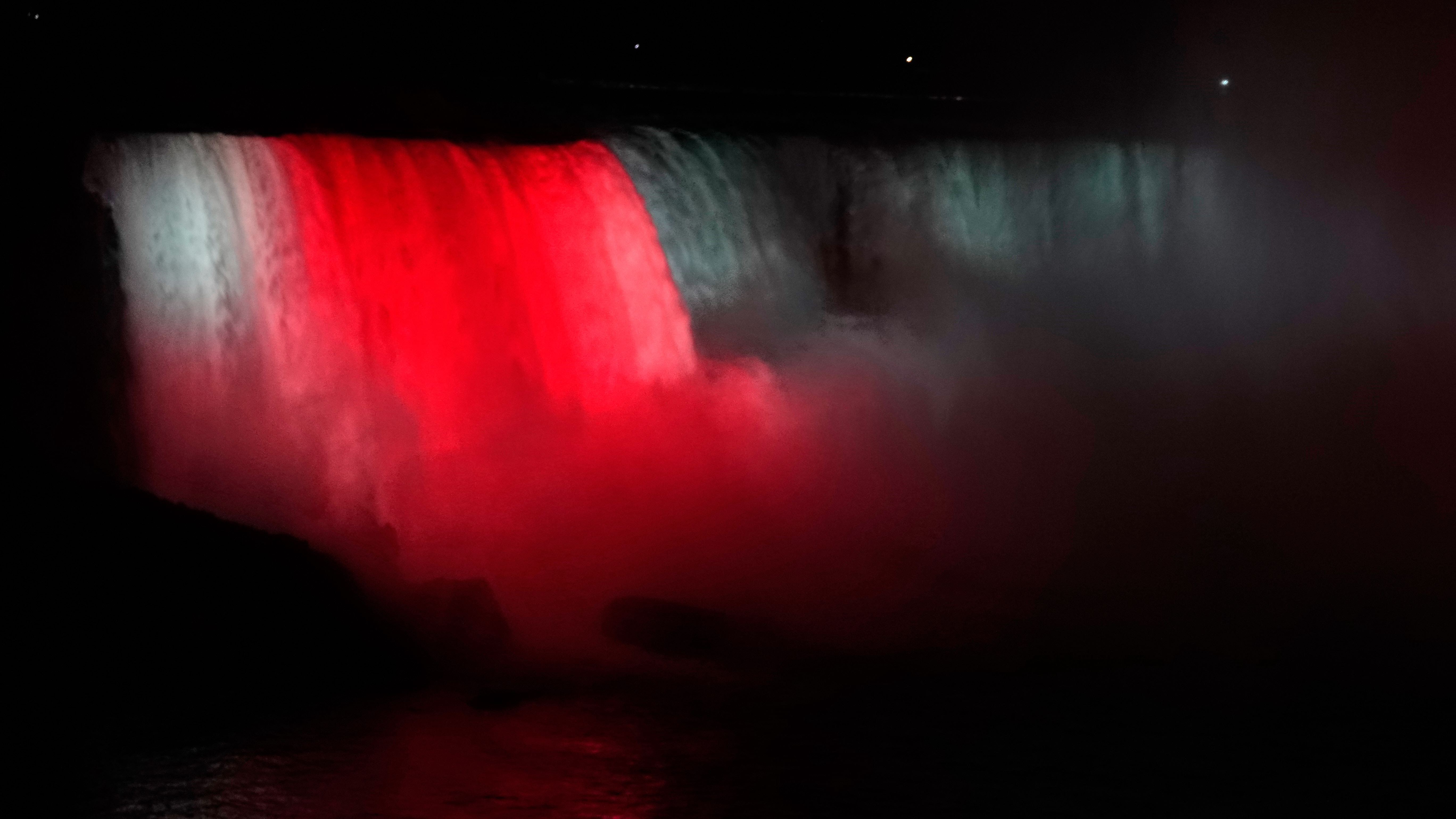 Es ist schon dunkel und ein ganz besonderes Erlebnis, die mit bunten Lichtern angestrahlten Wassermassen zu sehen. Auf der gegenüberliegenden, amerikanischen Seite stürzt der Bridal Veil Fall in den Niagara River, auch schon sehr imposant!