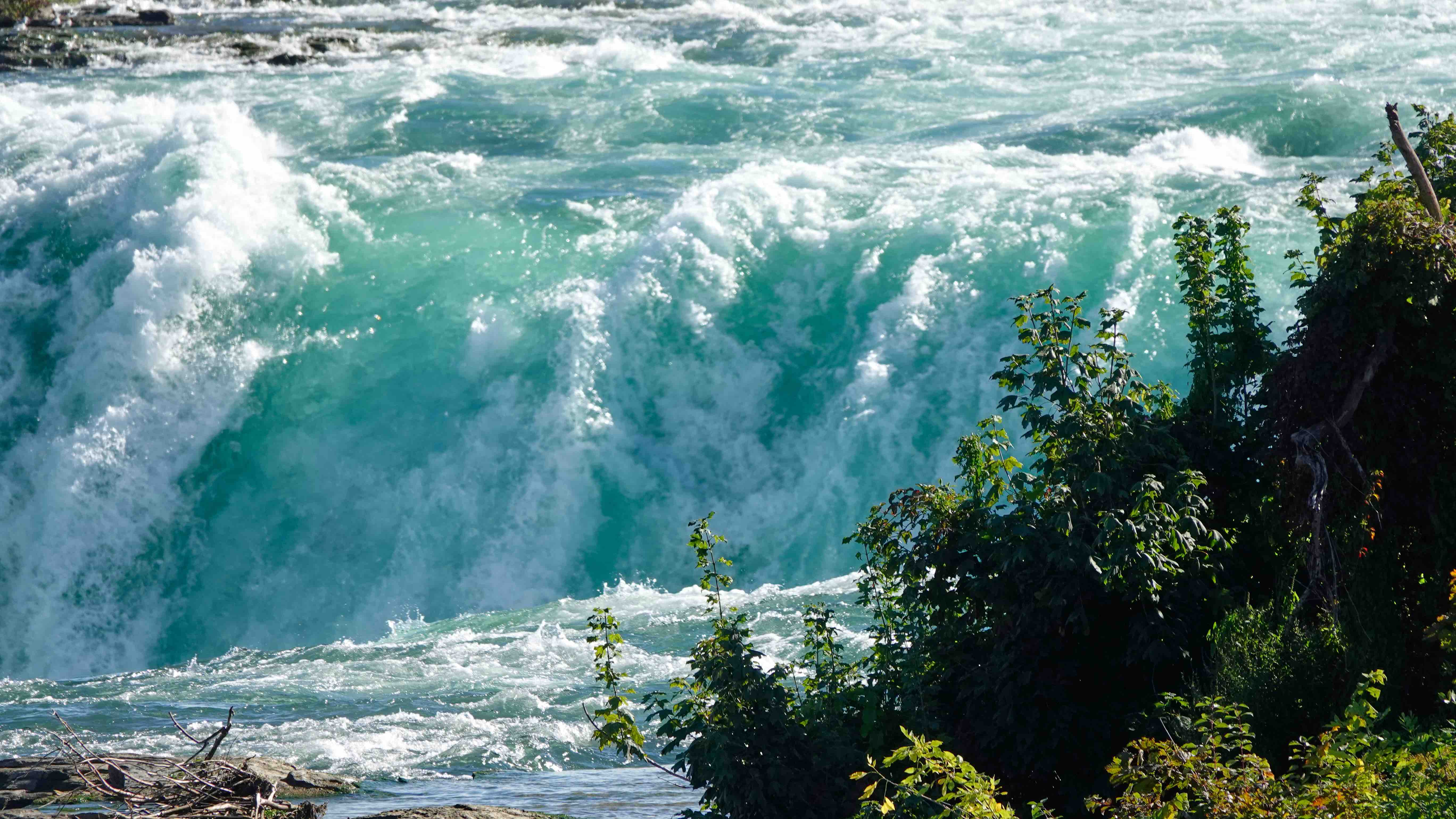 Ein Stück hinter dem Table Rock Center ist es wieder trocken und der Blick auf den Fluss mit der Abbruchkante ist auch von dieser Seite beeindruckend. In einem wunderschönen lichten Türkisblau strömen die Wassermassen hinunter.